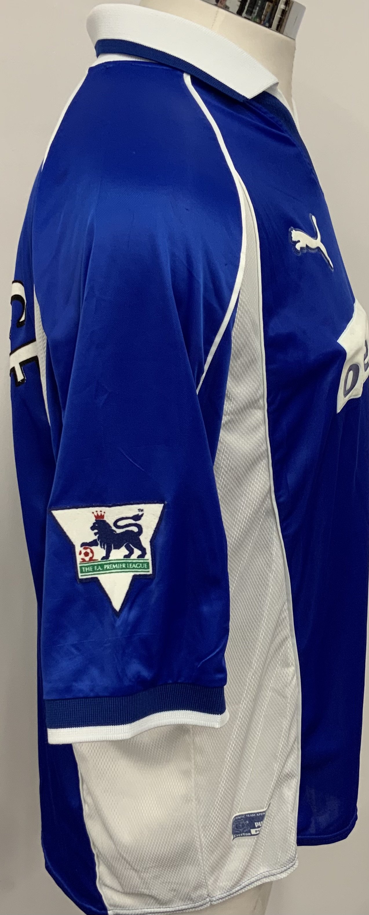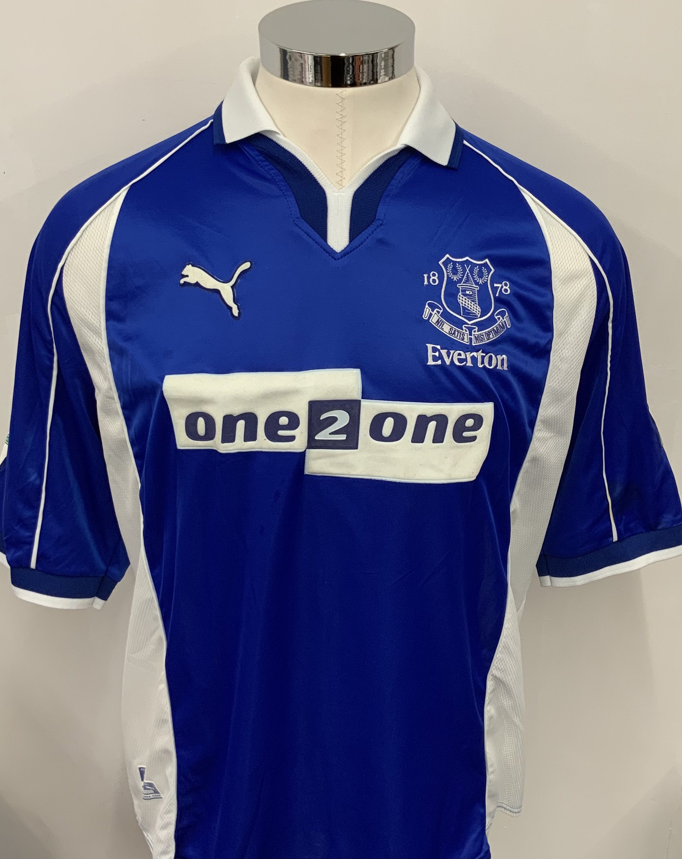 Everton 2001 - 2002 Match Worn Football Shirt: Blue short sleeve shirt with Premier League badging to sleeves. Pembridge 11 to rear.