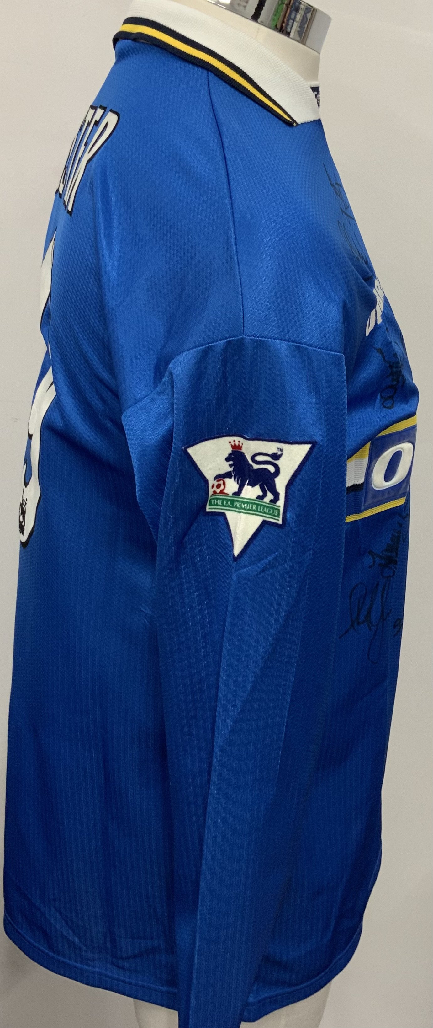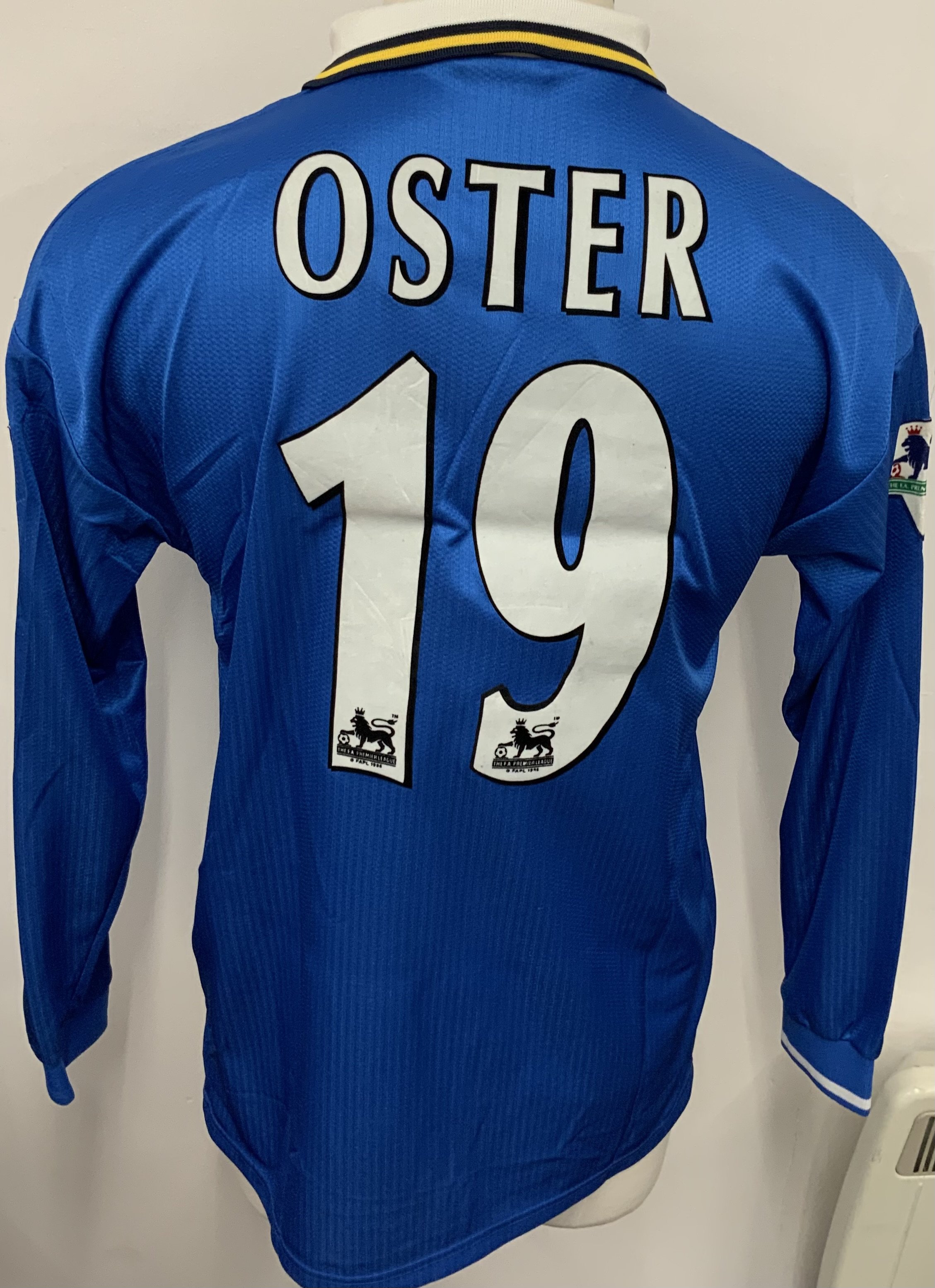 Everton 1997 - 1999 Match Worn Football Shirt: Blue long sleeve shirt with Premier League badging to sleeves. Oster 19 to rear. Shirt has been signed by the squad.