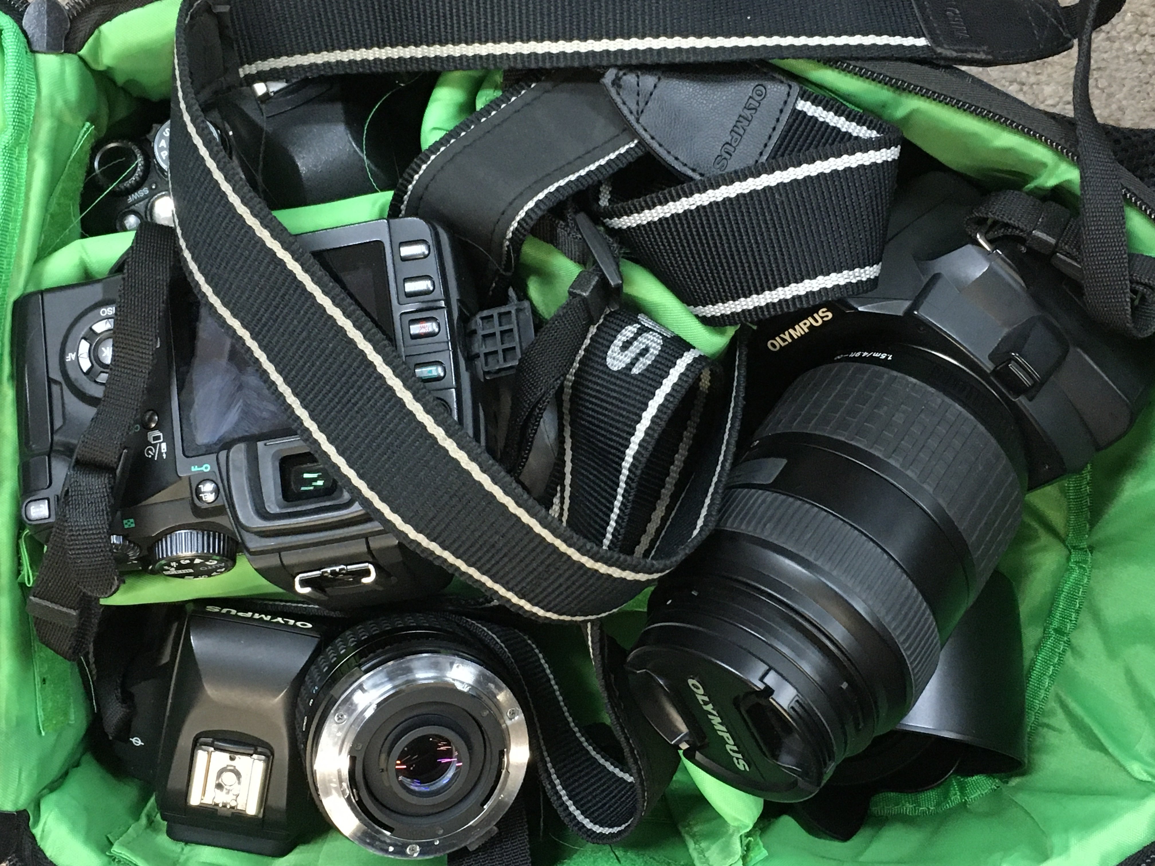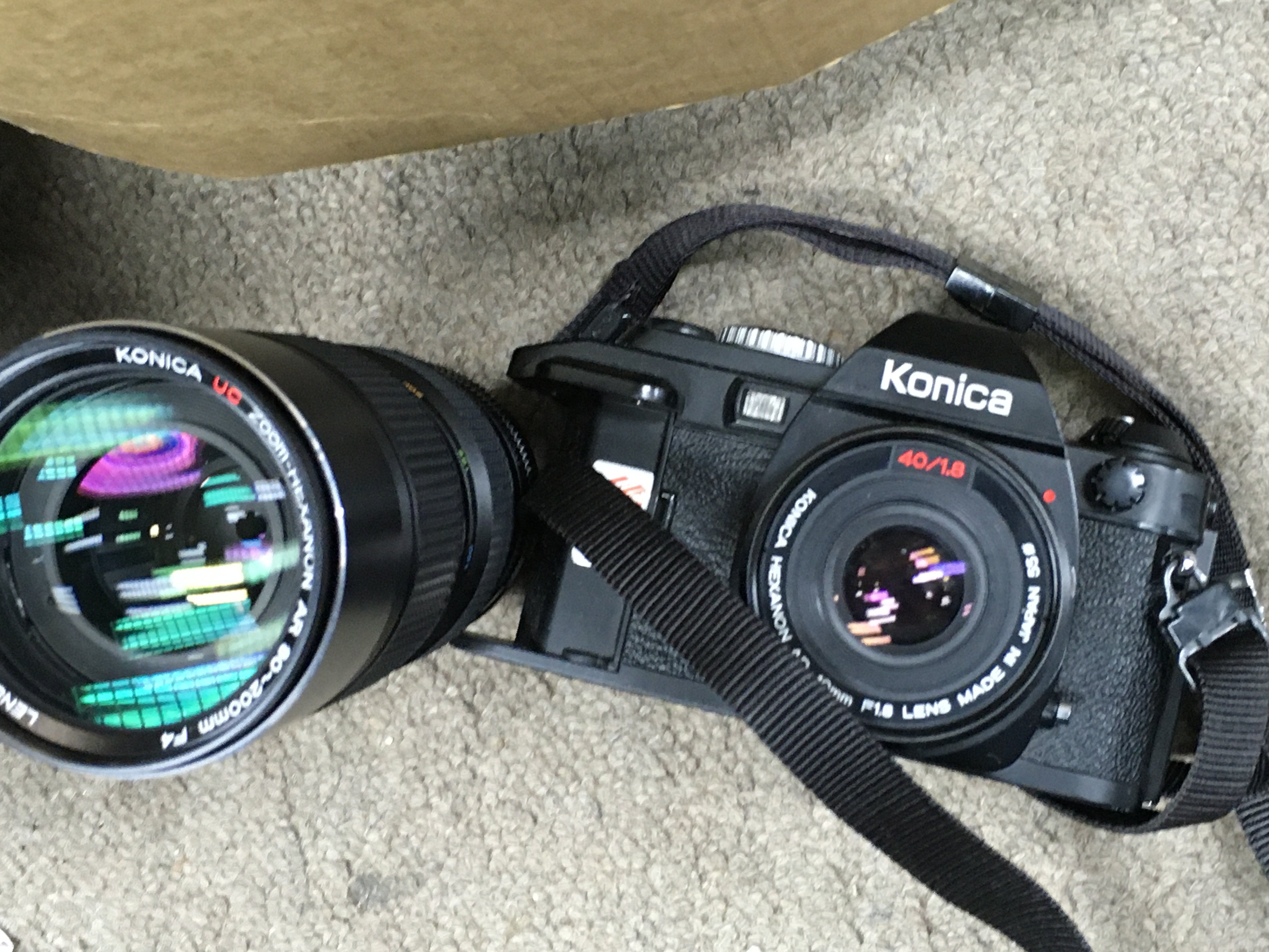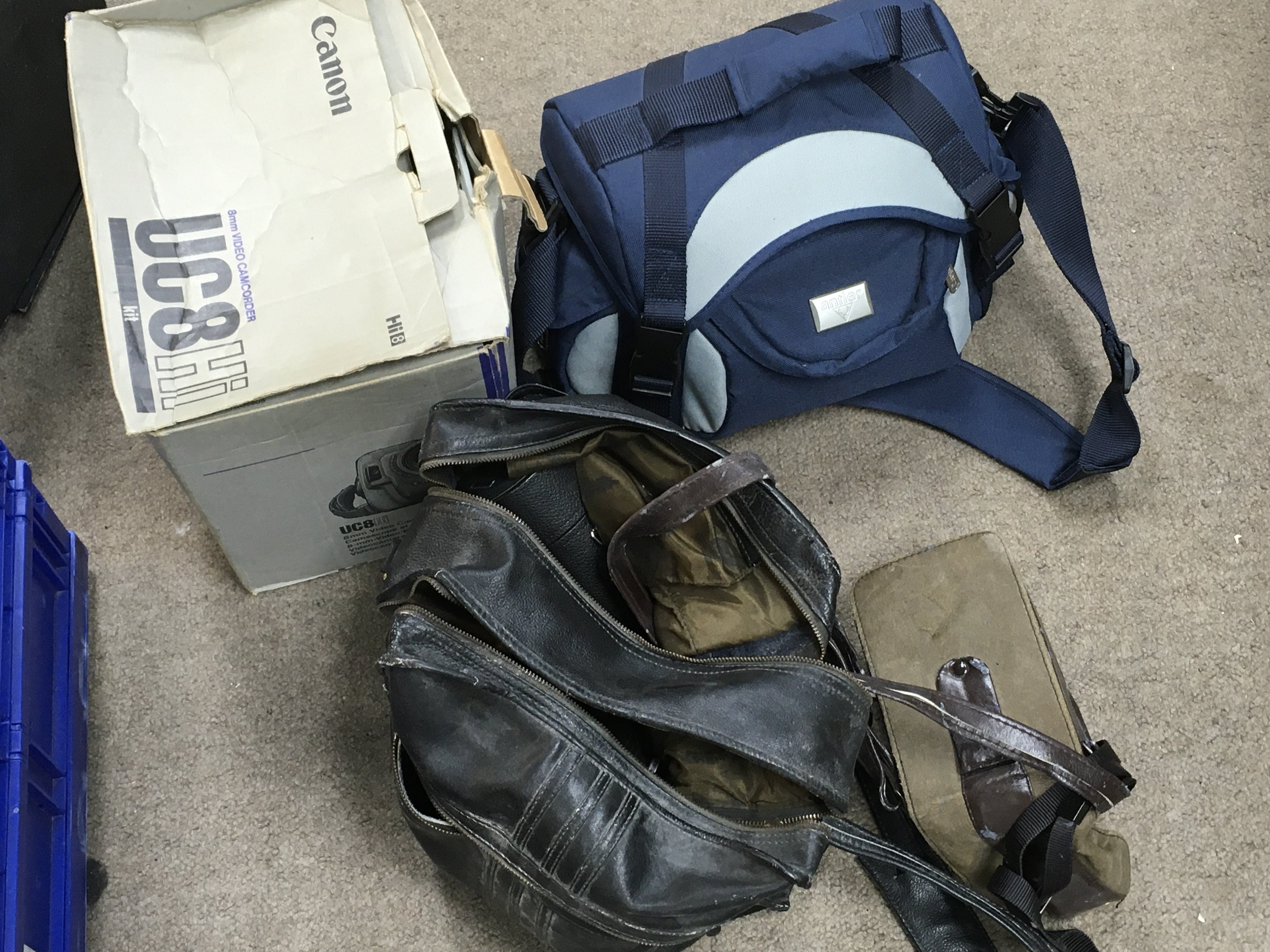 A collection of vintage camera equipment including a Canon 8mm video camcorder, Samsung 8mm