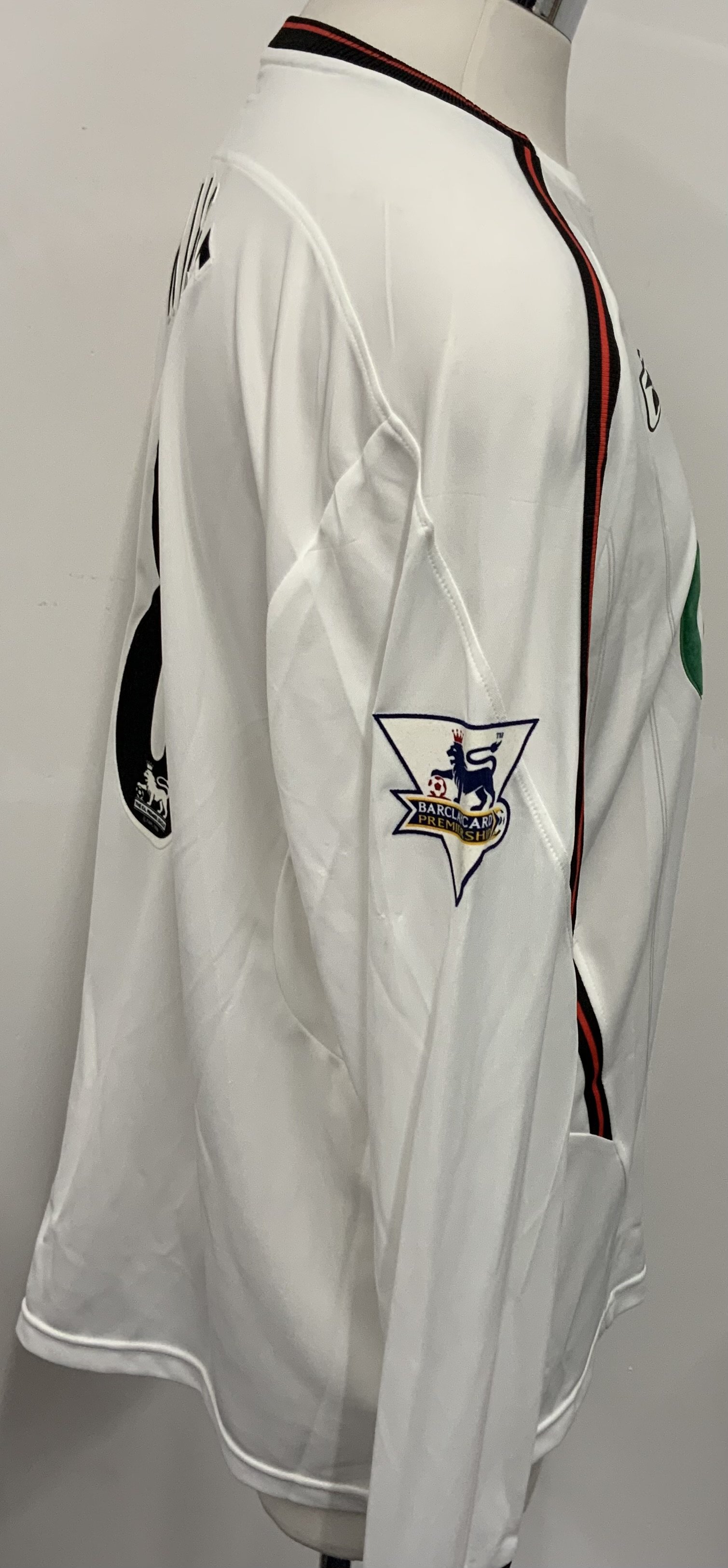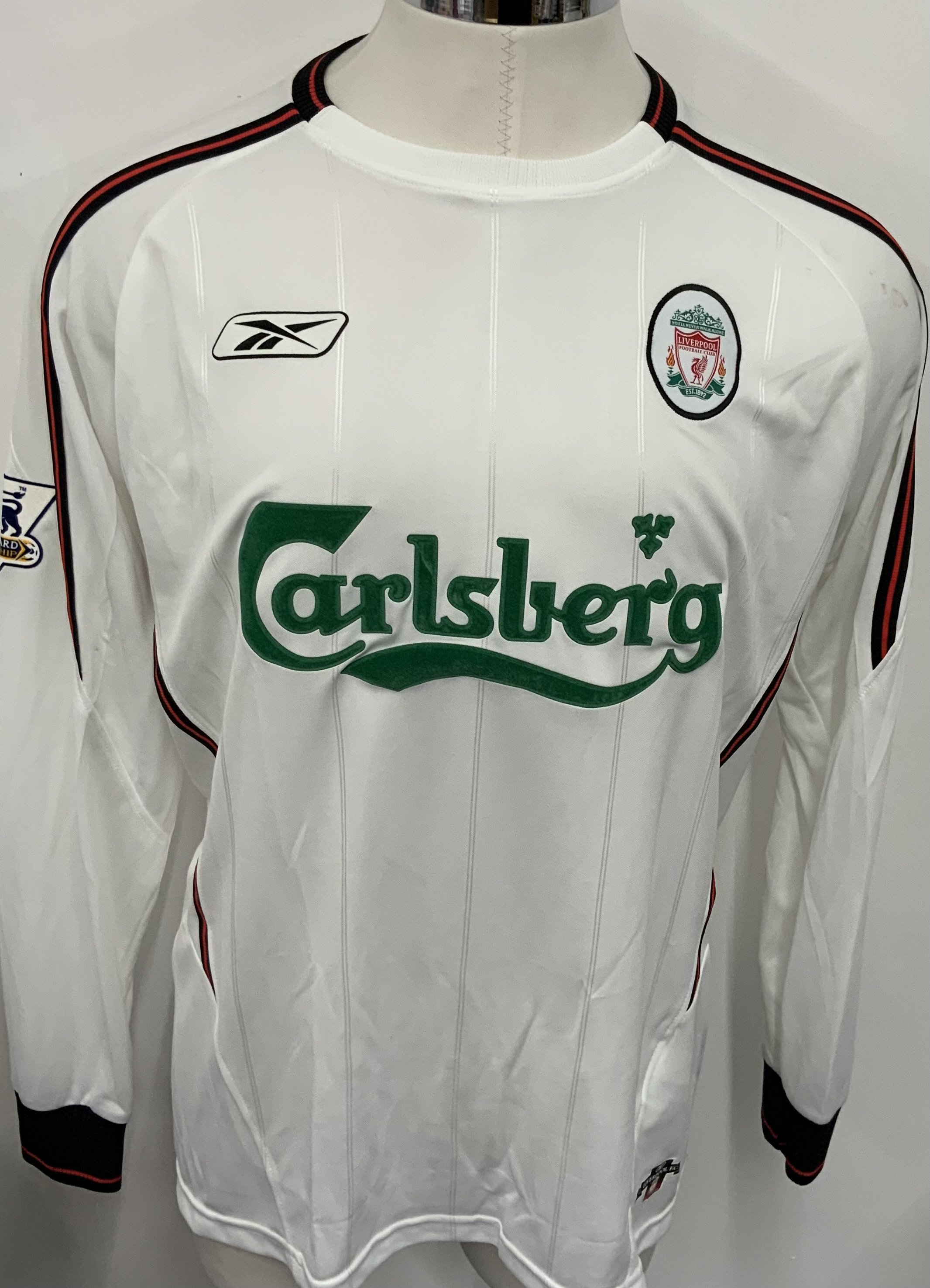 Liverpool 2003 - 2004 Match Worn Football Shirt: White long sleeve shirt with Premier League badging to sleeves. Riise 18 to rear.