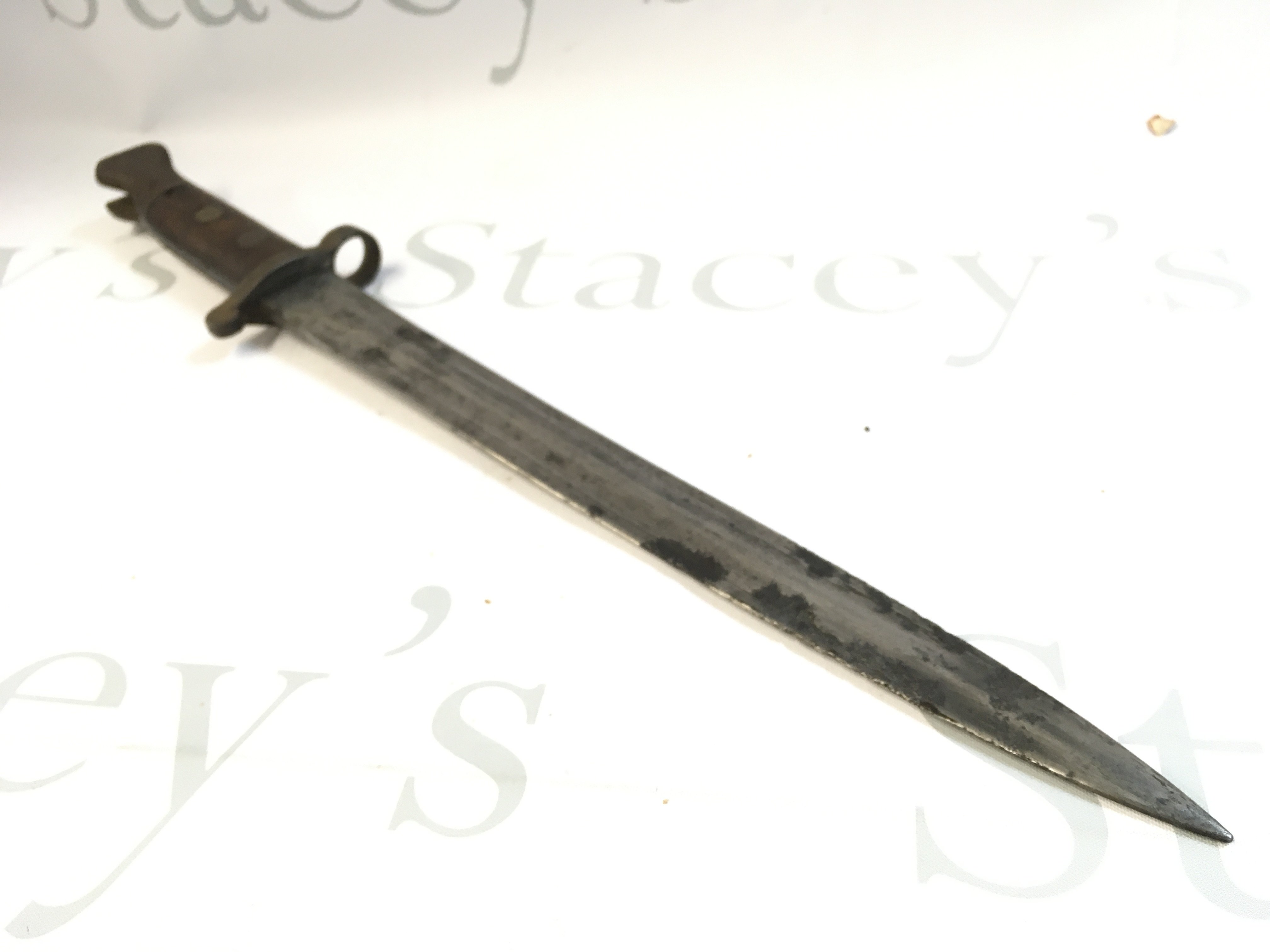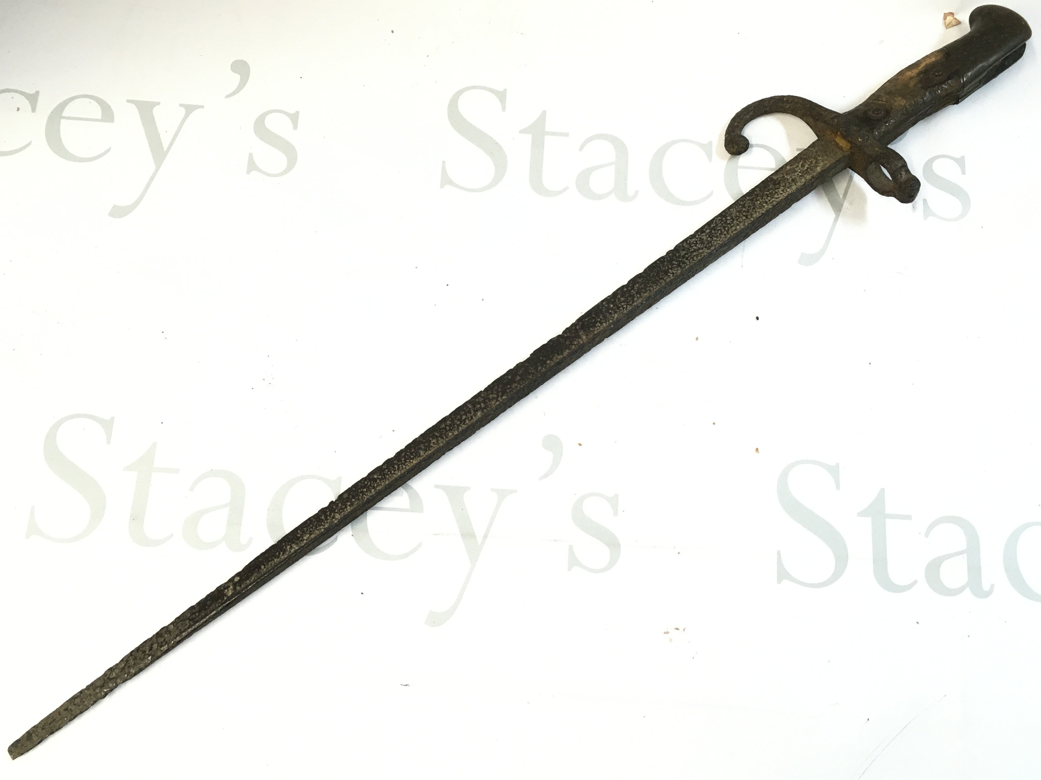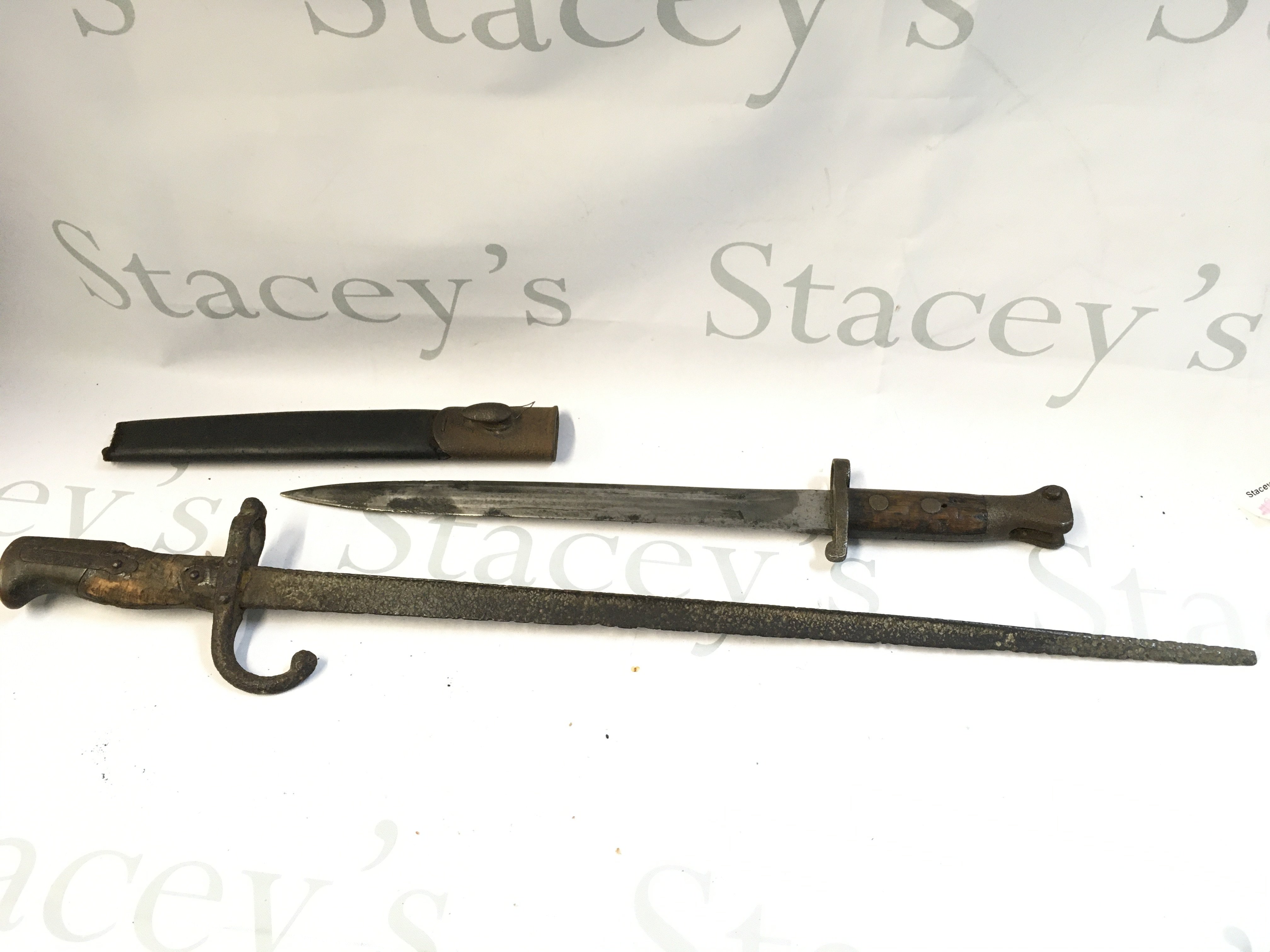 Two bayonets including an English bayonet marked EFD, scabbard damaged. 45cm long and a French bayonet, 61cm long.