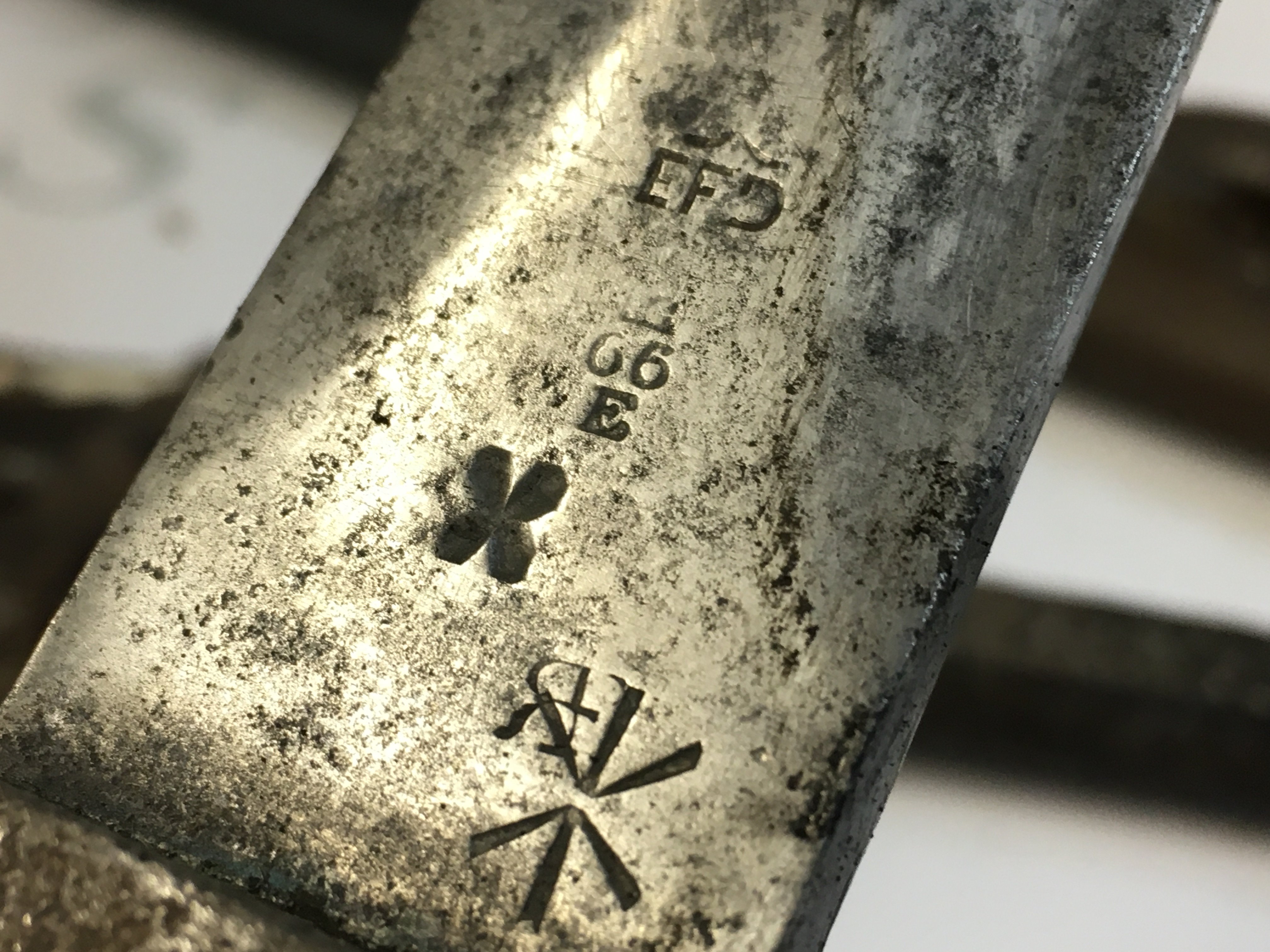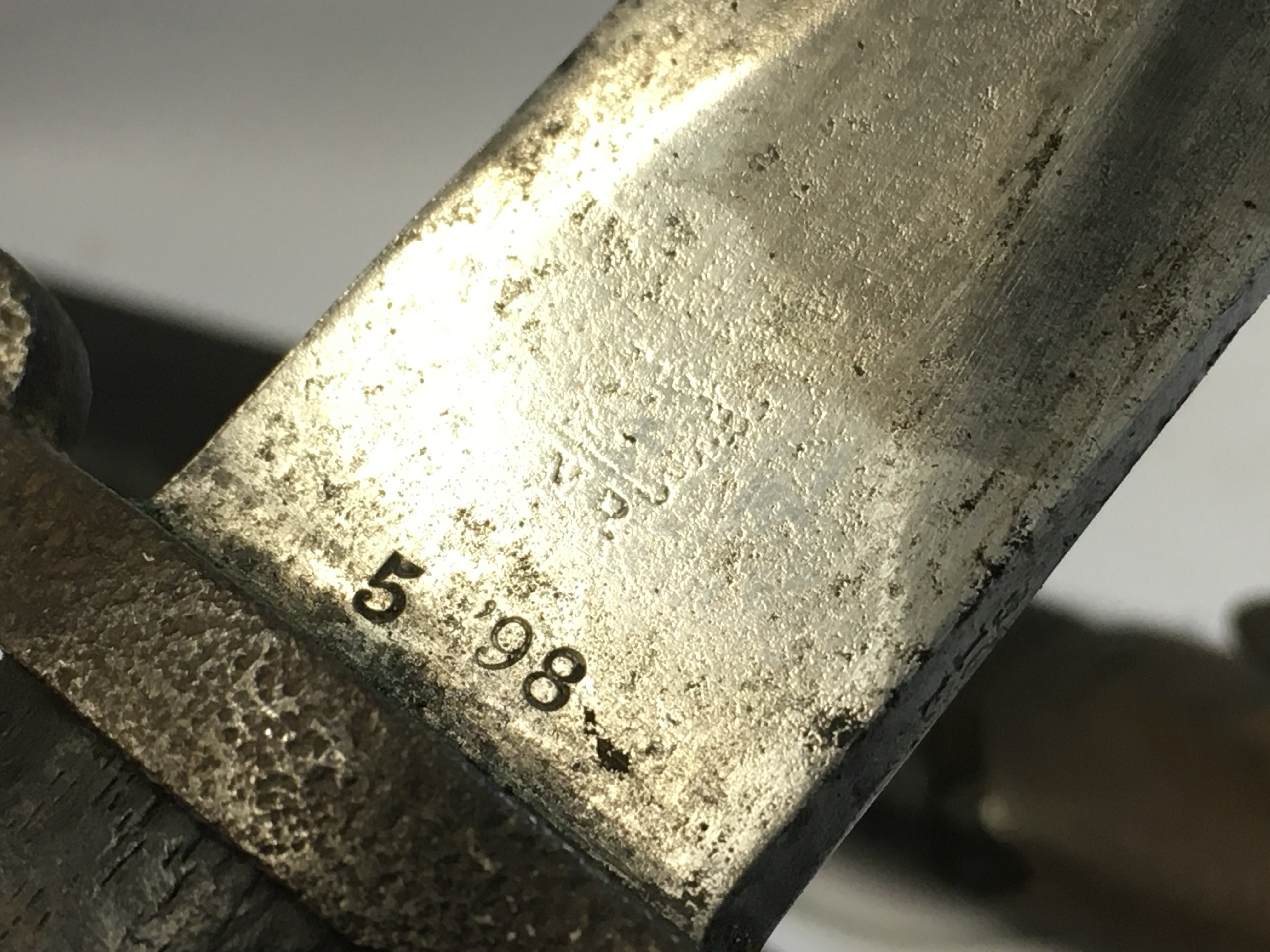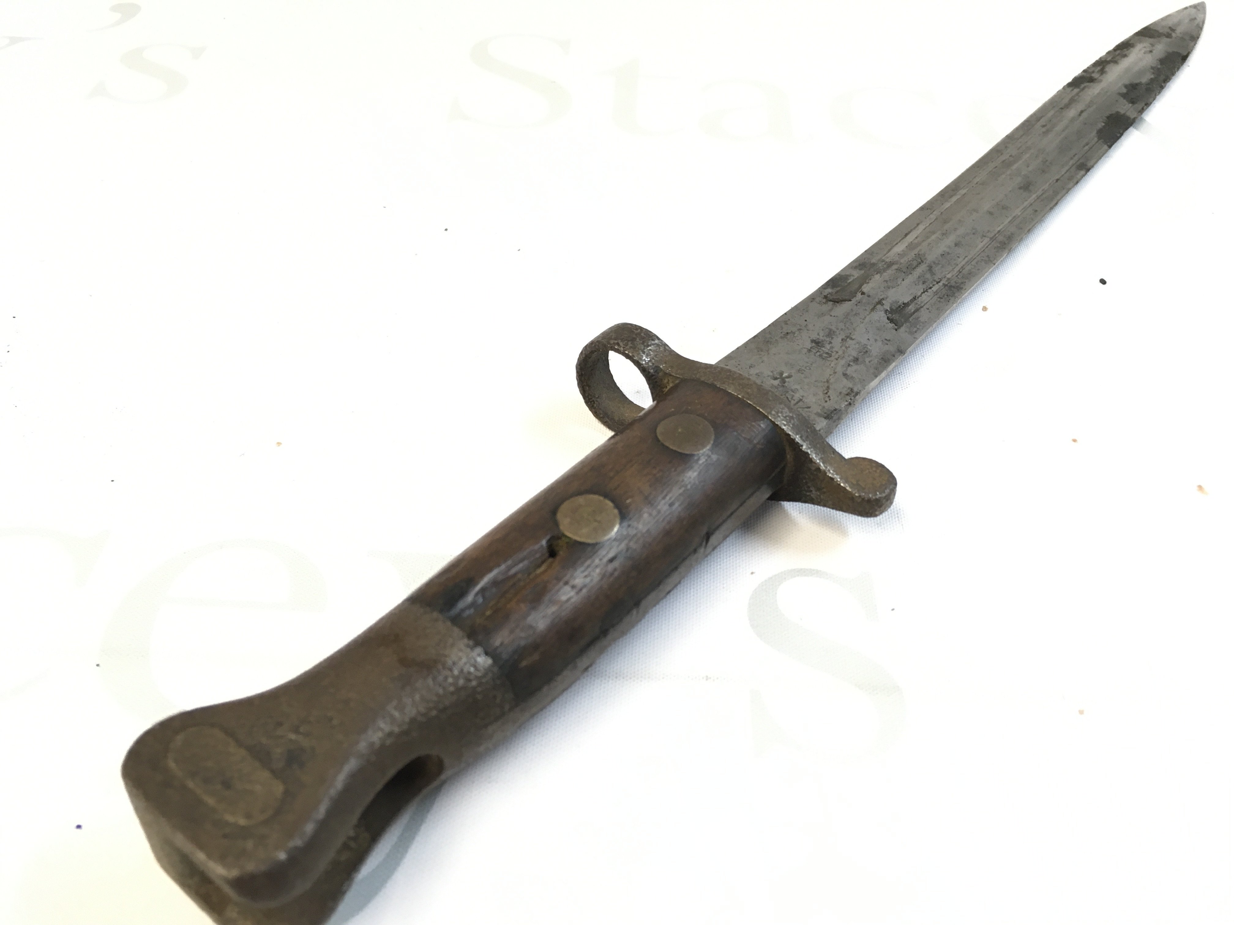 Two bayonets including an English bayonet marked EFD, scabbard damaged. 45cm long and a French bayonet, 61cm long.