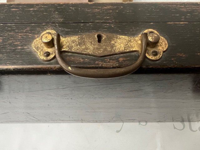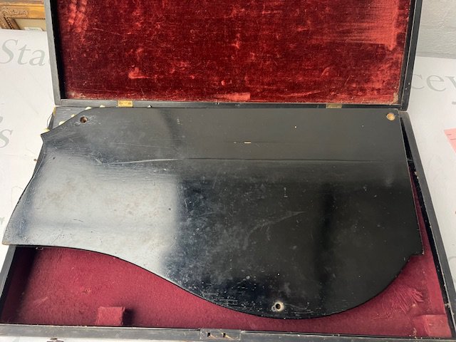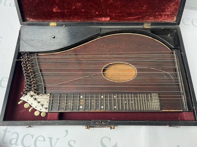 A late Victorian Blackwood Autoharp in wooden case with brass lock and handle. Requires restringing. All accessories in place and etched tuner surround shows light tarnishing consistent with age and use. Click Here to Register to bid