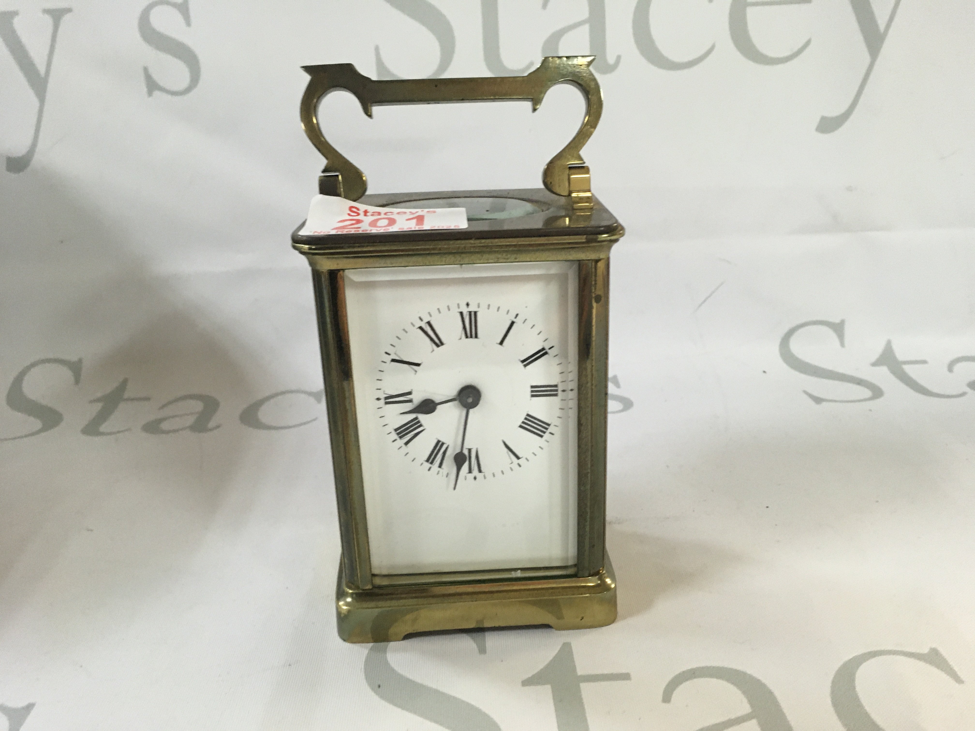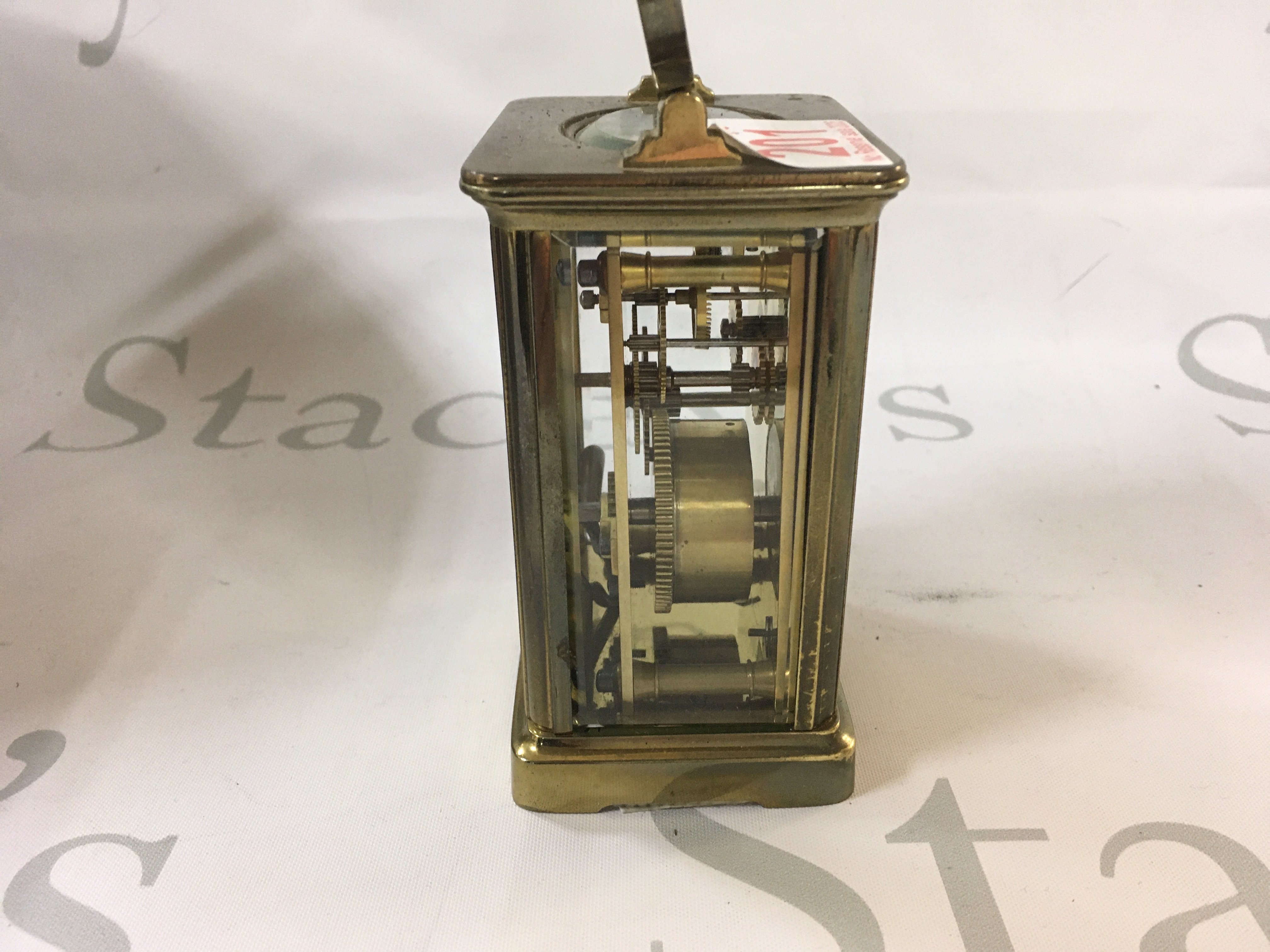 A Victorian antique clock made from brass which has Roman numerals and a visible mechanism.