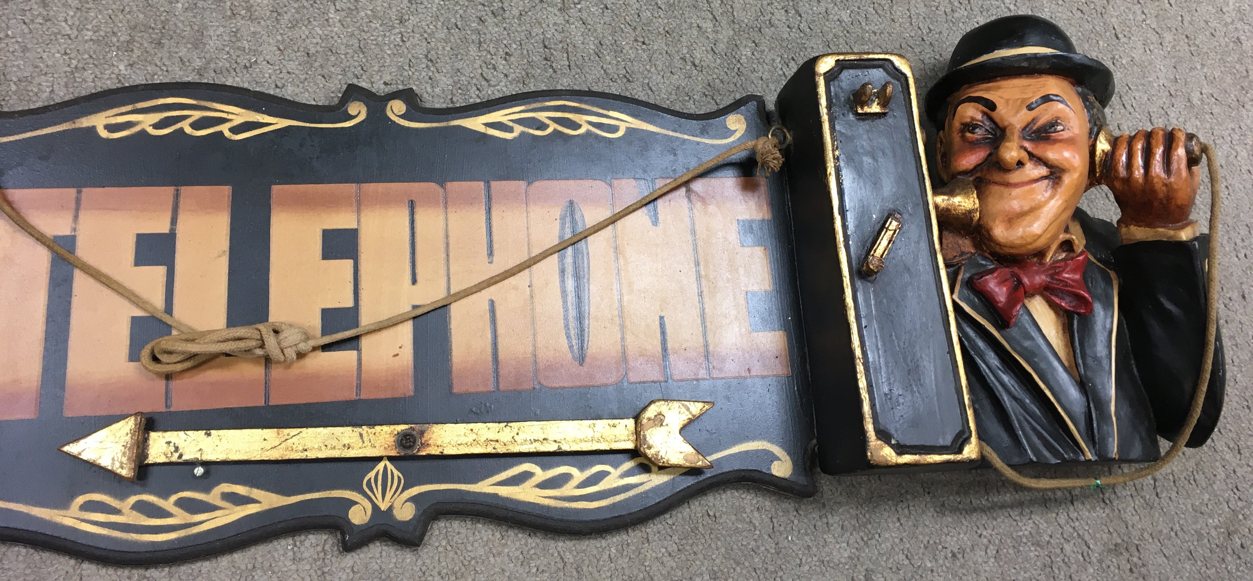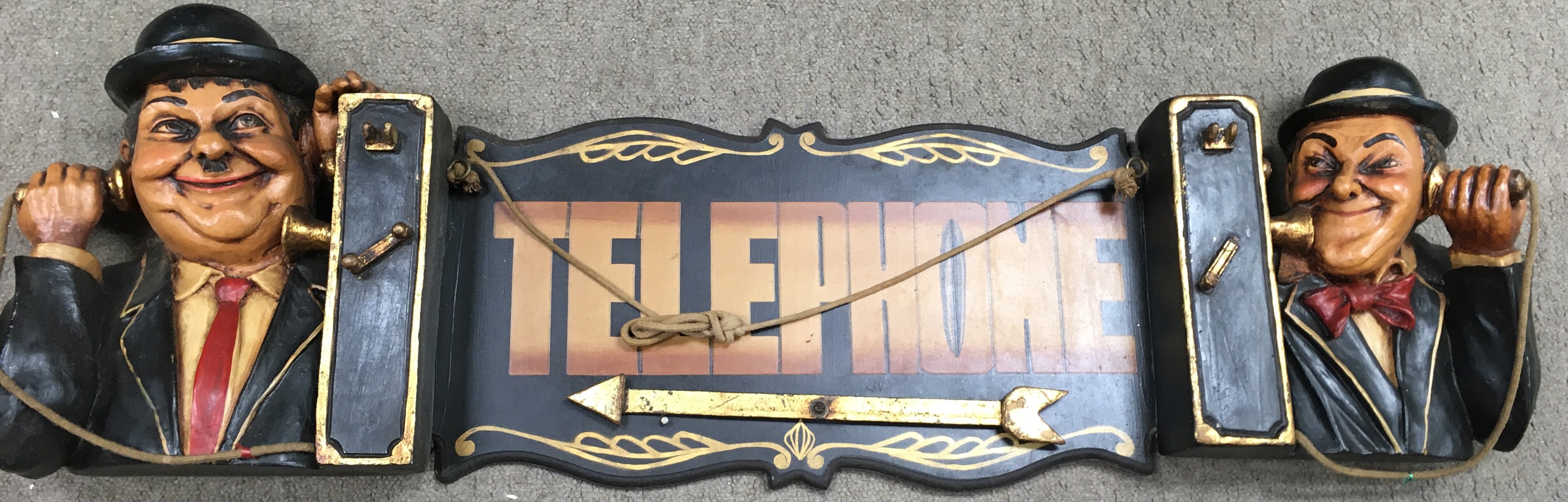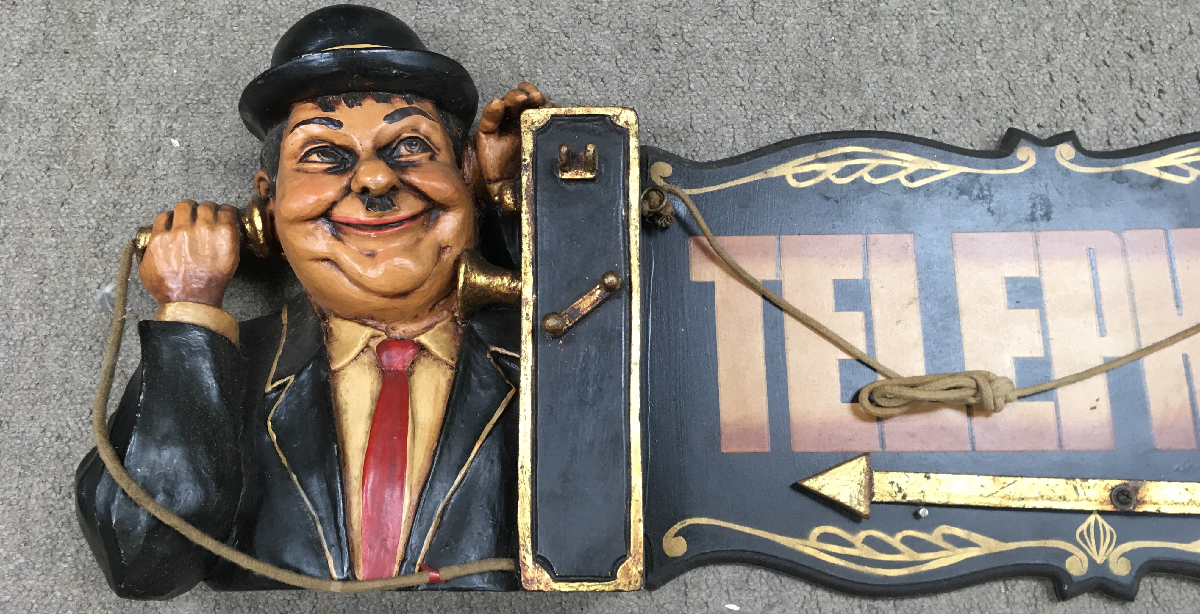 A Laurel and Hardy telephone sign with a gold coloured arrow that is adjustable/able to rotate. It measures around 106cm wide.