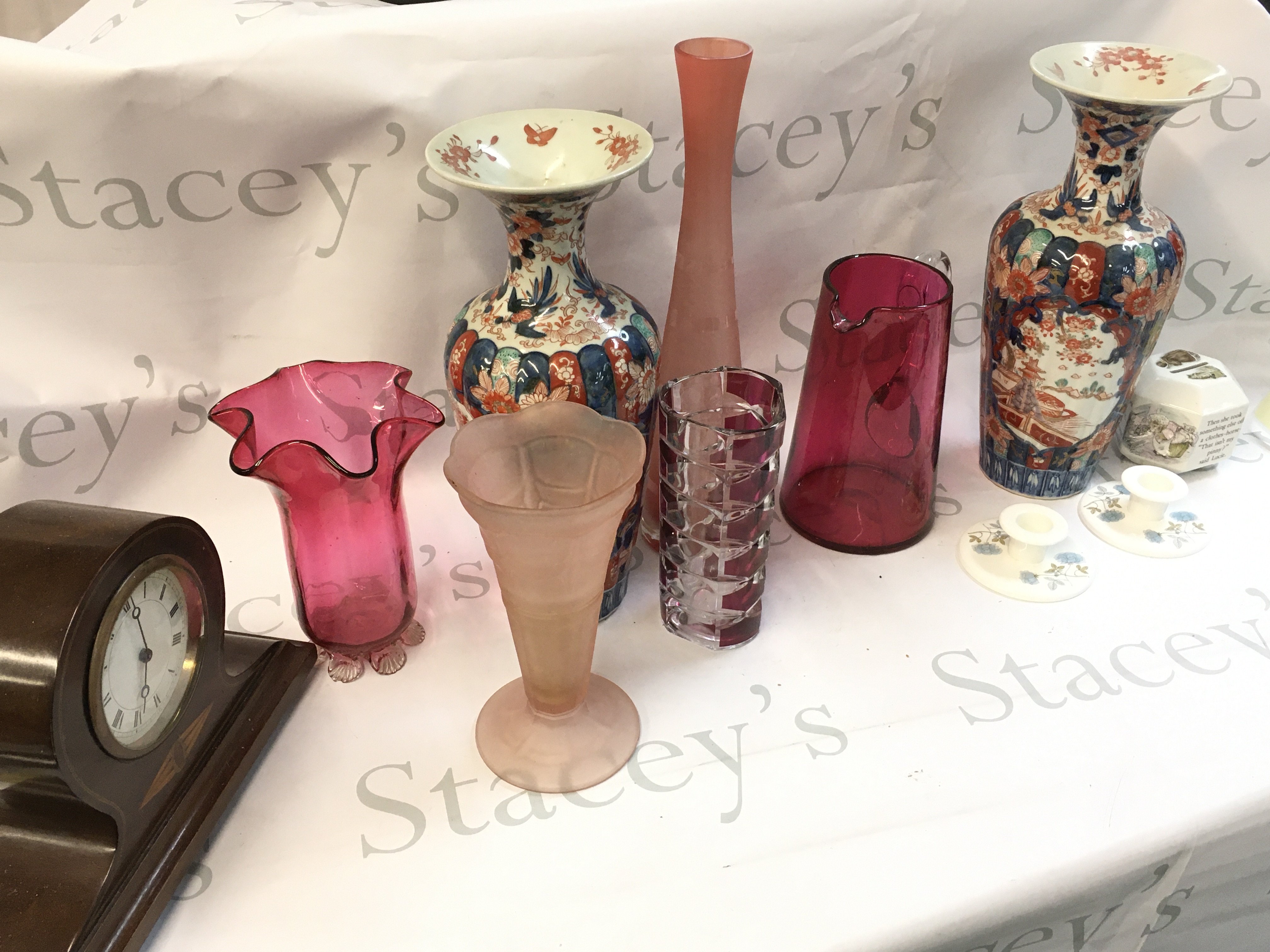 A collection of ceramics including Imari ware vases, pink glass vases, wooden mantle clock with inlaid design