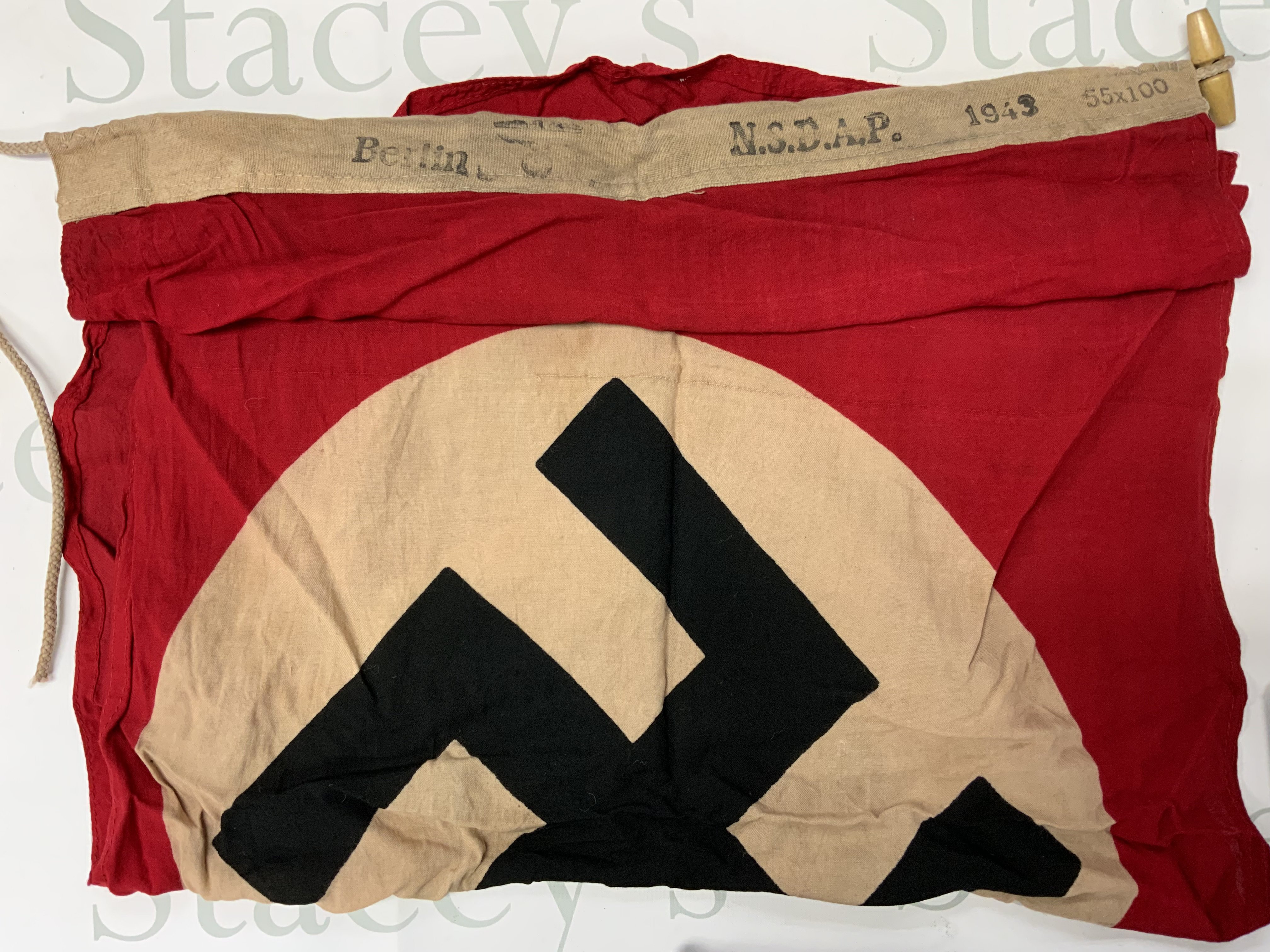 A German N.S.D.A.P. cotton flag printed to the border Berlin N.S.D.A.P. and dated 1943, 55 x 100.