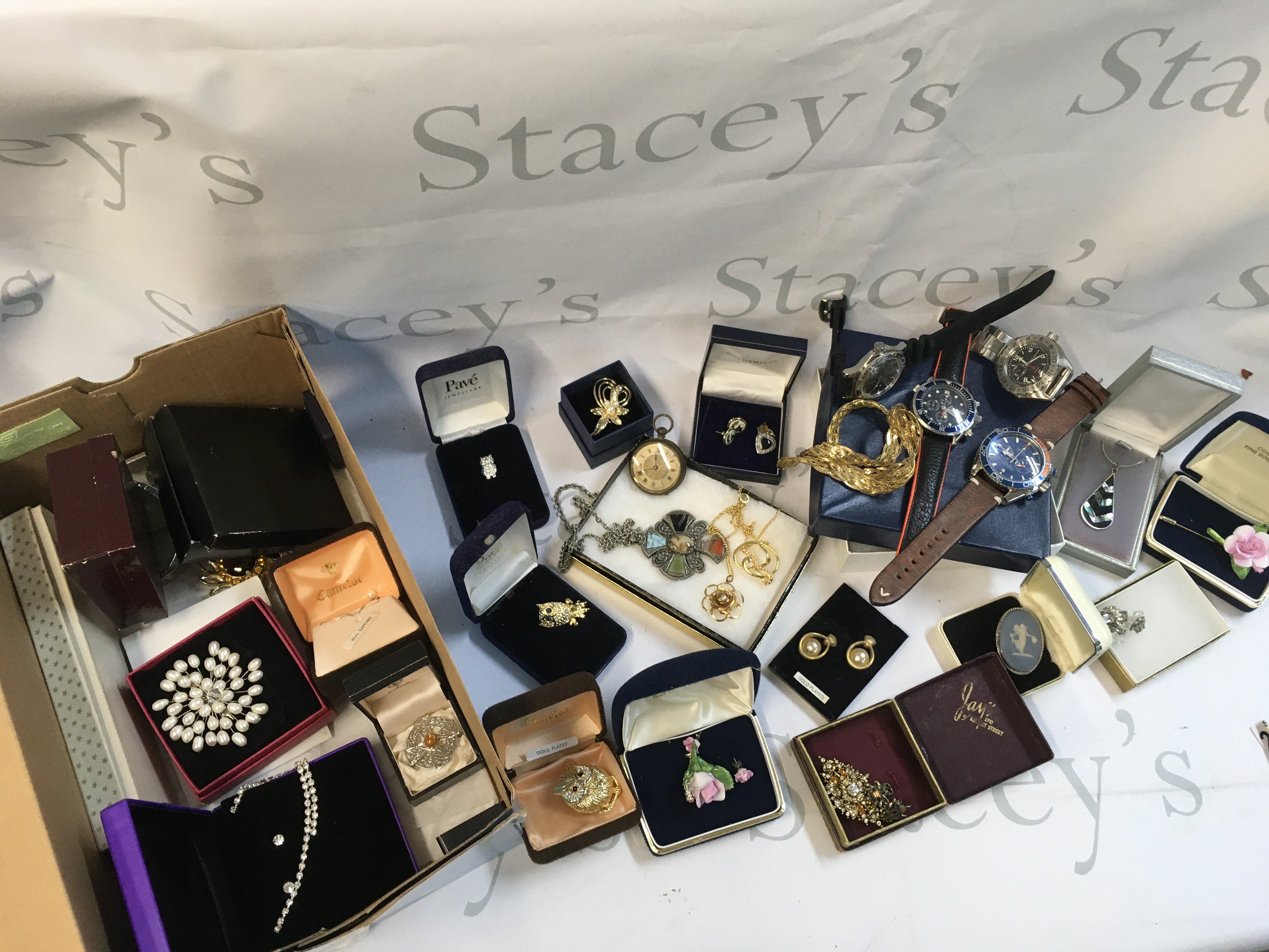A collection of costume jewellery including watches, Celtic necklace, small pocket watch etc