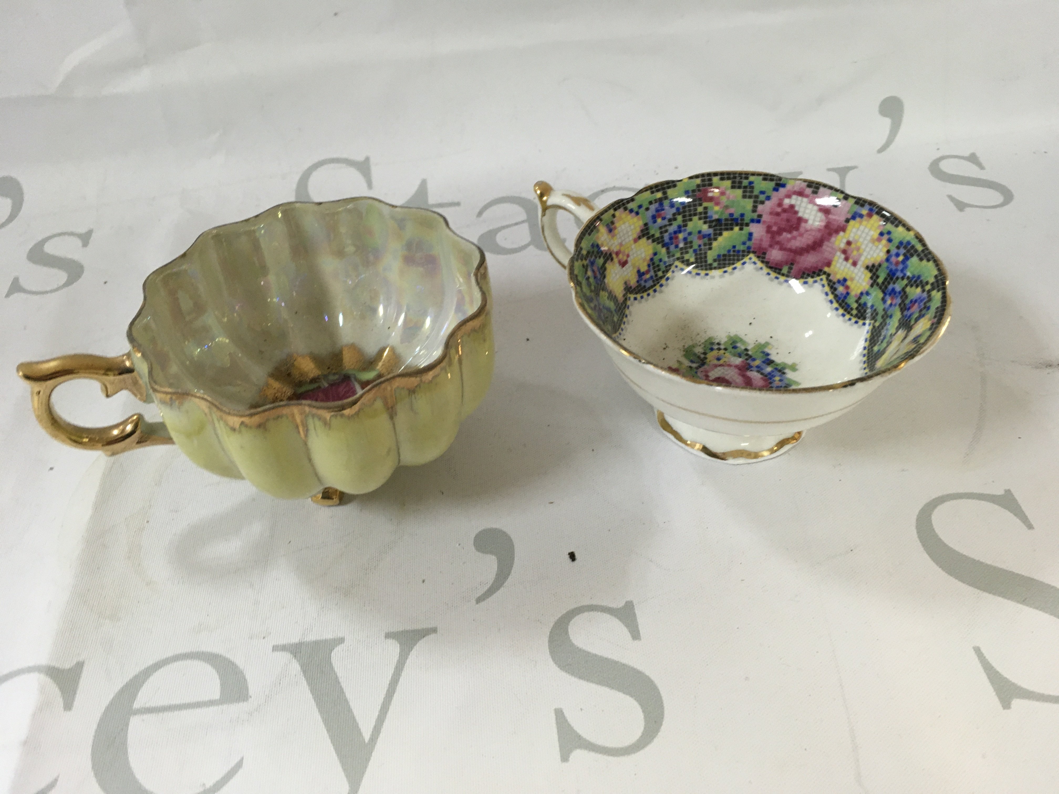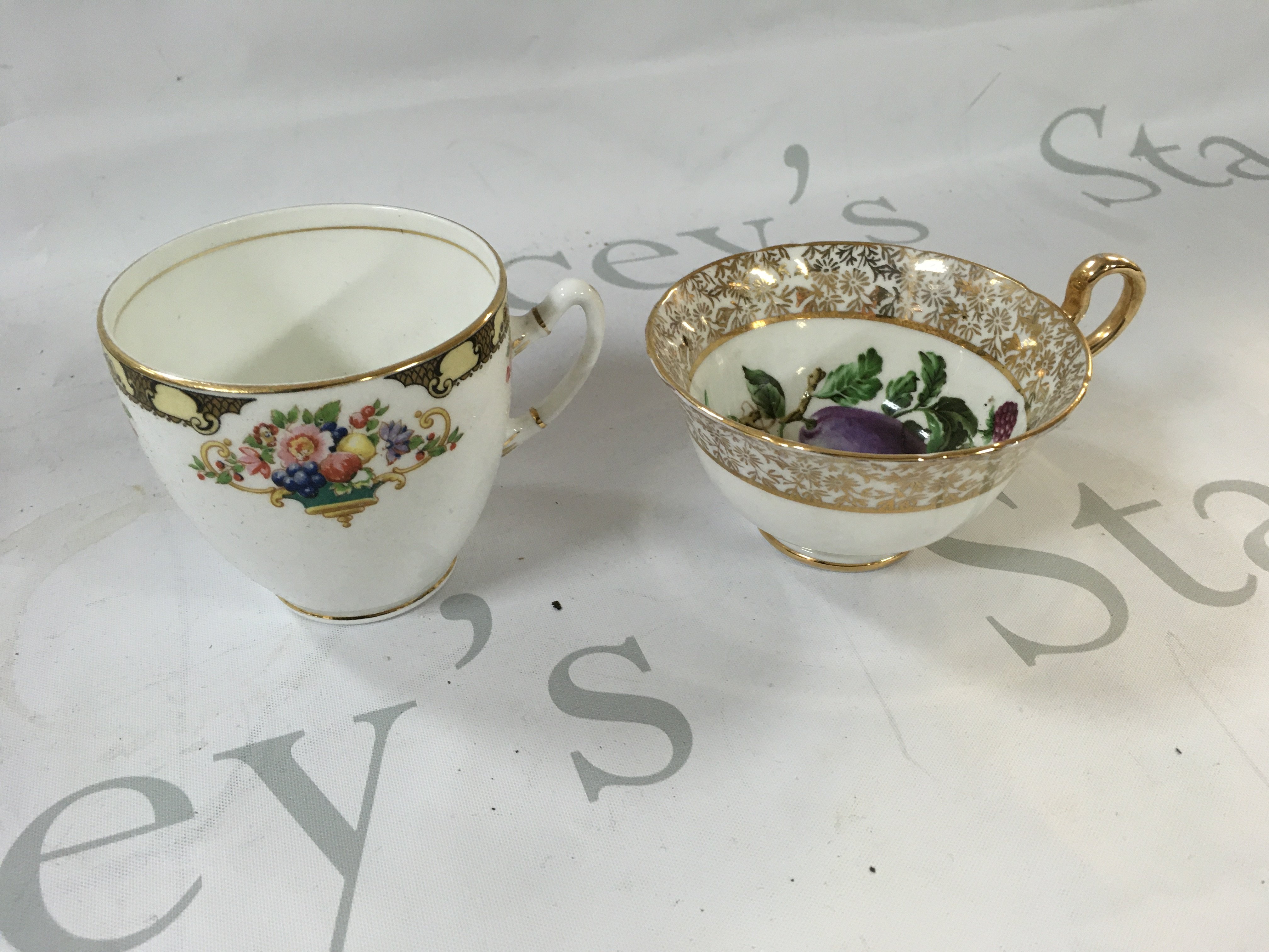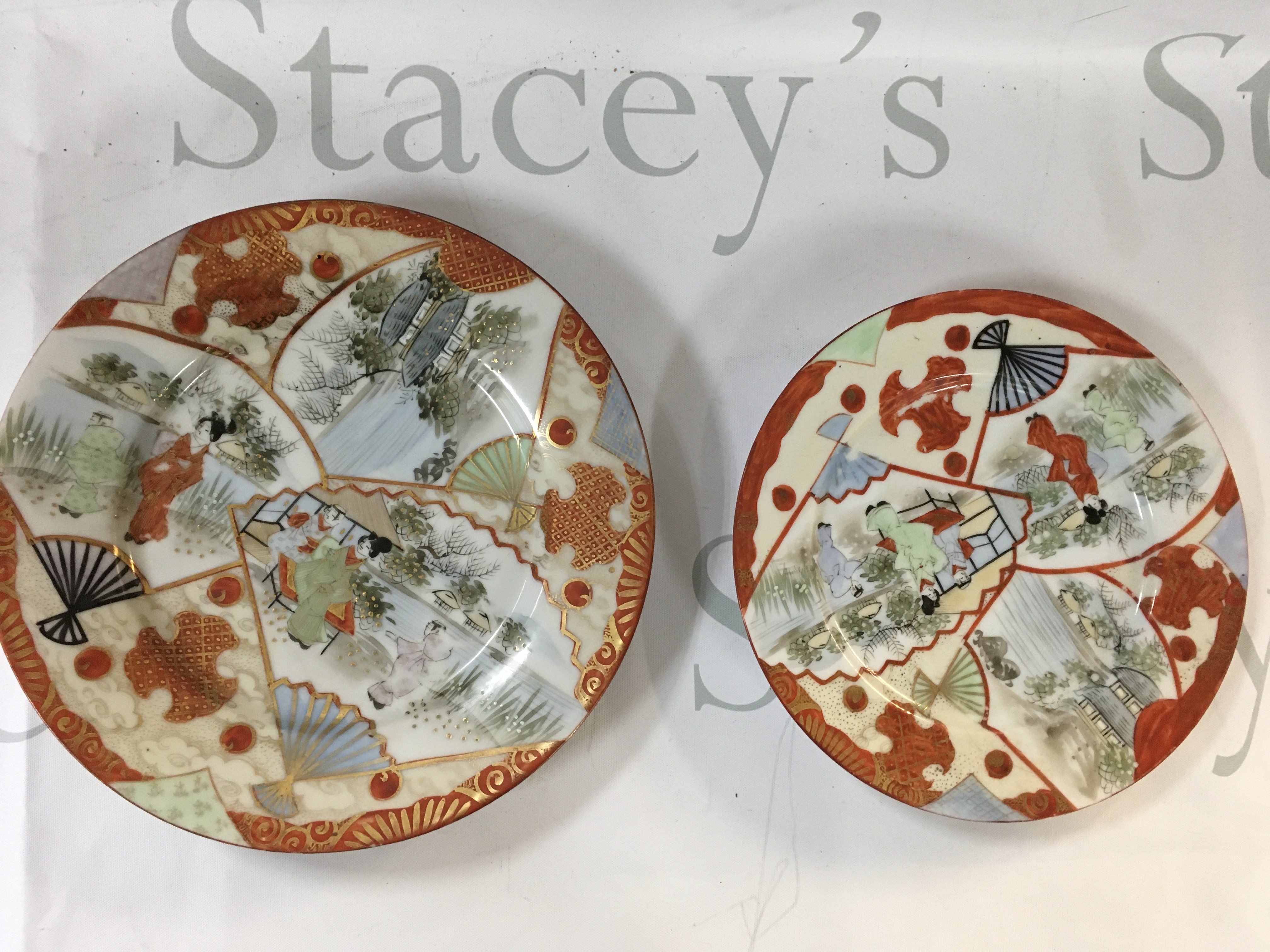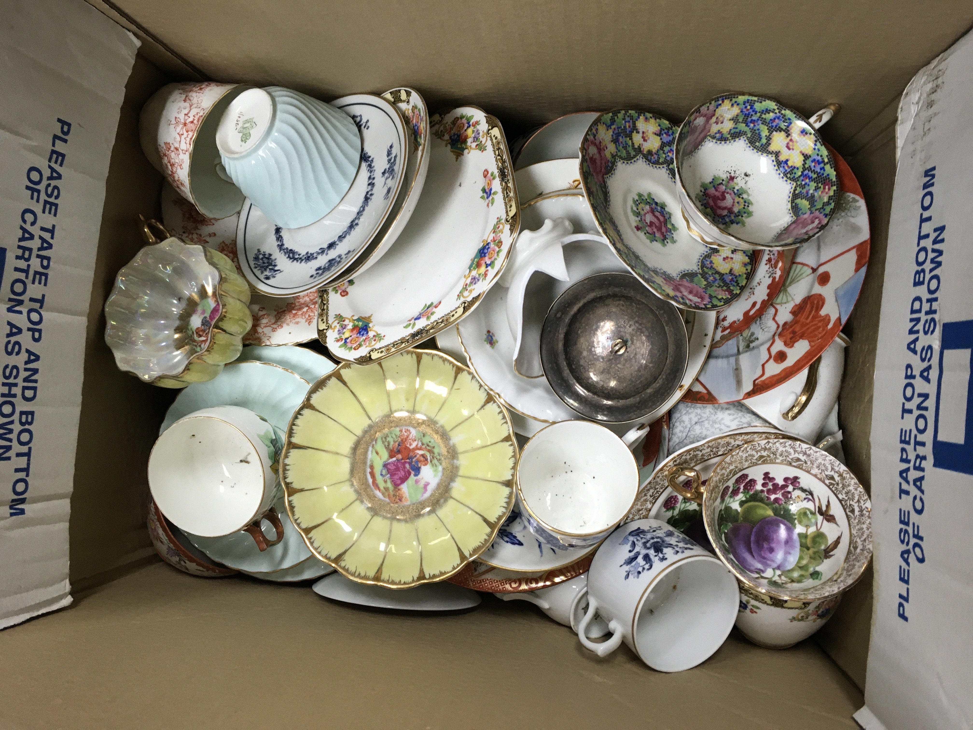 Box of ceramic plates, teacups, bowls and more. Multiple different colours for each piece of equipment.