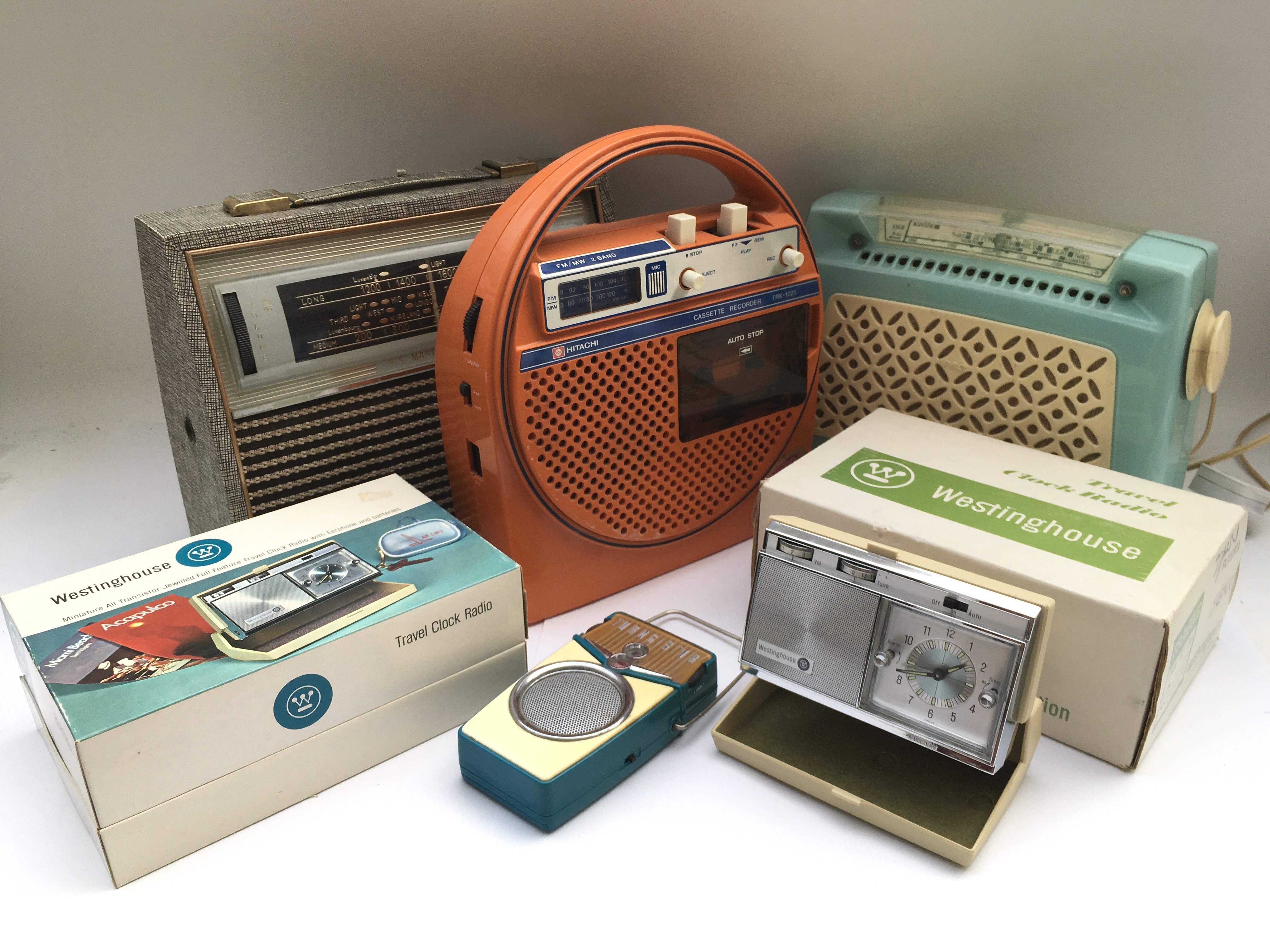 A box of vintage radios including HMV, GEC and others examples.