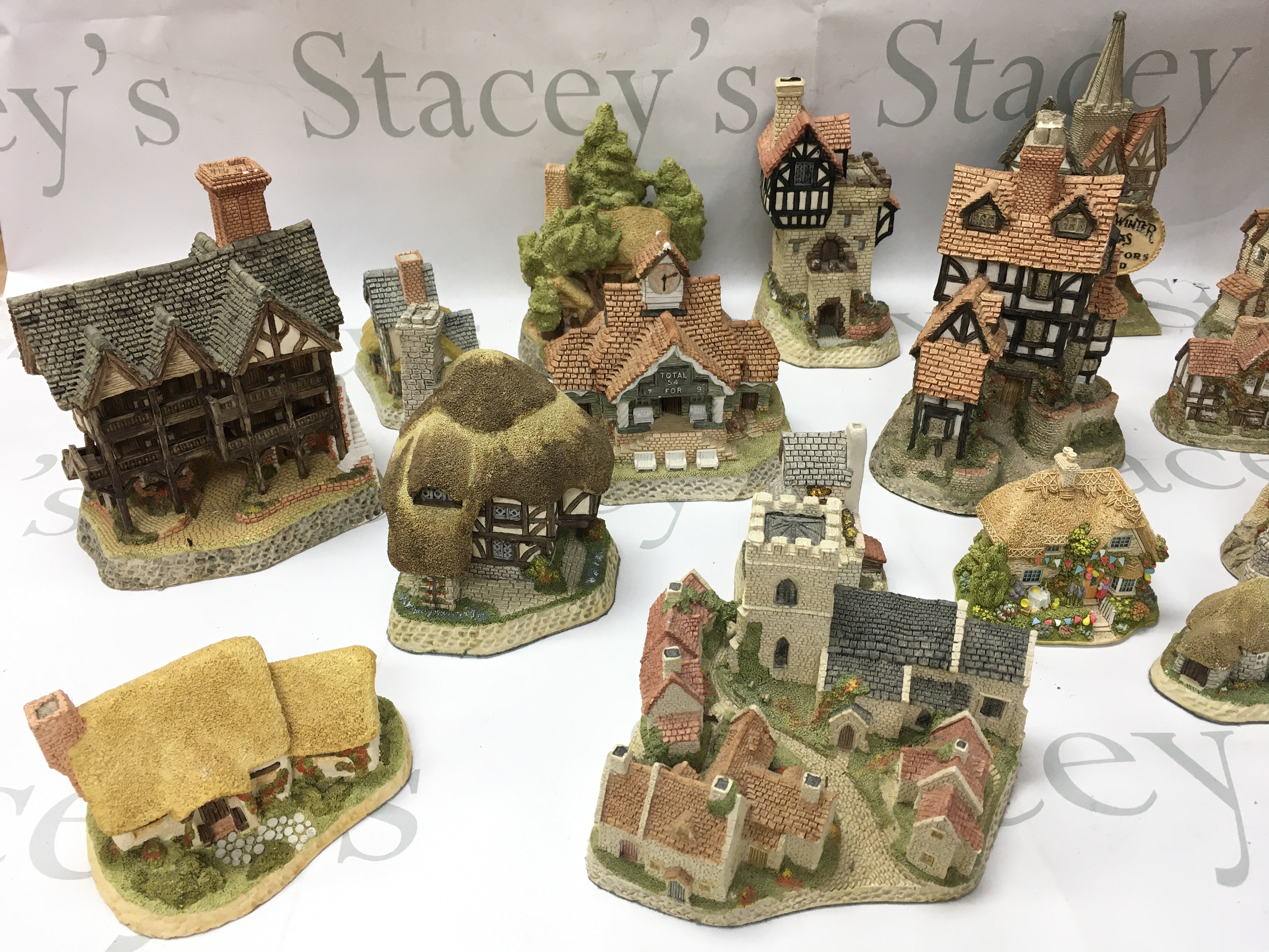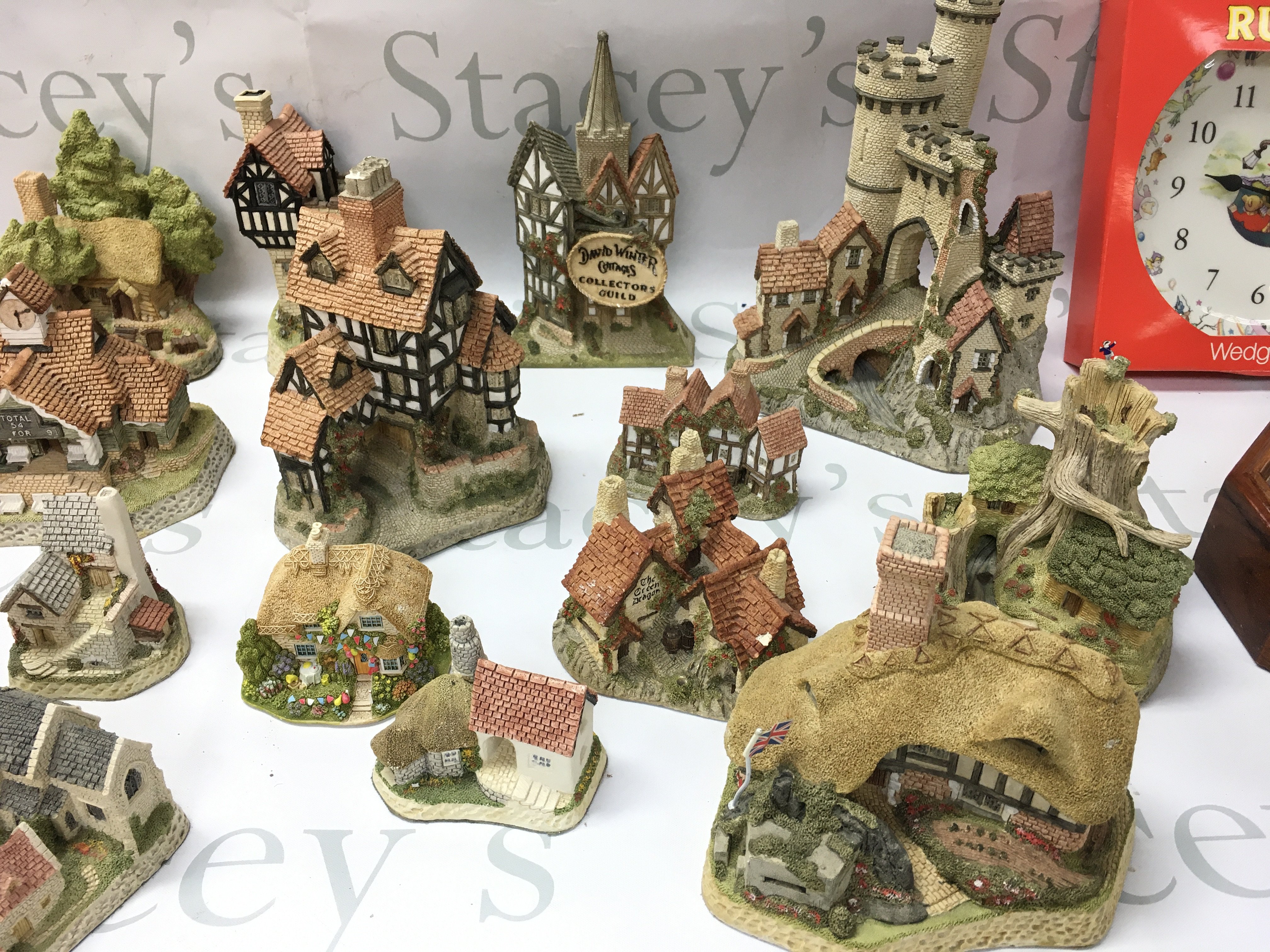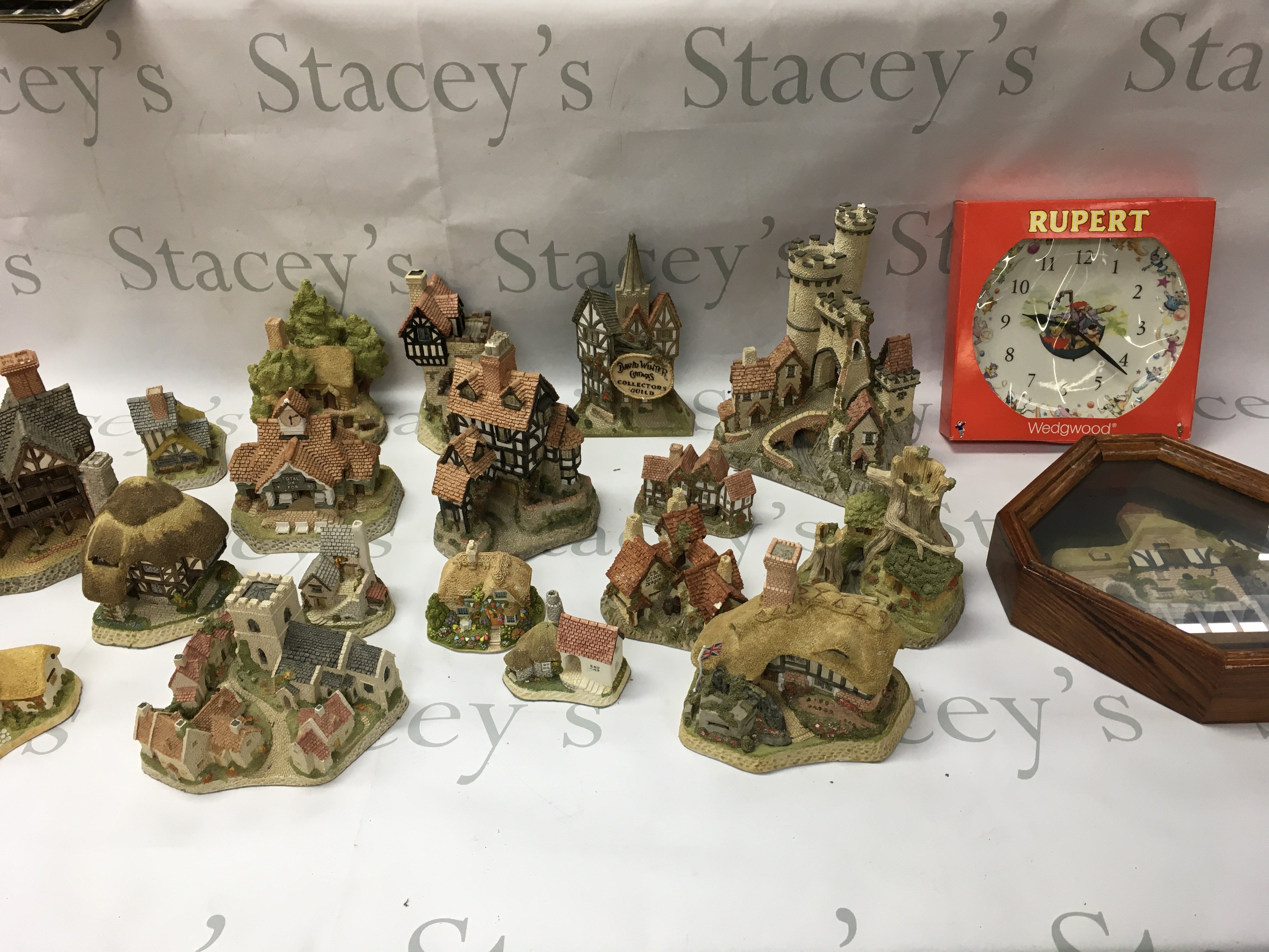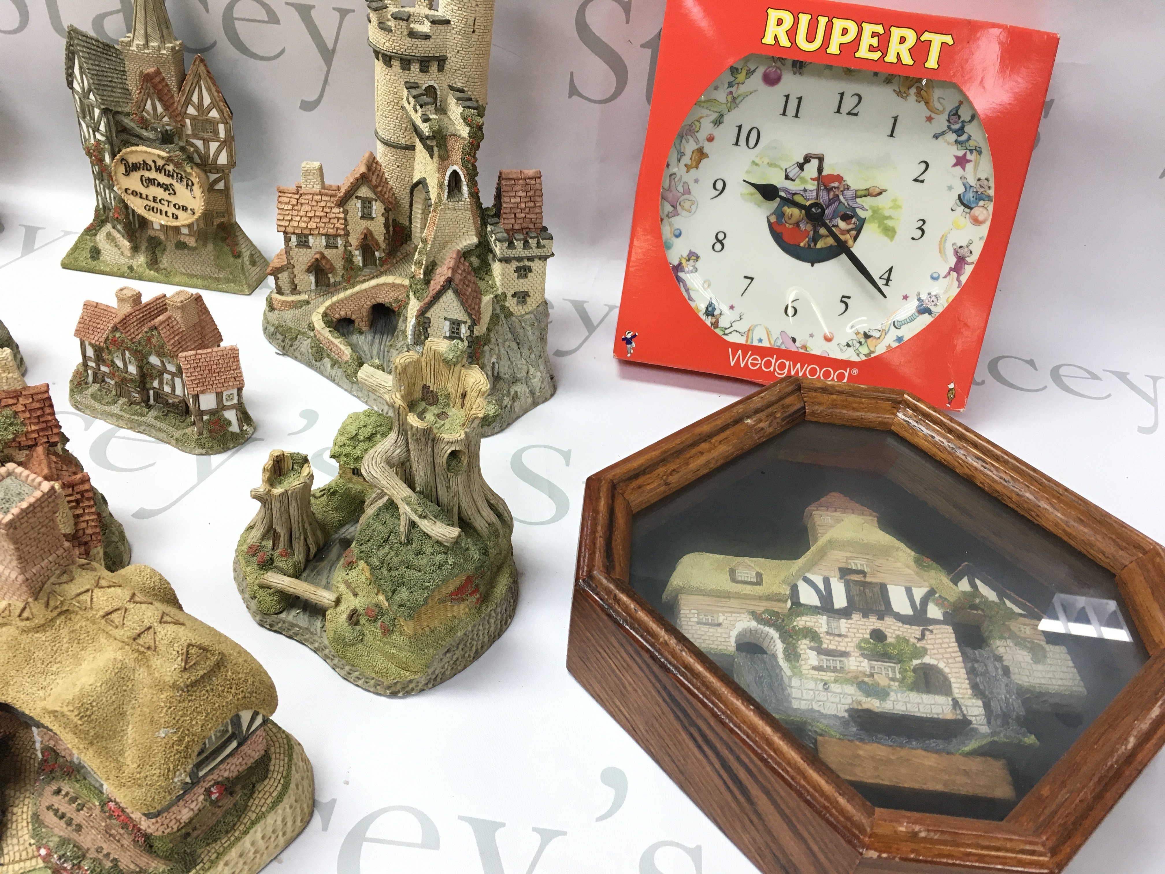 A collection of David Winter cottages and a Wedgewood Rupert clock. No reserve