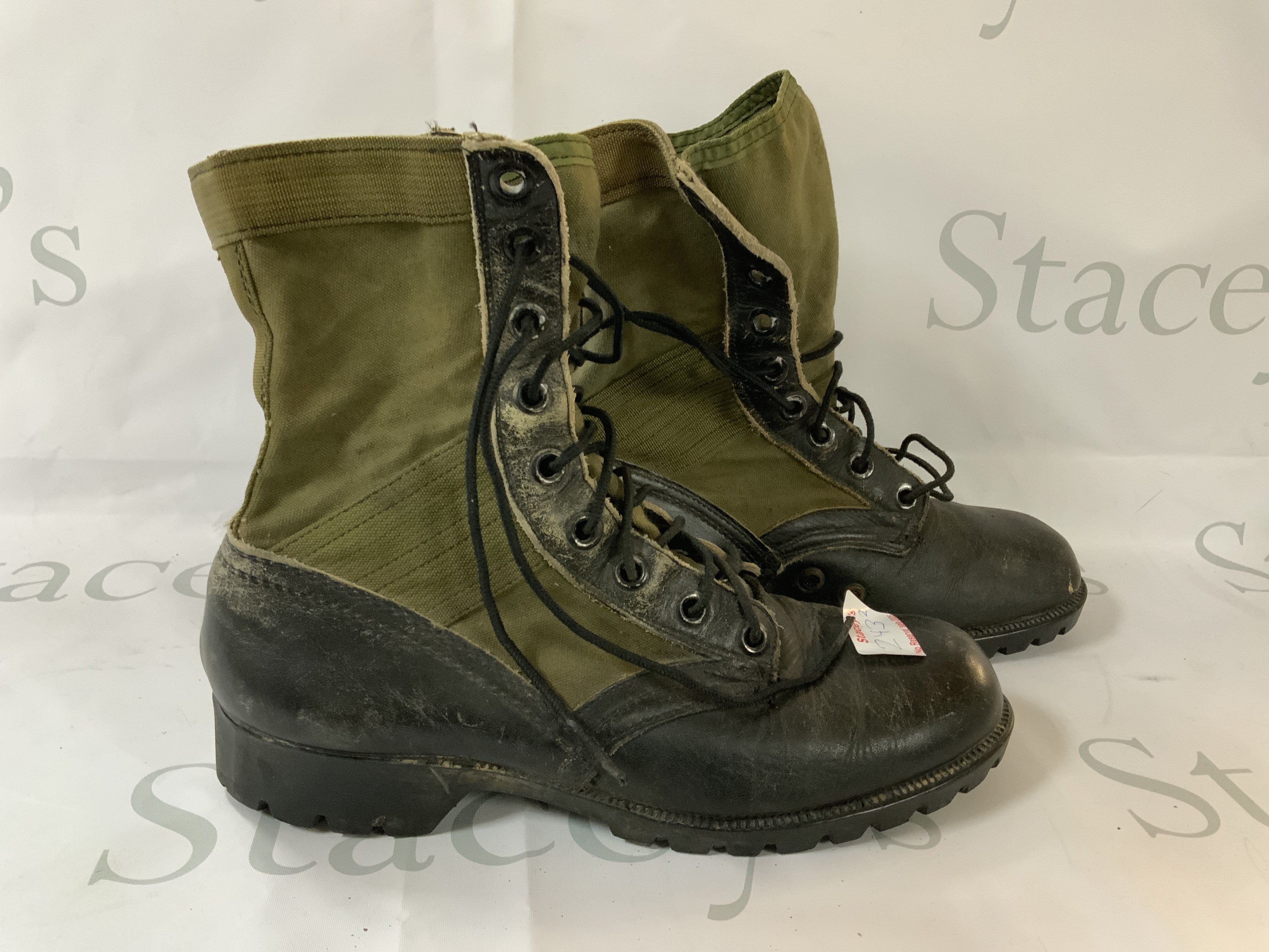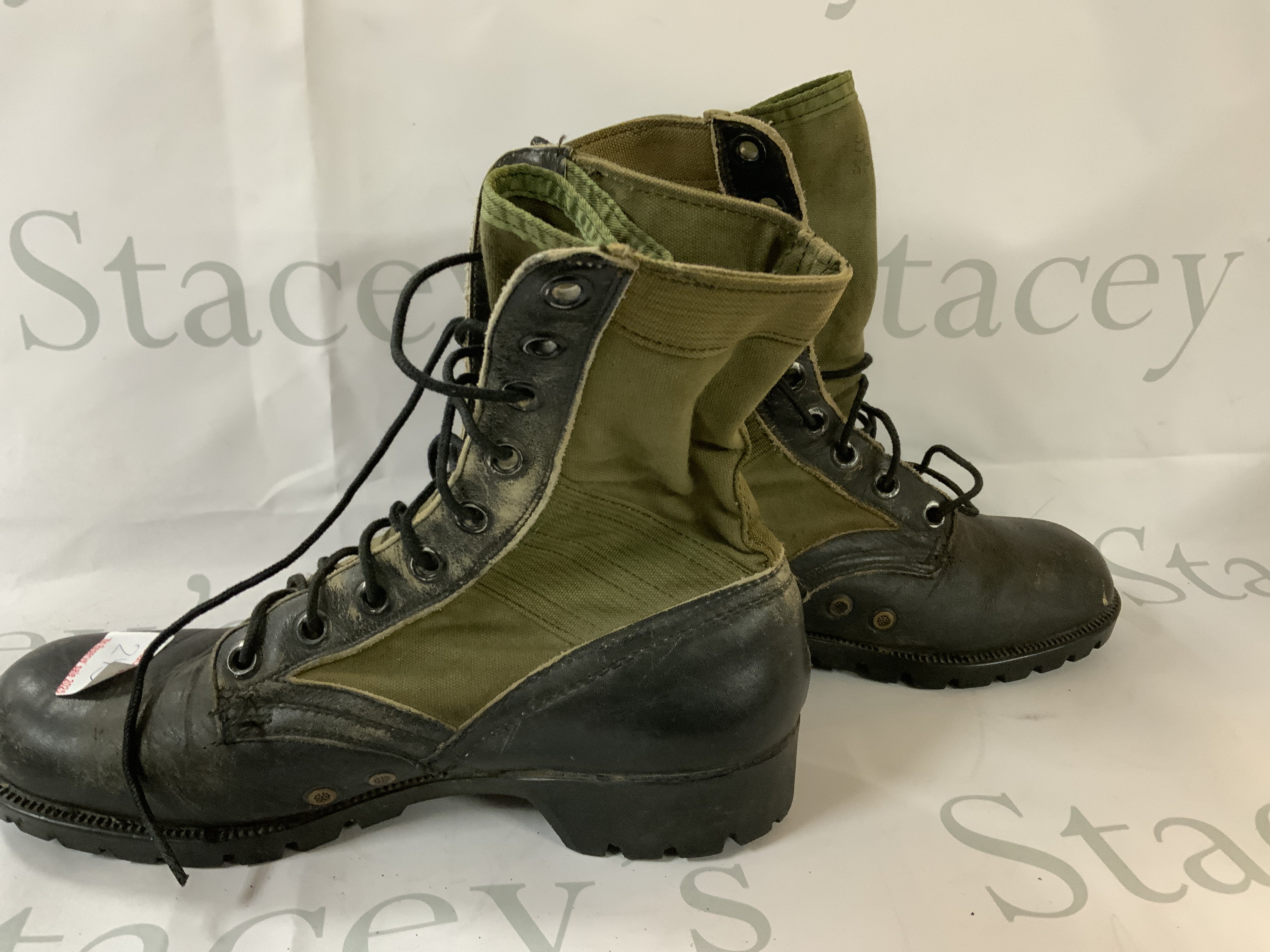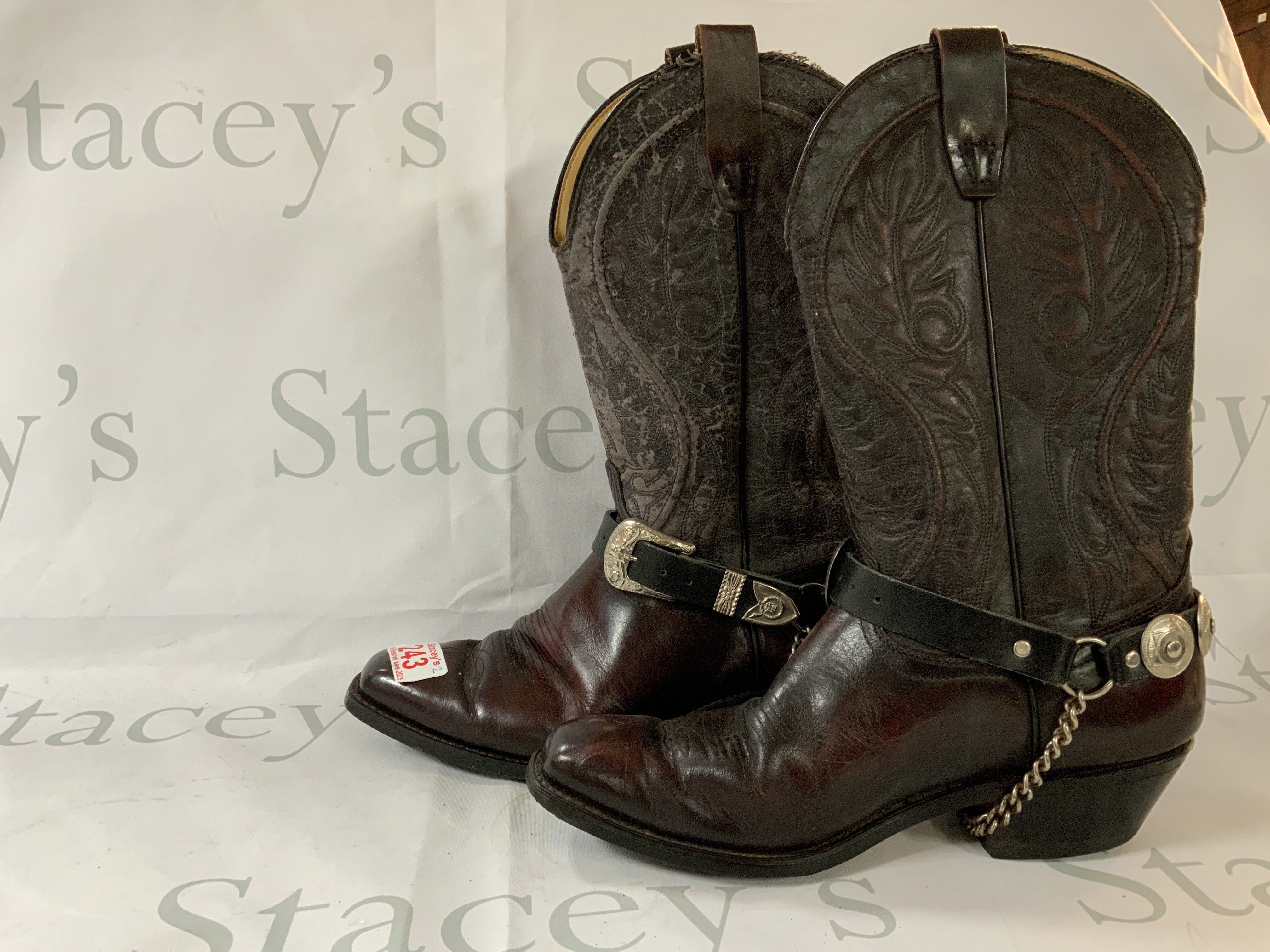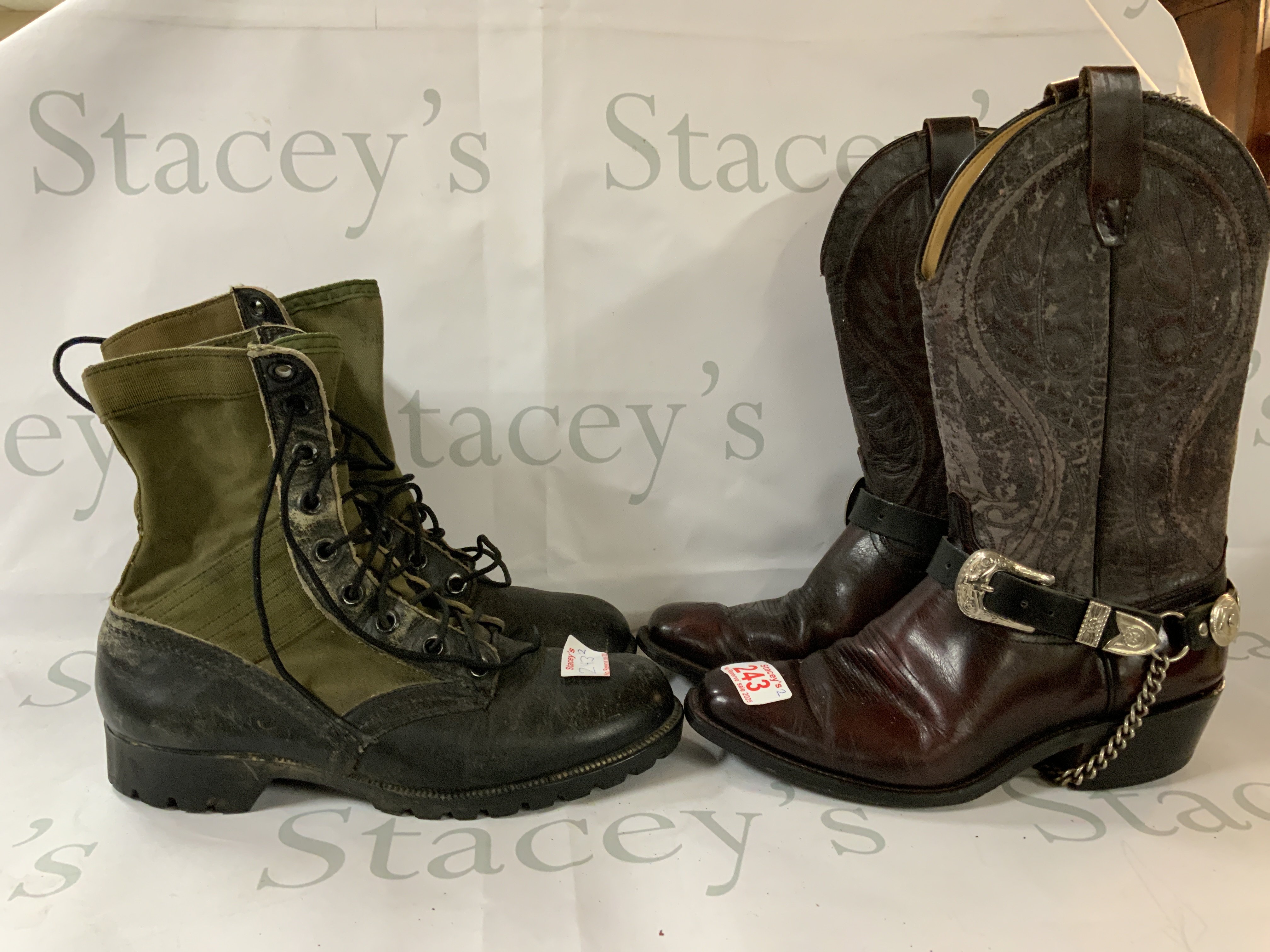 1 pair of cowboy boots, made by Laredo in the USA and 1 pair of vintage Bata military engineer boots, made in the 60’s