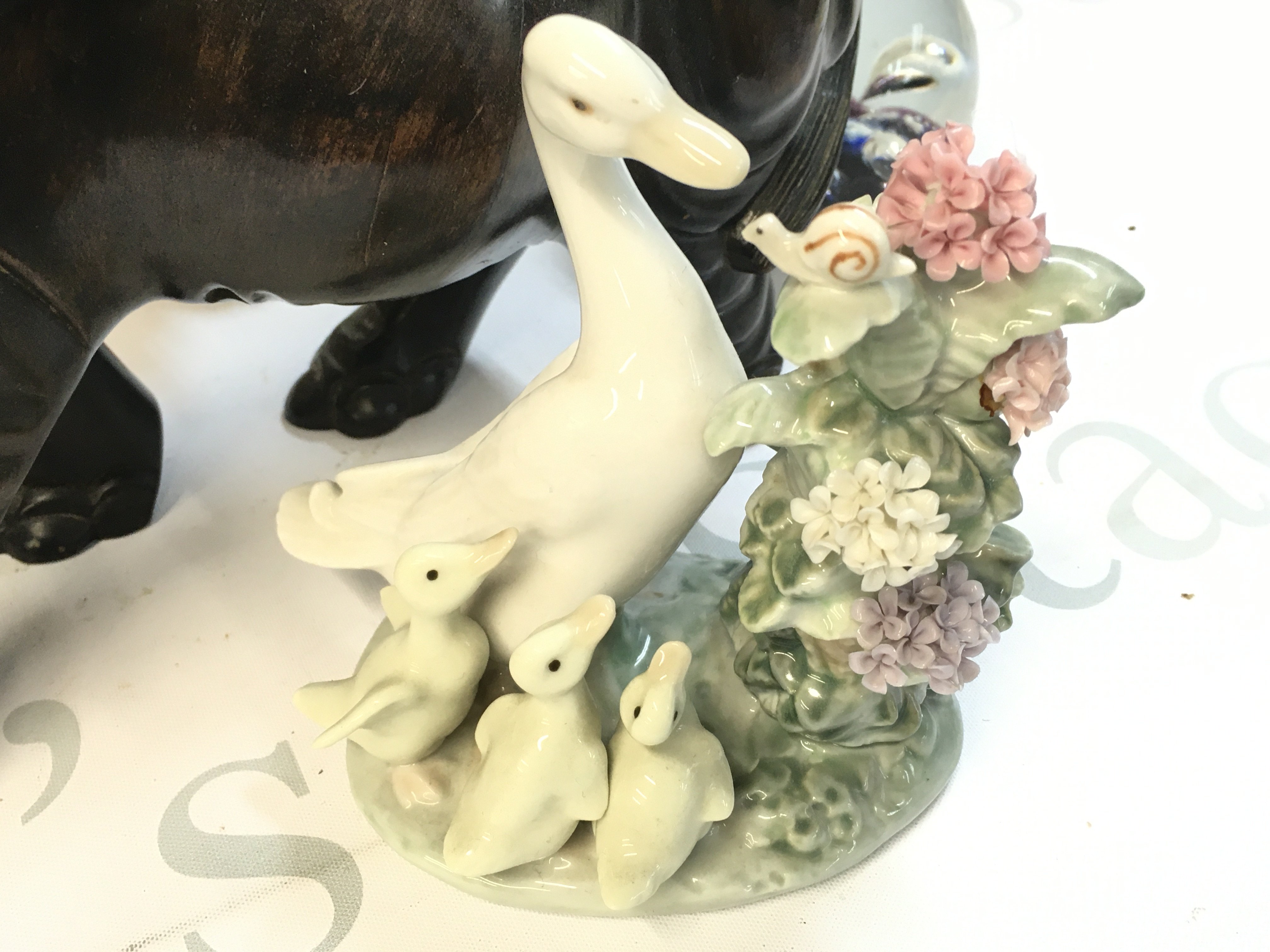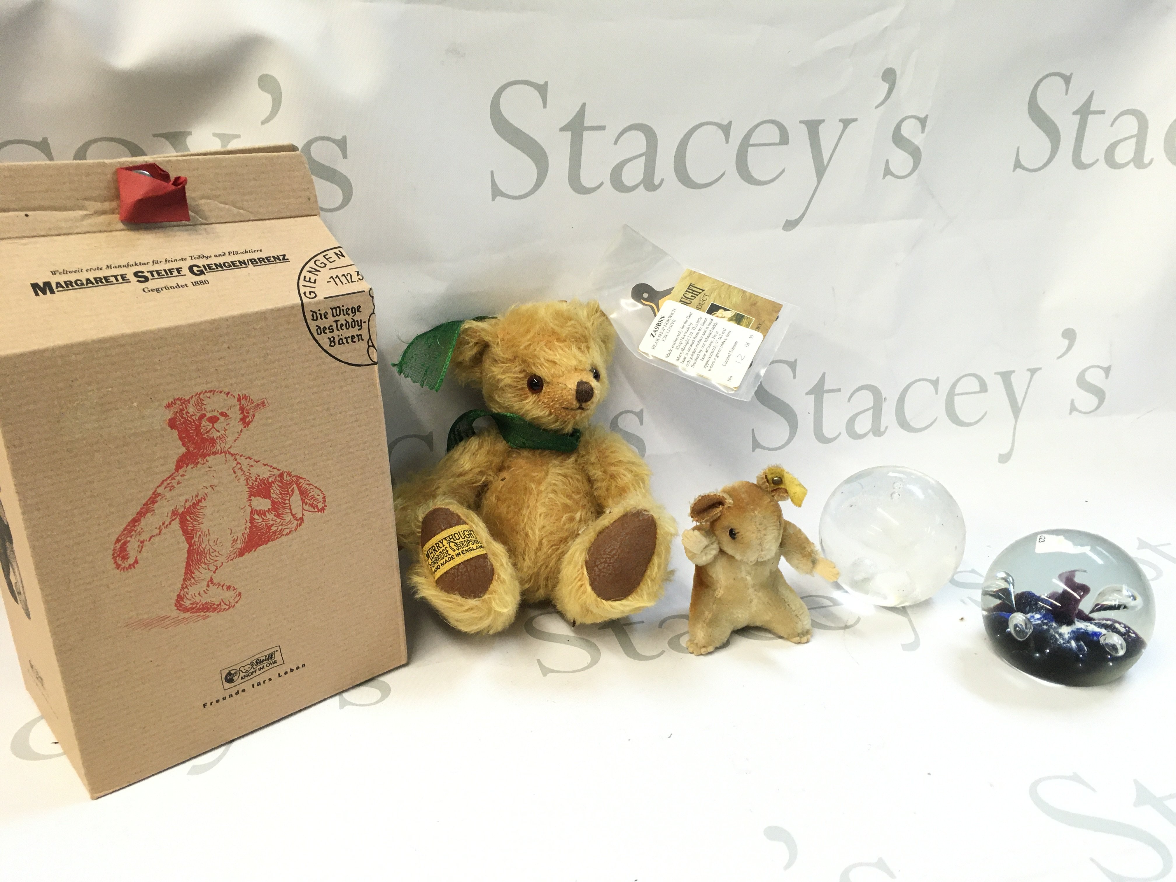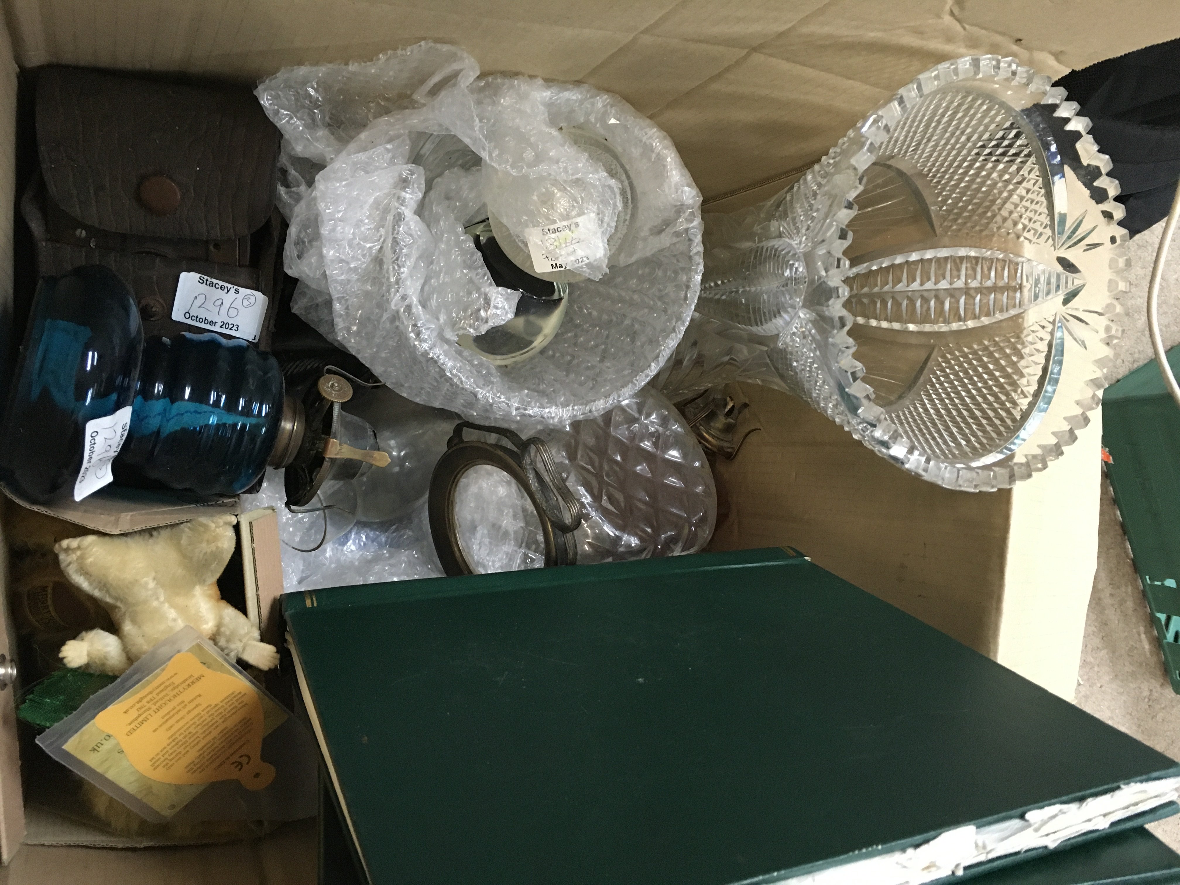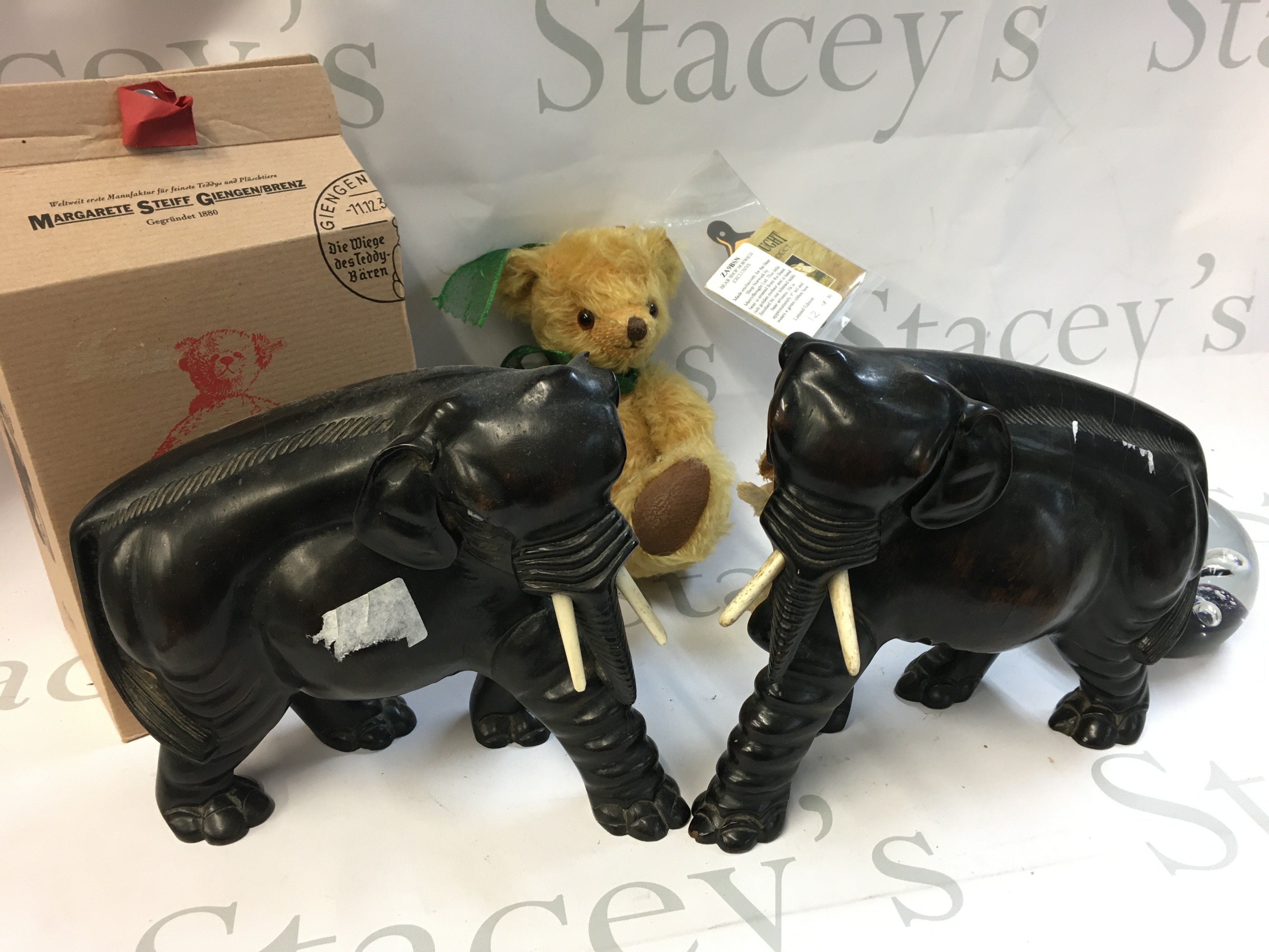 Stamp albums, hardwood elephant figures, Merrythought bear and cut glass vases