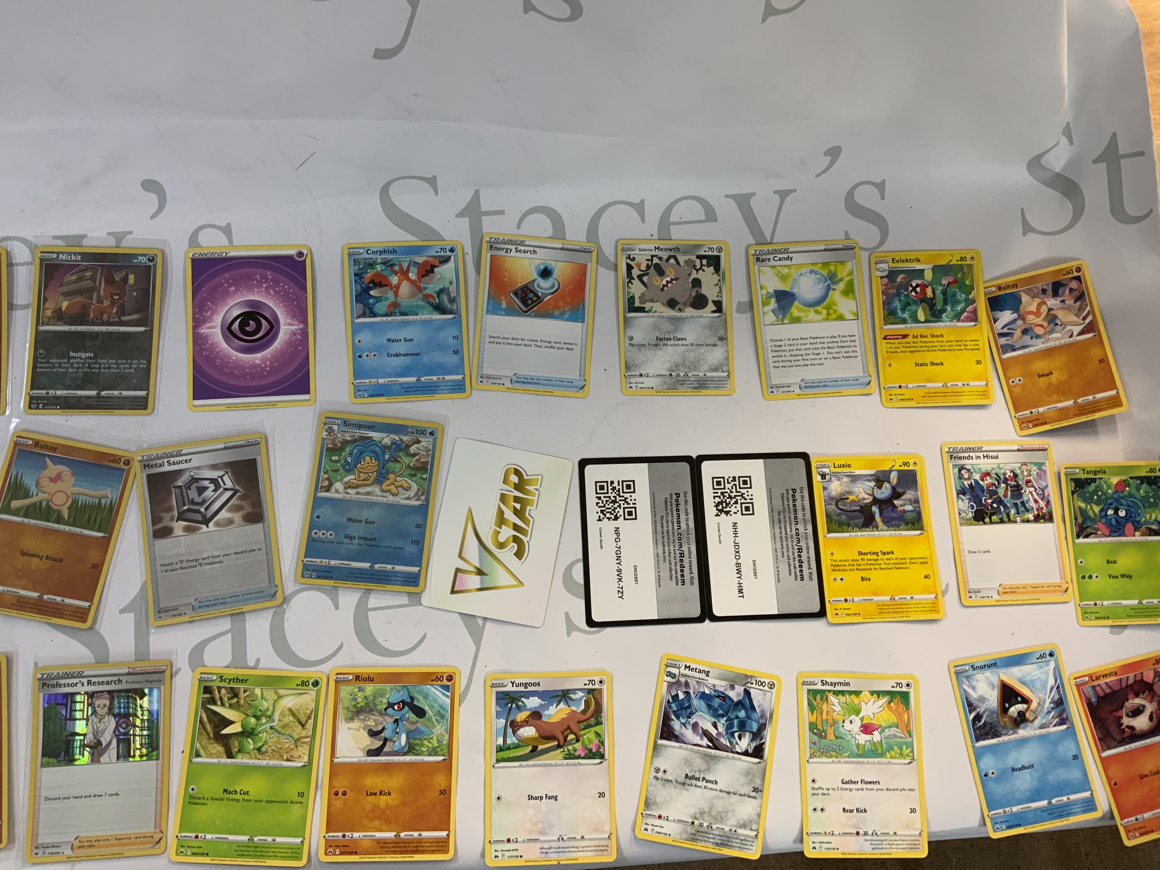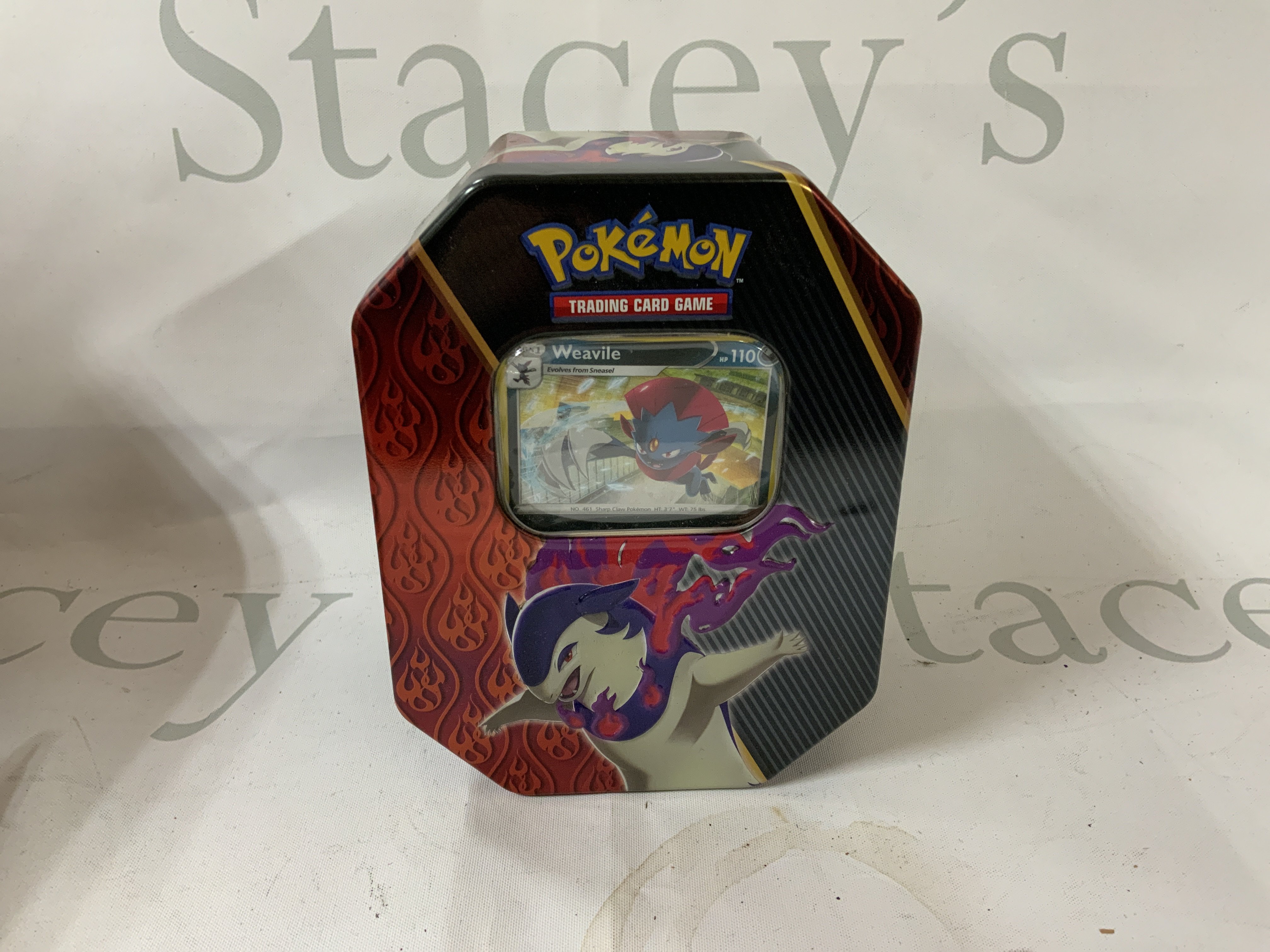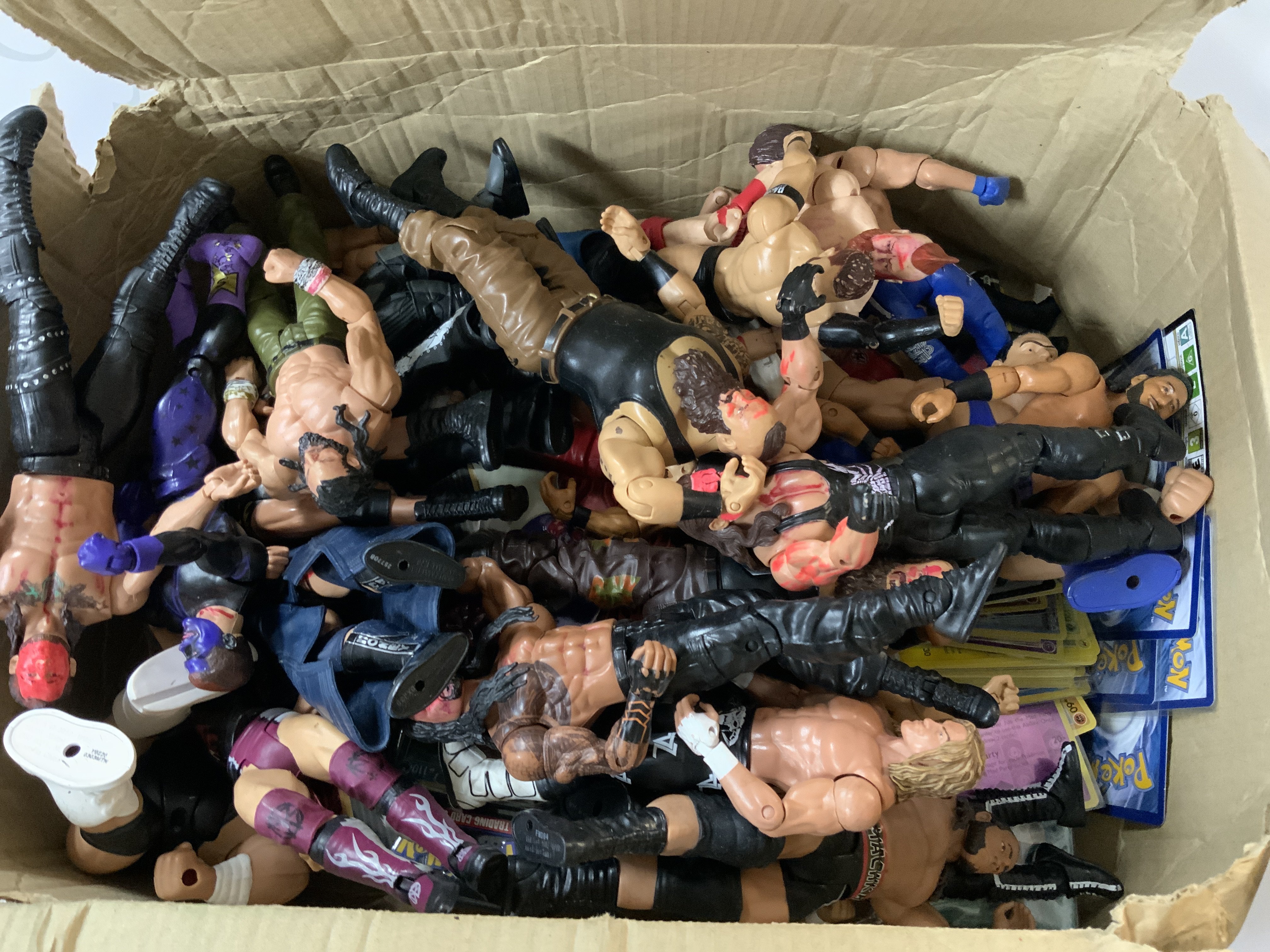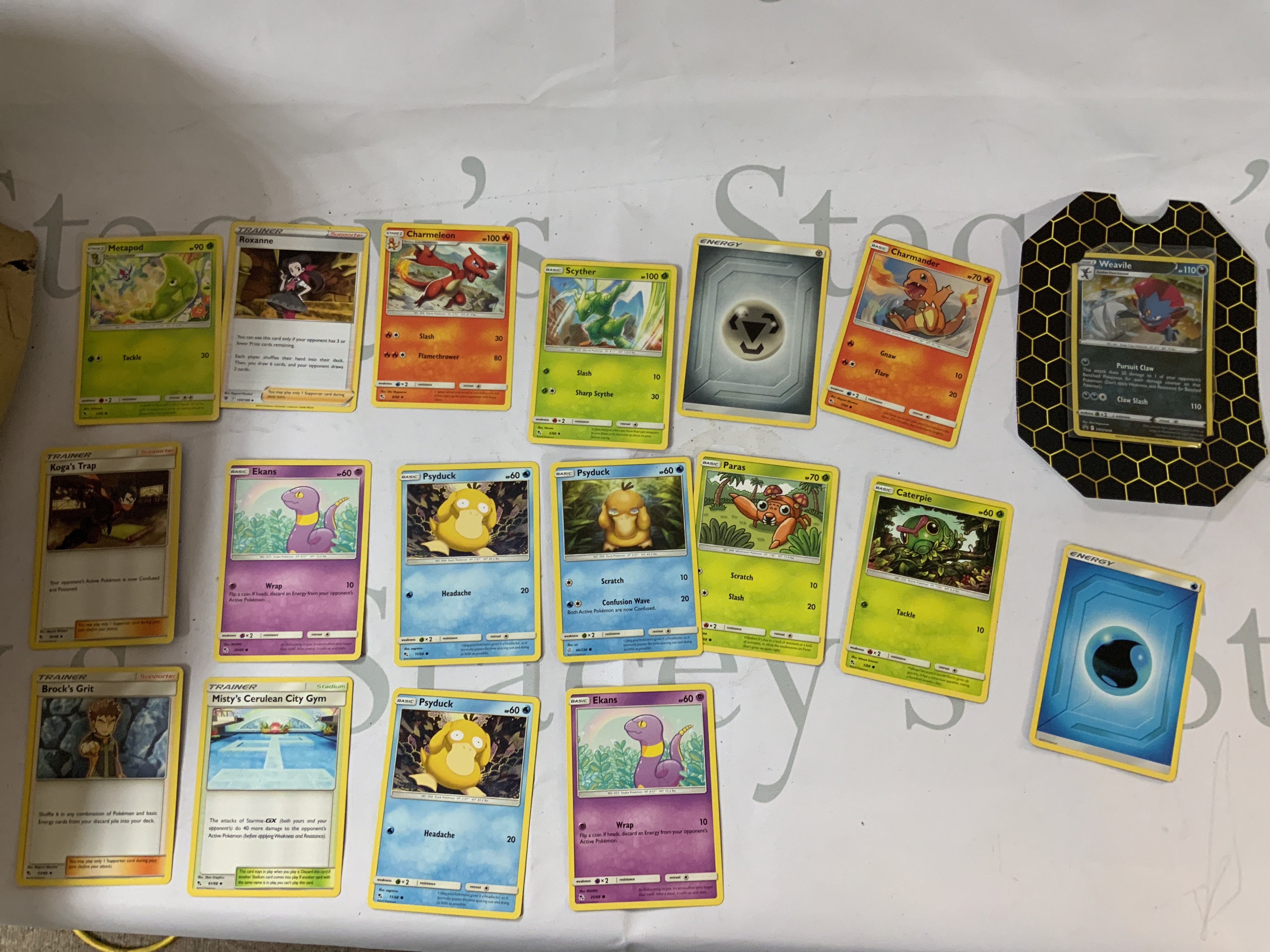 A collection of Pokemon cards, including a sealed Sun and Moon Cosmic Eclipse Unseen Depths theme deck, and WWE figurines.