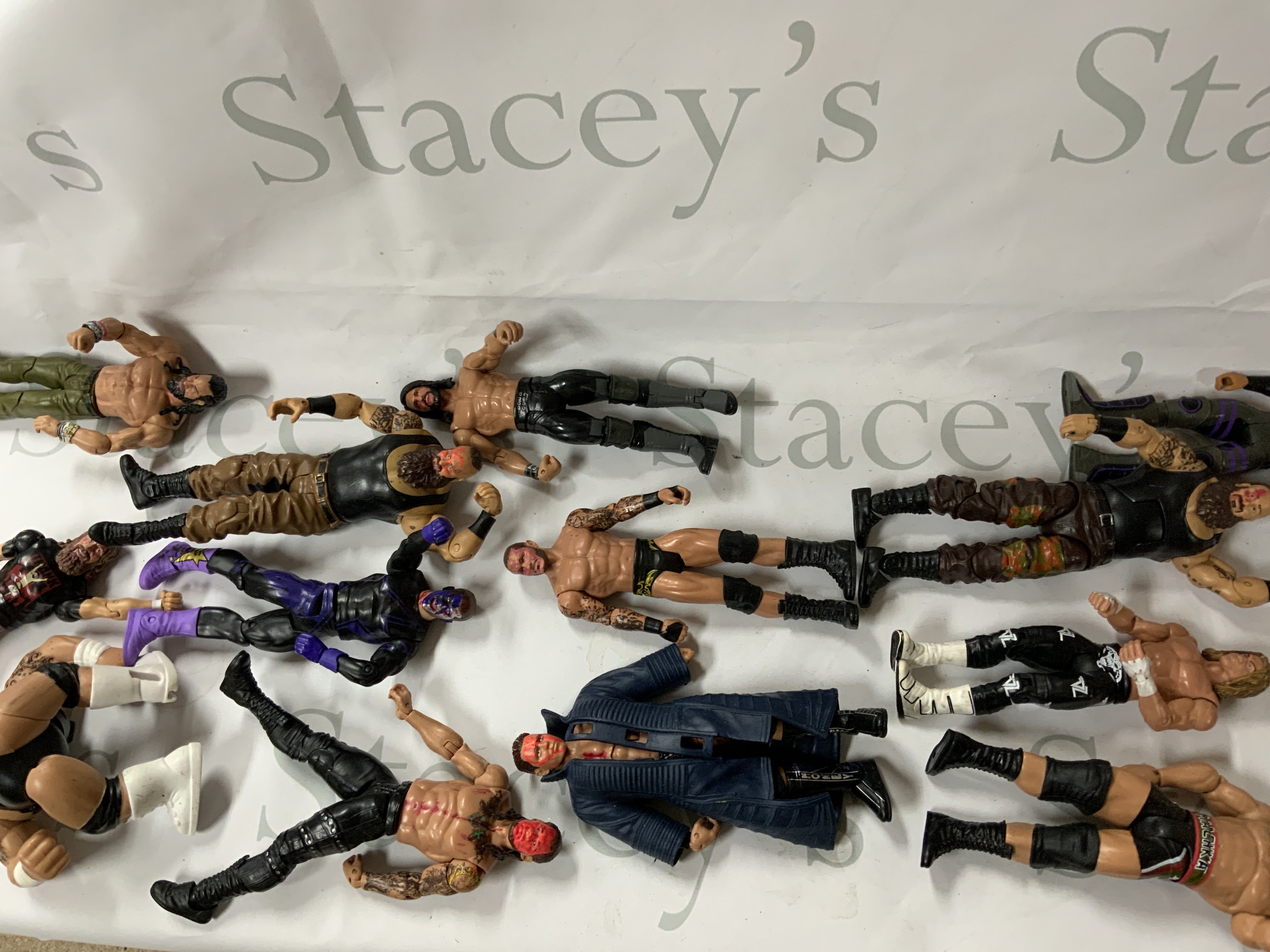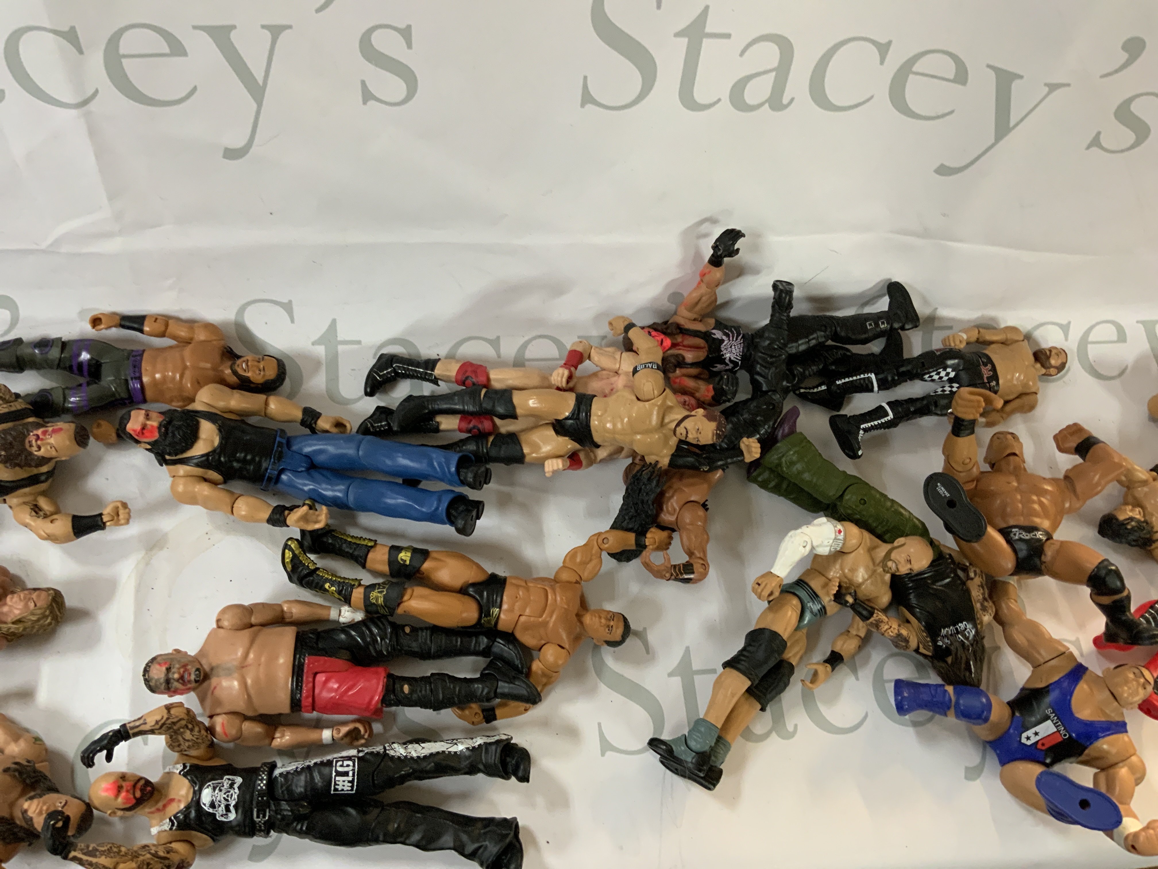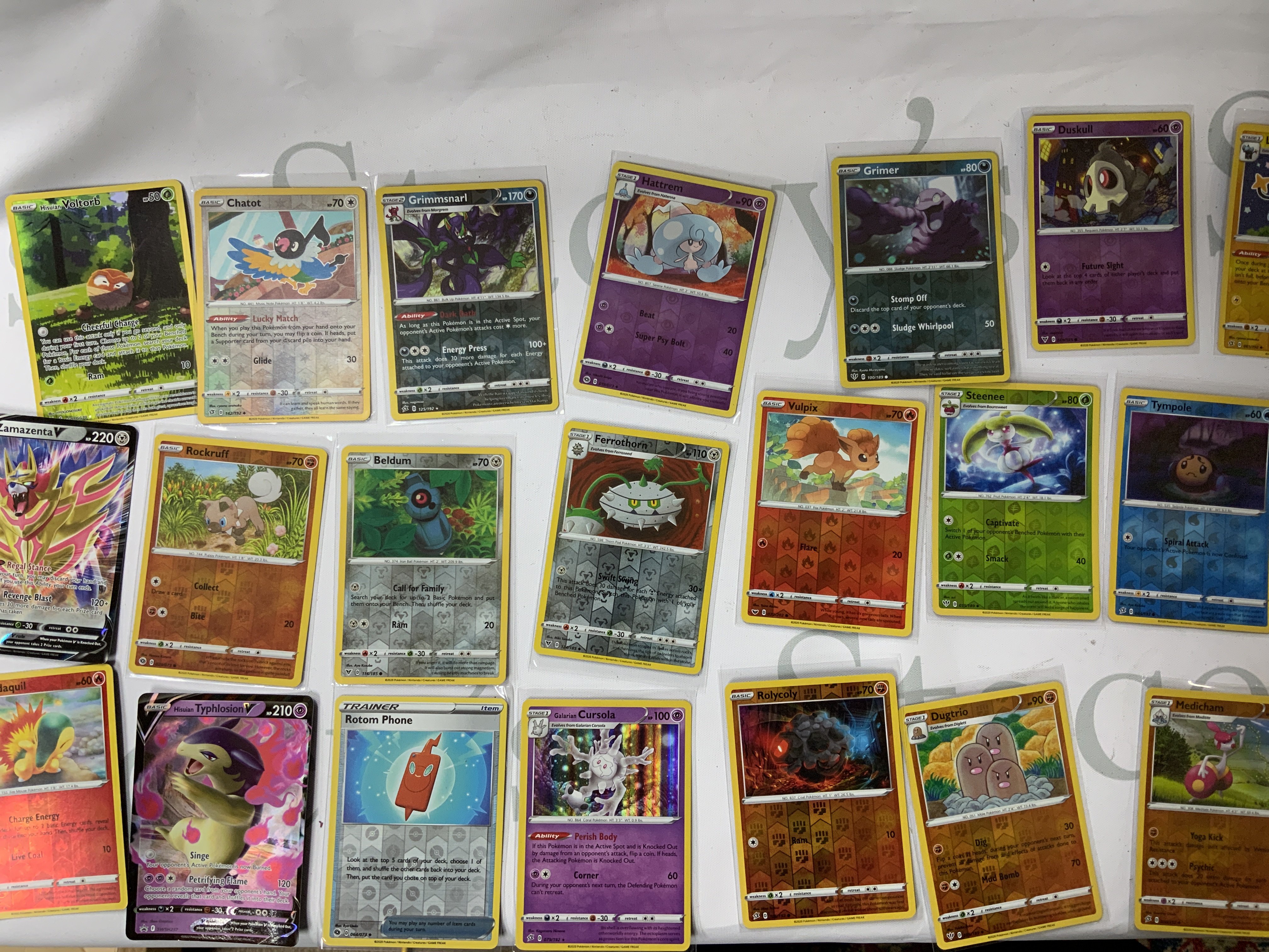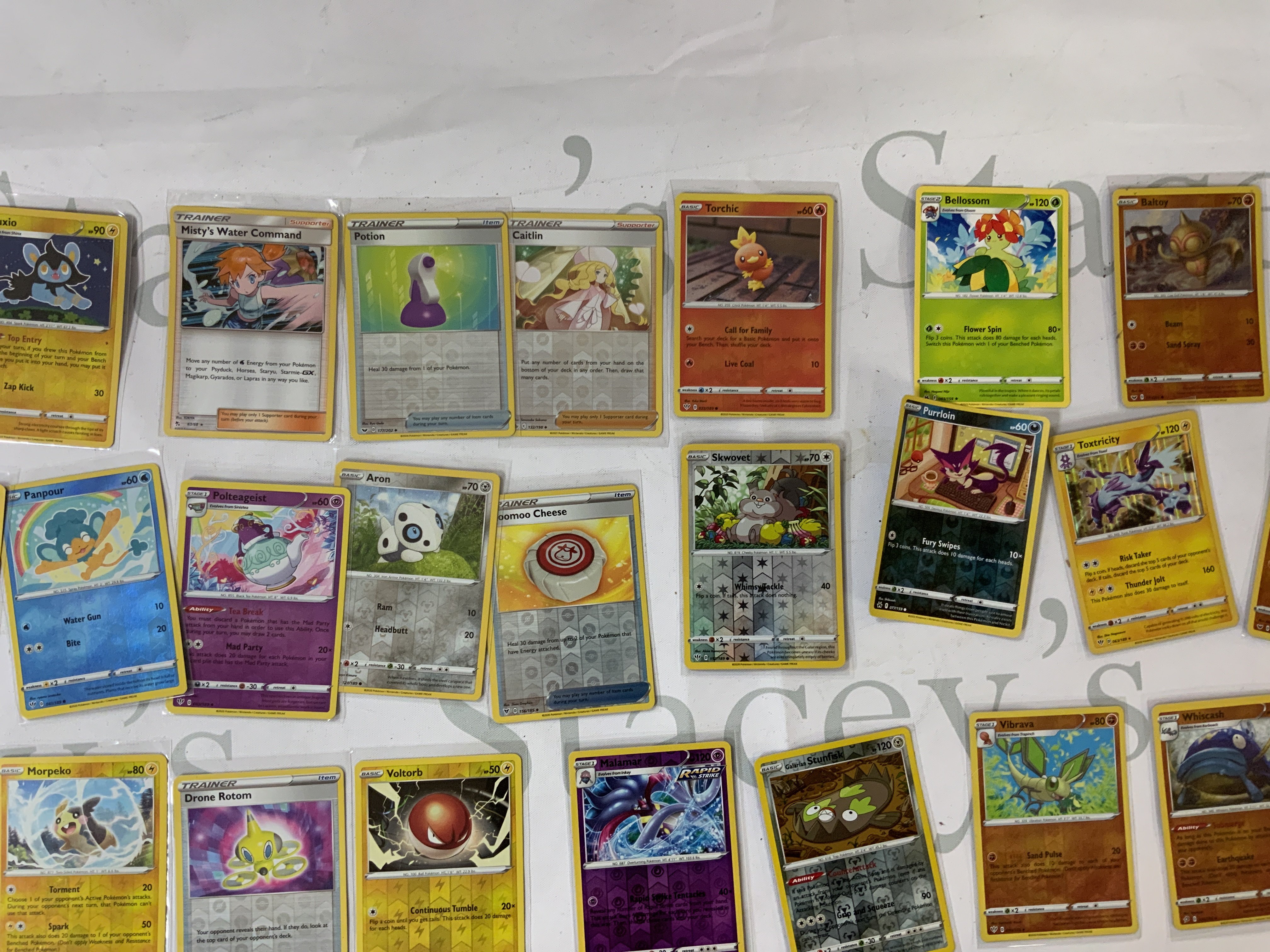 A collection of Pokemon cards, including a sealed Sun and Moon Cosmic Eclipse Unseen Depths theme deck, and WWE figurines.