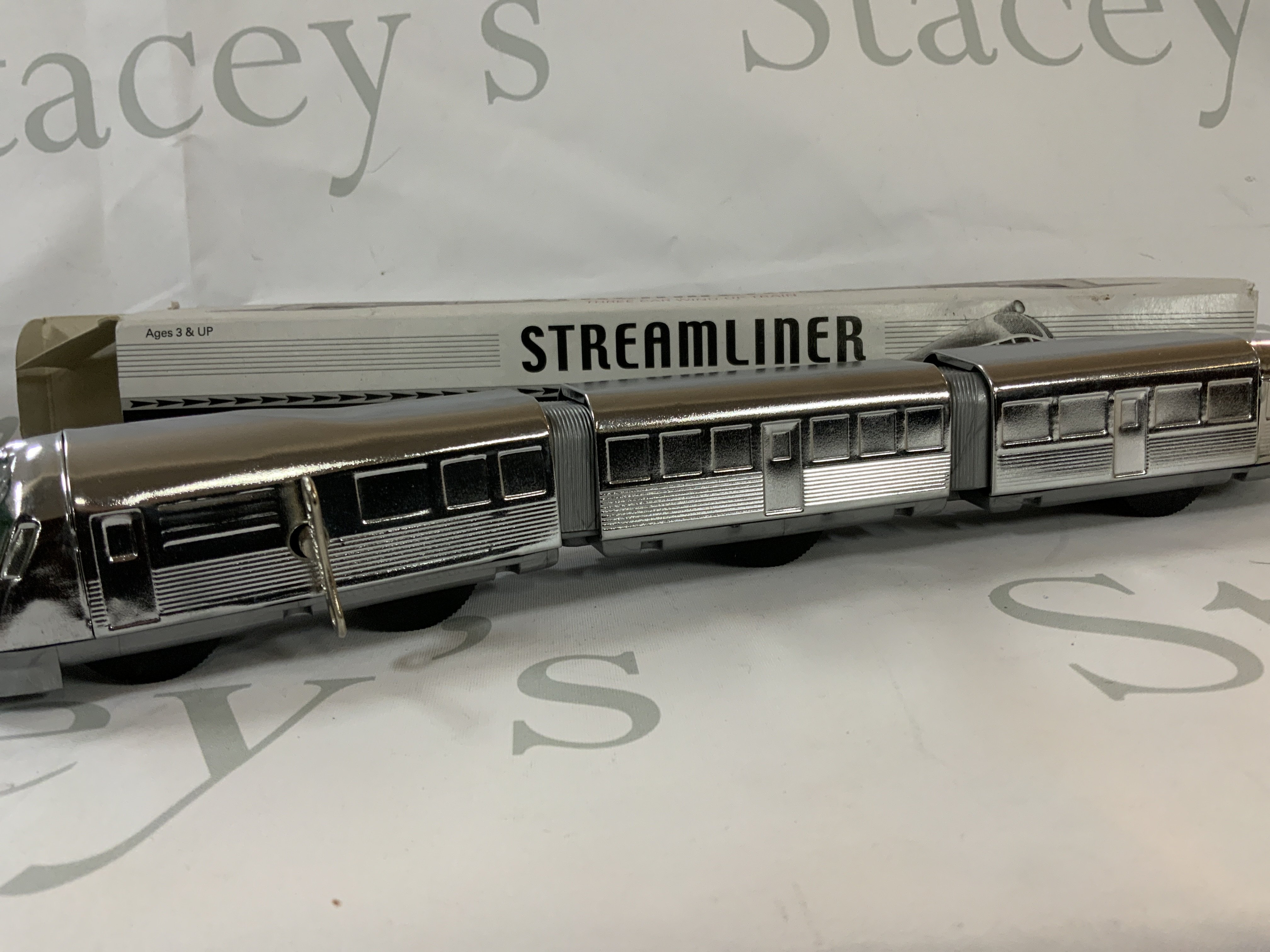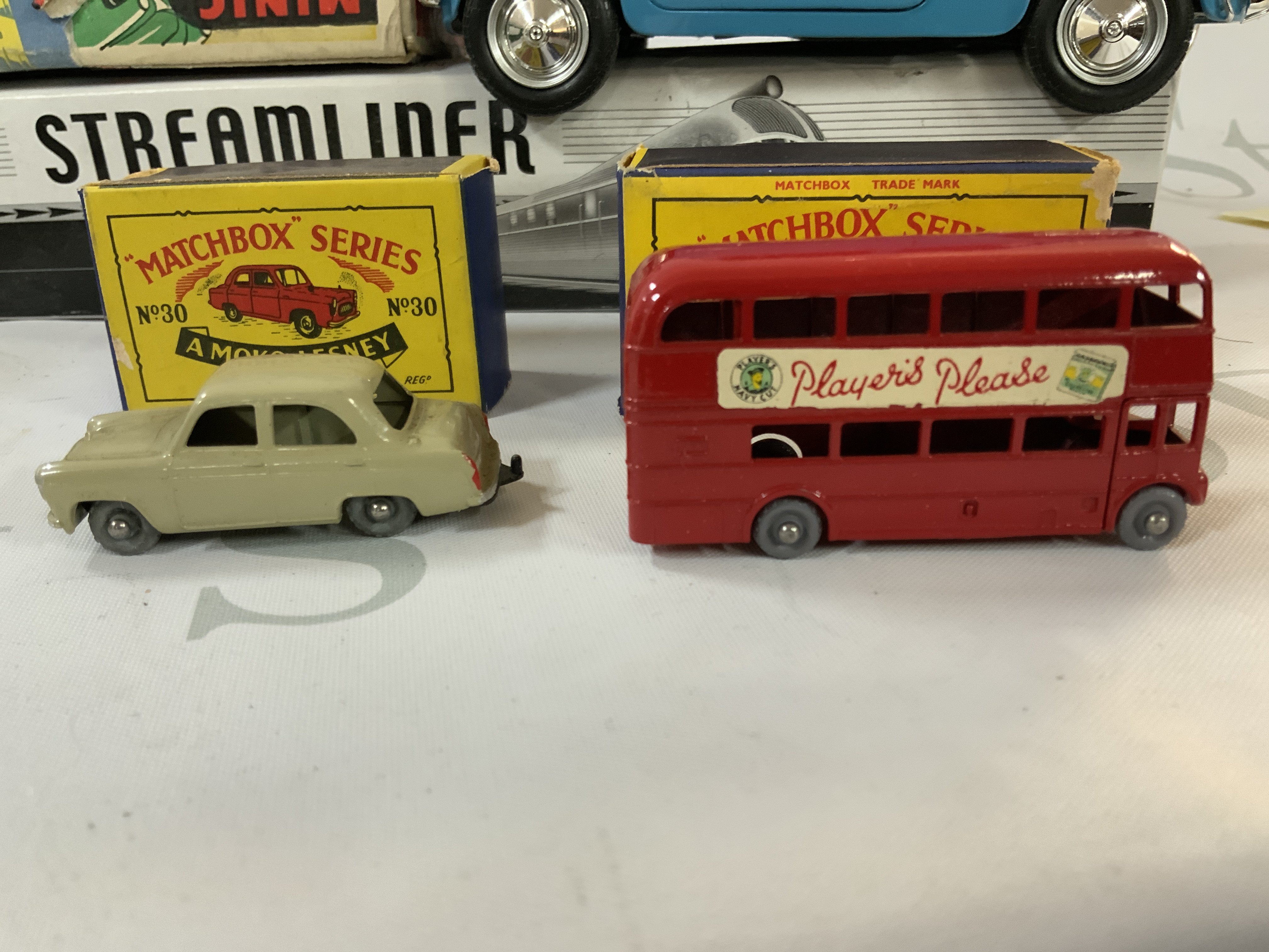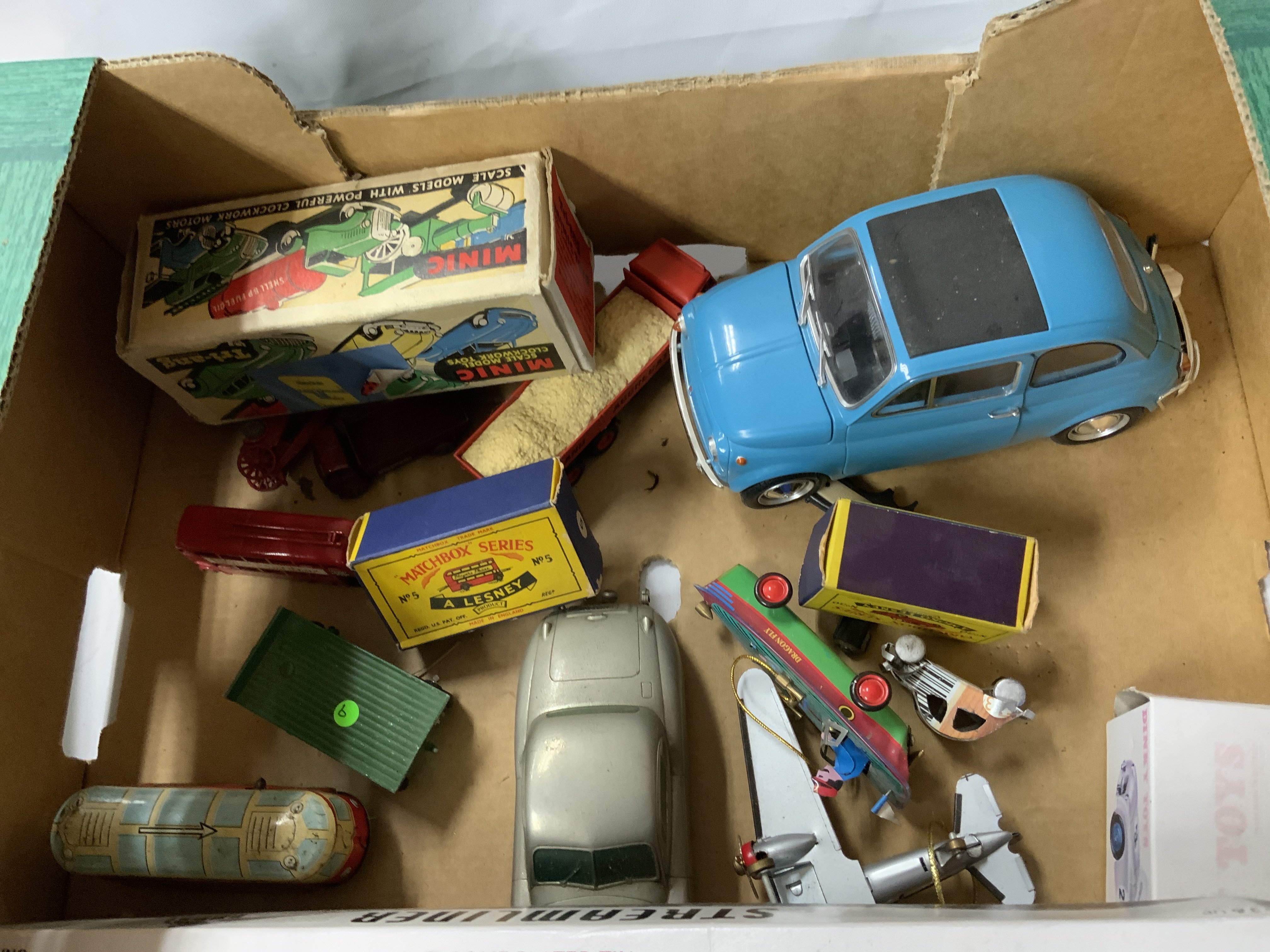 A mixture of vintage toys and vehicles, including a chrome plated tin Streamliner made by Schylling which is a wind up, a scale model wind up toy made by Minic, 2 vehicles from the matchbox series, a dinky toy and some other vintage vehicles.