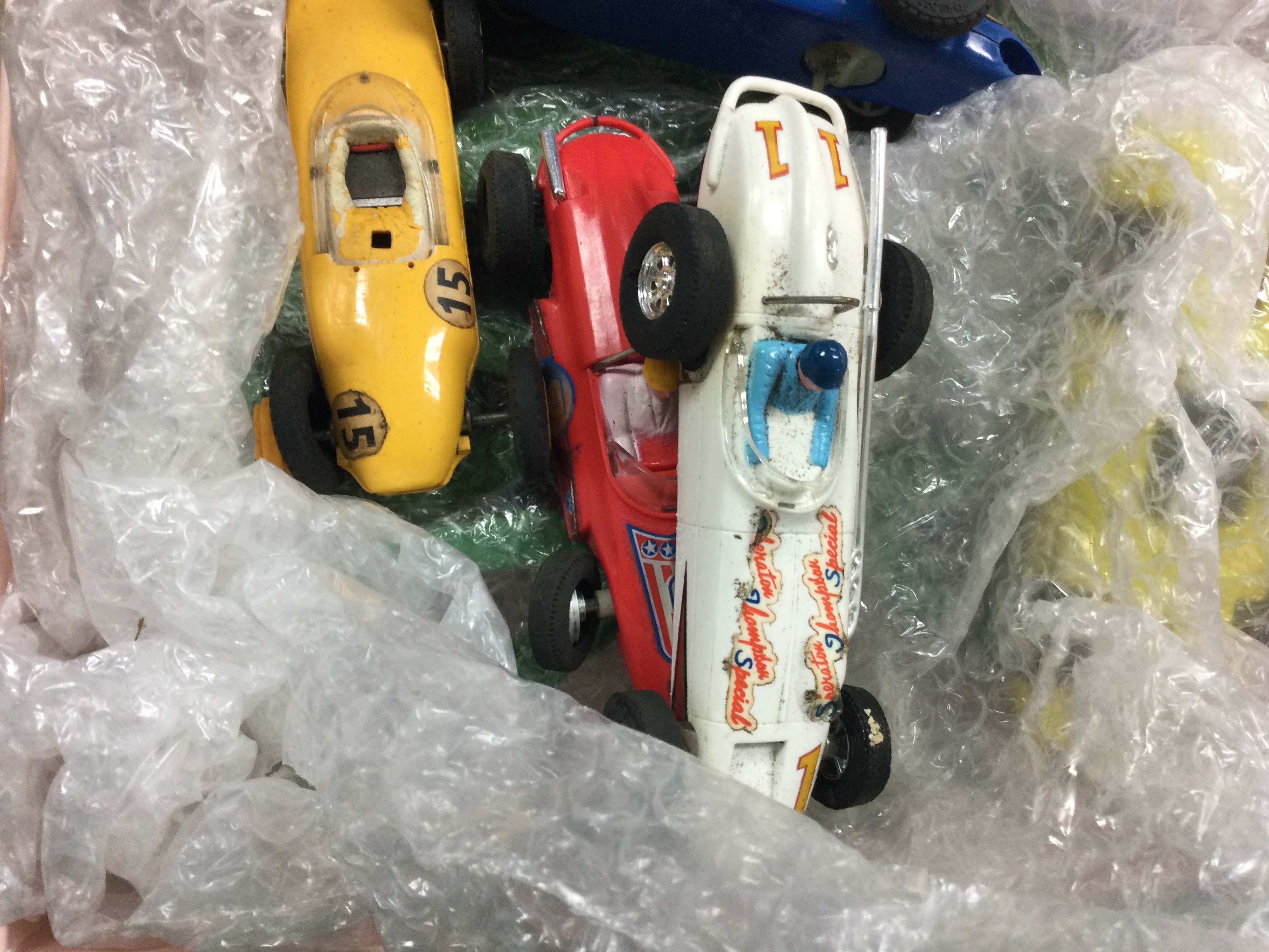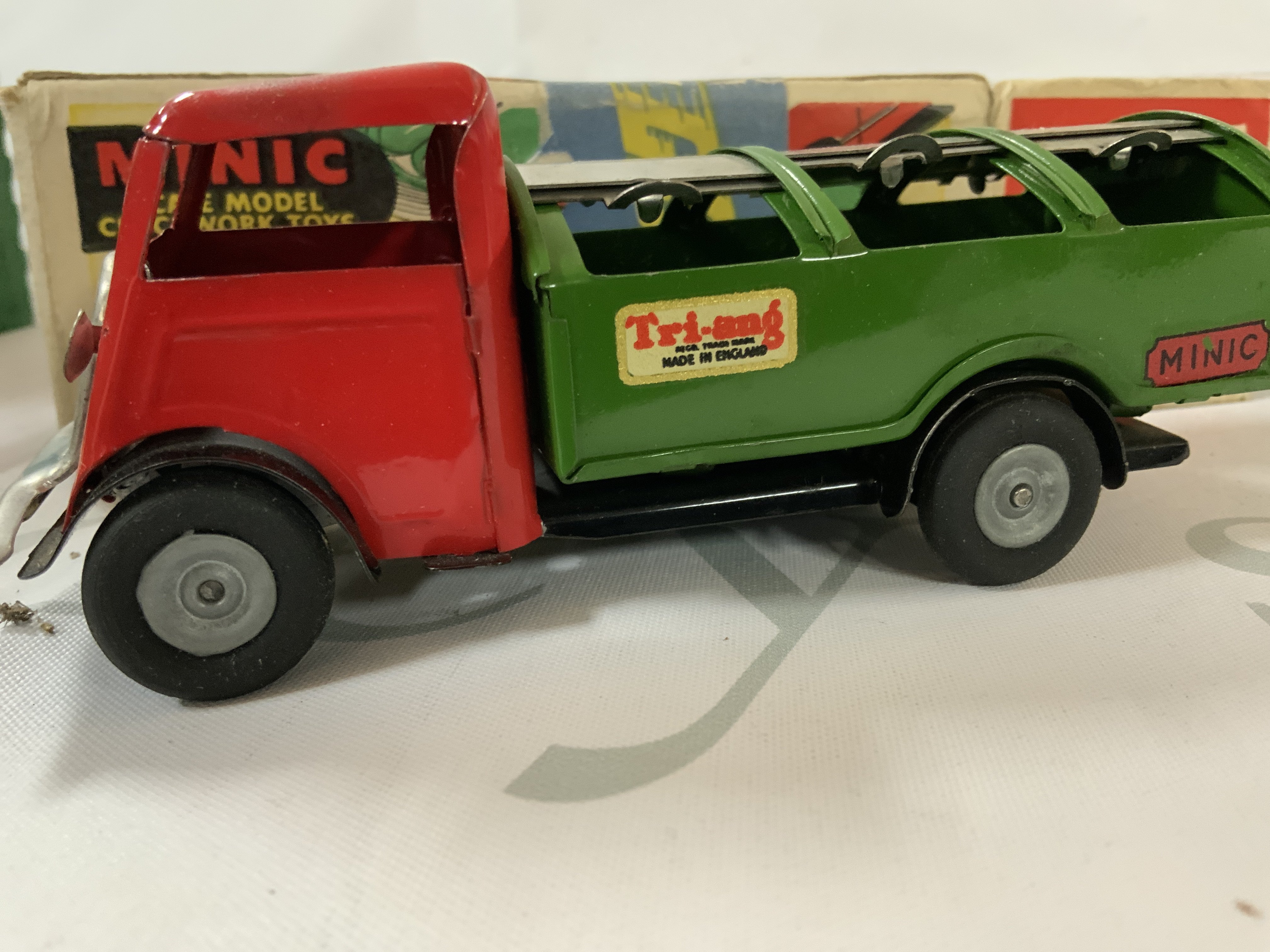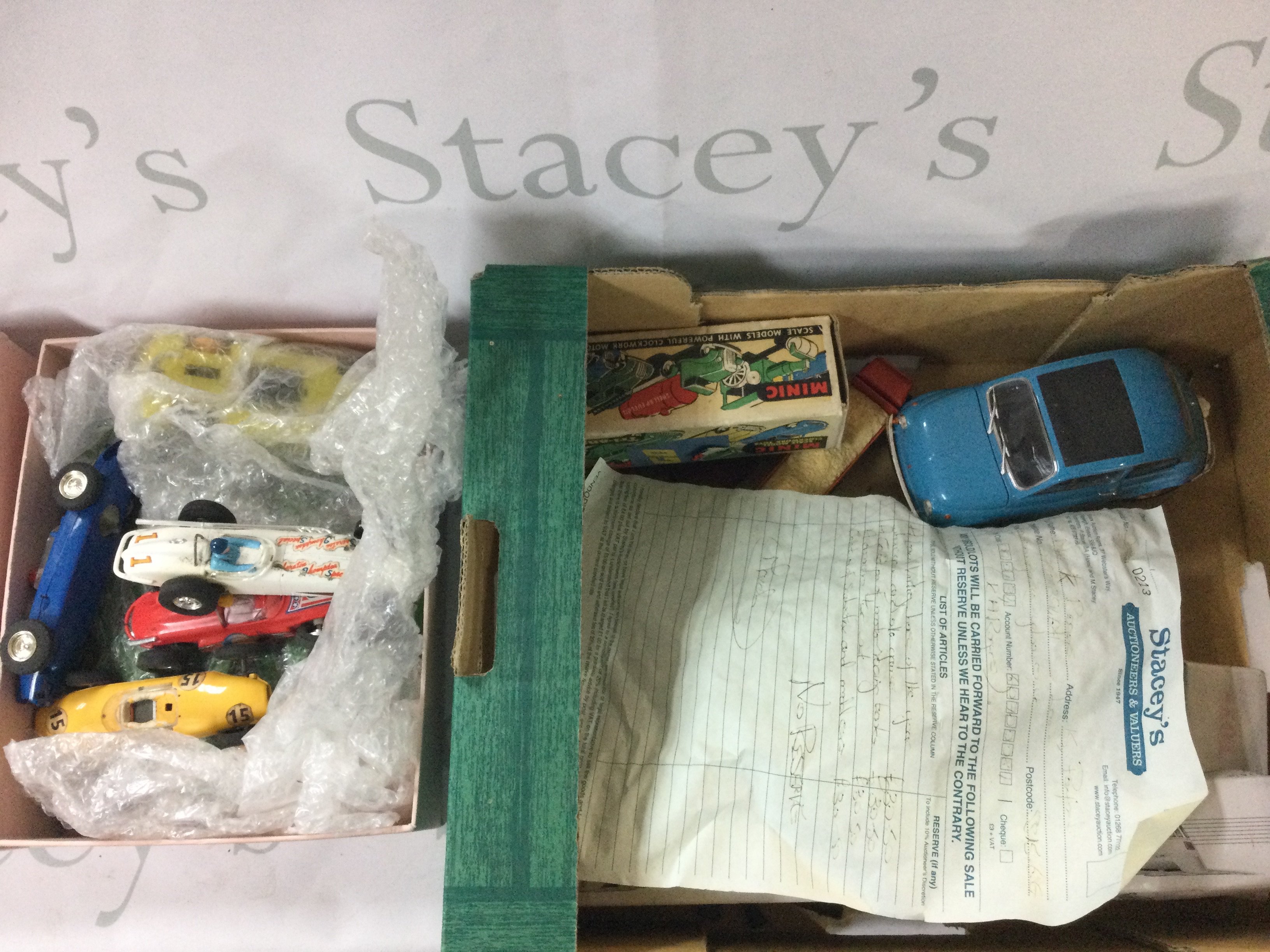 A mixture of vintage toys and vehicles, including a chrome plated tin Streamliner made by Schylling which is a wind up, a scale model wind up toy made by Minic, 2 vehicles from the matchbox series, a dinky toy and some other vintage vehicles.