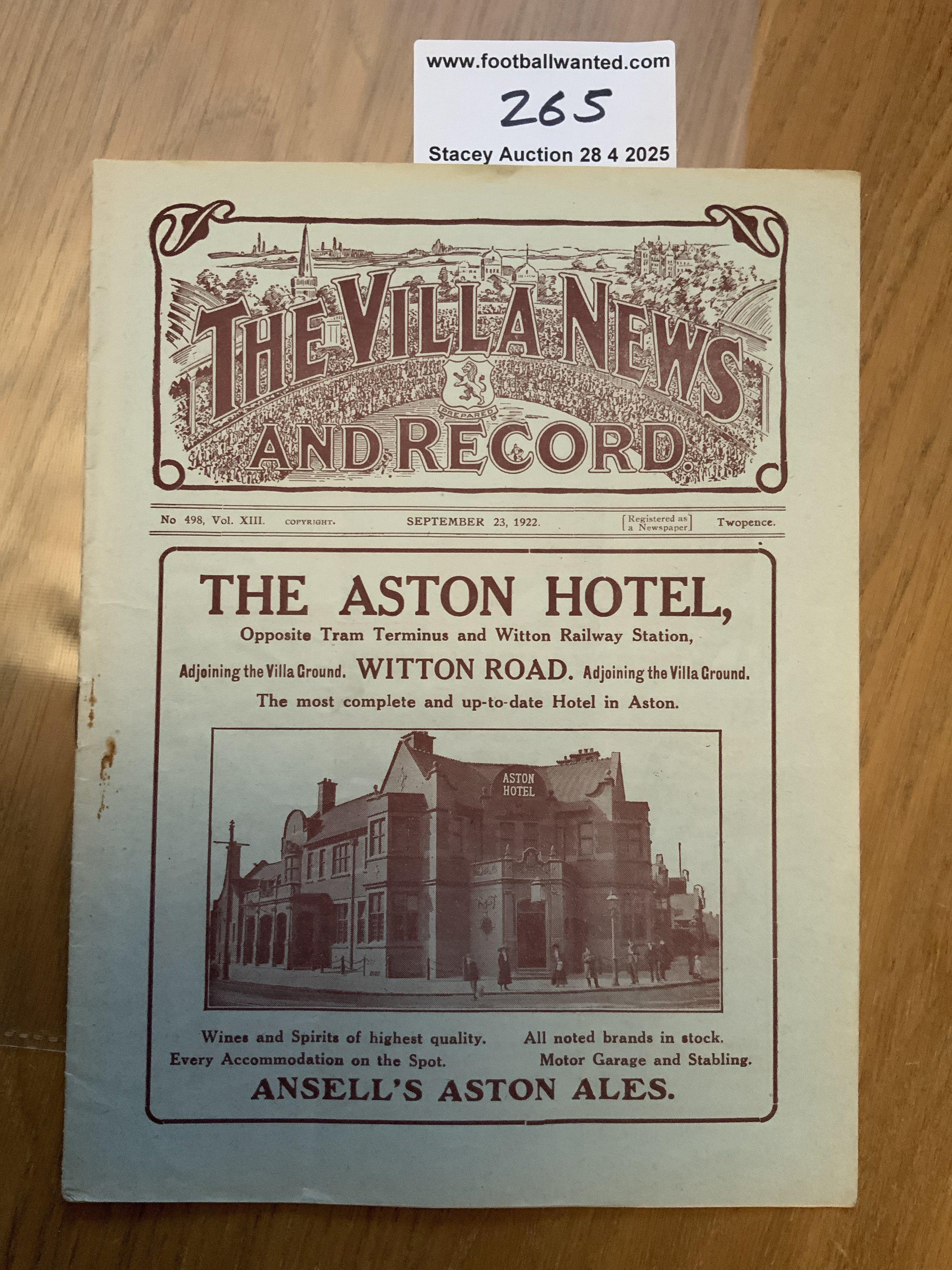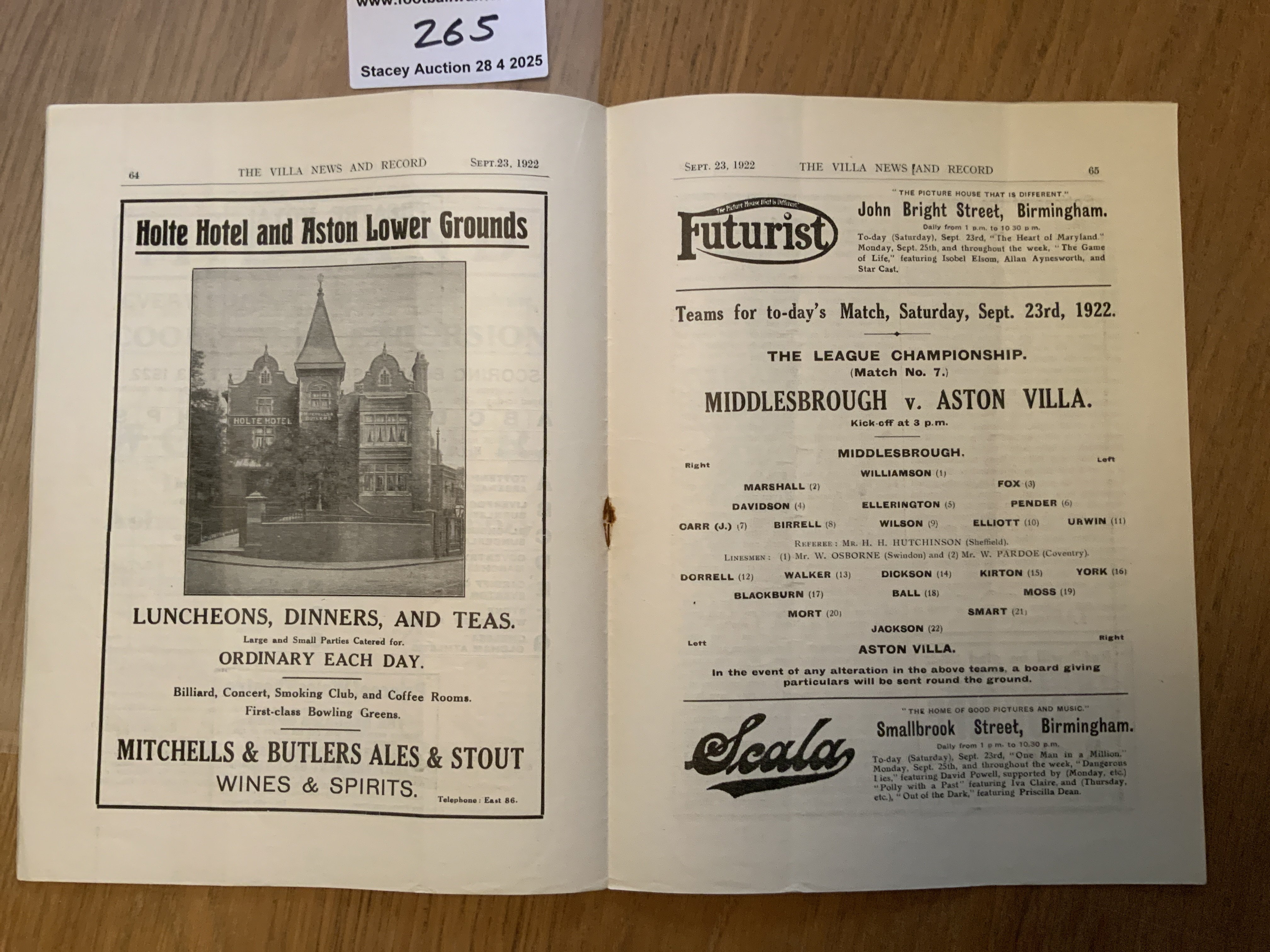 1922 - 1923 Aston Villa v Middlesbrough Football Programme: Excellent condition 20 page programme for 1st Division match. No team changes. Not ex bound and has covers intact.