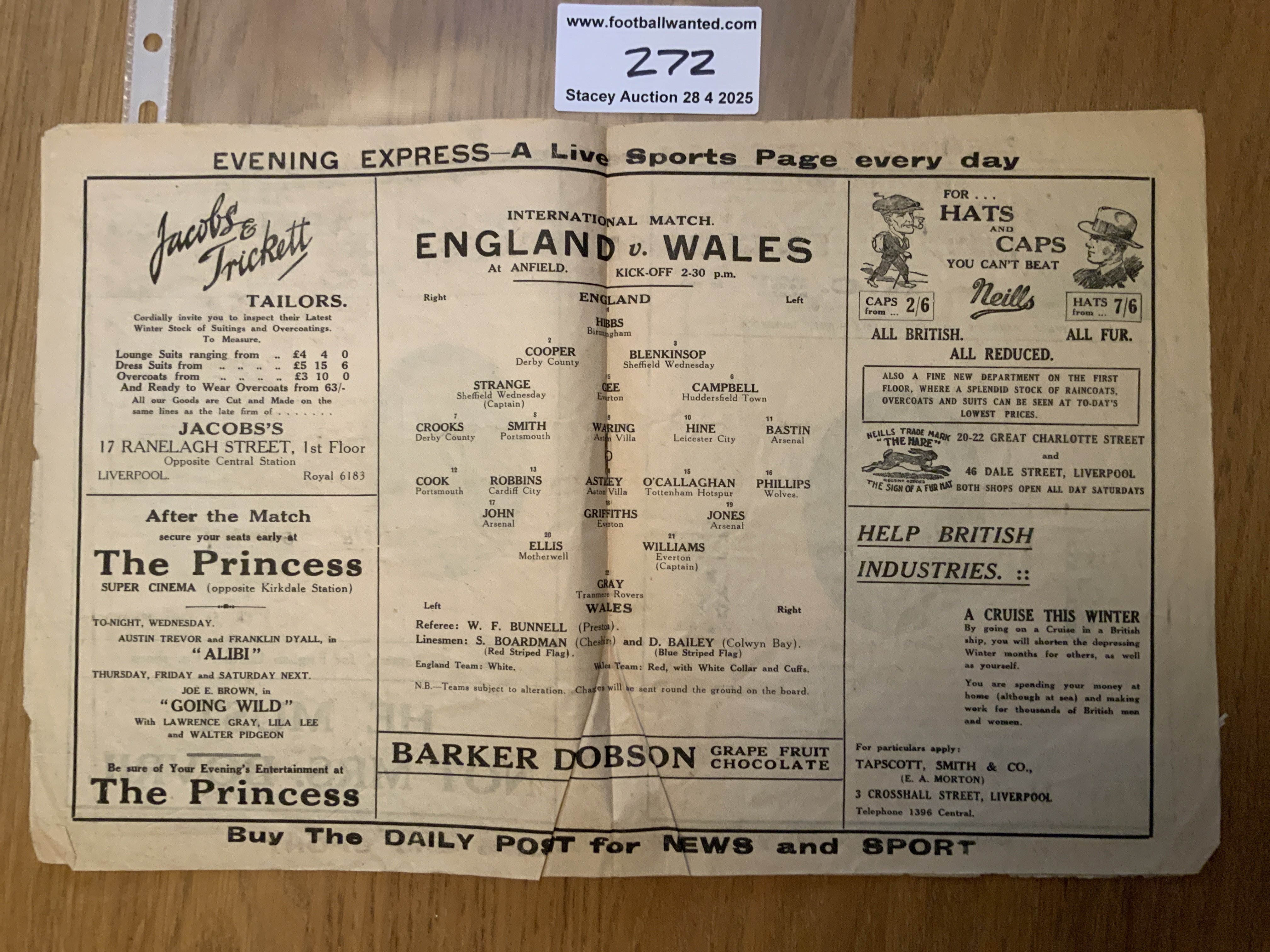 1931 England v Wales Football Programme: Fair condition 12 page programme for full International match played at Liverpool. No team changes. Bit of wear to back page.