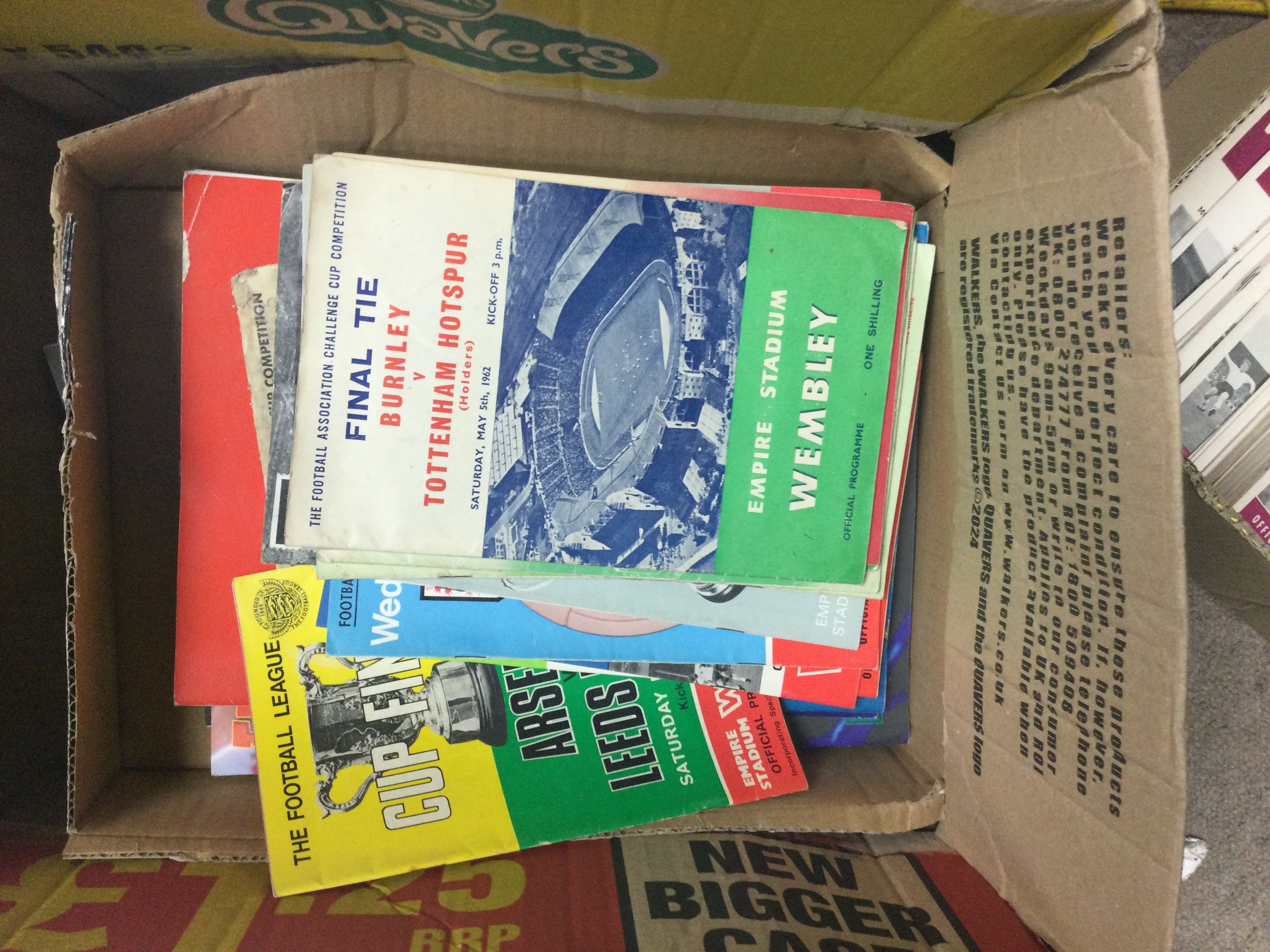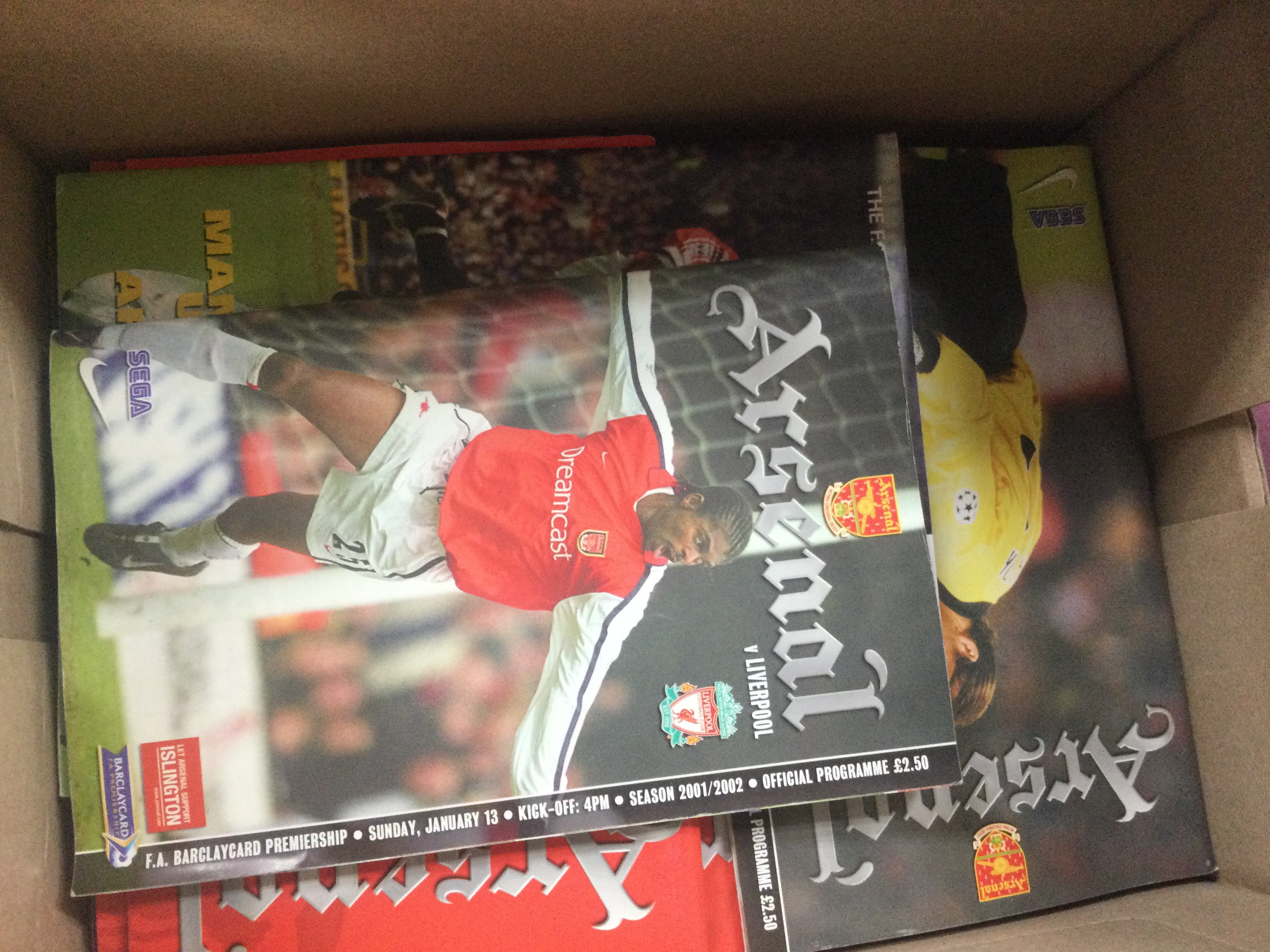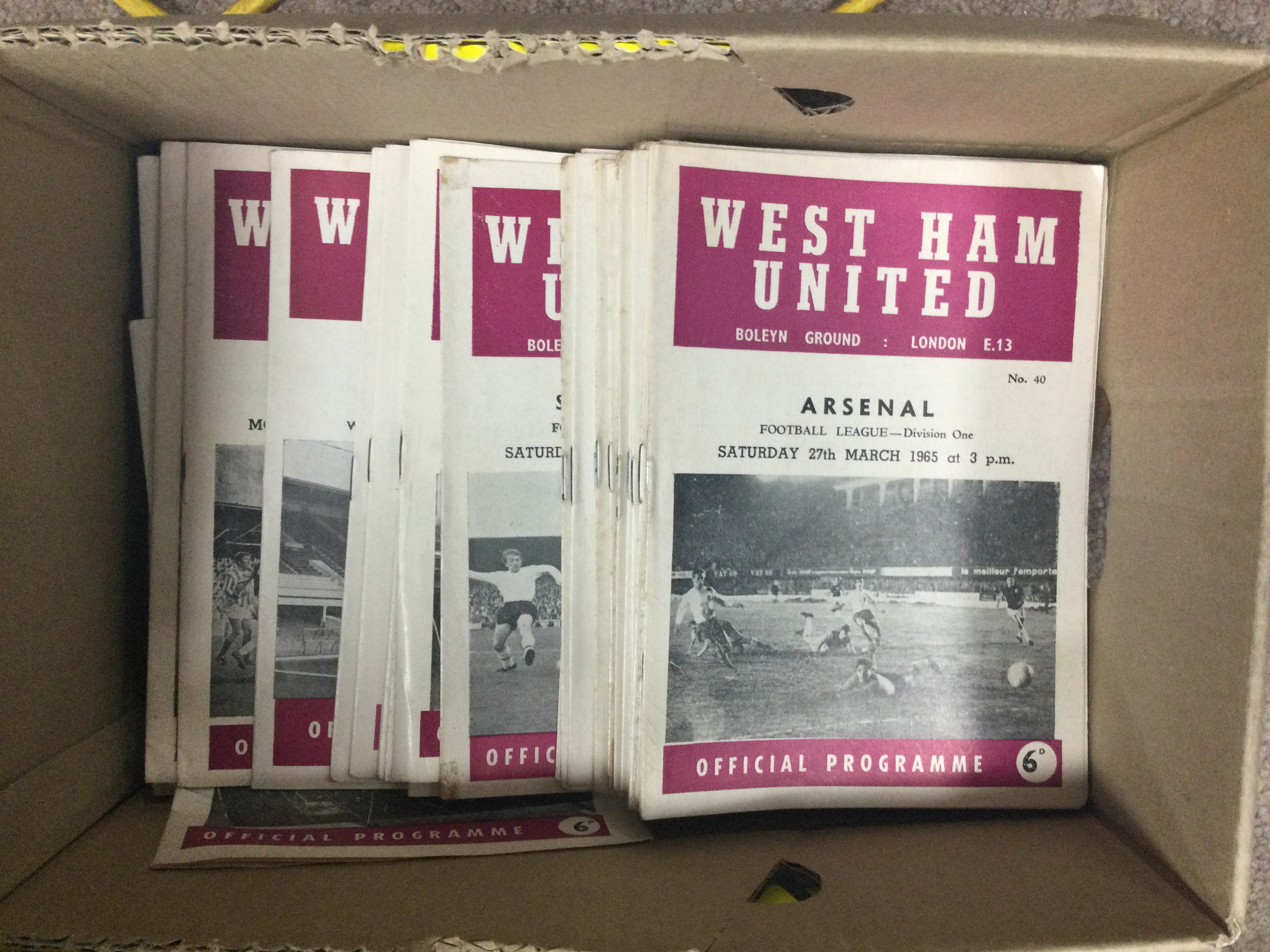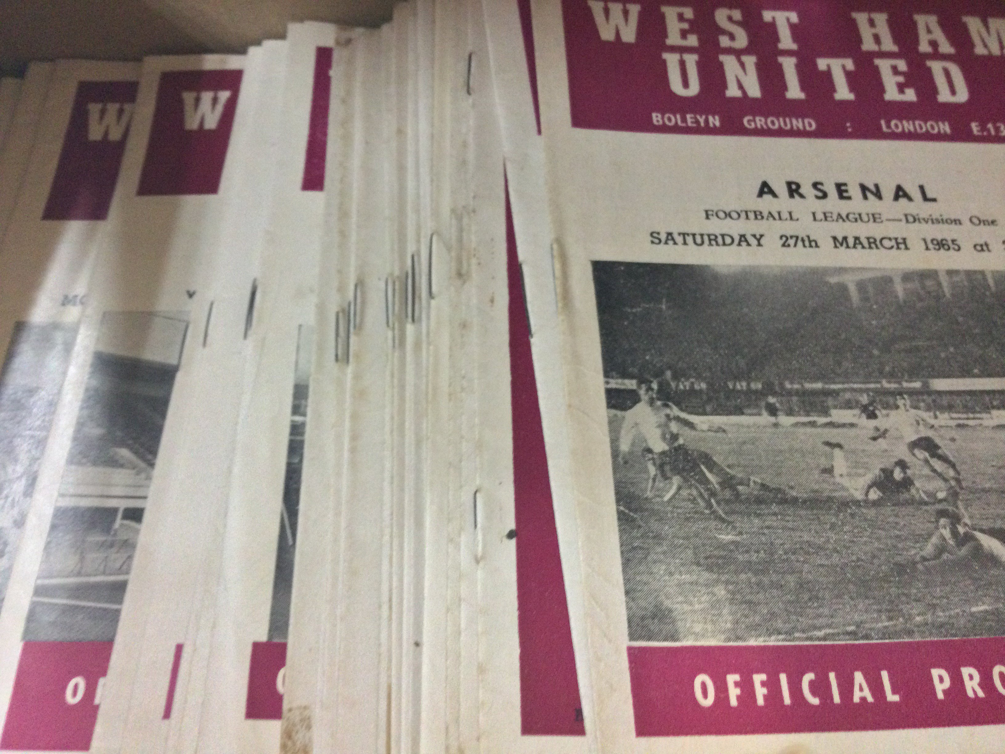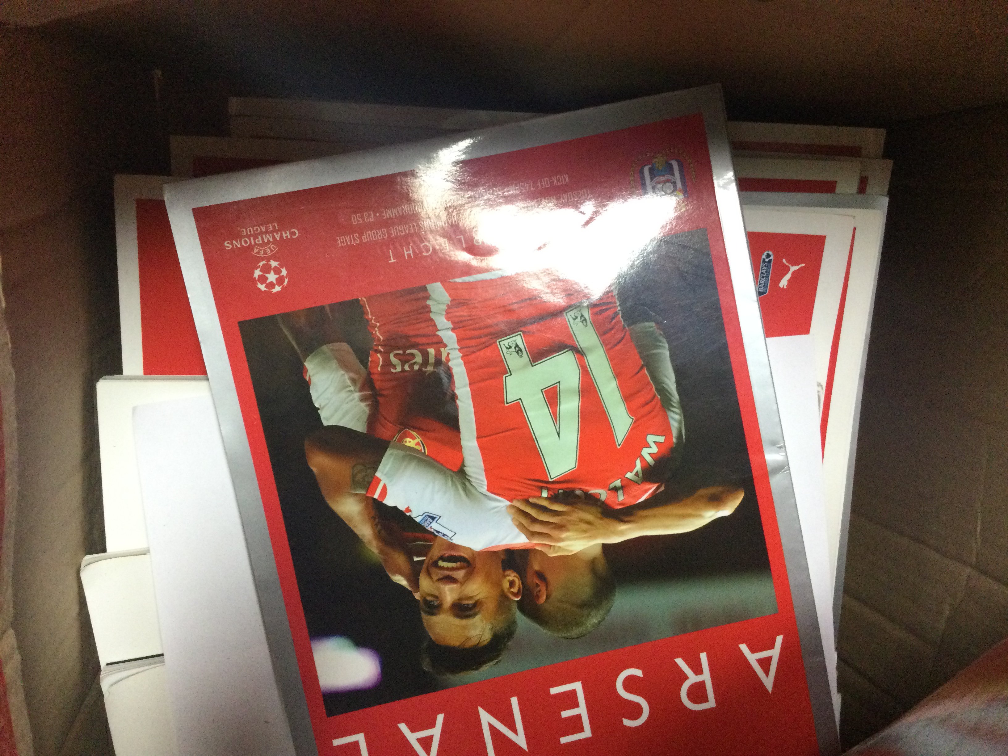 3 large boxes of football programmes mostly including Arsenal and West Ham, also includes some other programmes. The programmes are from the 50s and 60s and range up to approximately 2014