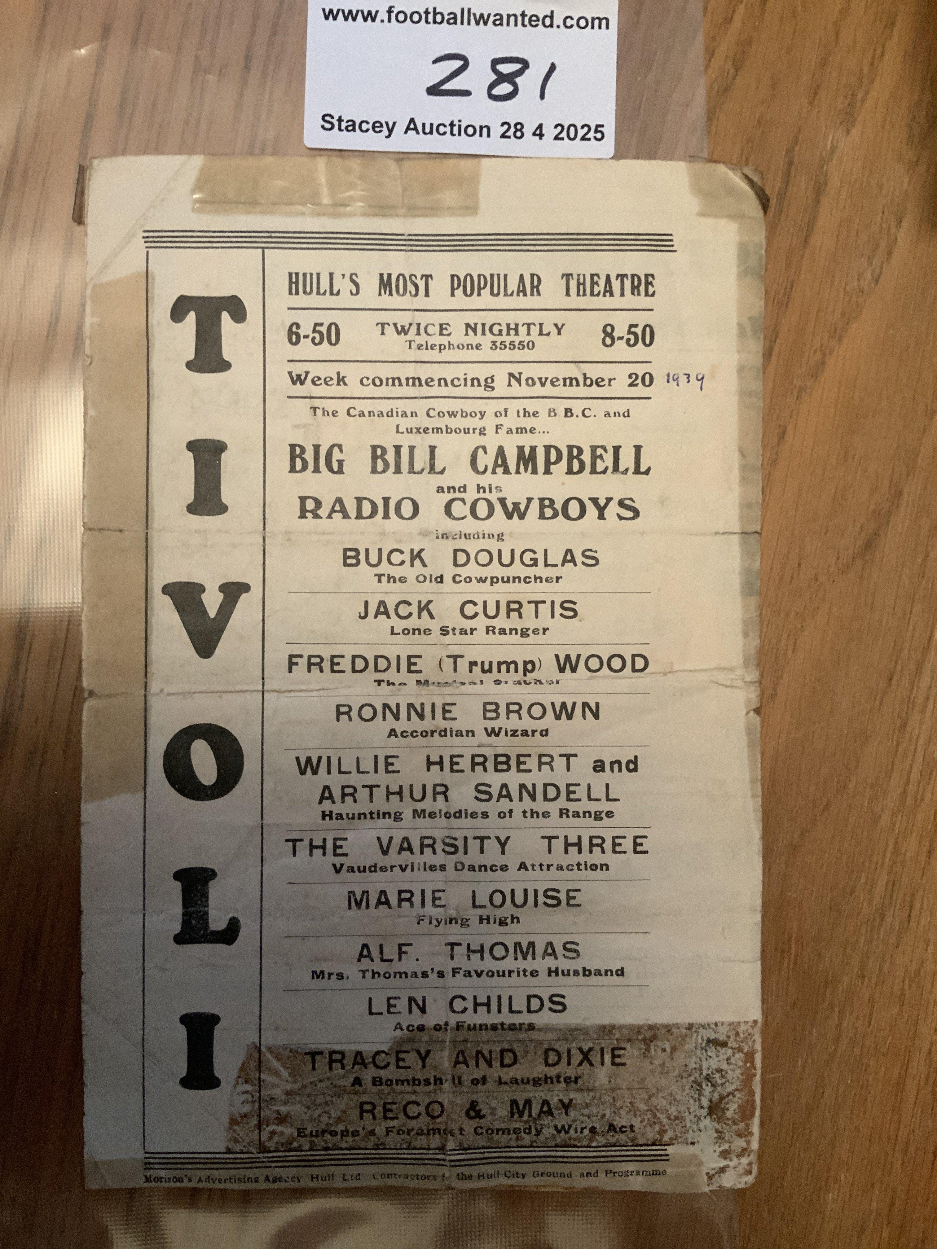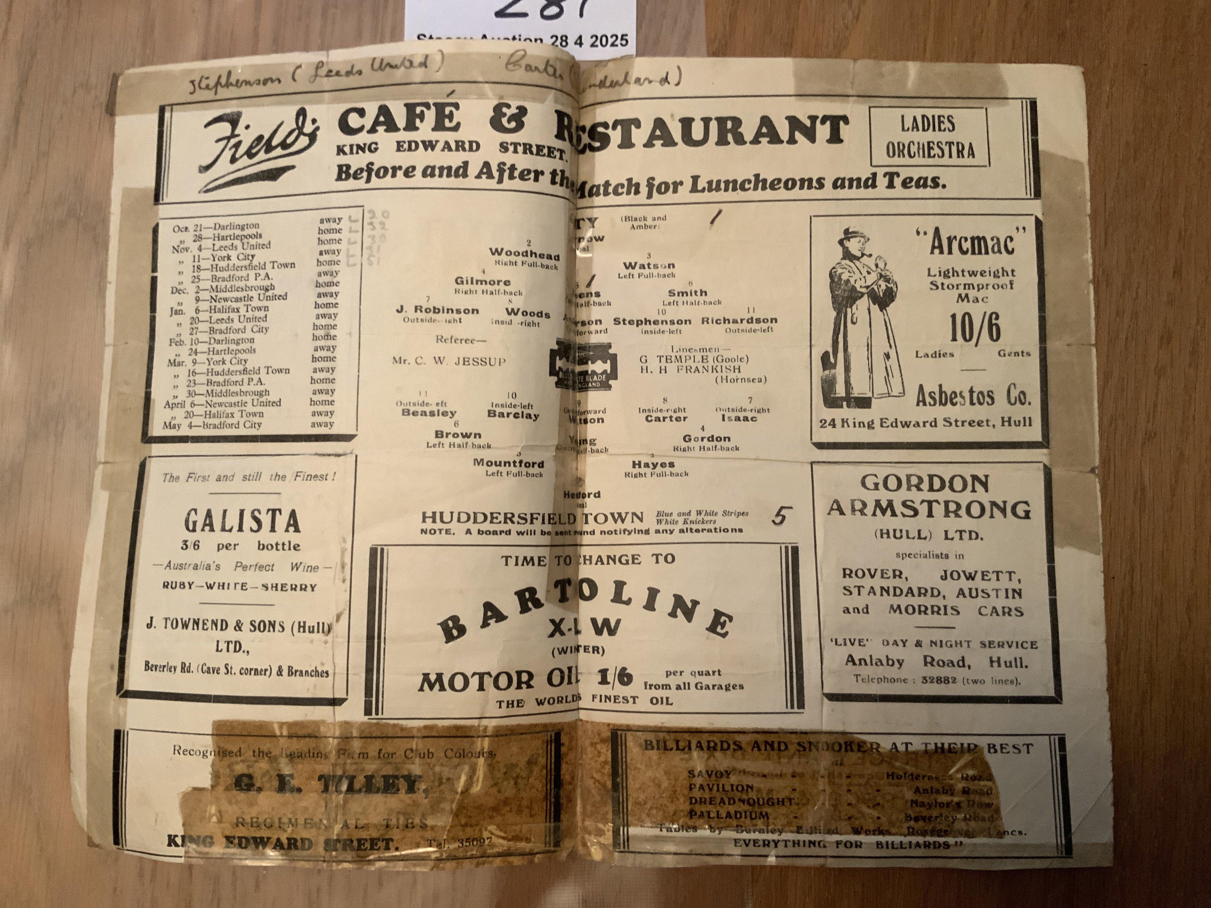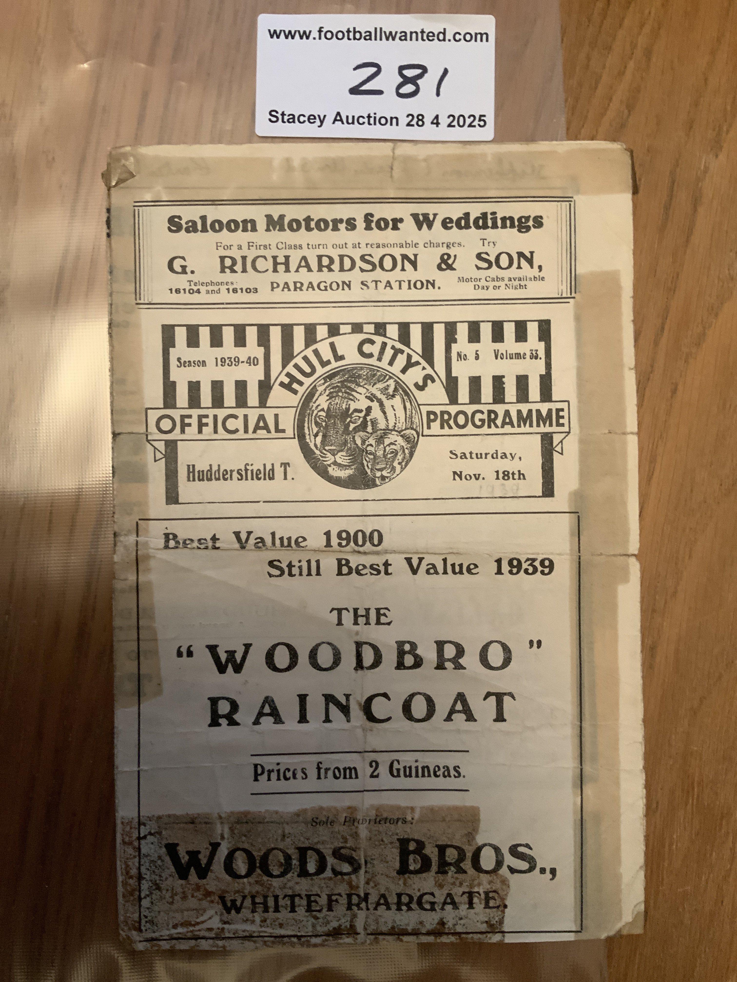 39/40 Hull City v Huddersfield Town Football Programme: Poor condition but complete 4 page programme with a lot of sellotape and writing inside. Rare season dated 18 11 1939.