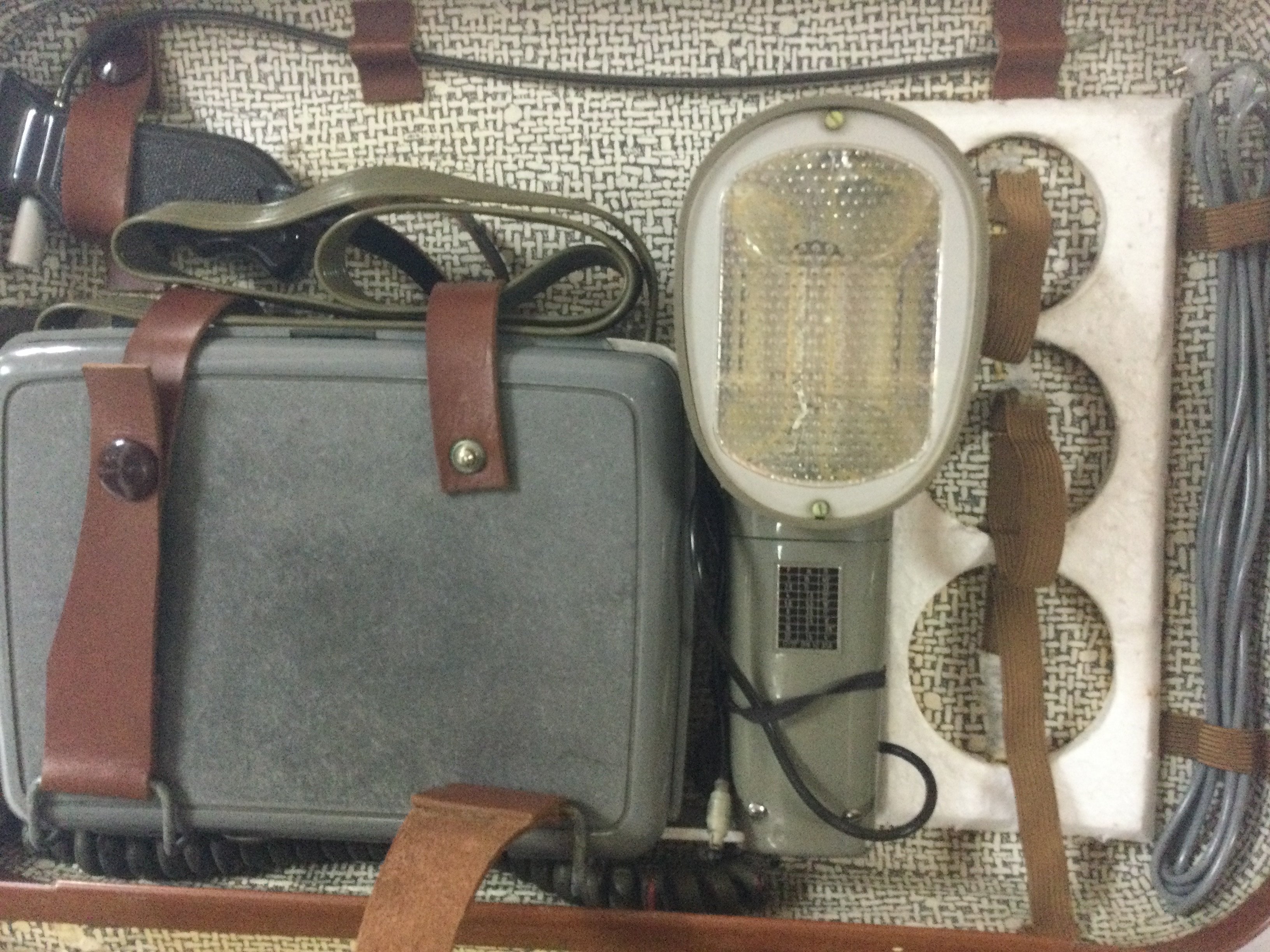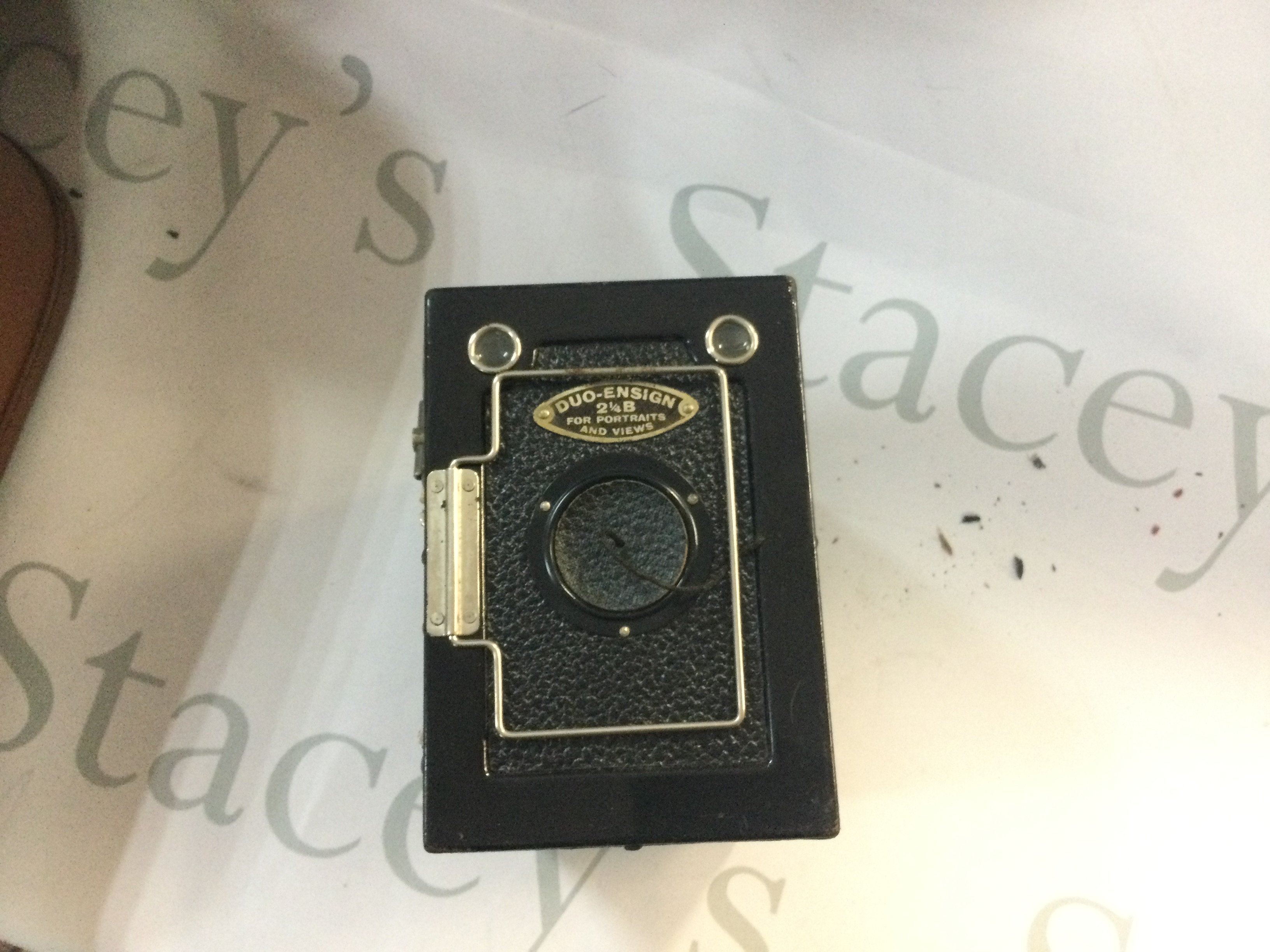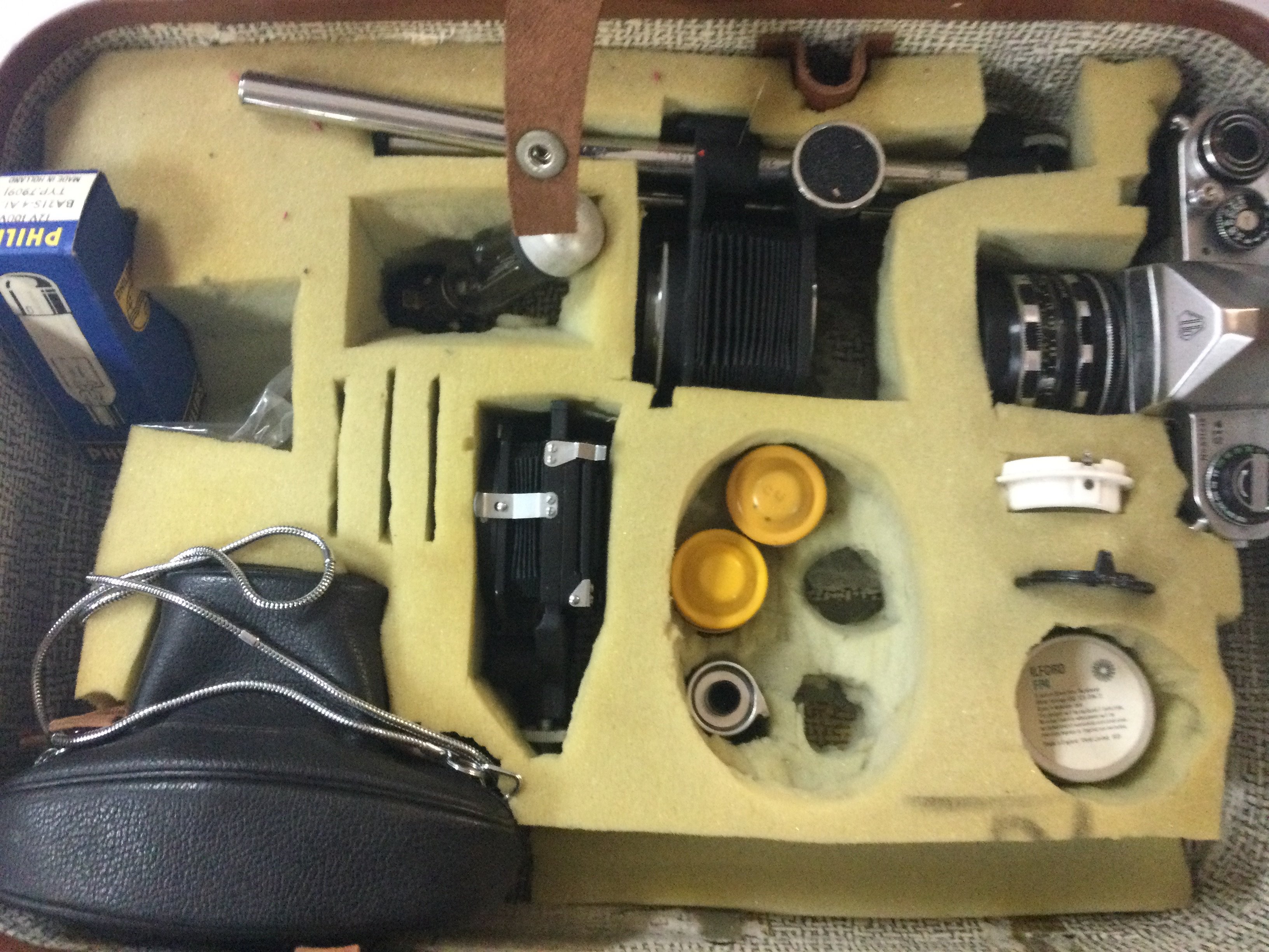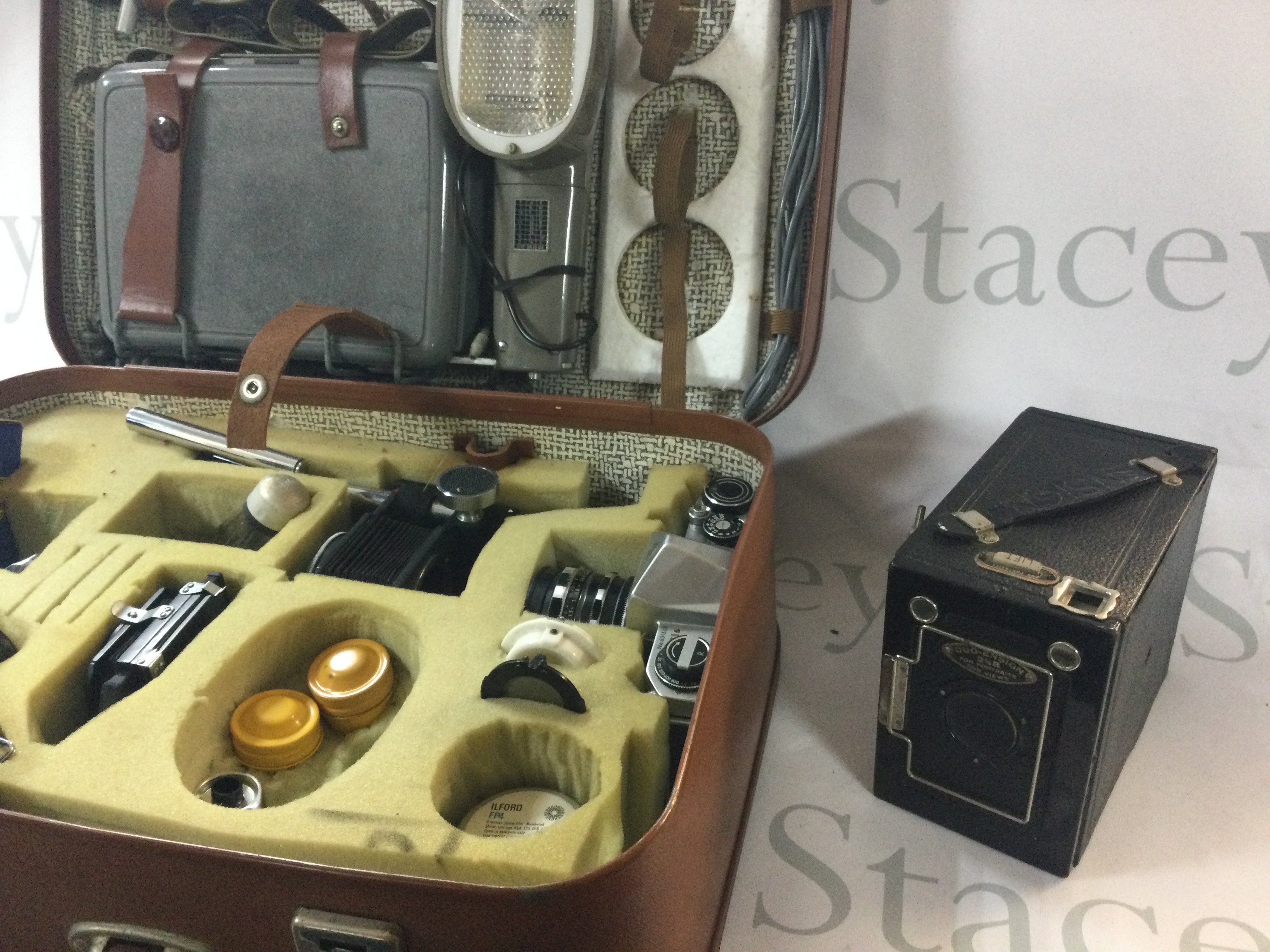 A range of cameras including a vintage camera, includes a large case filled with camera equipment. A duo ensign vintage box camera. There is also 2 Asahi Pentax cameras.
