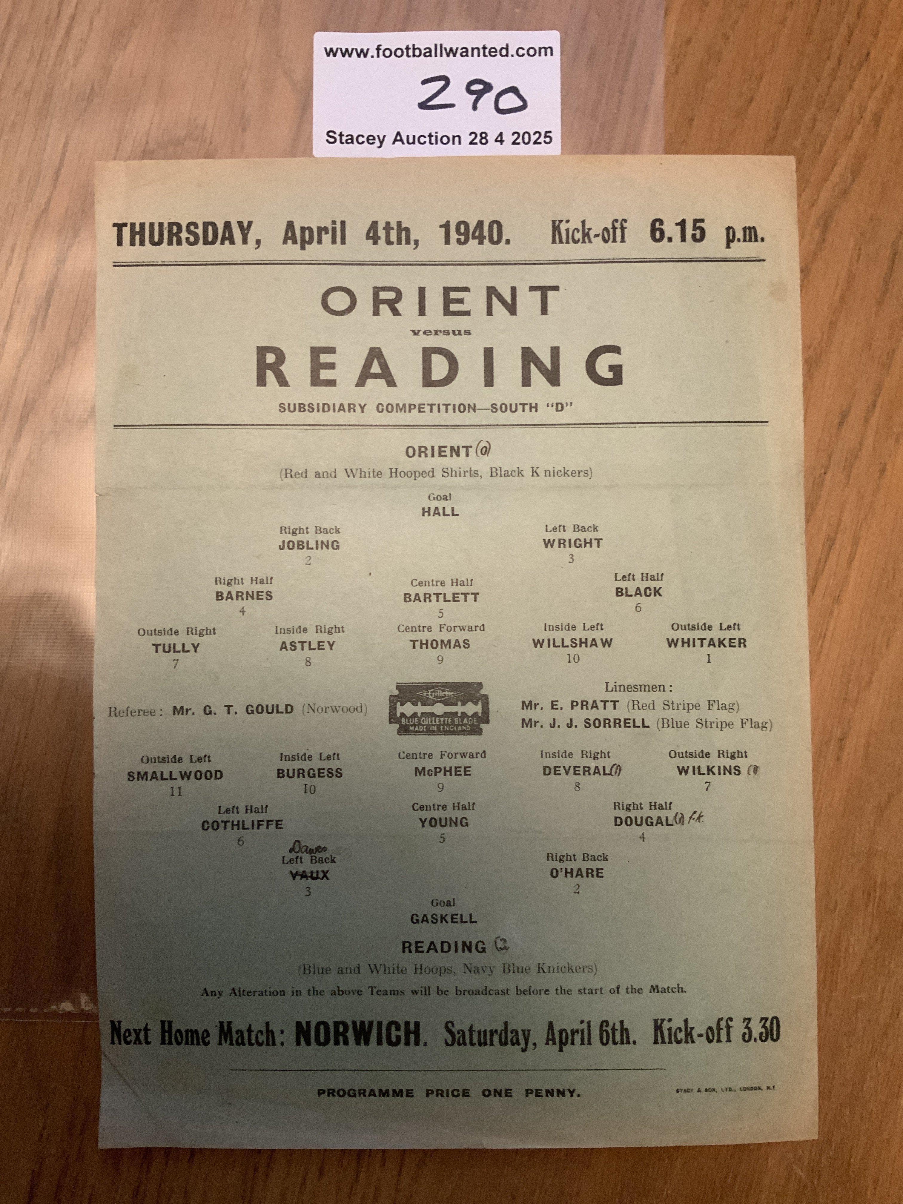39/40 Orient v Reading Football Programme: Excellent condition single sheet programme with one team change and scorers noted. League match dated 4 4 1940.
