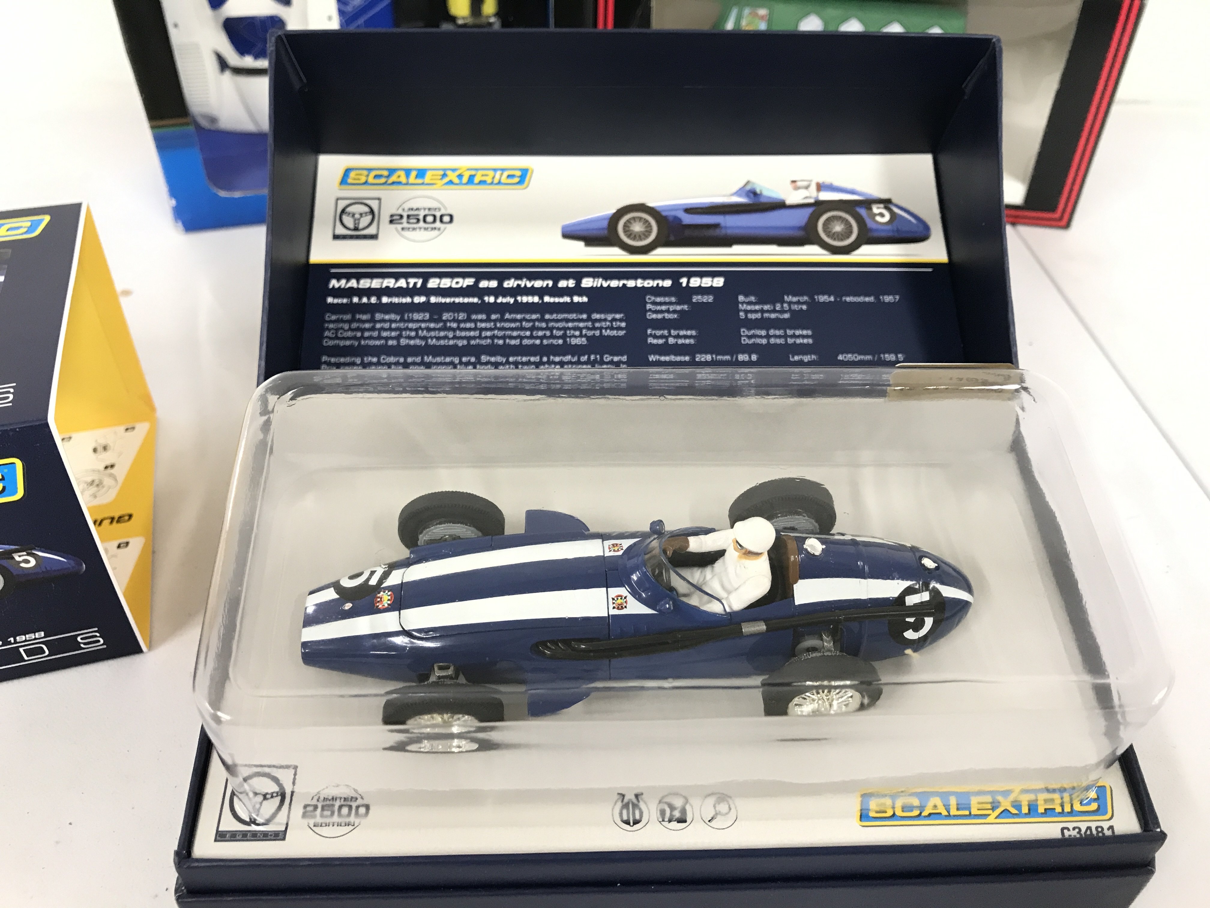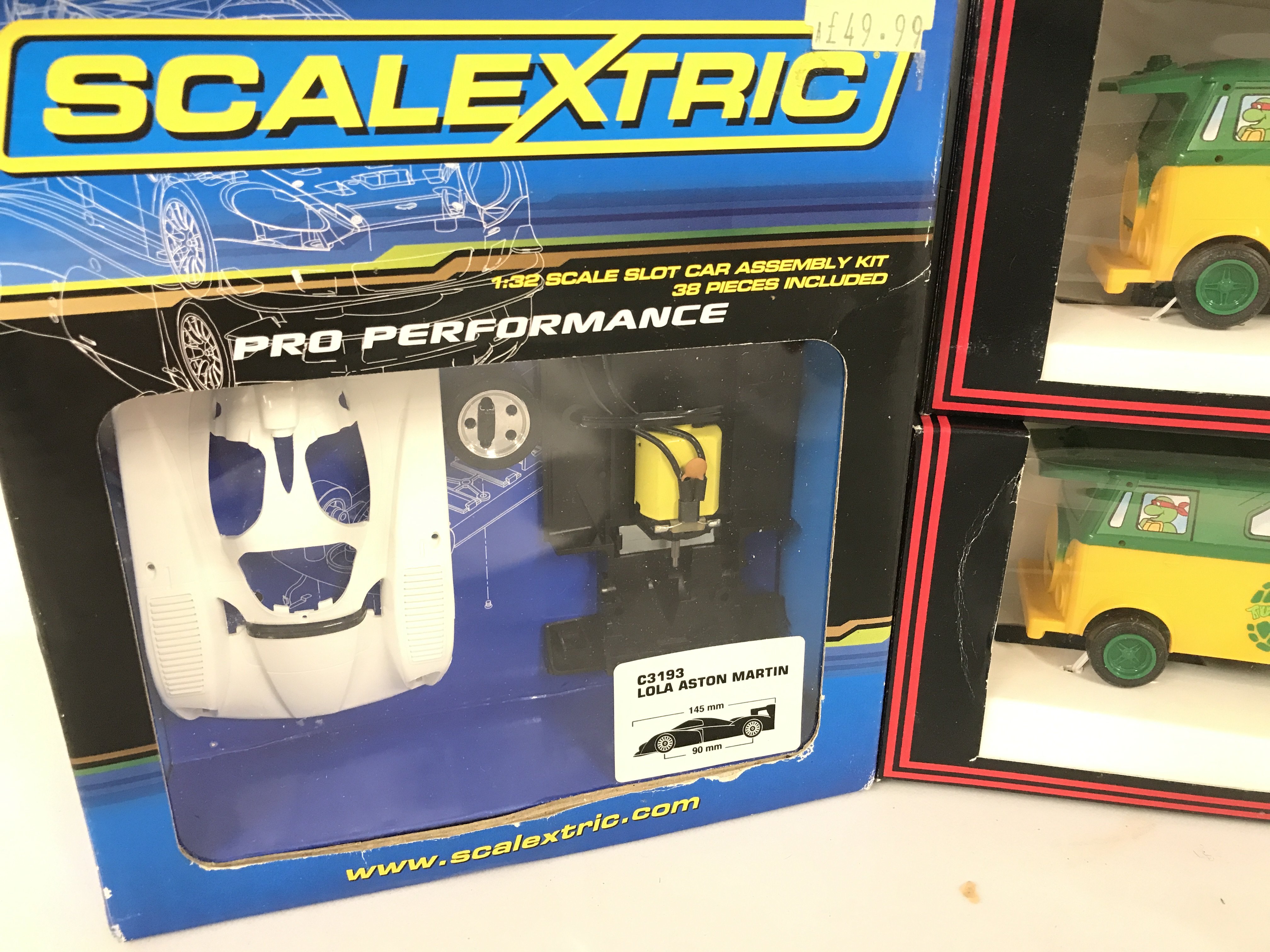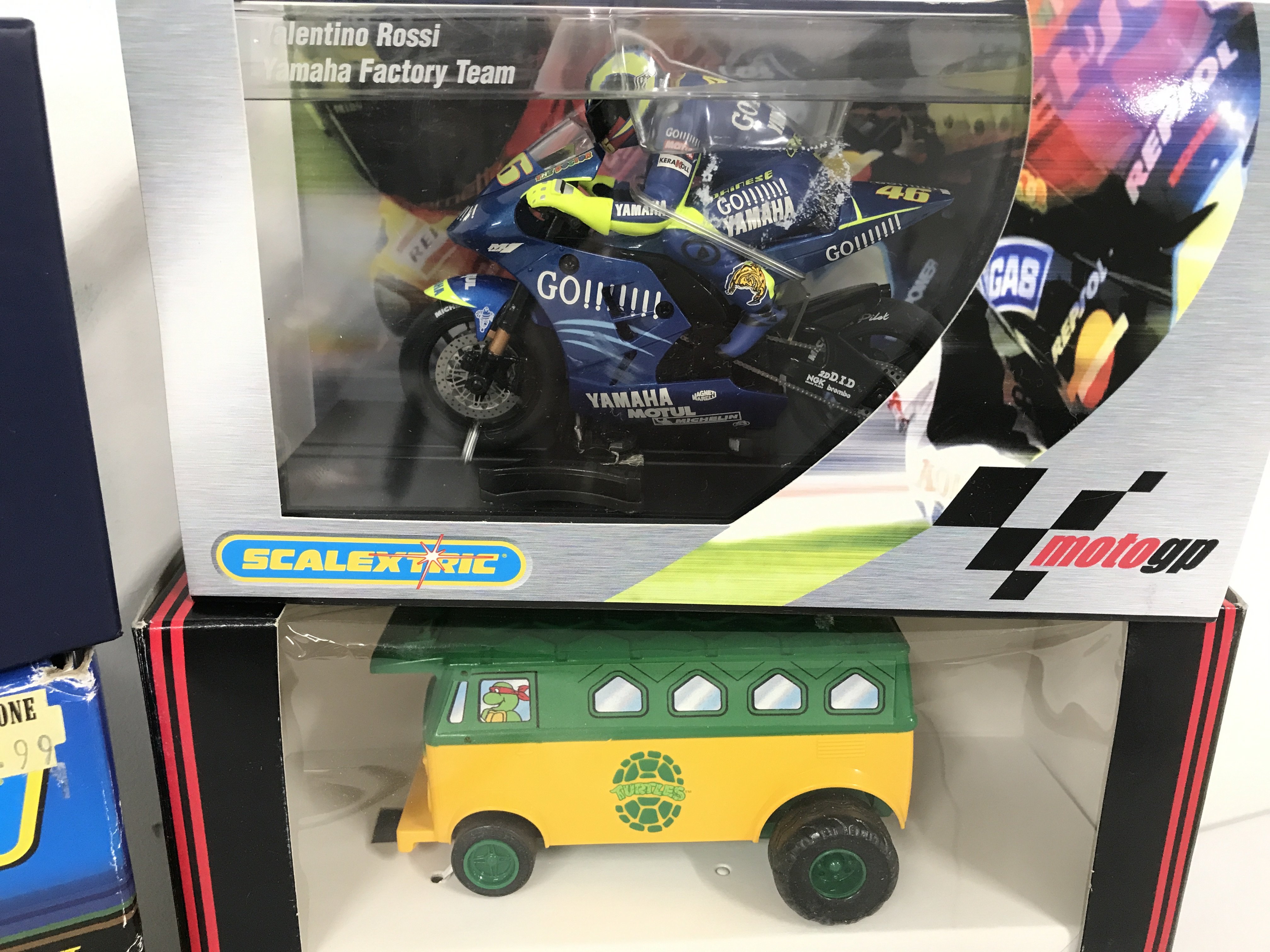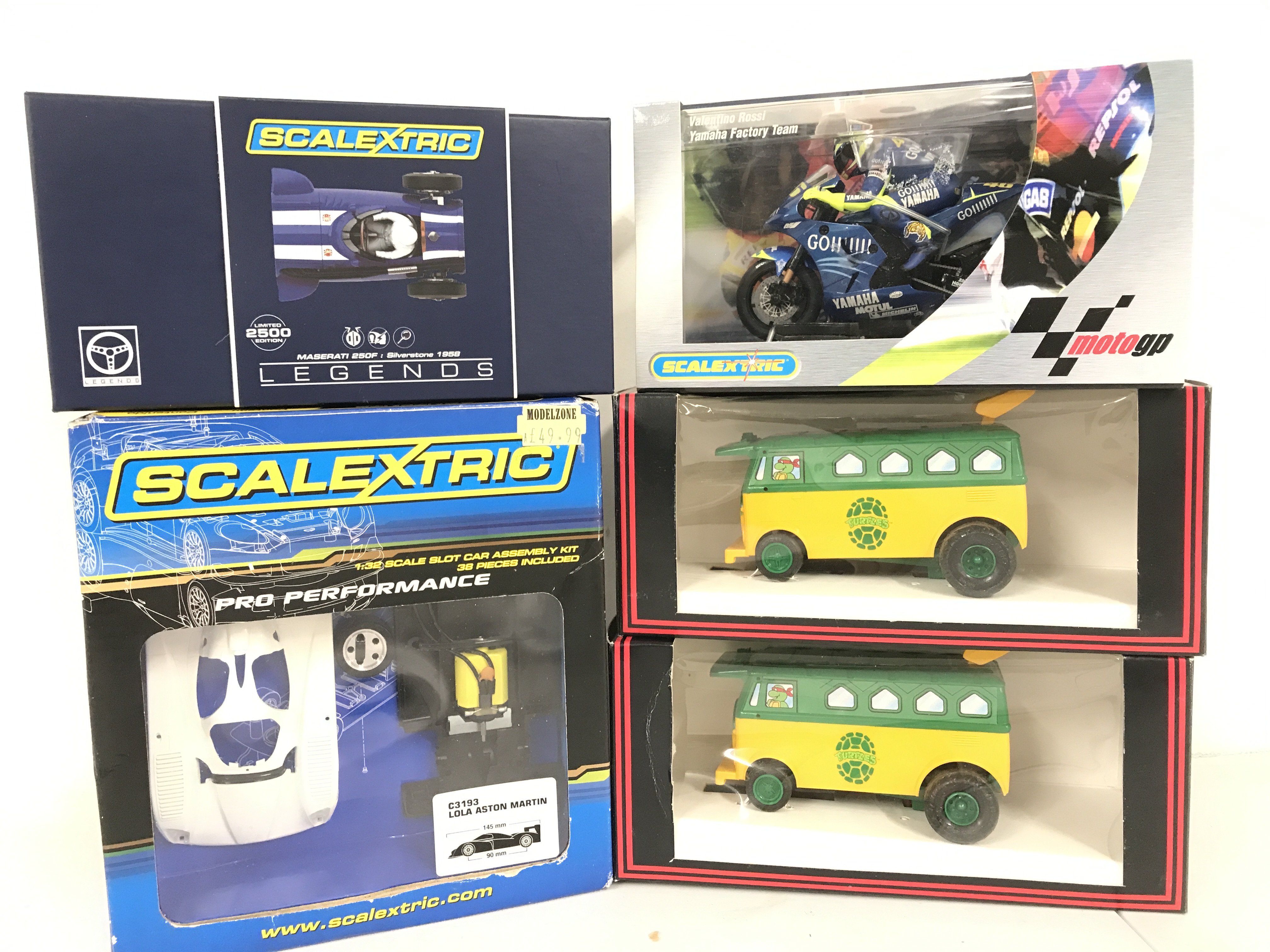 5 X Boxed Scalextric Vehicles Including 2 X Turtle Party Wagons. A Valentino Rossi Yamaha. A Legends Maserati 250F and a Lola Aston Martin Assembly Kit.