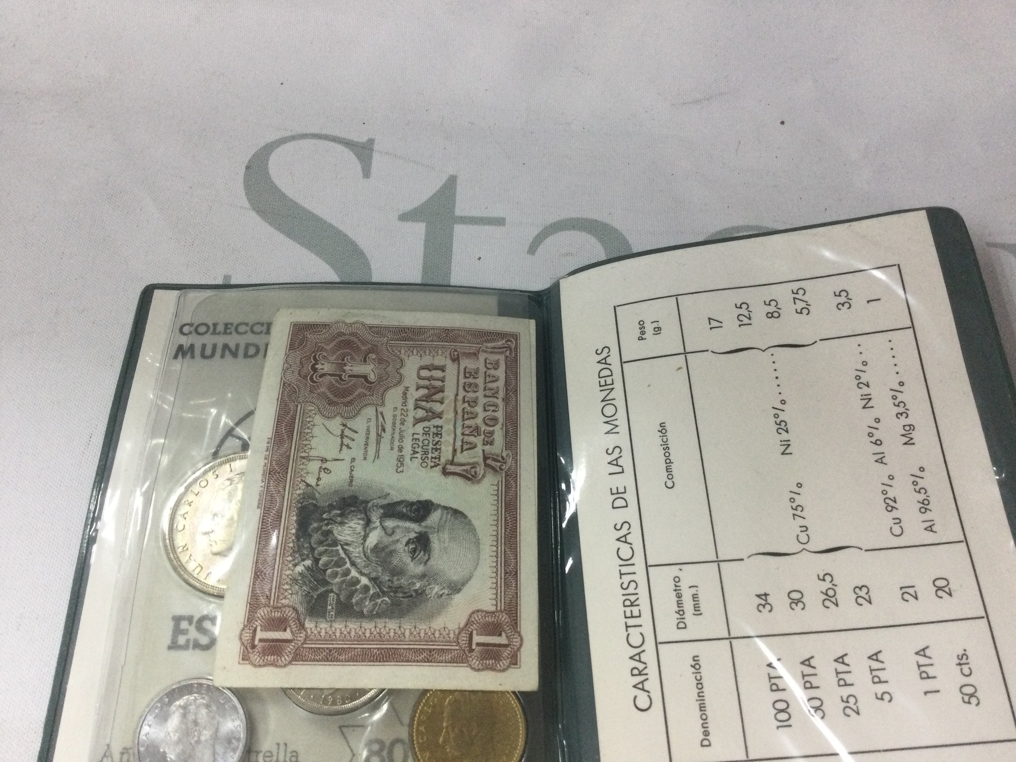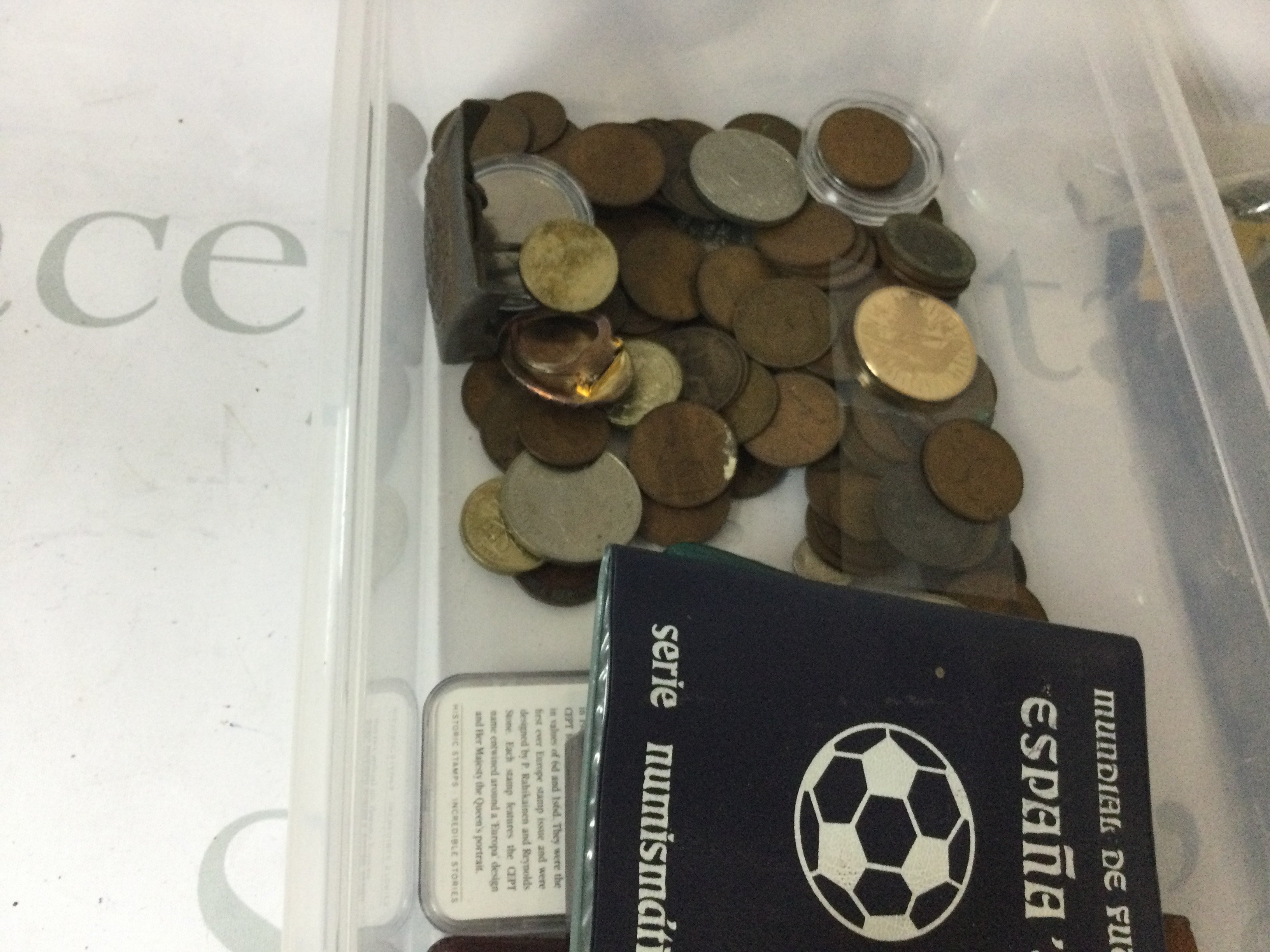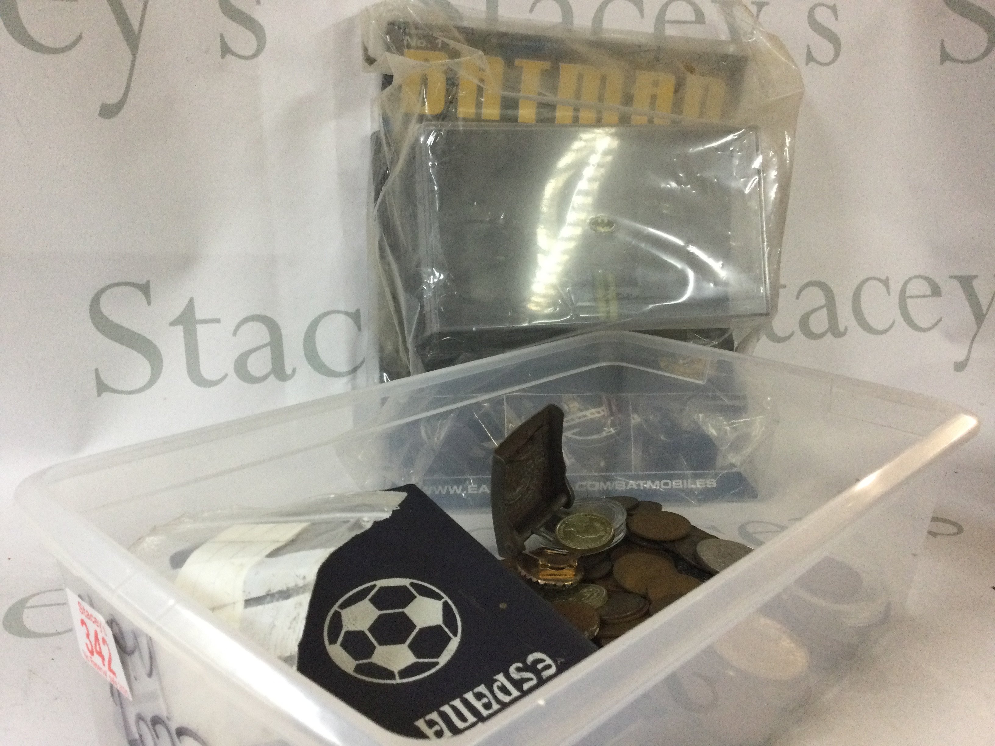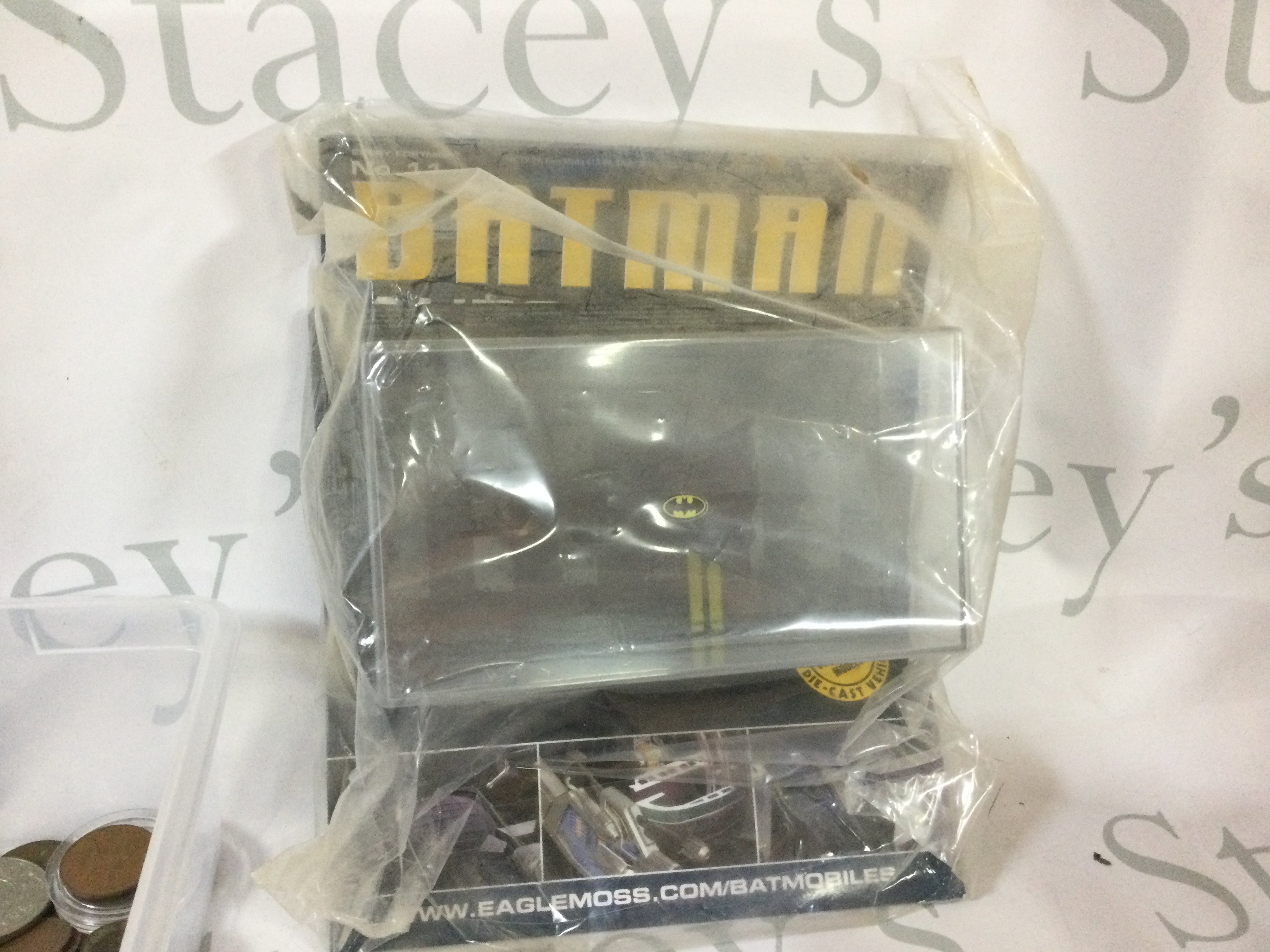 A collection of multiple different coins. Includes a 1982 small Spanish collection of coins alongside multiple other coins. Also, there is a Diecast Batman vehicle based on The Dark Knight that is sealed and protected.