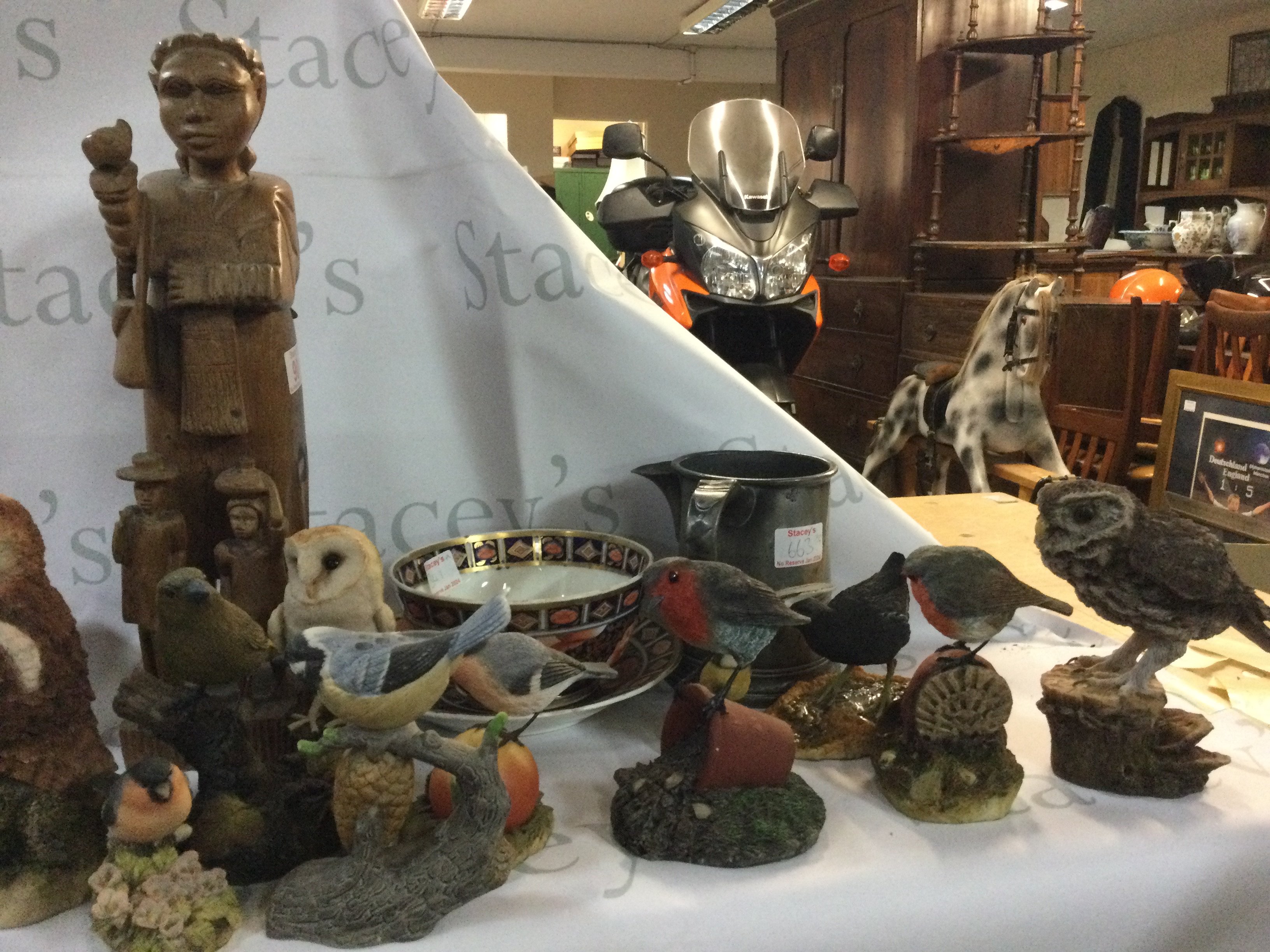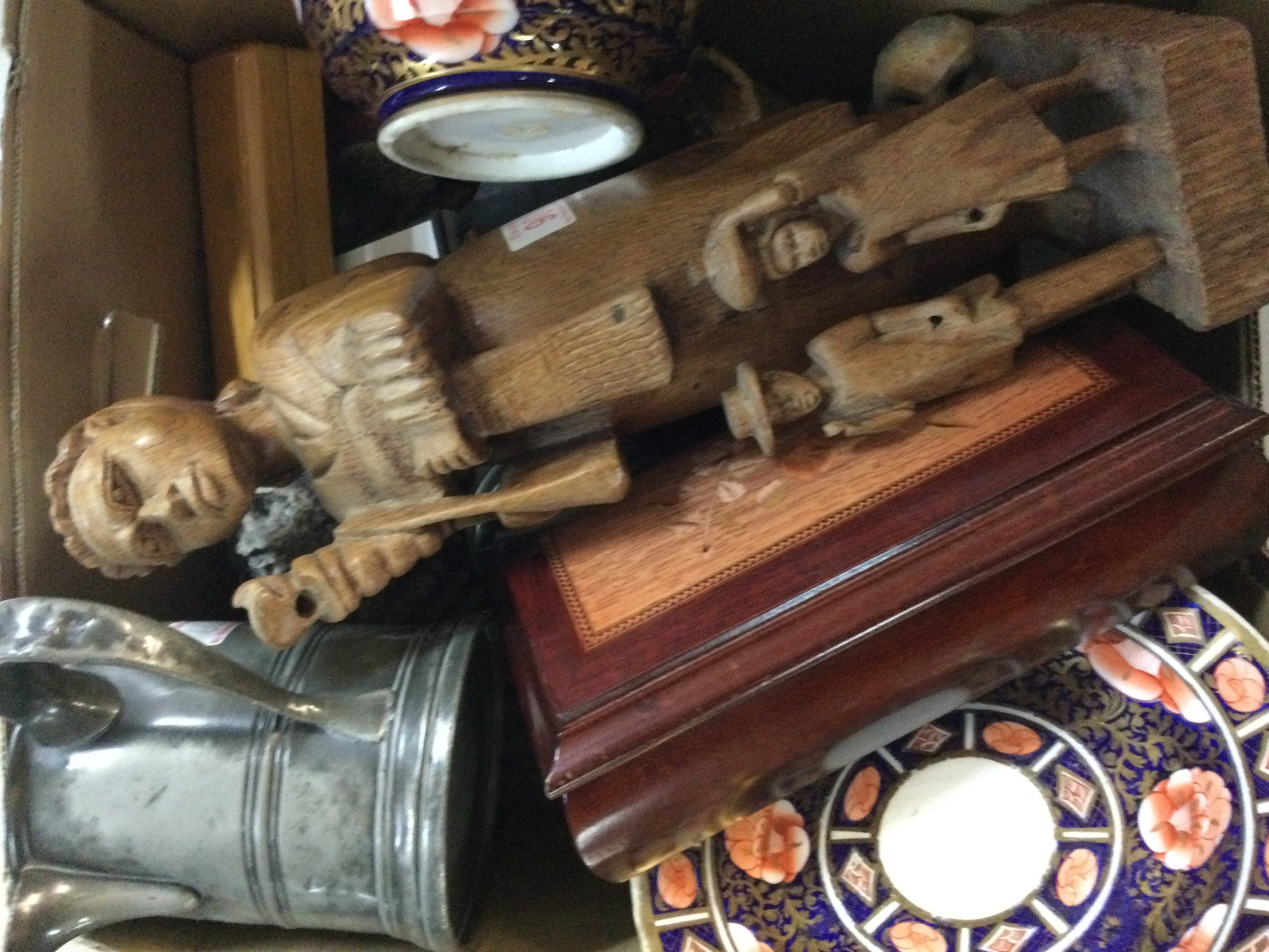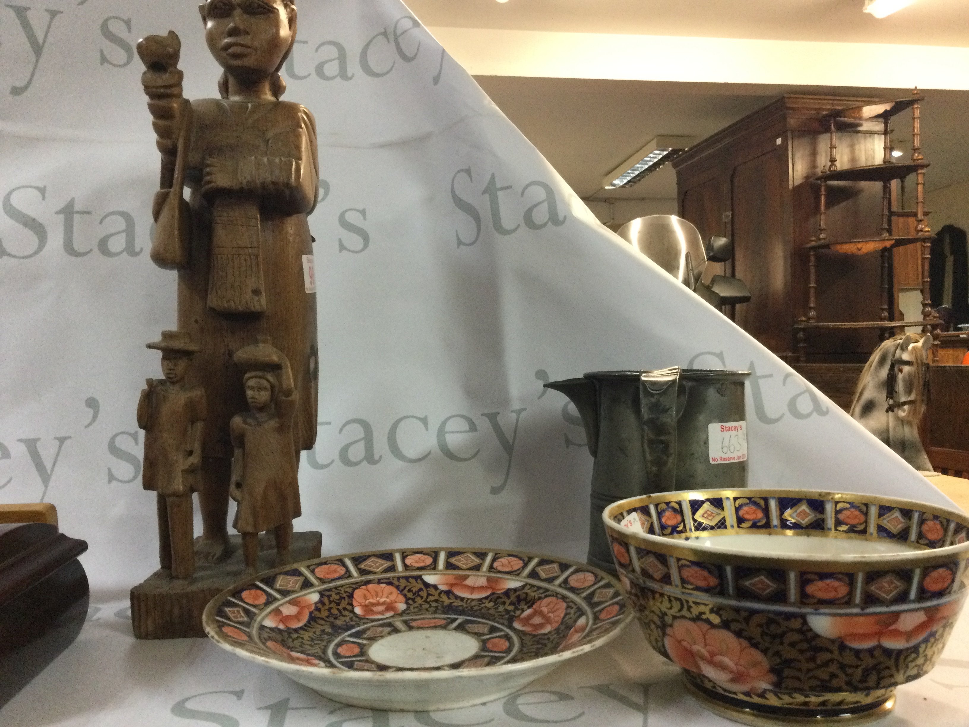 A collection of multiple different antiques, like jewellery, China plates and bowels, a large wooden statue, a Victorian antique English pewter, some jewellery including a watch and more. Also, there is a collection of Arden Sculptures.