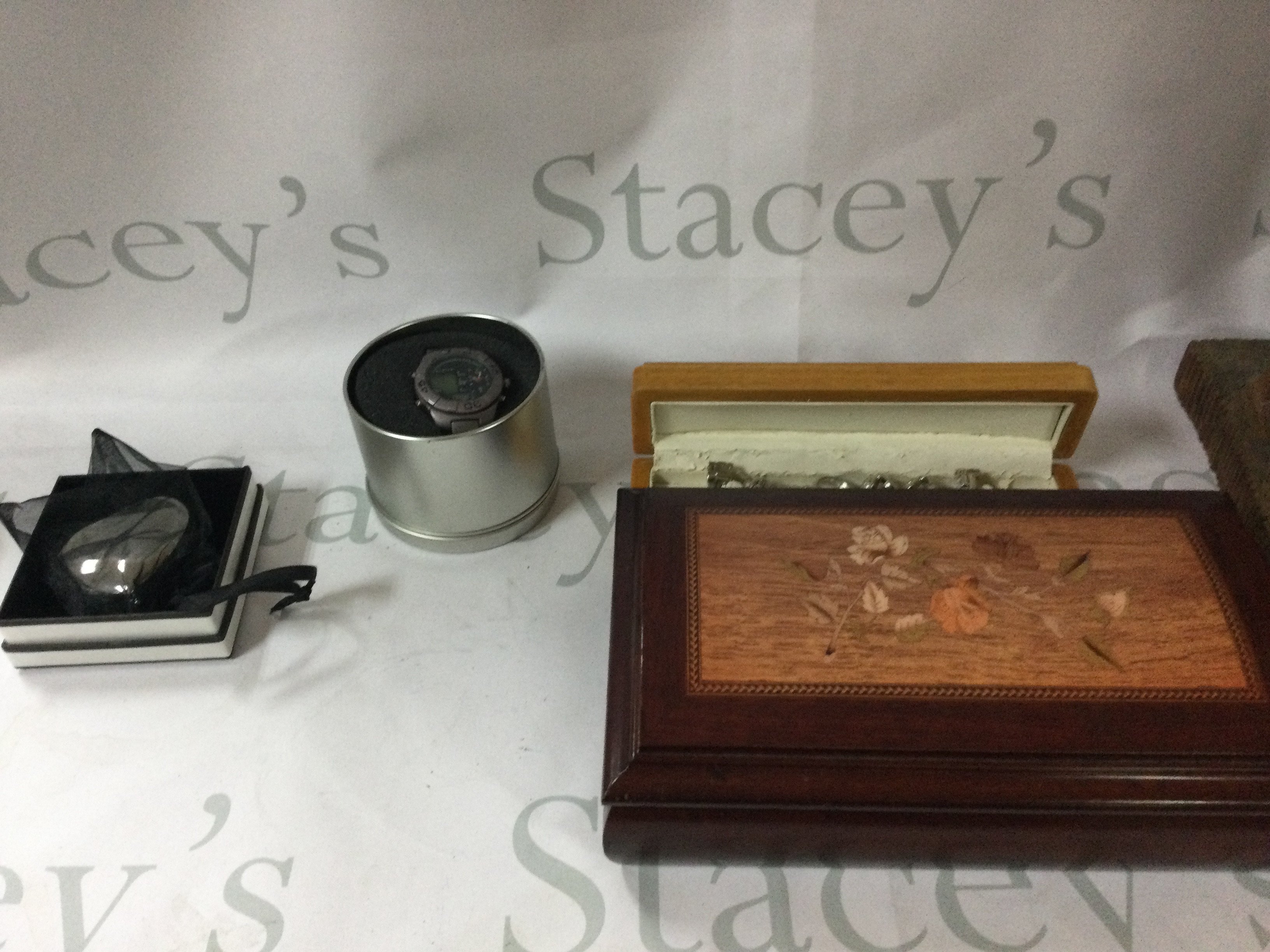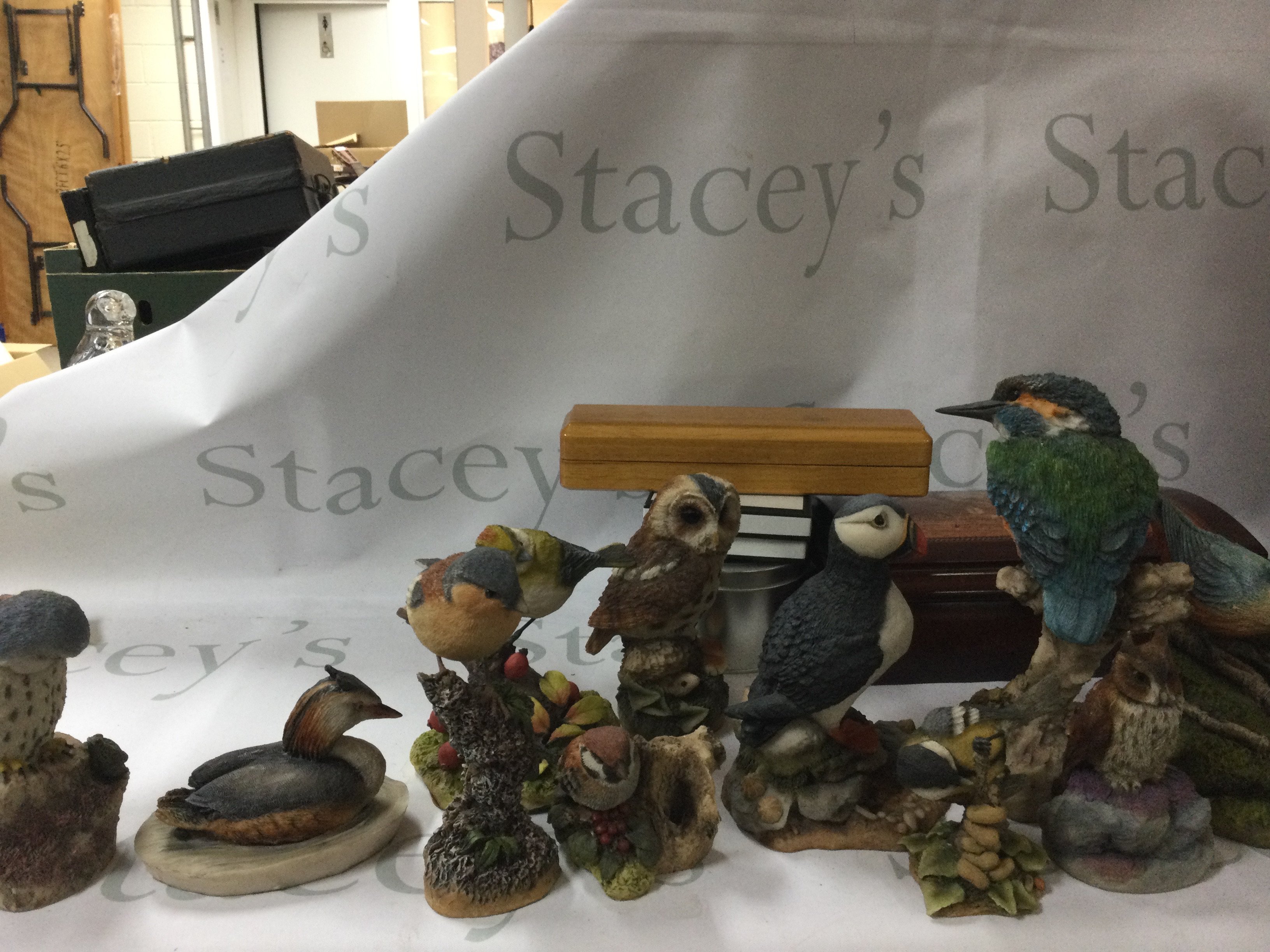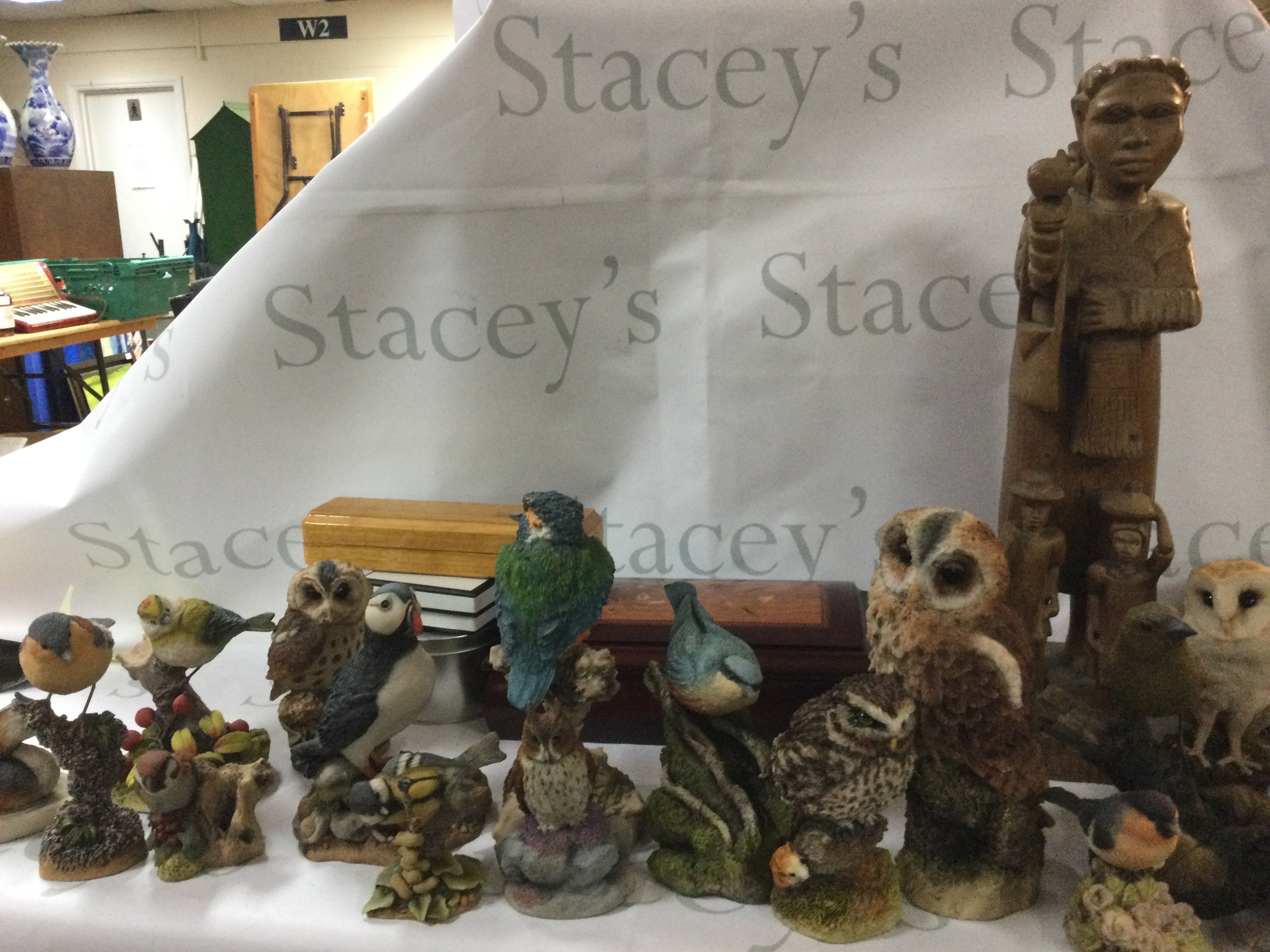 A collection of multiple different antiques, like jewellery, China plates and bowels, a large wooden statue, a Victorian antique English pewter, some jewellery including a watch and more. Also, there is a collection of Arden Sculptures.