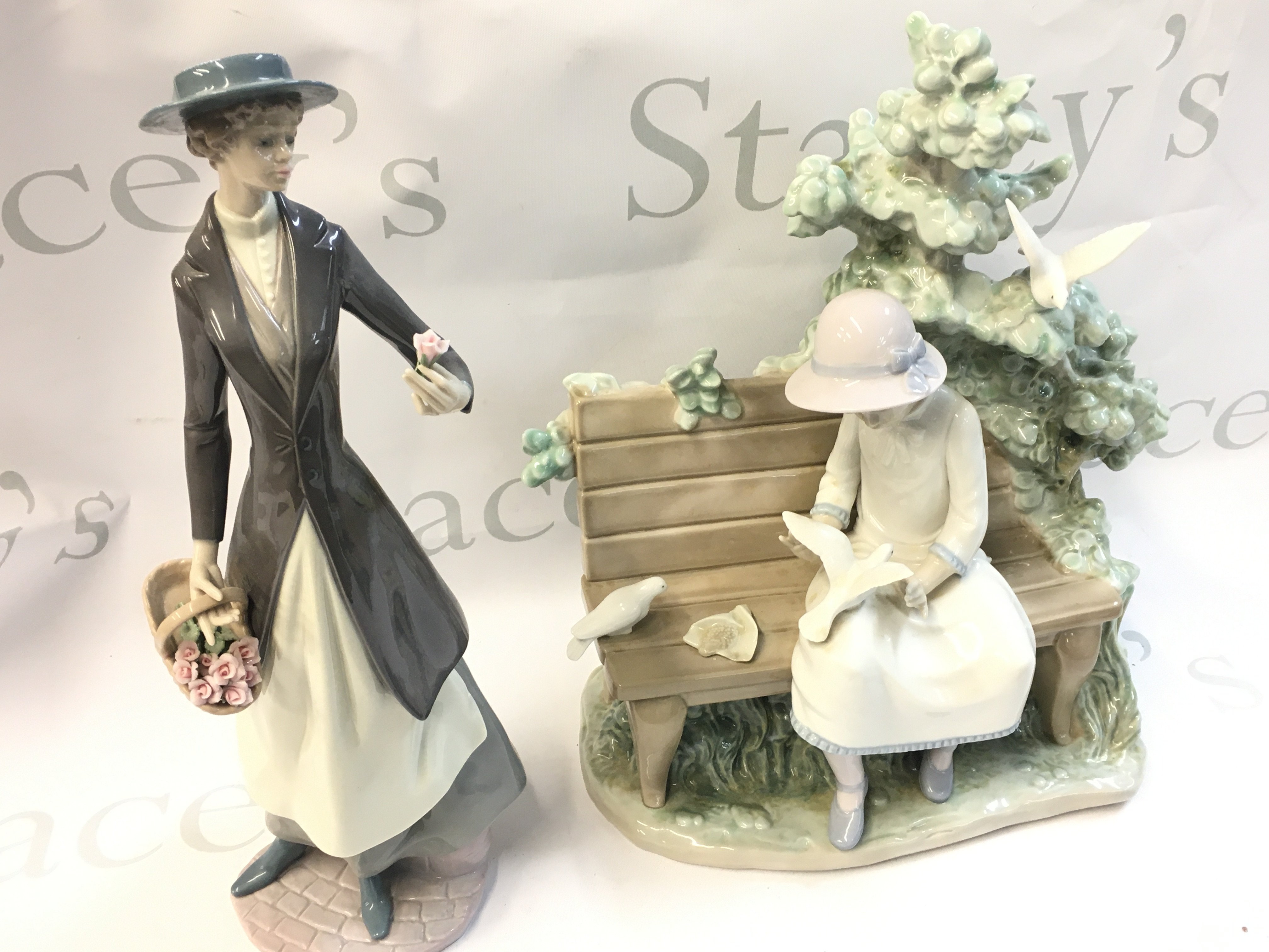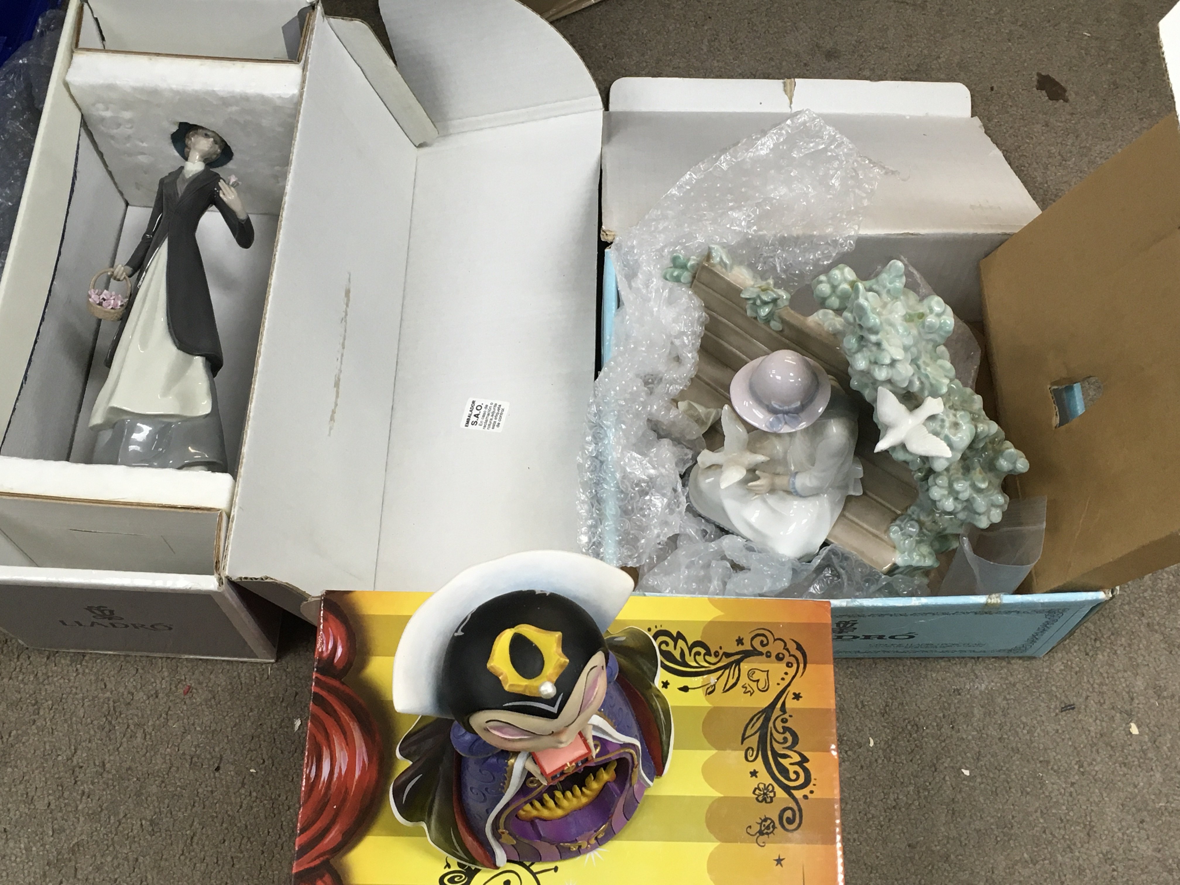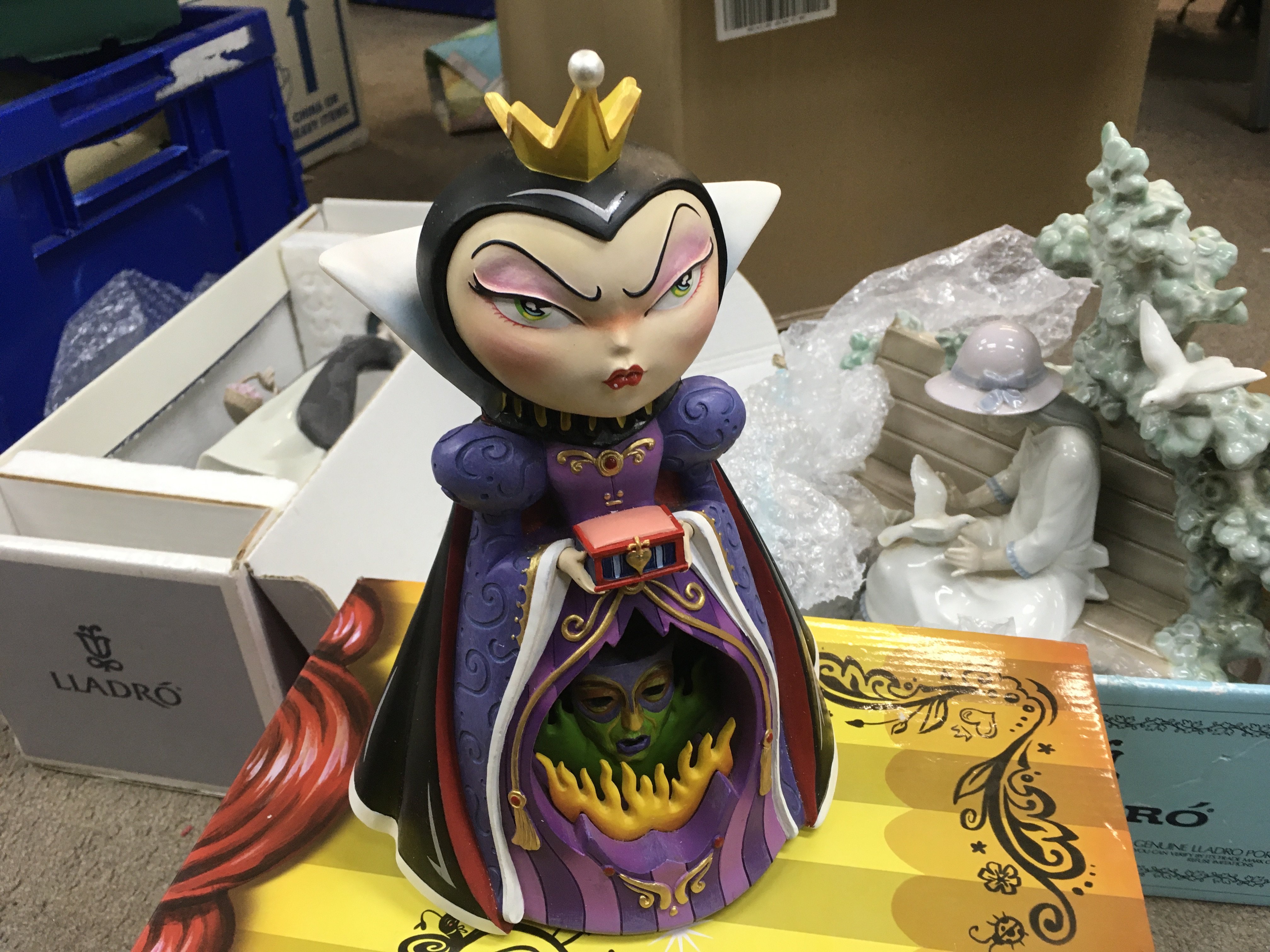 Lladro boxed figures including Tokens of love, girl on a bench feeding doves and a boxed Disney showcase figure, Miss Mindy evil Queen