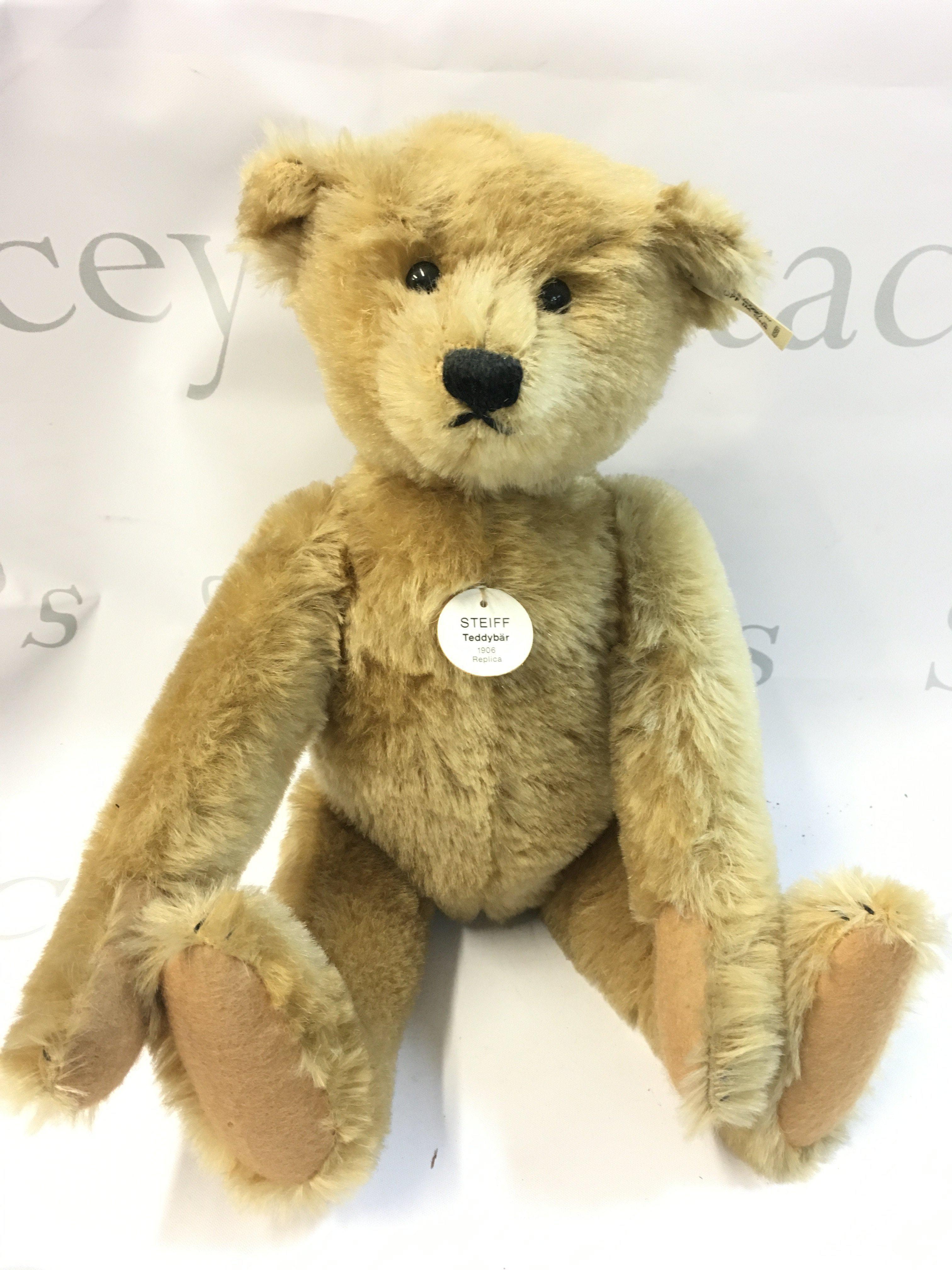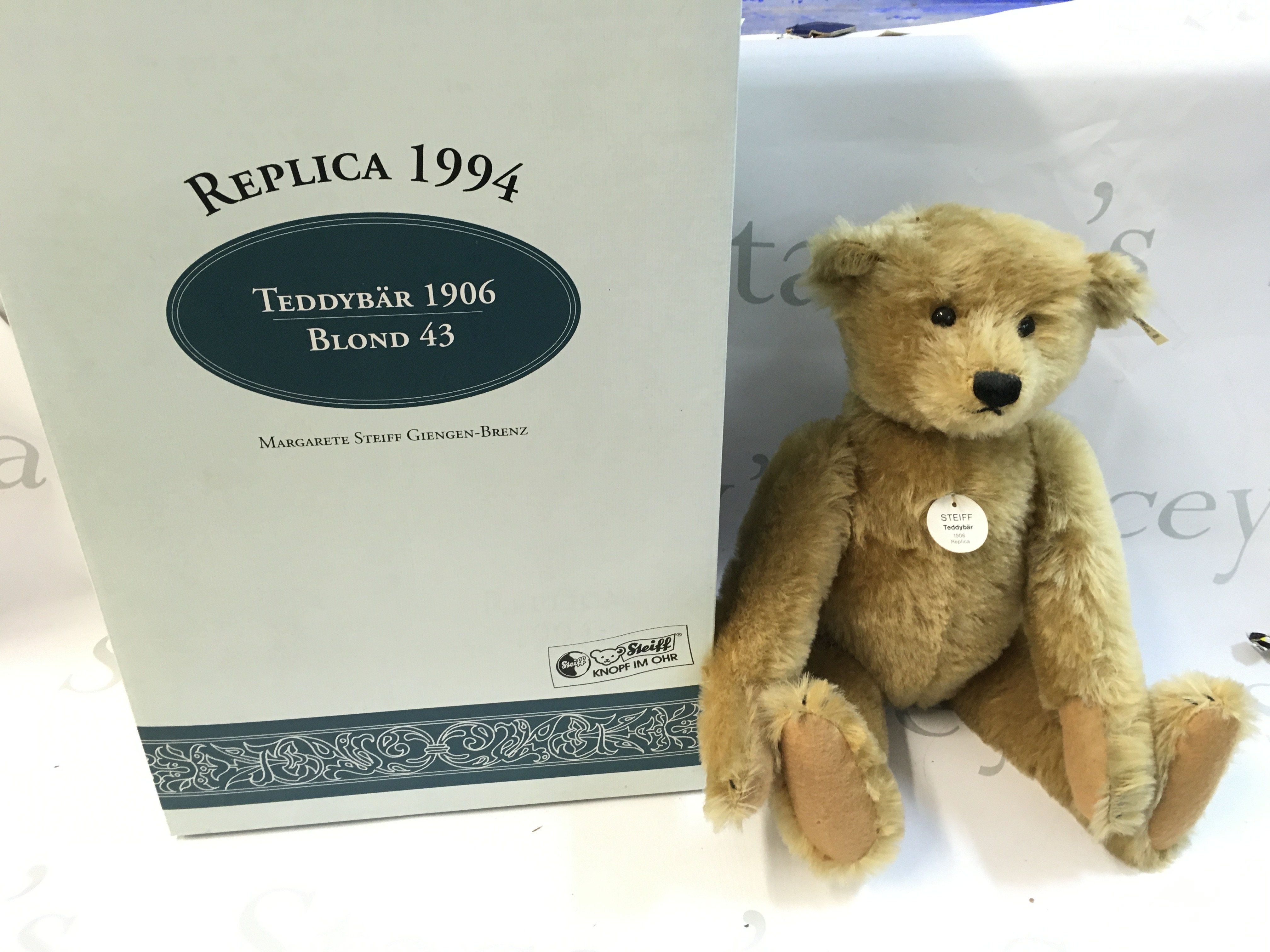 A boxed Steiff 1906 replica 1994 teddy bear, postage category C