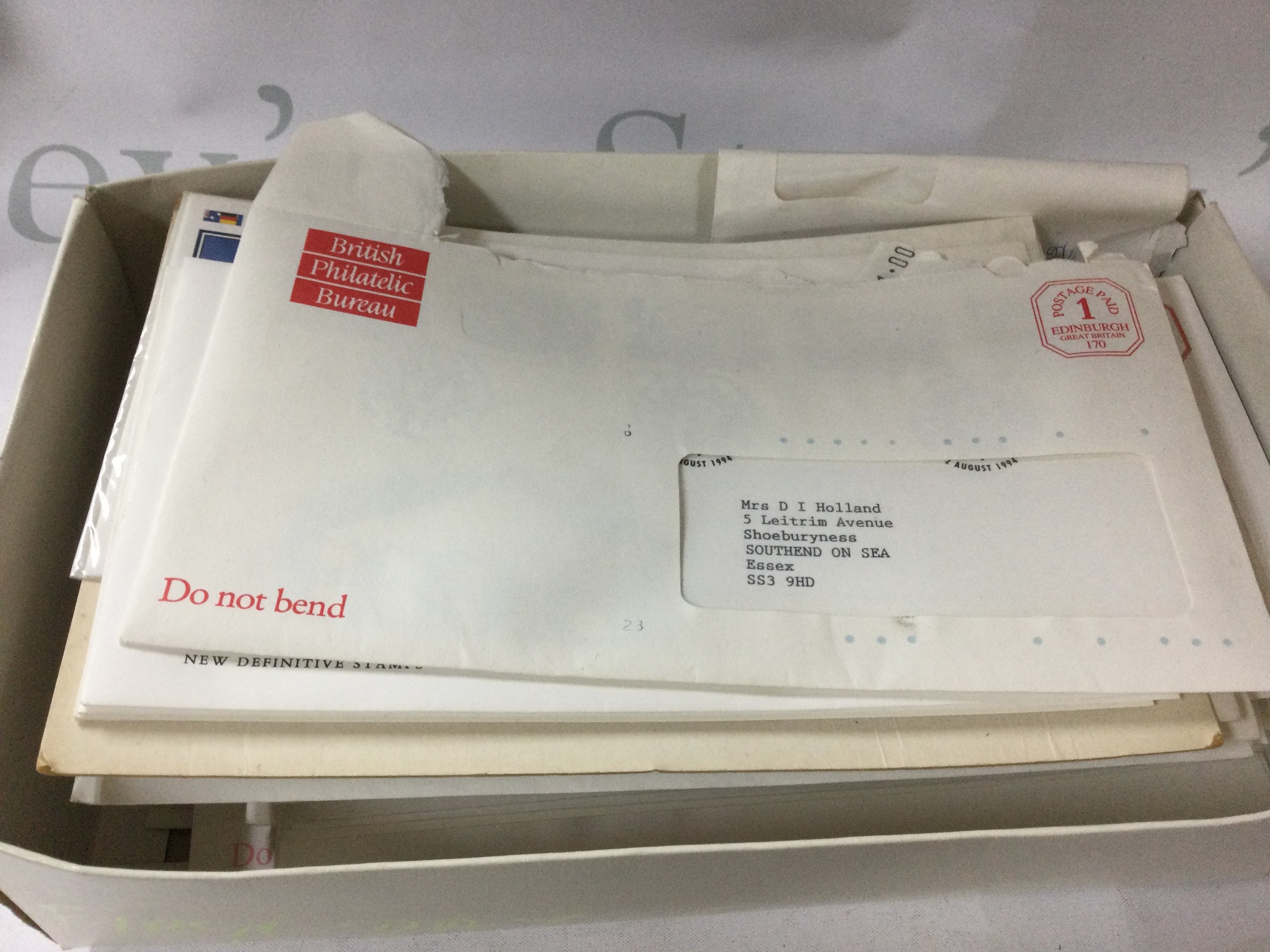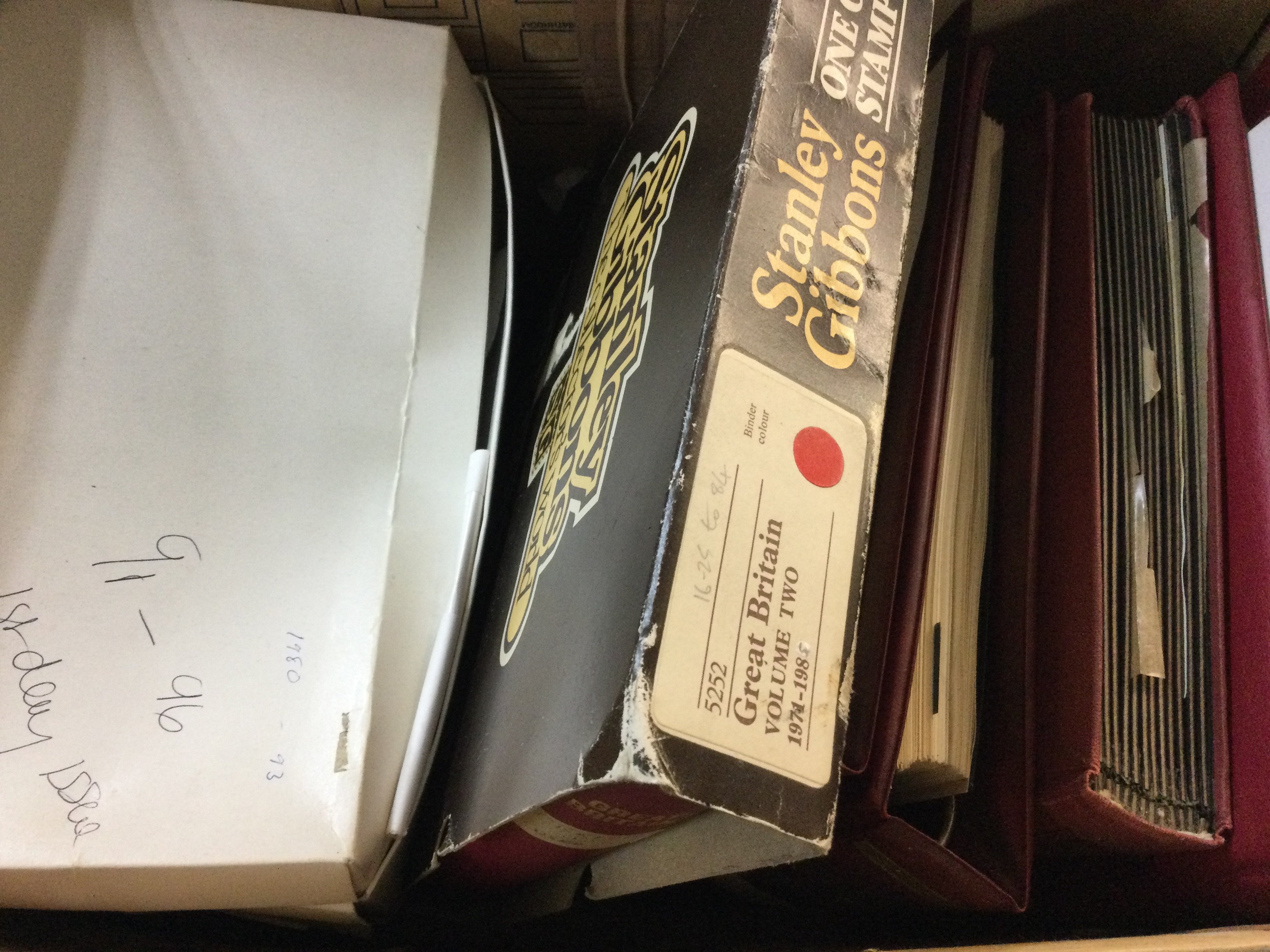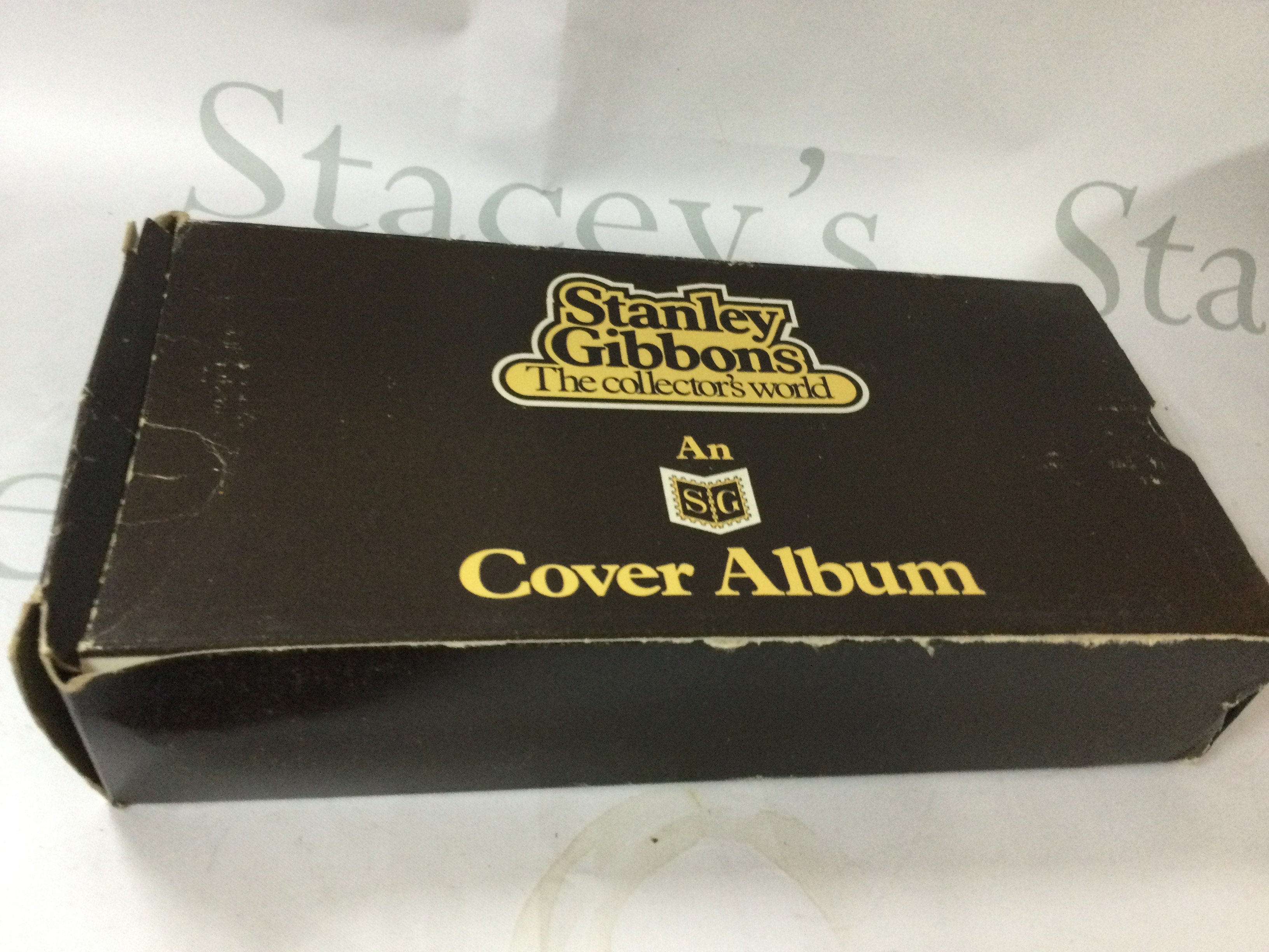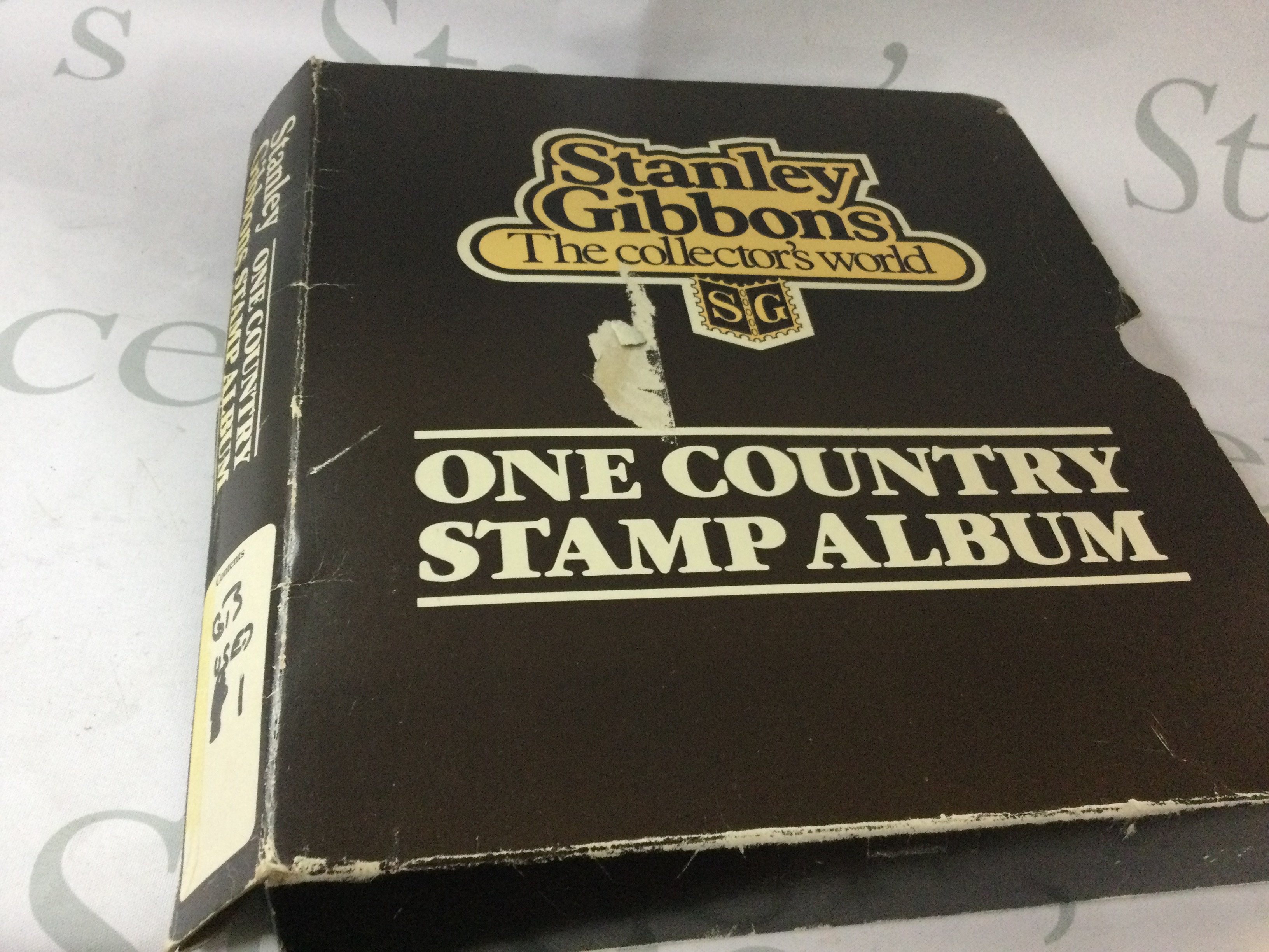 A collection of stamp albums made by Stanley Gibbon including the One Country Stamp Album, Cover Album, 2 Great British Stamp albums, some other stamp albums and a small box of vintage postcards