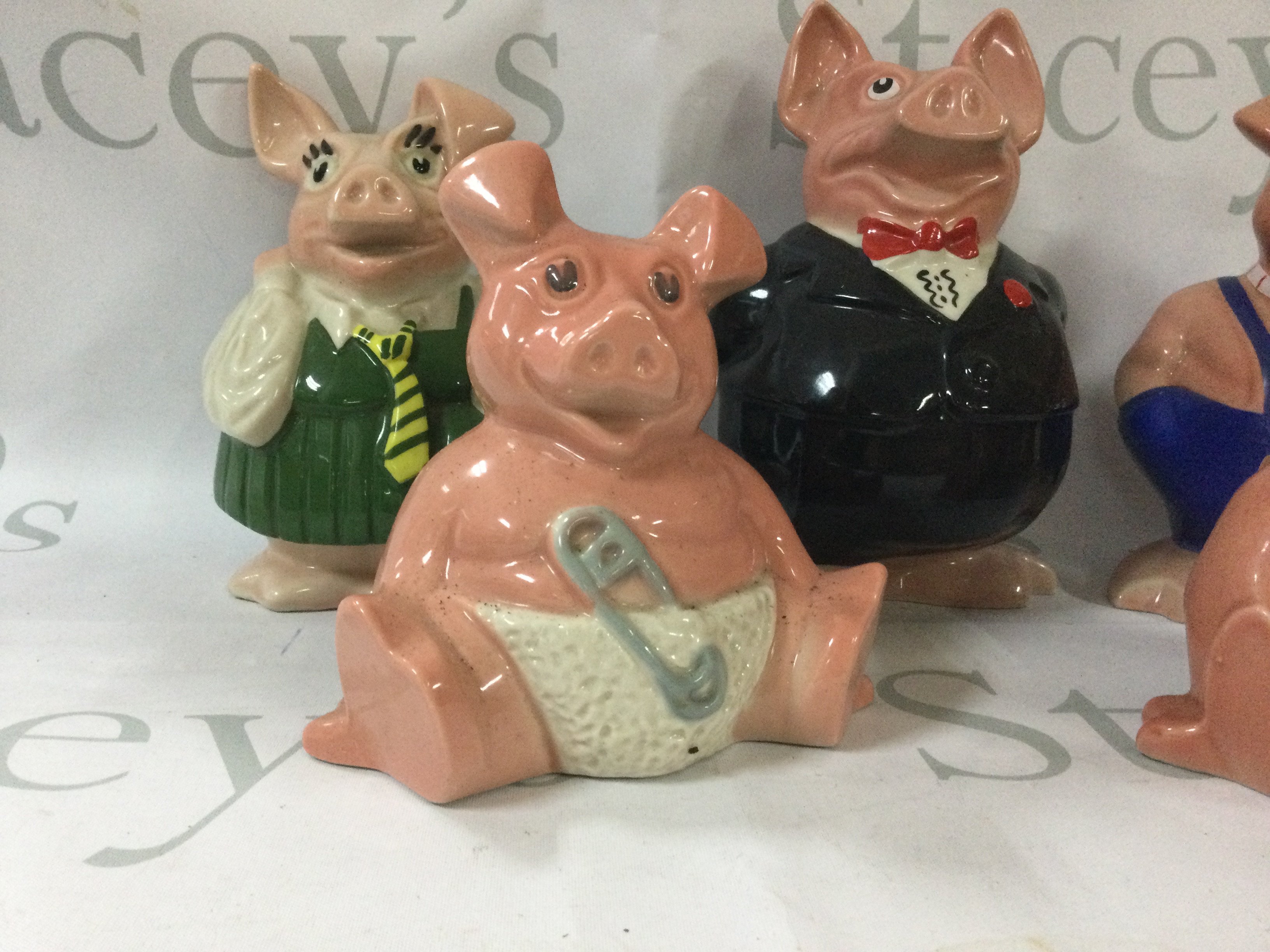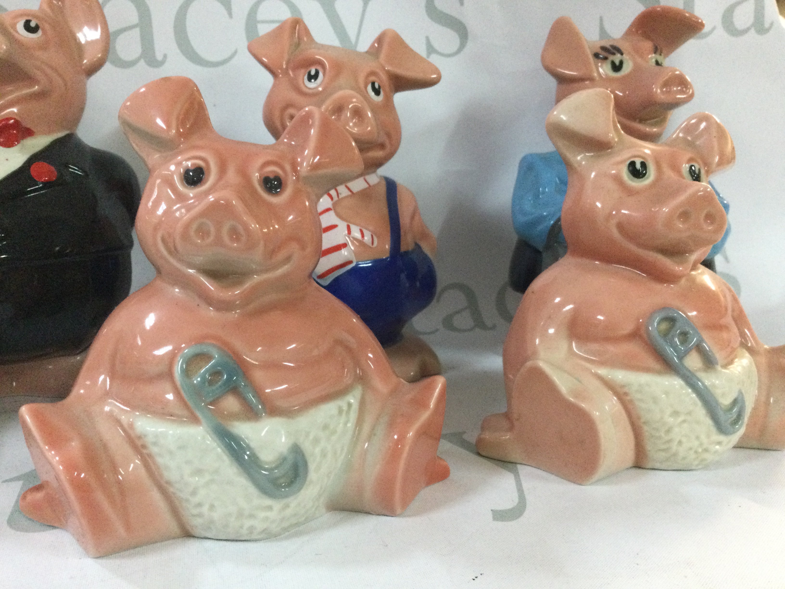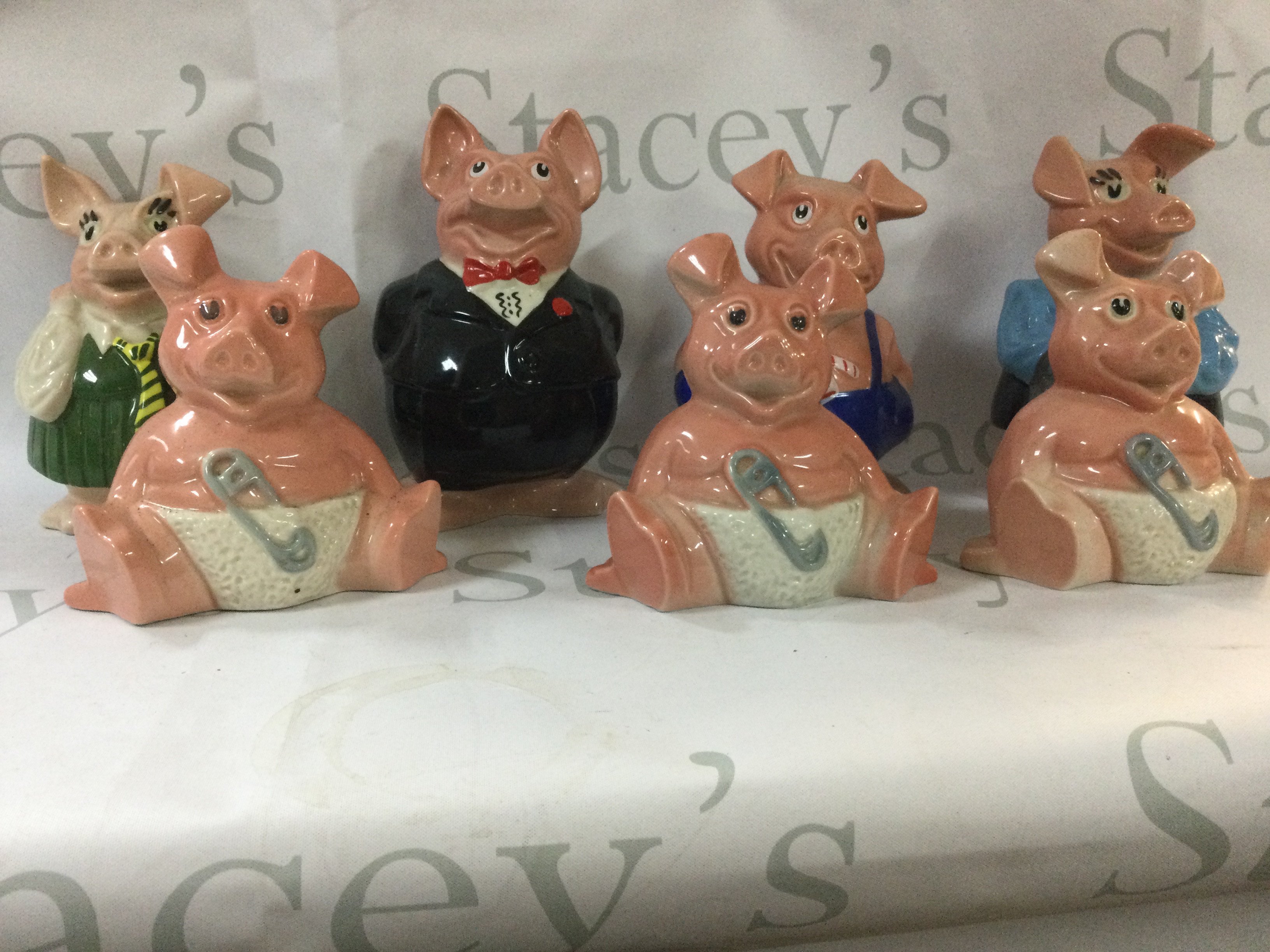 A collection of antique pig money boxes from 1980s NatWest. Includes all 5 of the pigs and 2 extra small pigs. Also includes a vintage license plate and an antique brick.