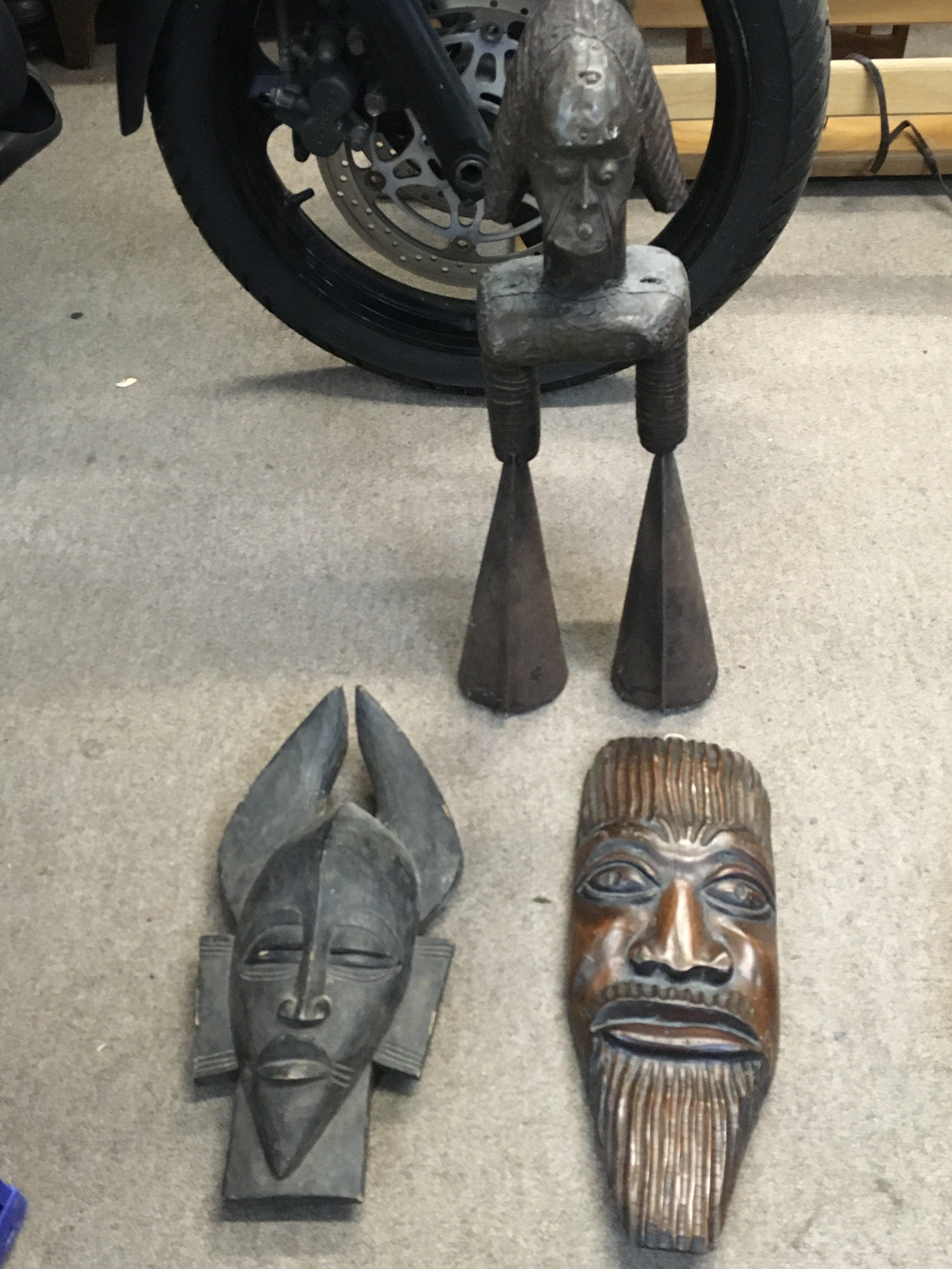 Two African hardwood wall masks and an African figure/