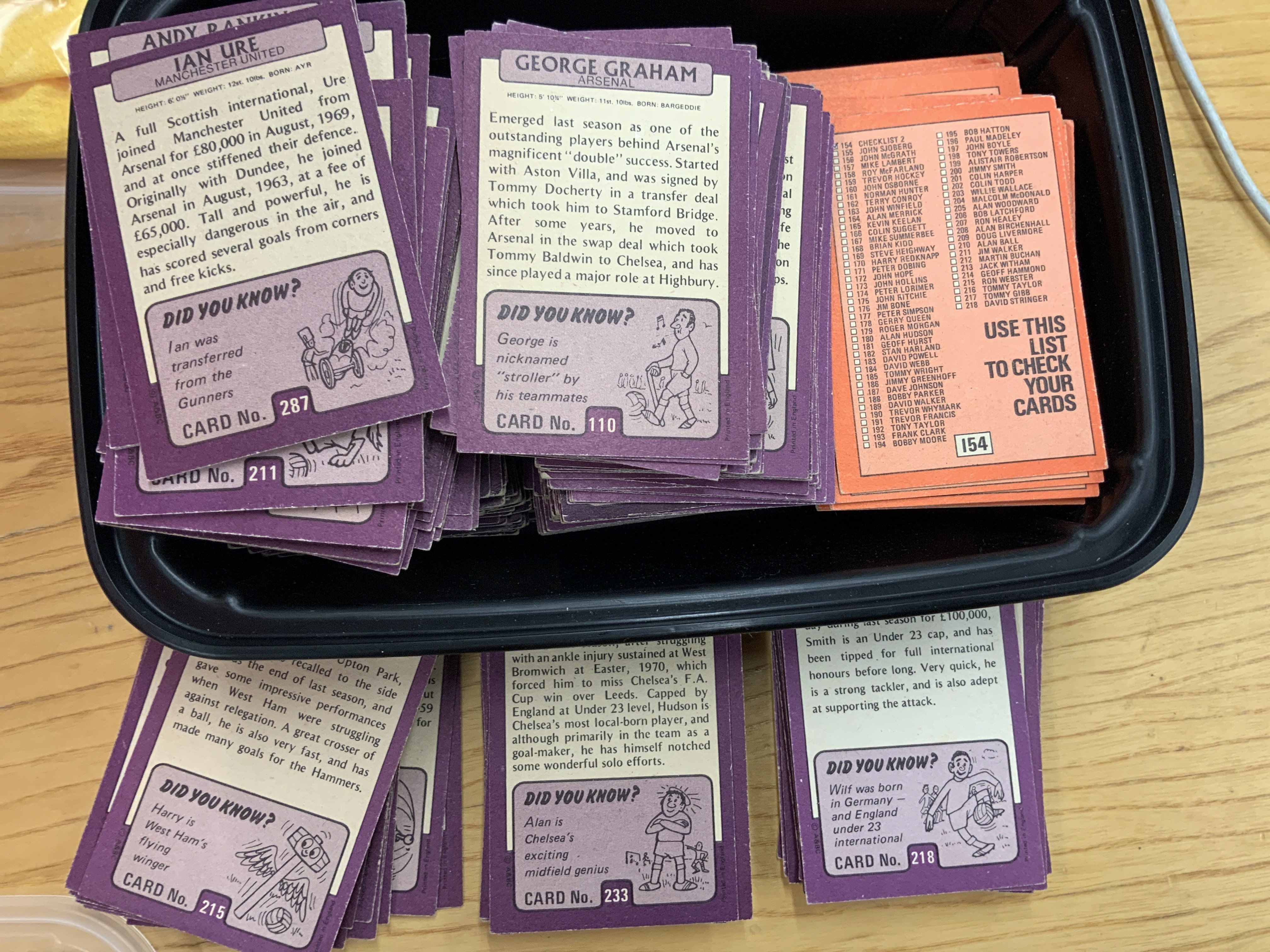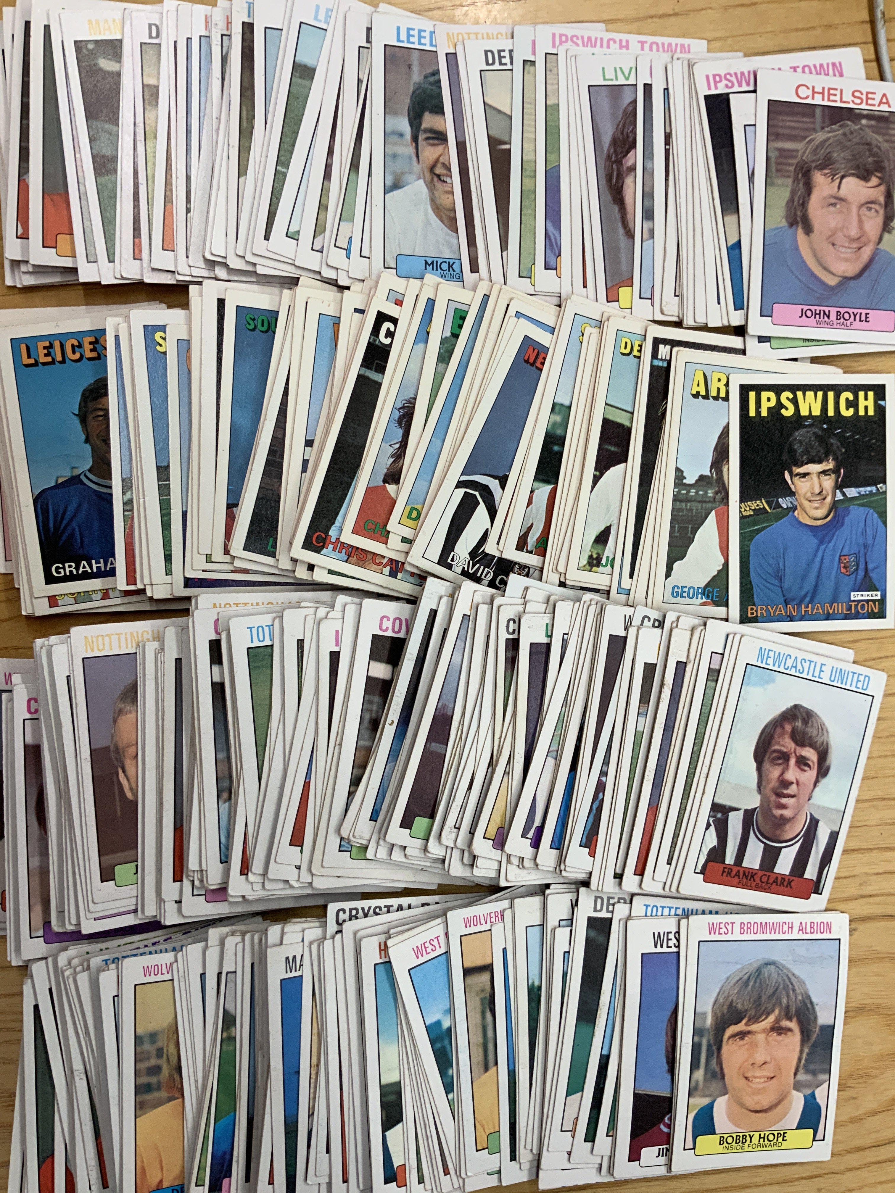 A + BC Football Card Collection: 1971 purple back ( Did You Know ) which consists of 3 sets amounting to 290 cards. This has nearly 300 cards including check lists but is not complete as has some doubles. C/W 76 of 109 of the orange backs from 1972 and more. Very good condition. (est 400)