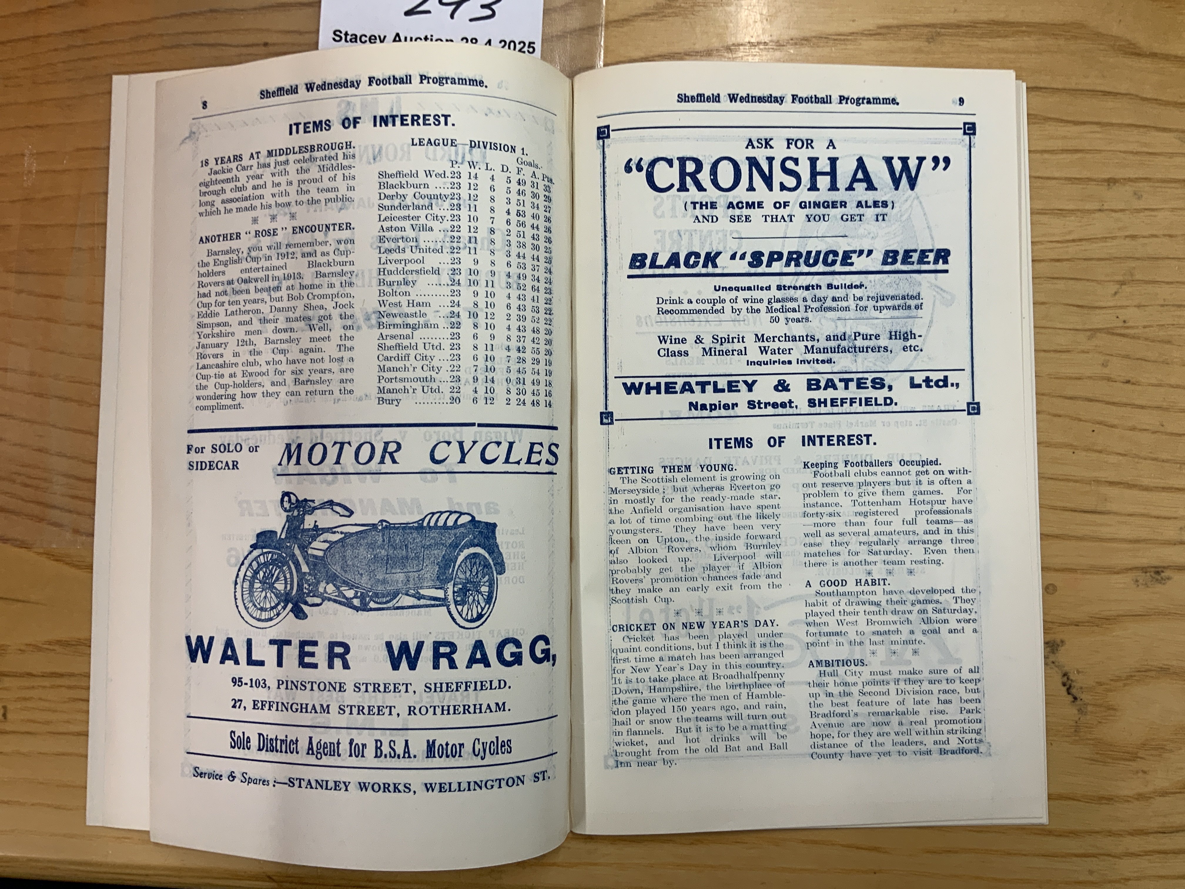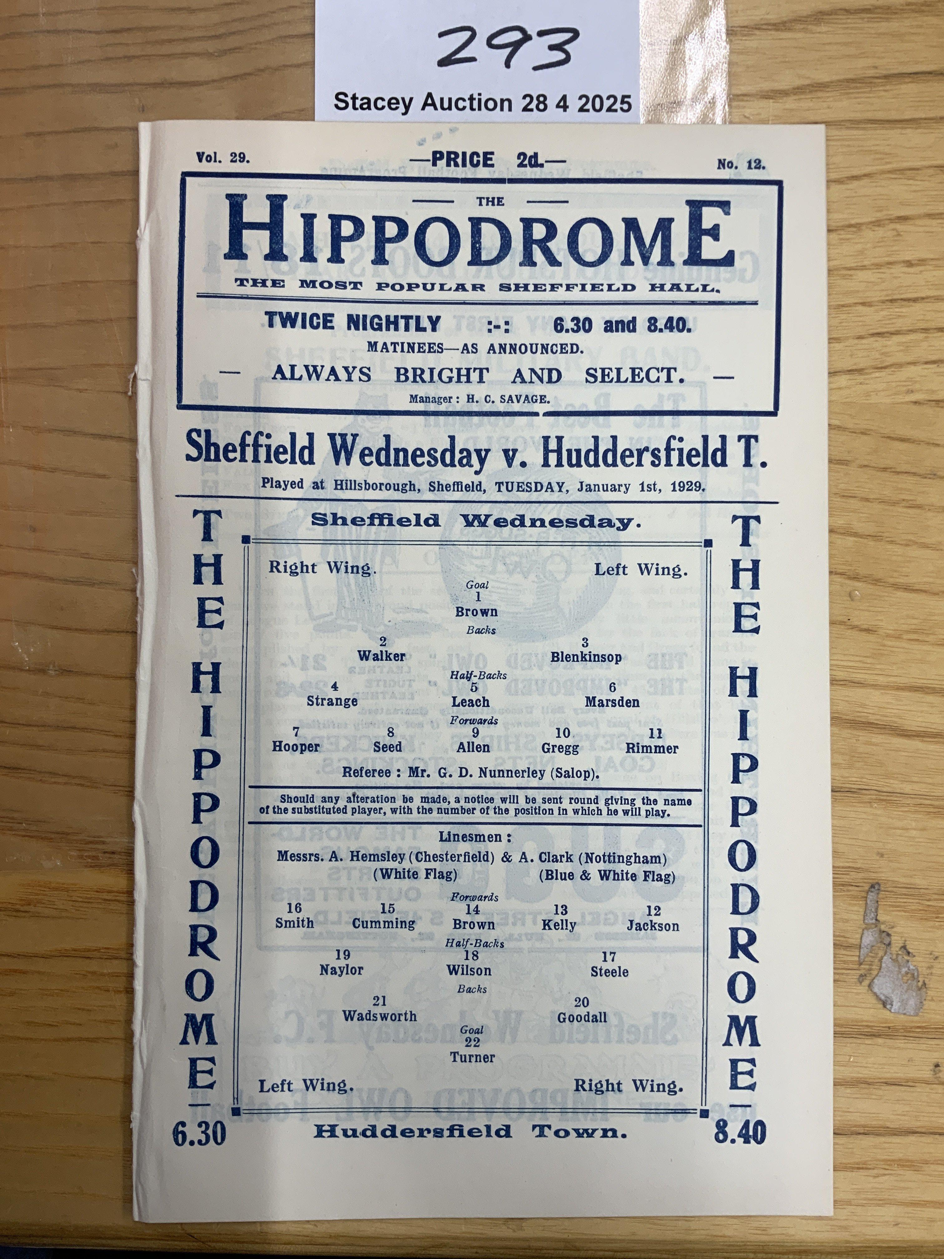 28/29 Sheffield Wednesday v Huddersfield Football Programme: Excellent condition ex bound with no team changes. Covers intact.