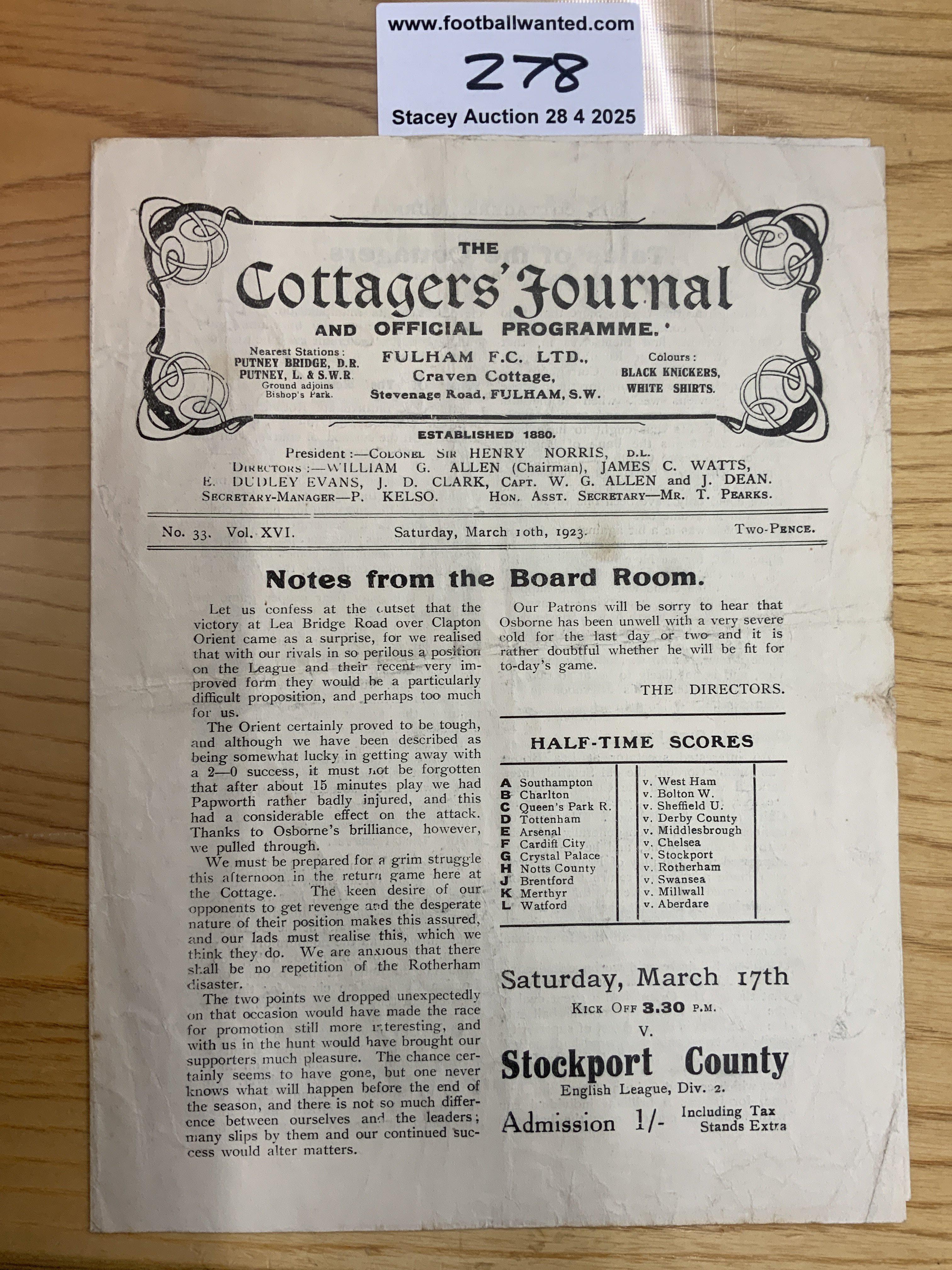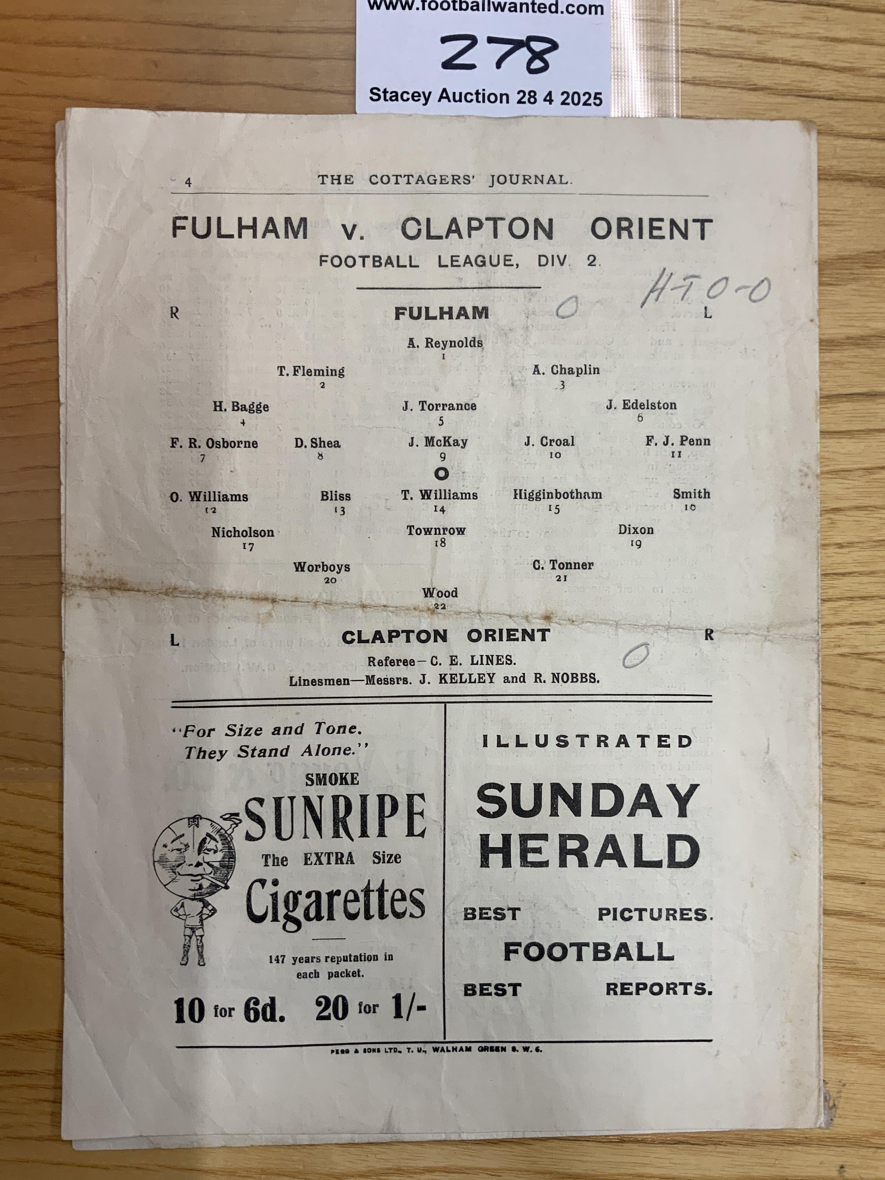 1922 - 1923 Fulham v Clapton Orient Football Programme: Good condition with no team changes. Pencilled score to team page. Fold.