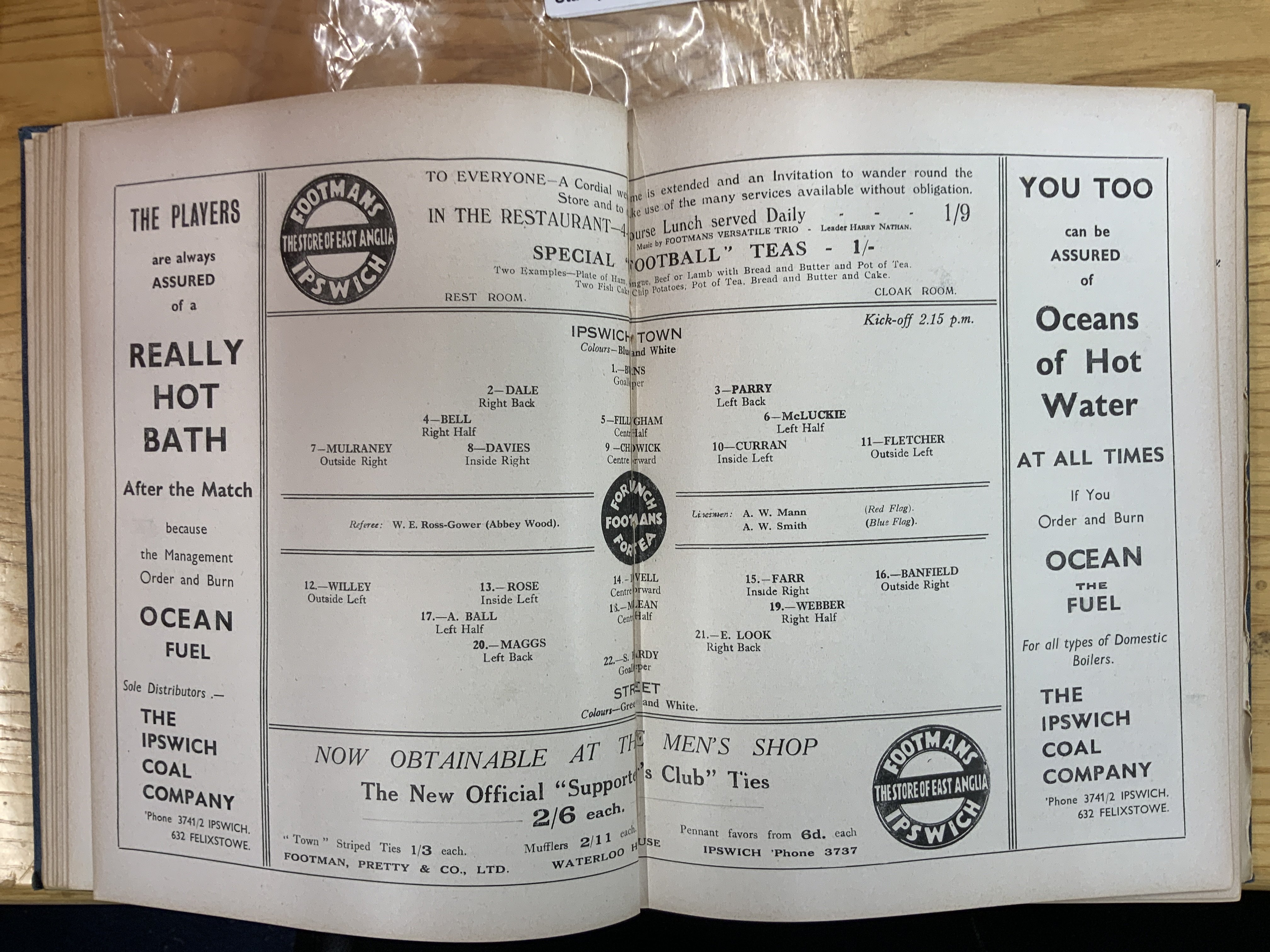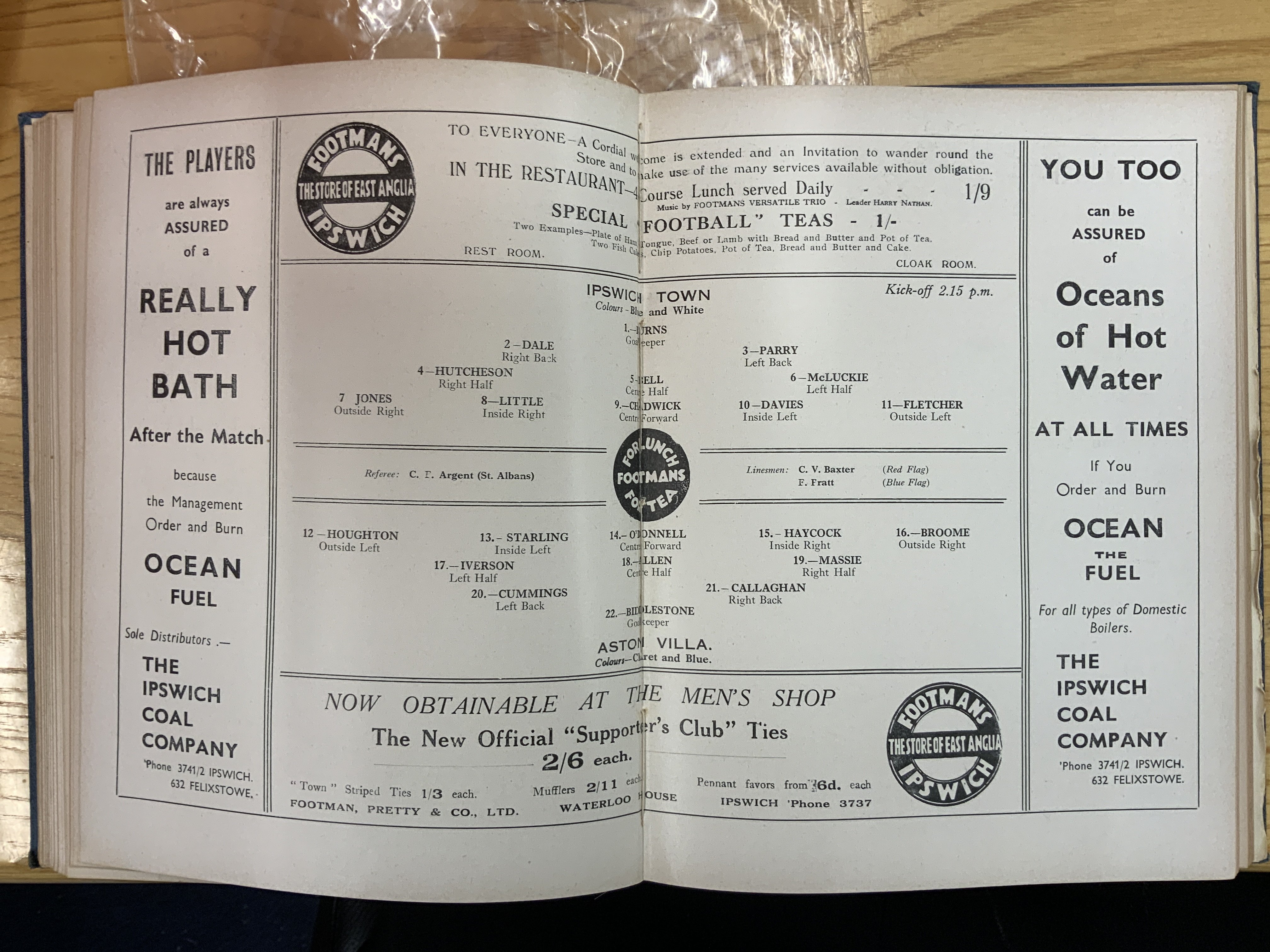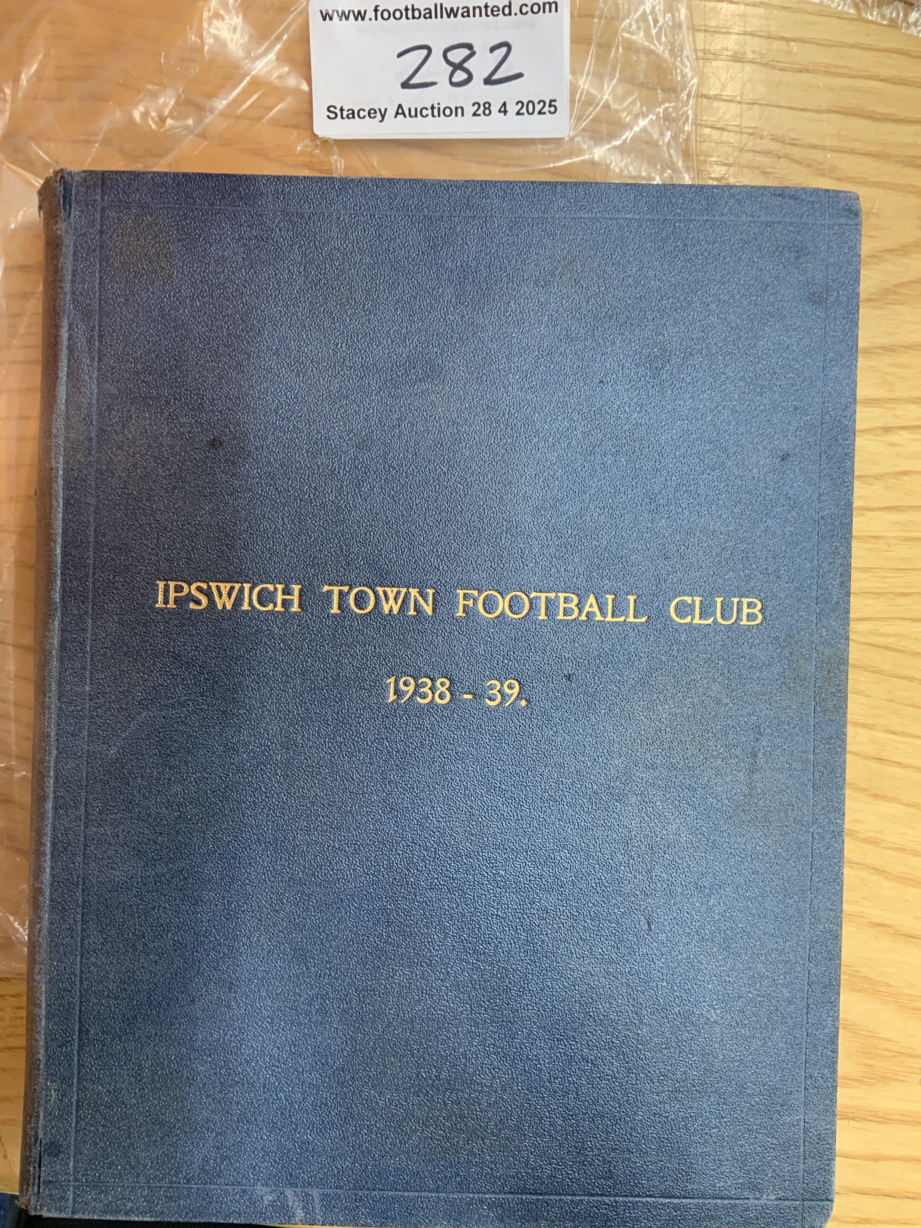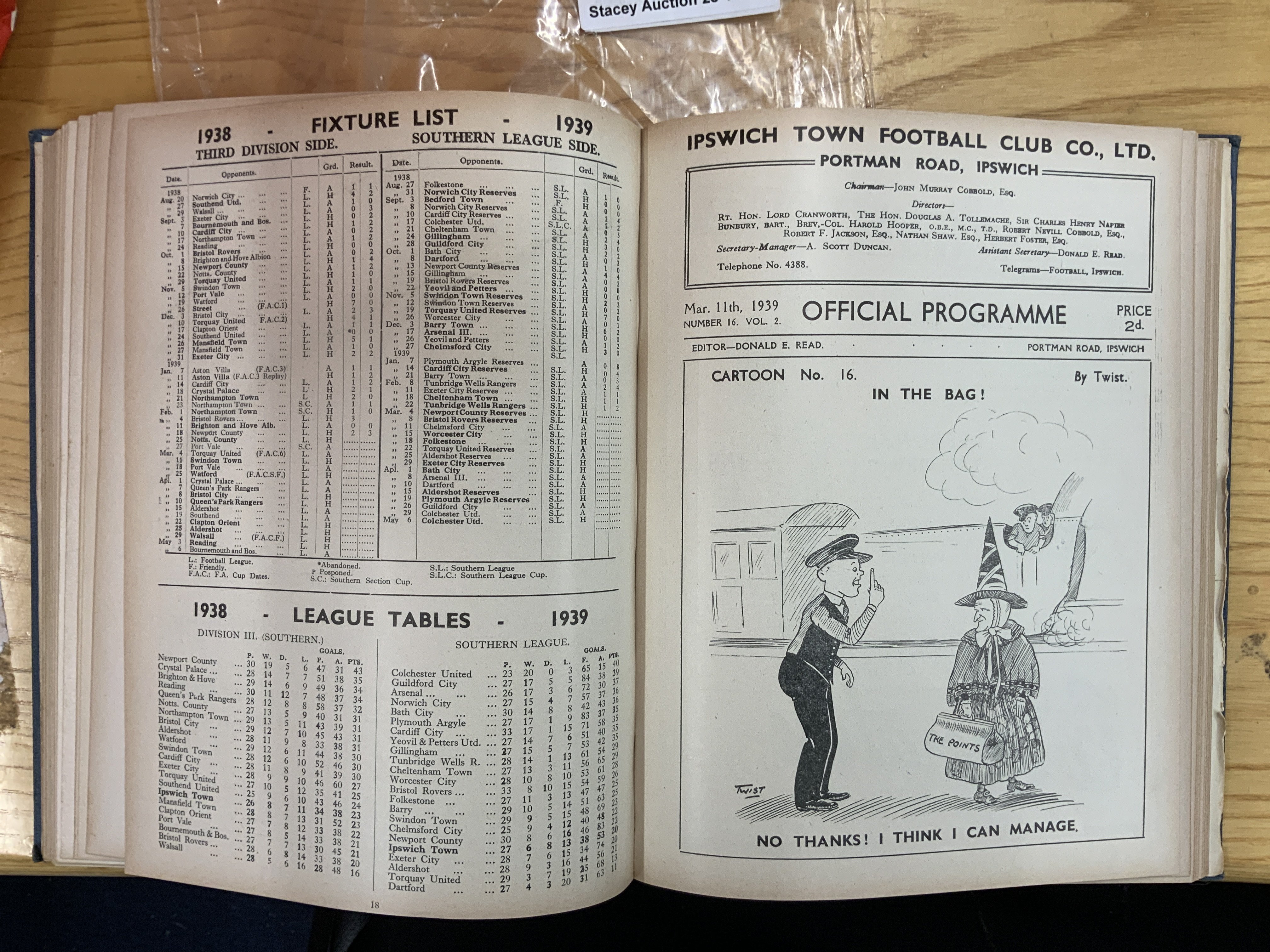 38/39 Ipswich Town Bound Volume Of Football Programmes: Blue covers with the words Ipswich Town Football Club 1938-39. Contains 23 full page programmes without covers and no single sheets. Only one with a front cover is the cellotaped in Hospital Cup match v Aston Villa. All unwritten in excellent condition.