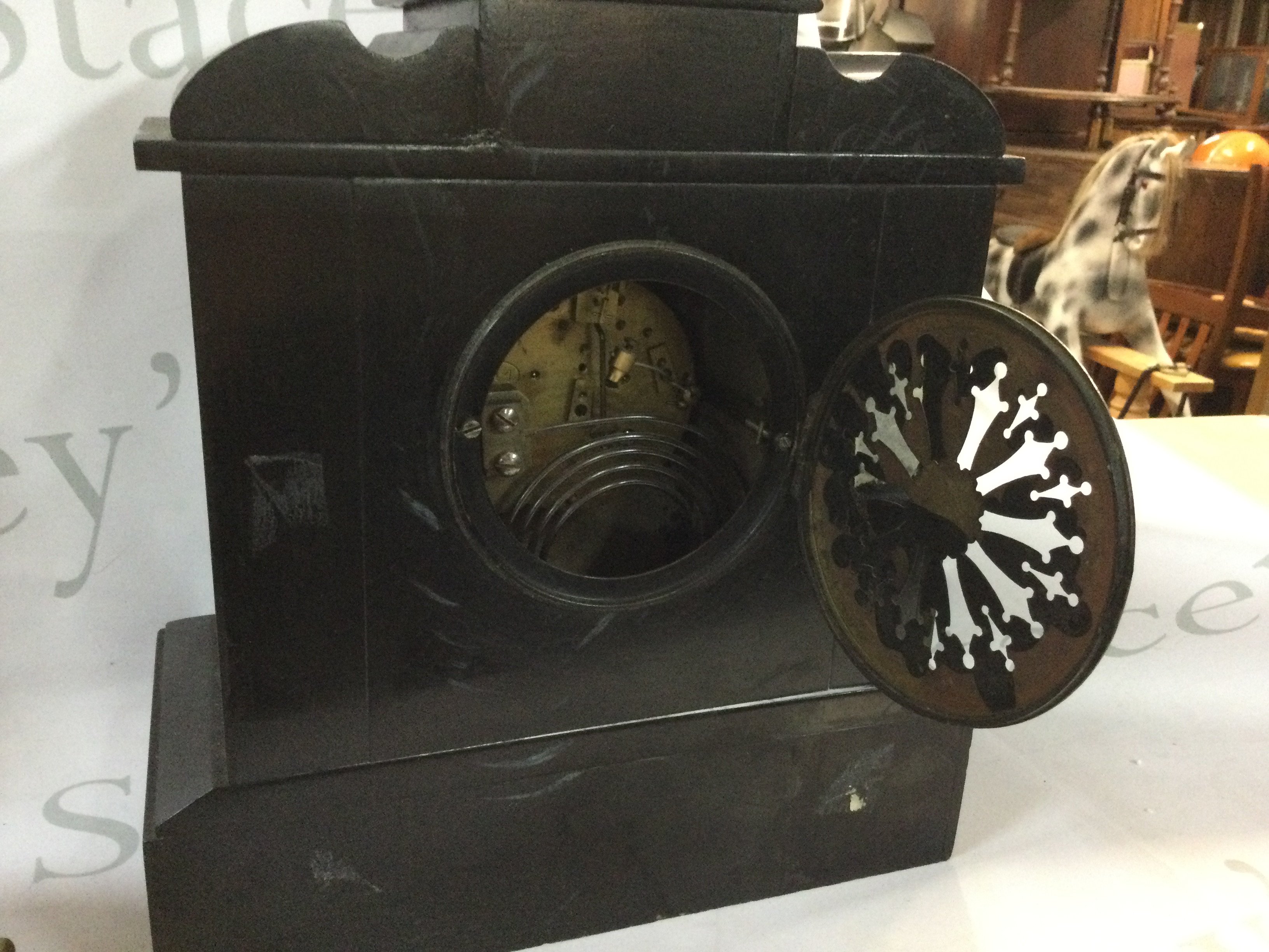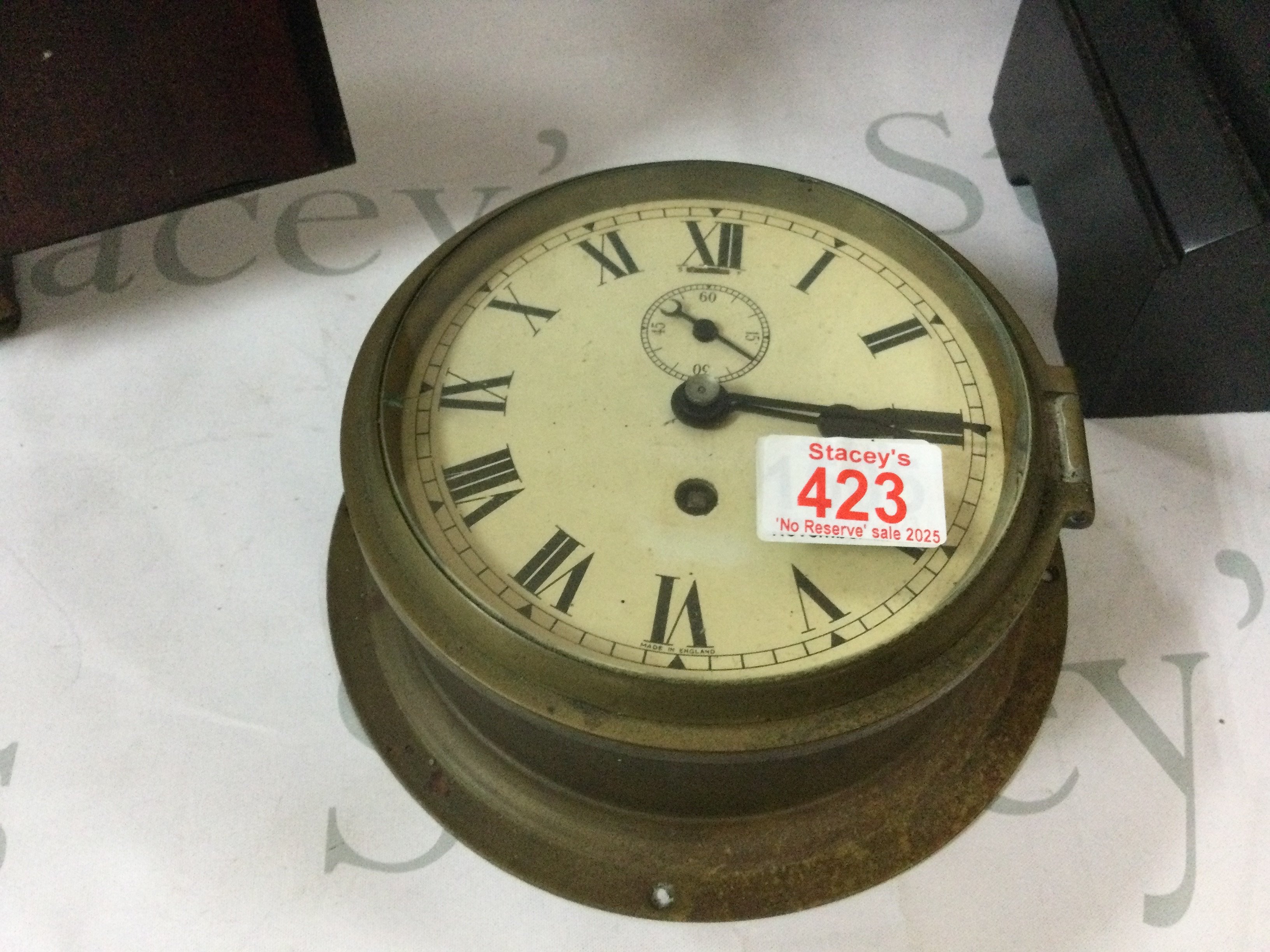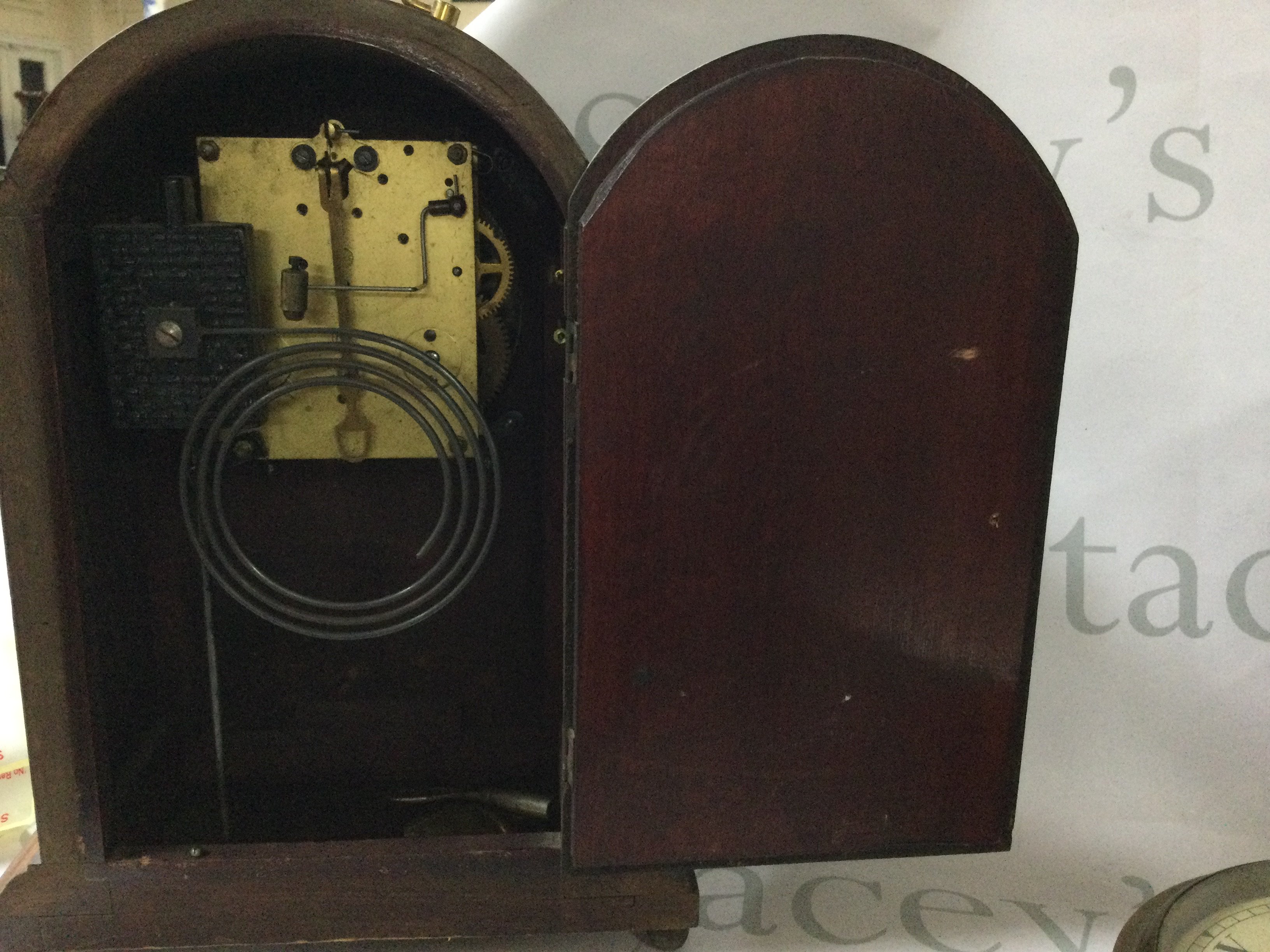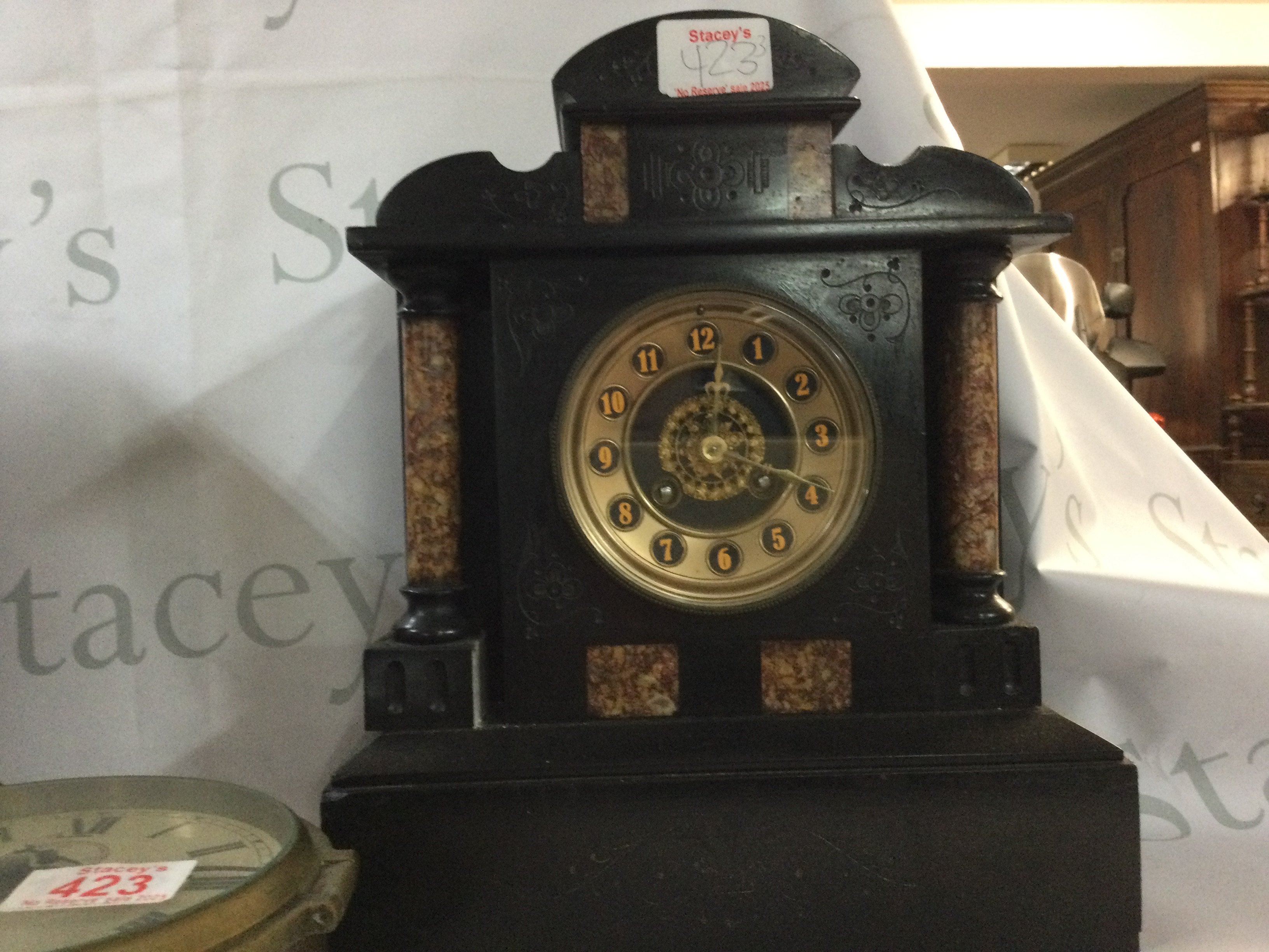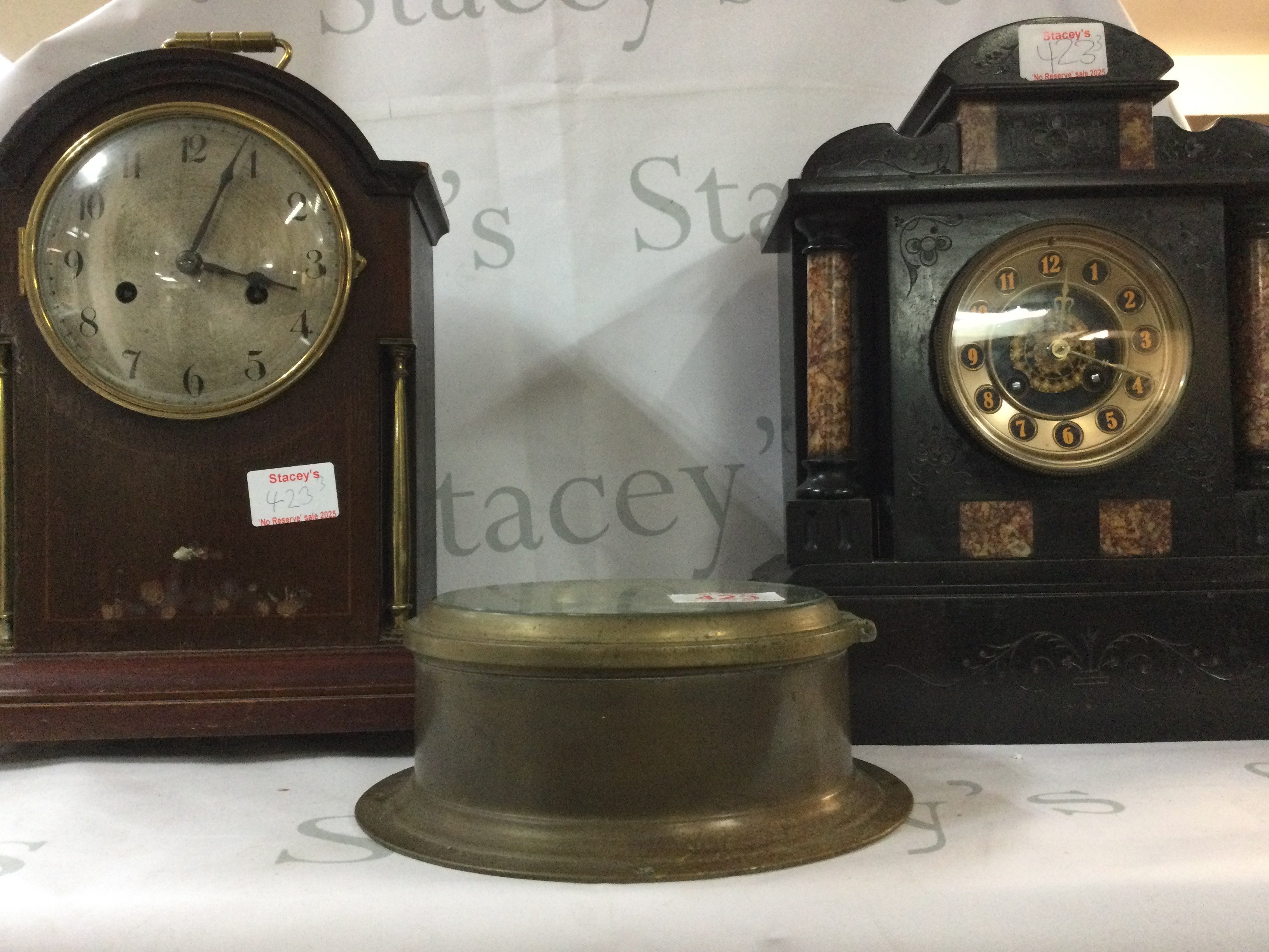 3 antique clocks, slate and marble mantle clock, brass ships clock and an oak mantle clocks with German movement key and pendulum