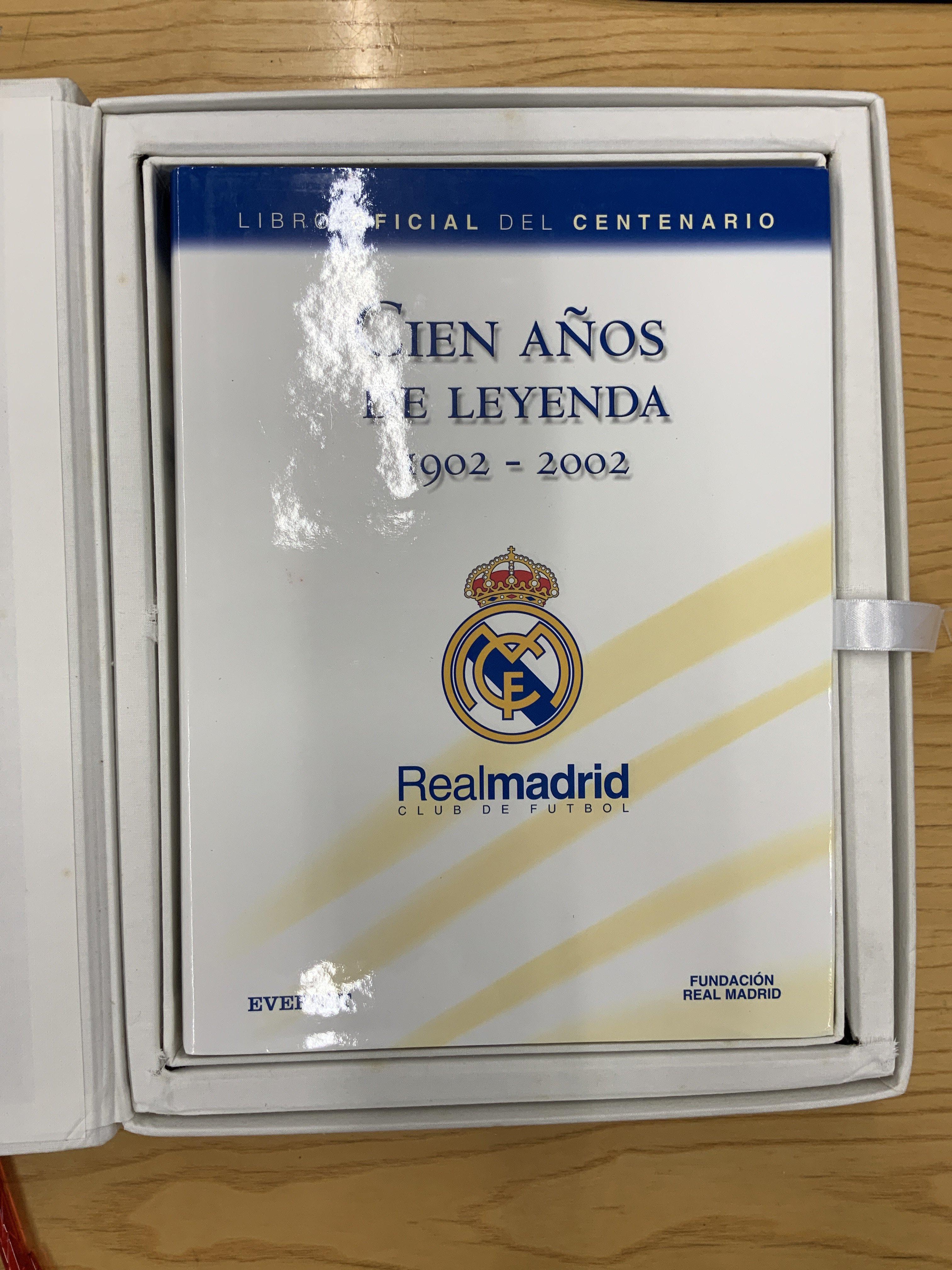 Real Madrid Cased Rare Centenary Football Book: Cine Amos De Leyenda 1902 - 2002 is a very heavy book in embossed white case which has handling marks. Book itself is excellent and has nearly 600 pages.