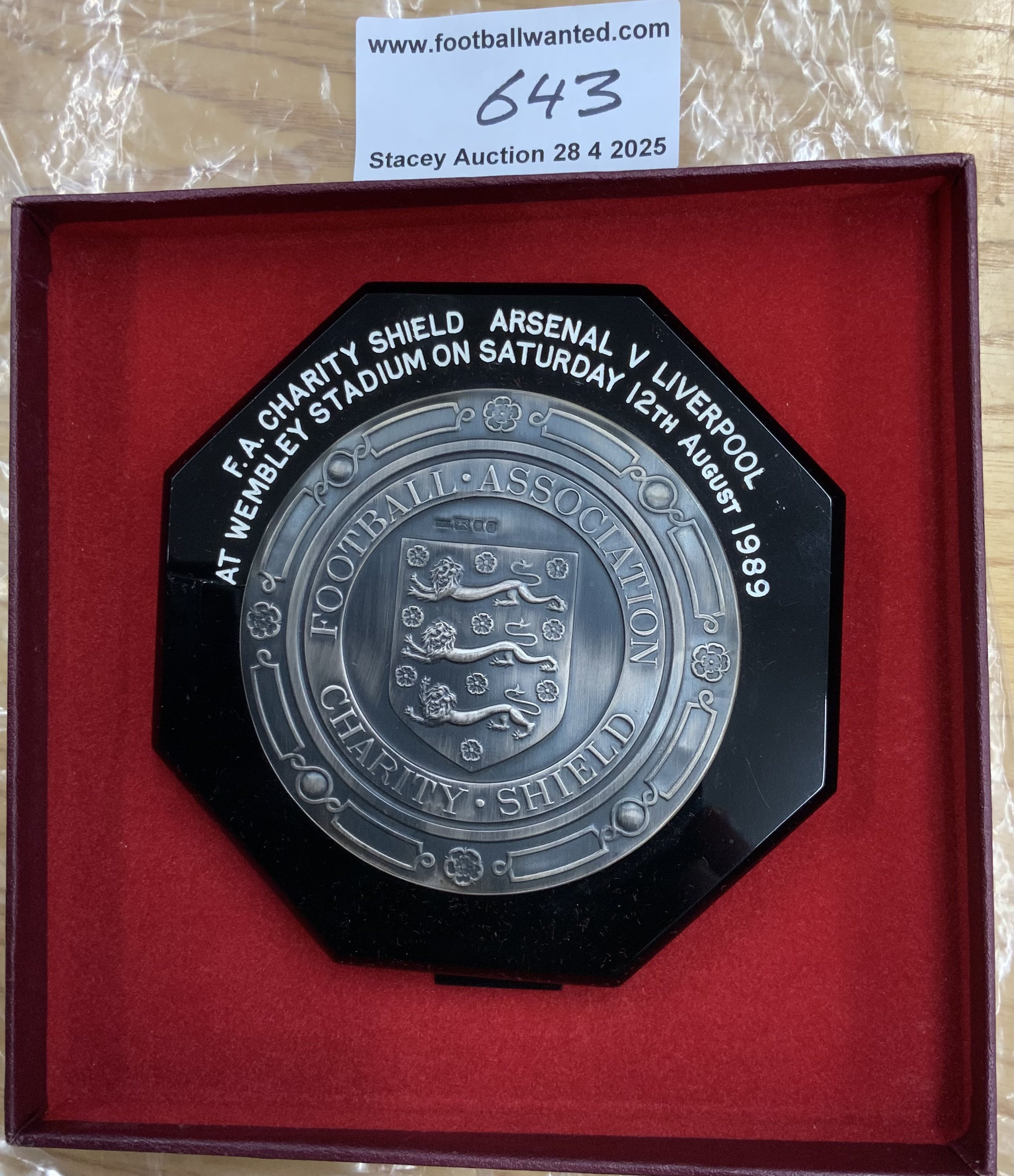 1989 Liverpool Charity Shield Football Plaque: Awarded to Bruce Grobbelaar who played in the match that Liverpool beat Arsenal 1-0. In original Tennants Charity Shield box.