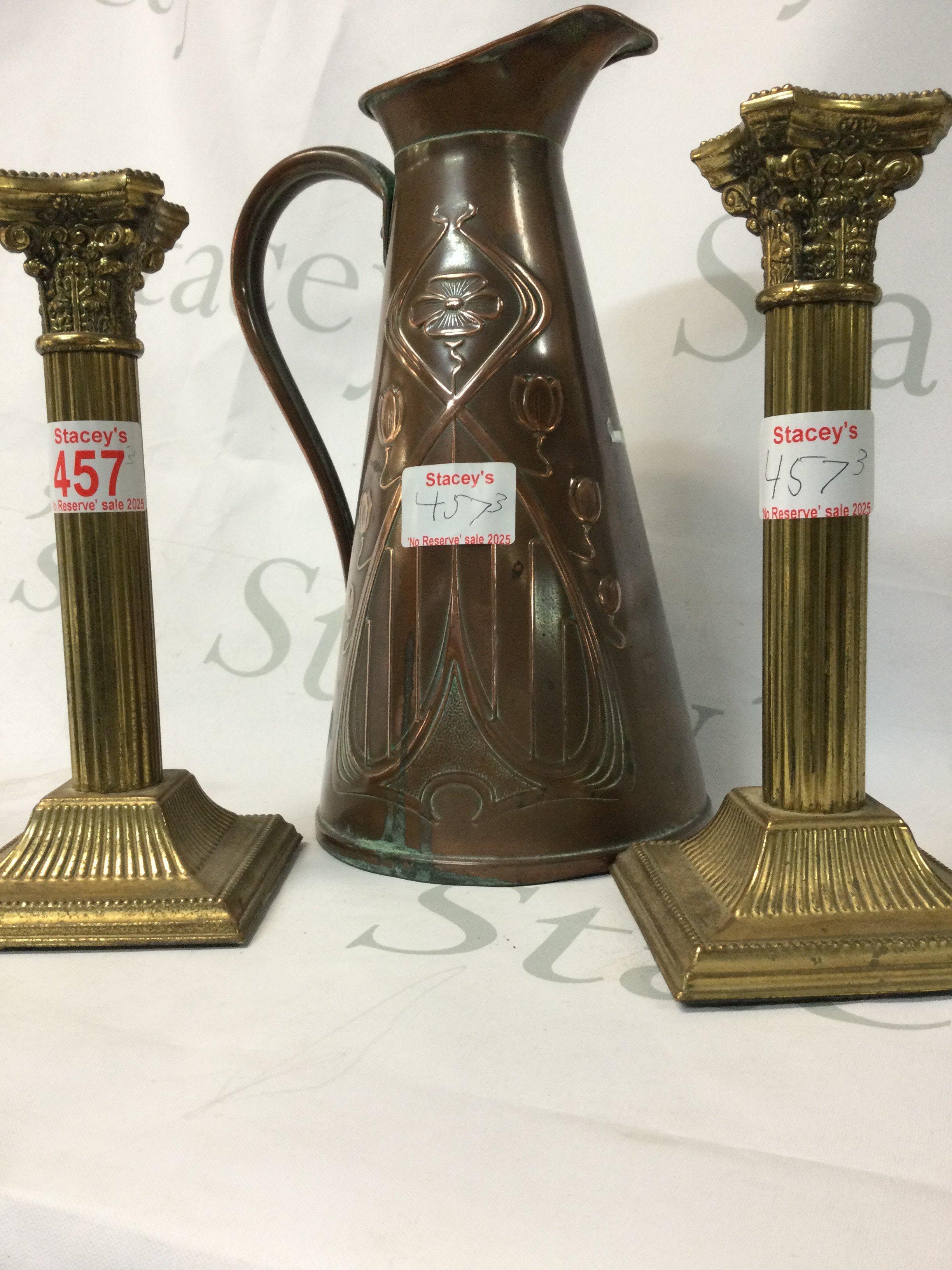 An antique pair of vintage brass candlesticks and a copper antique jug made in the 1900s in Britain.