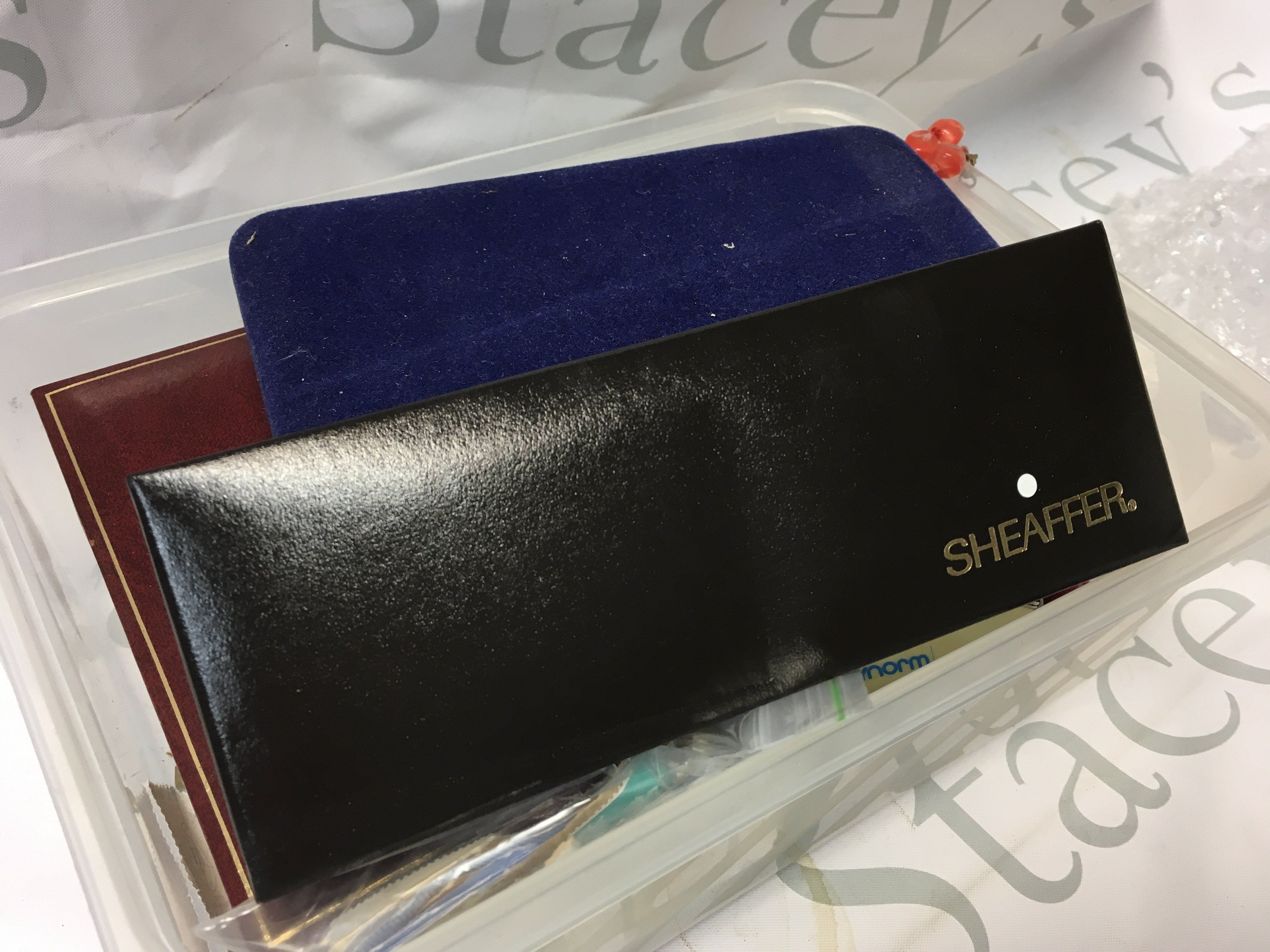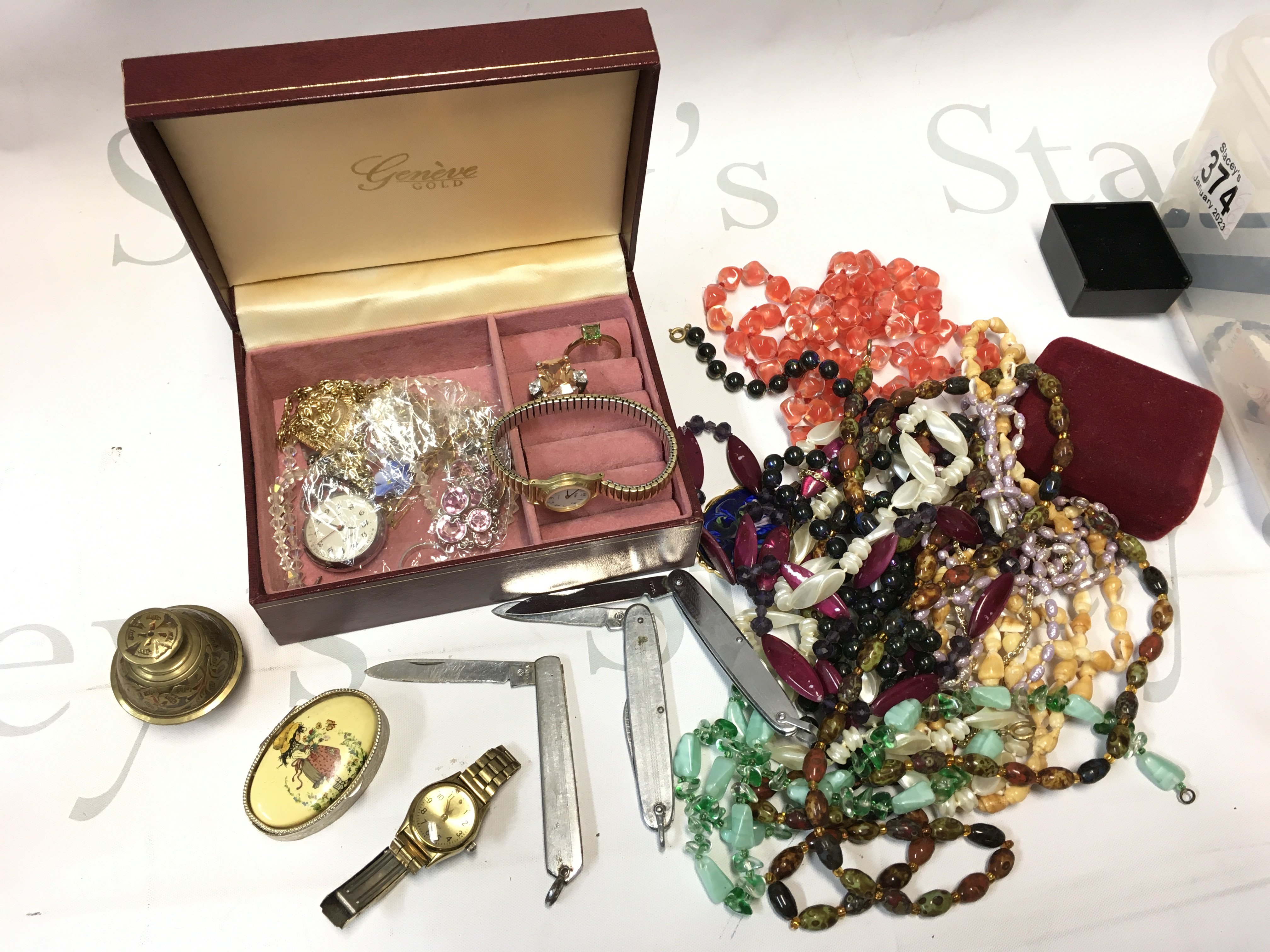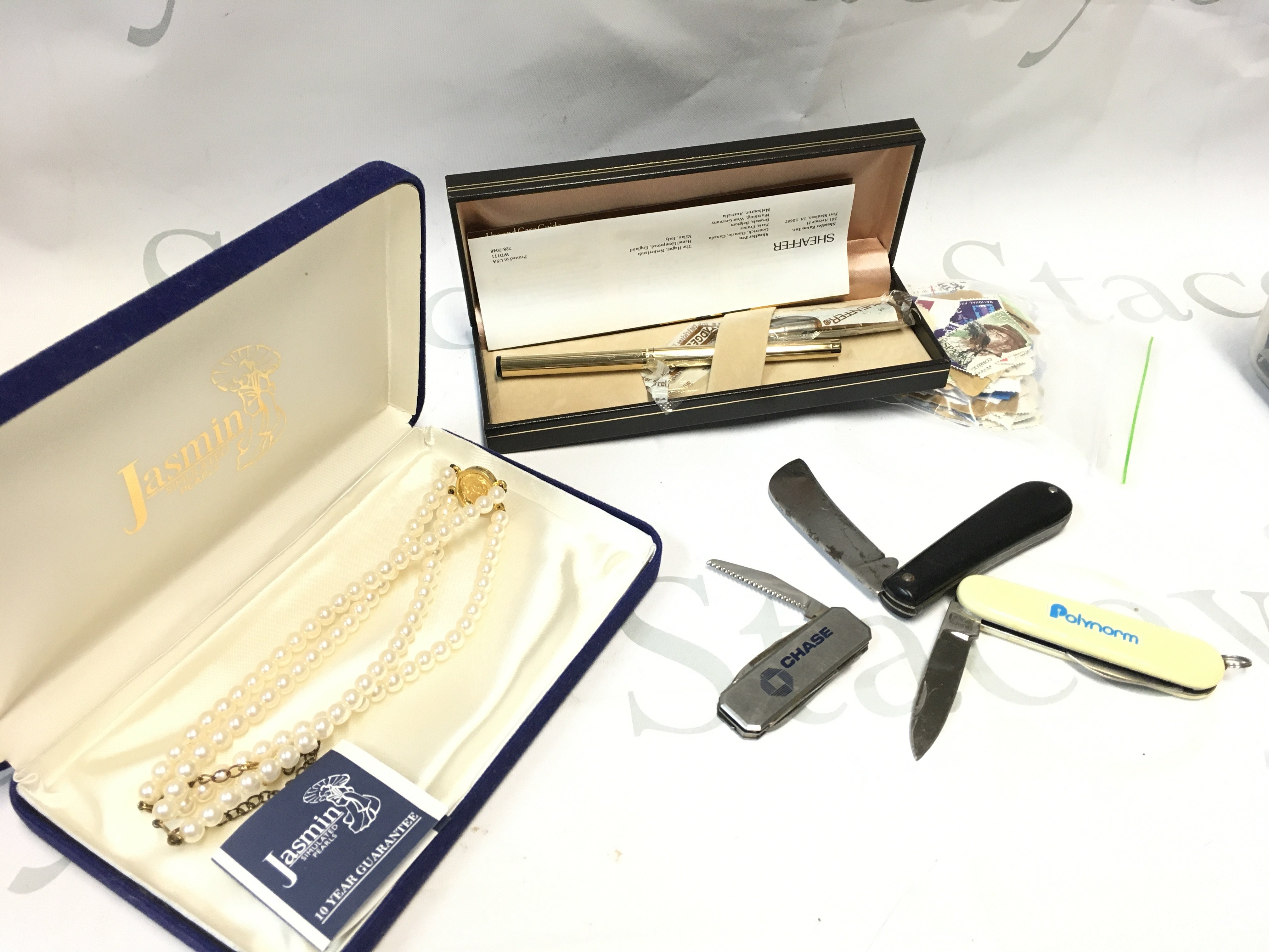 A cased Sheaffer pen, loose used stamps, simulated pearl necklace, collection of necklaces, pen knives