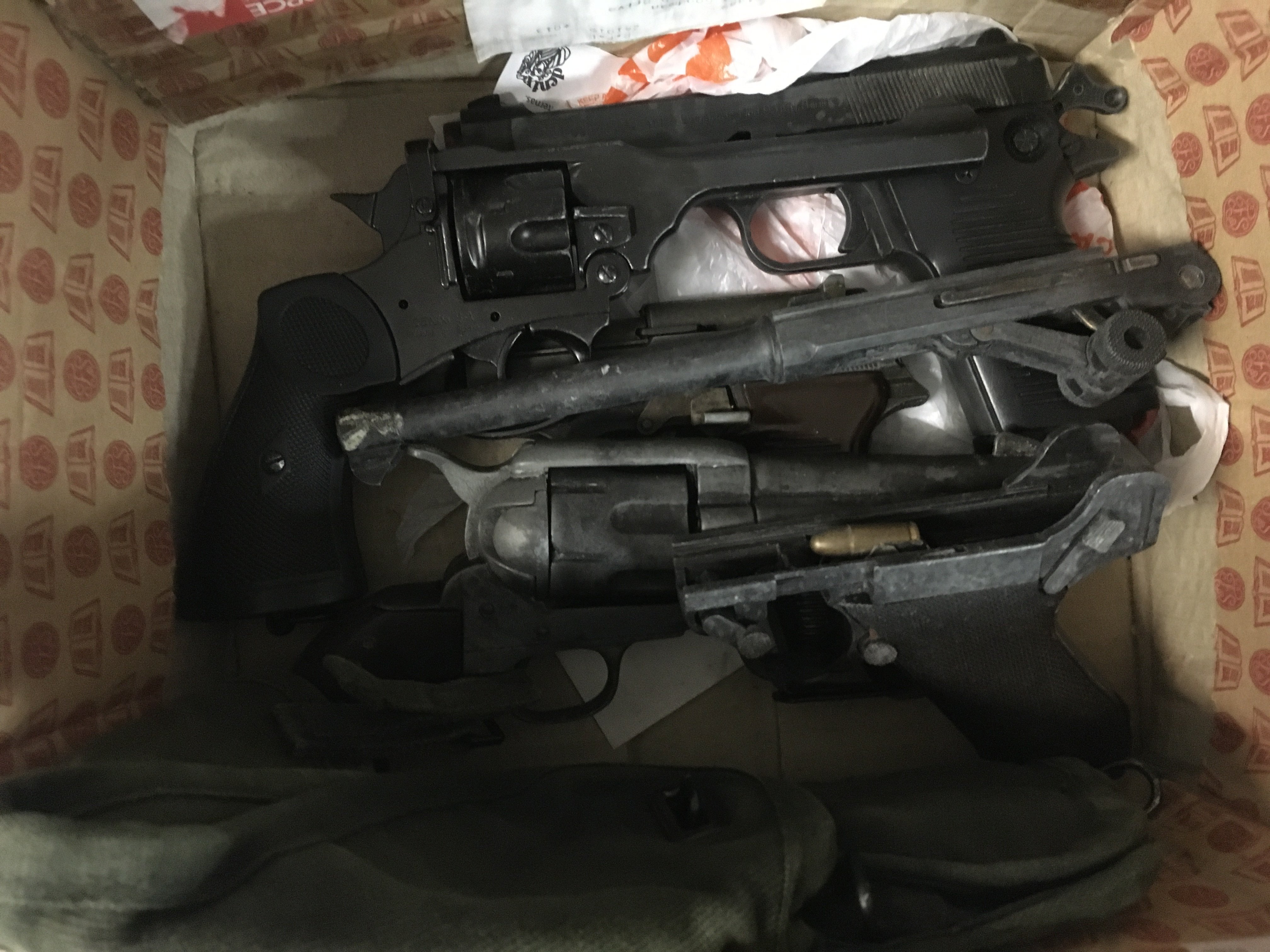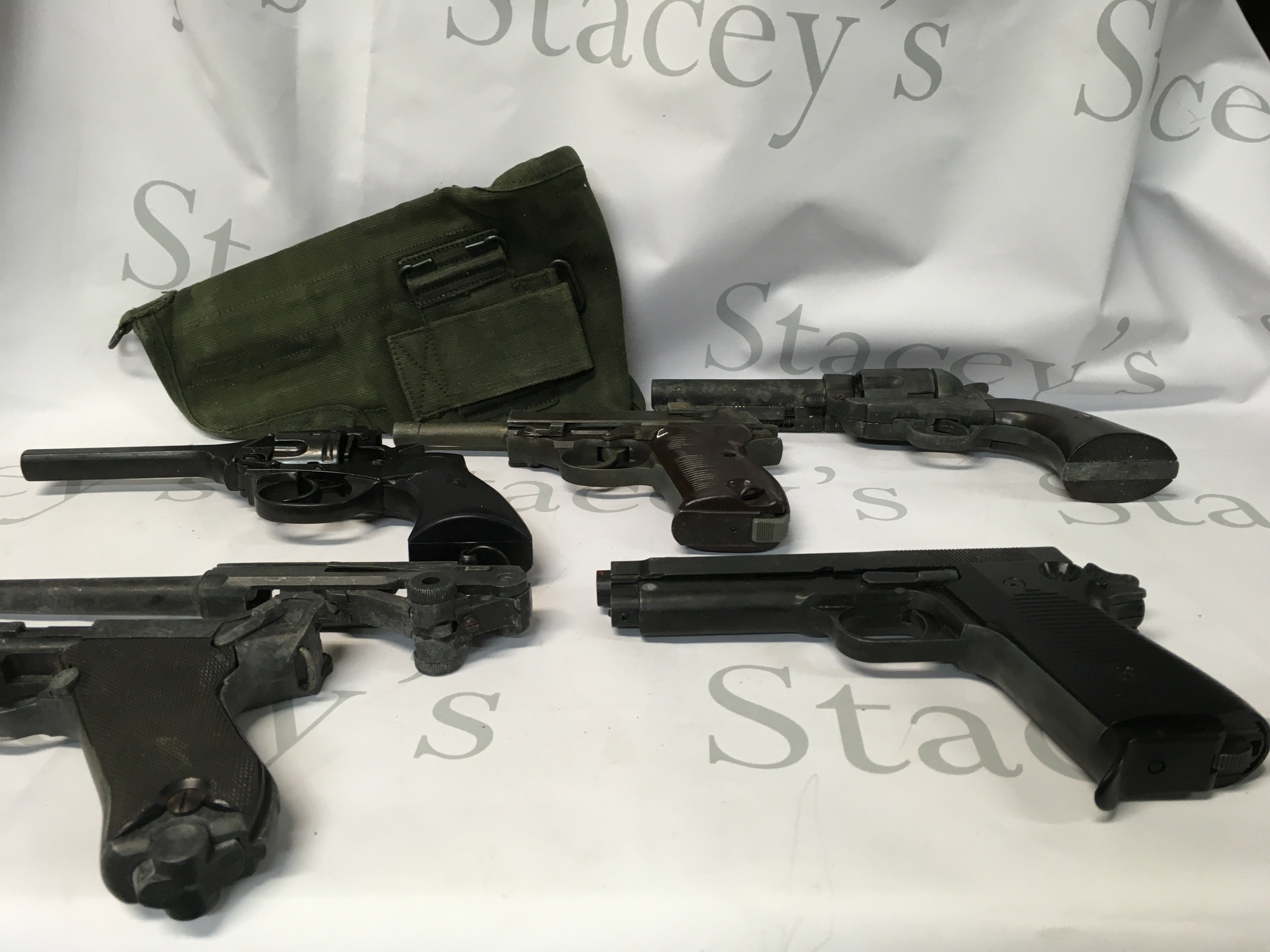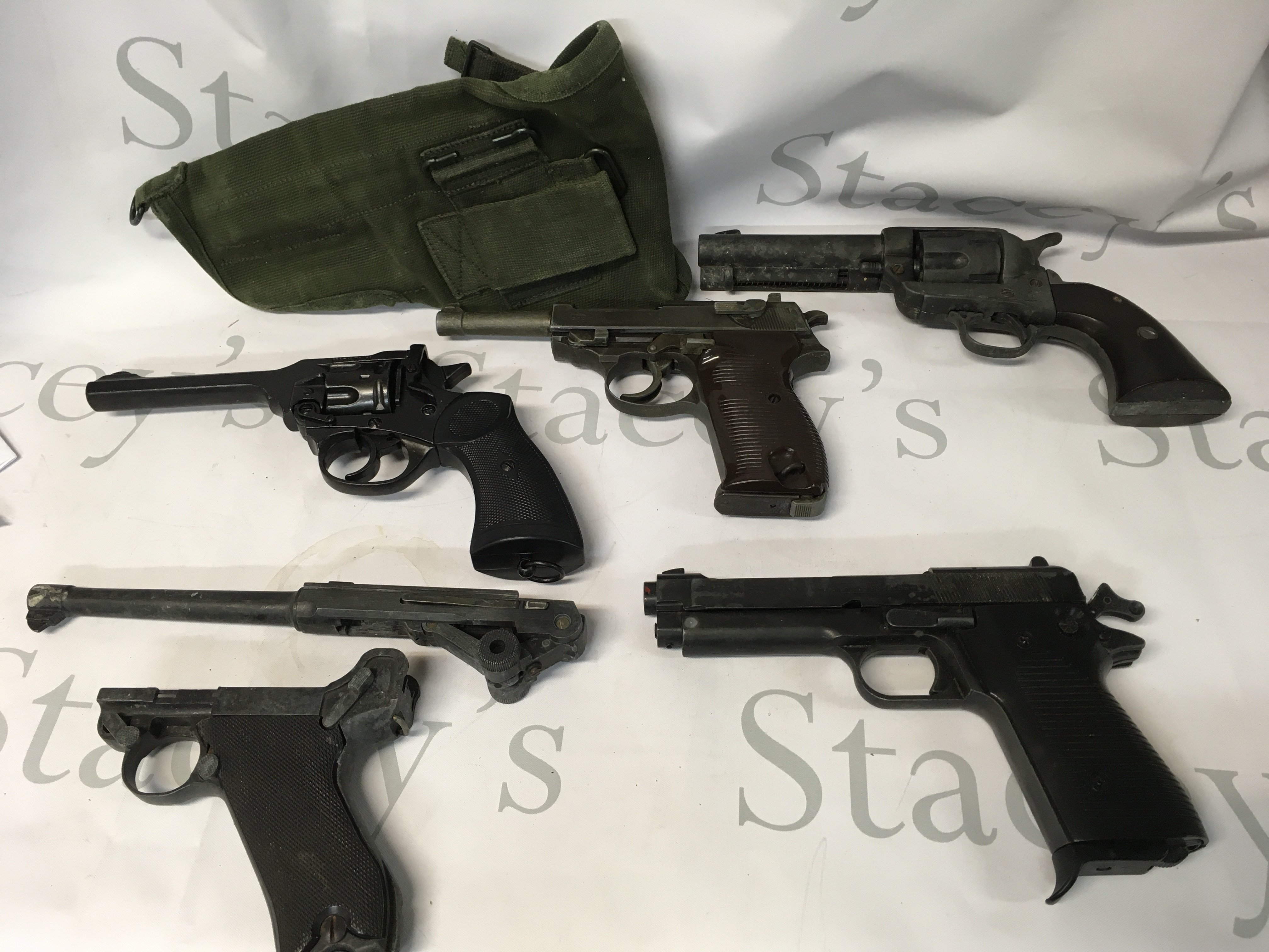 A collection of replica guns such as some starter gun toys, a Mark 4 revolver from 1923 in UK, a Maroshin P38 model gun made in Japan, another revolver, and a broken gun. Some in need of restoration.