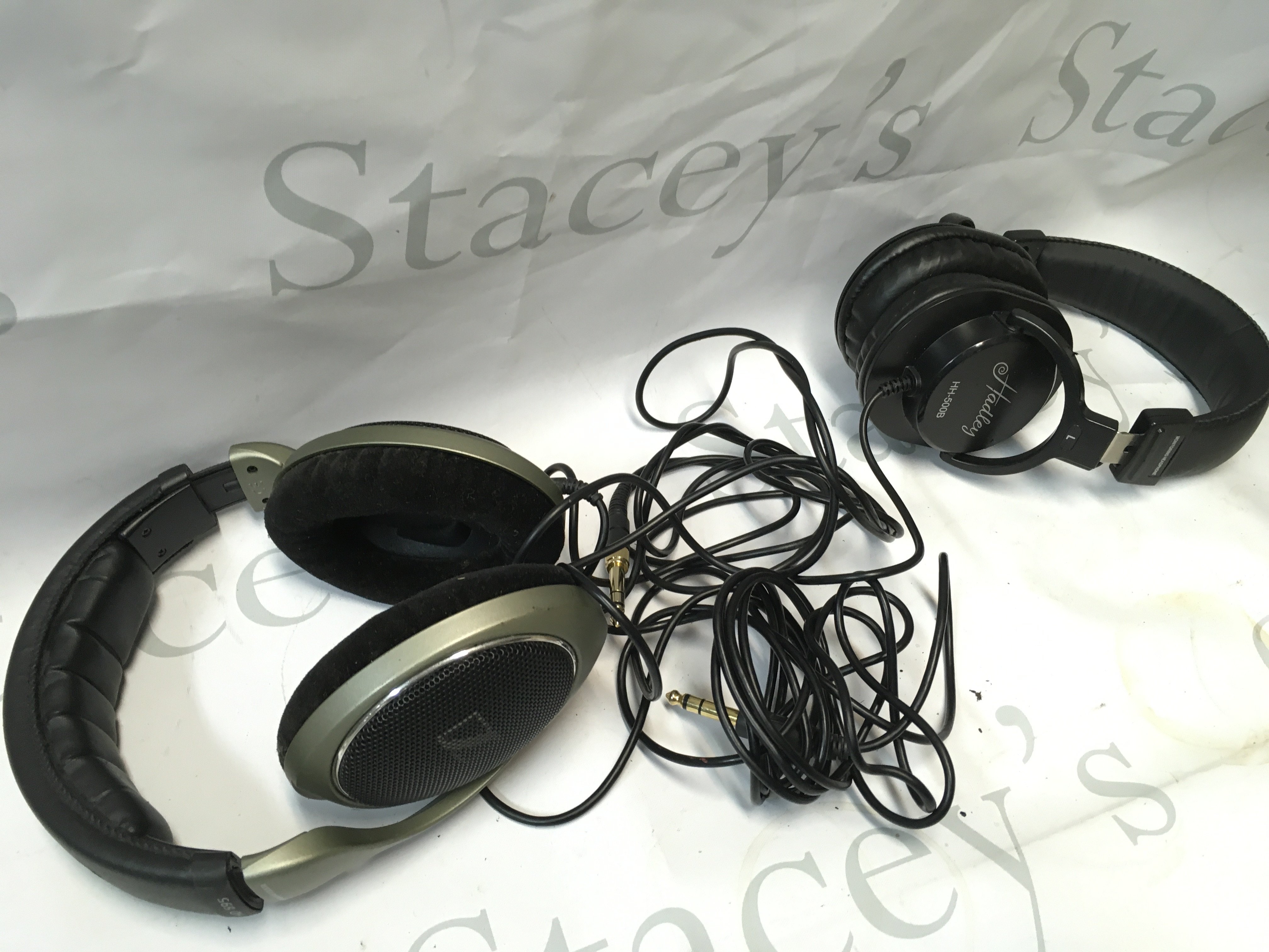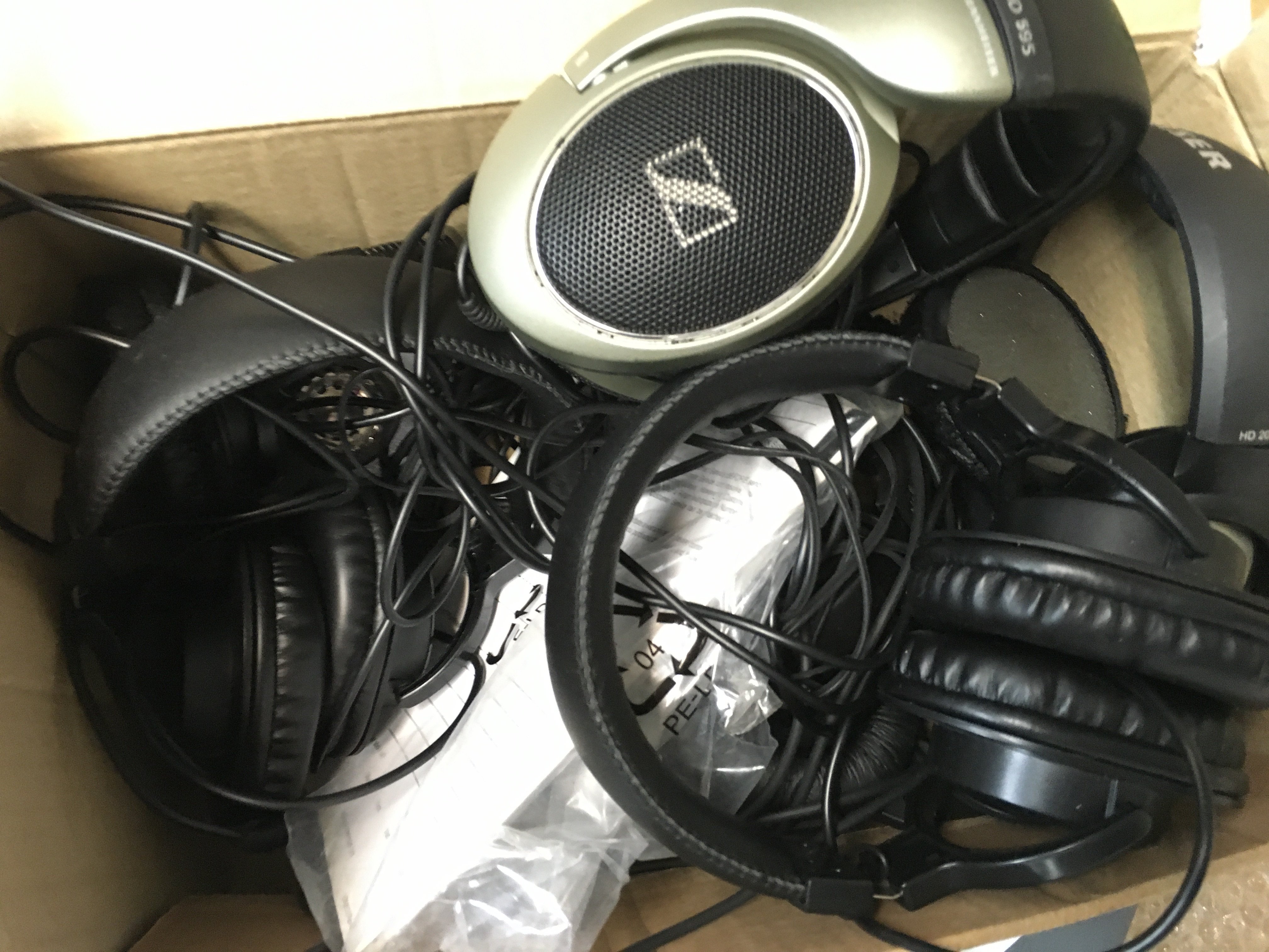 A collection of headphones including Hadley HH-500B, Sennheiser HD 595, Sennheiser HD 201