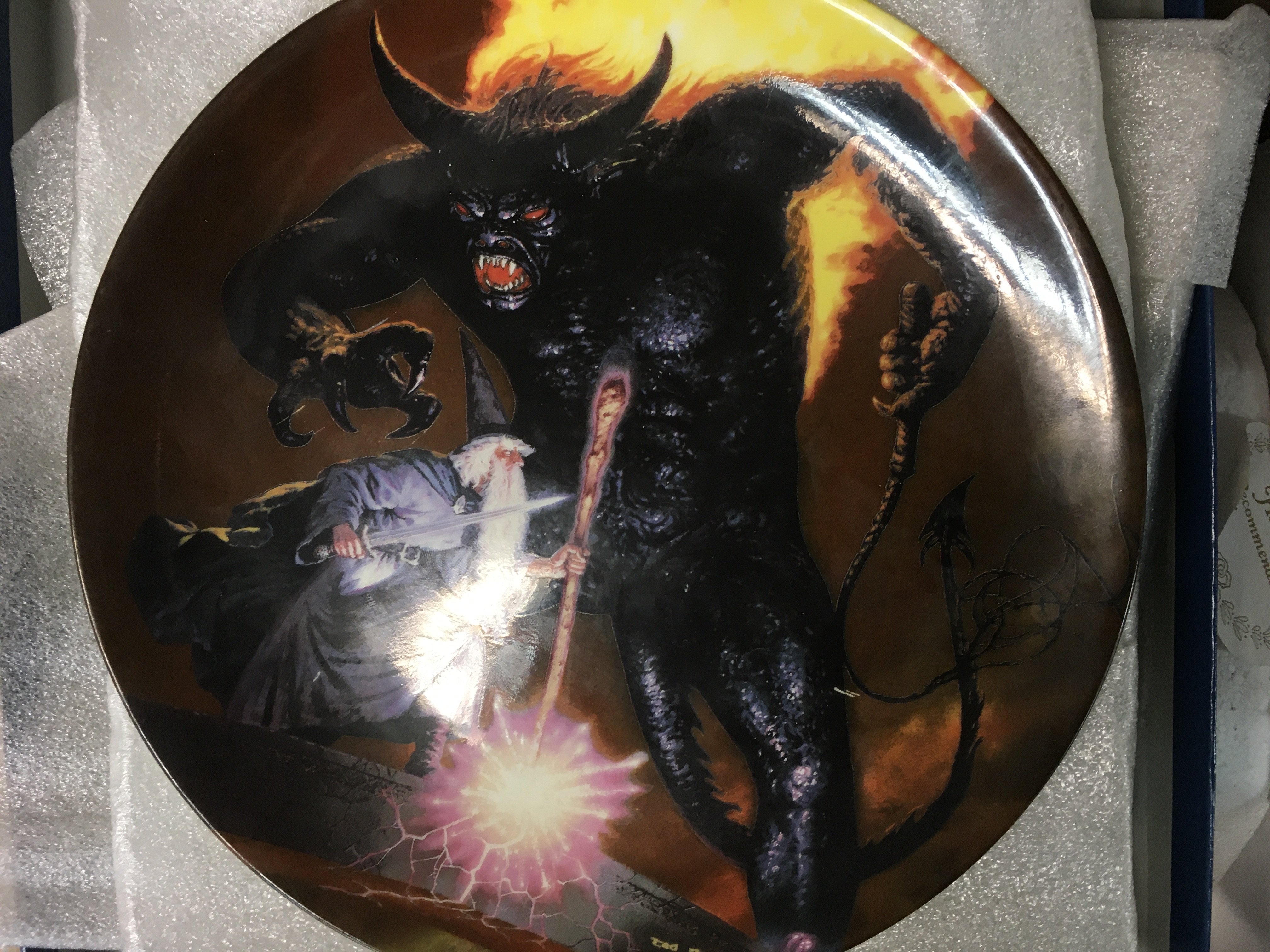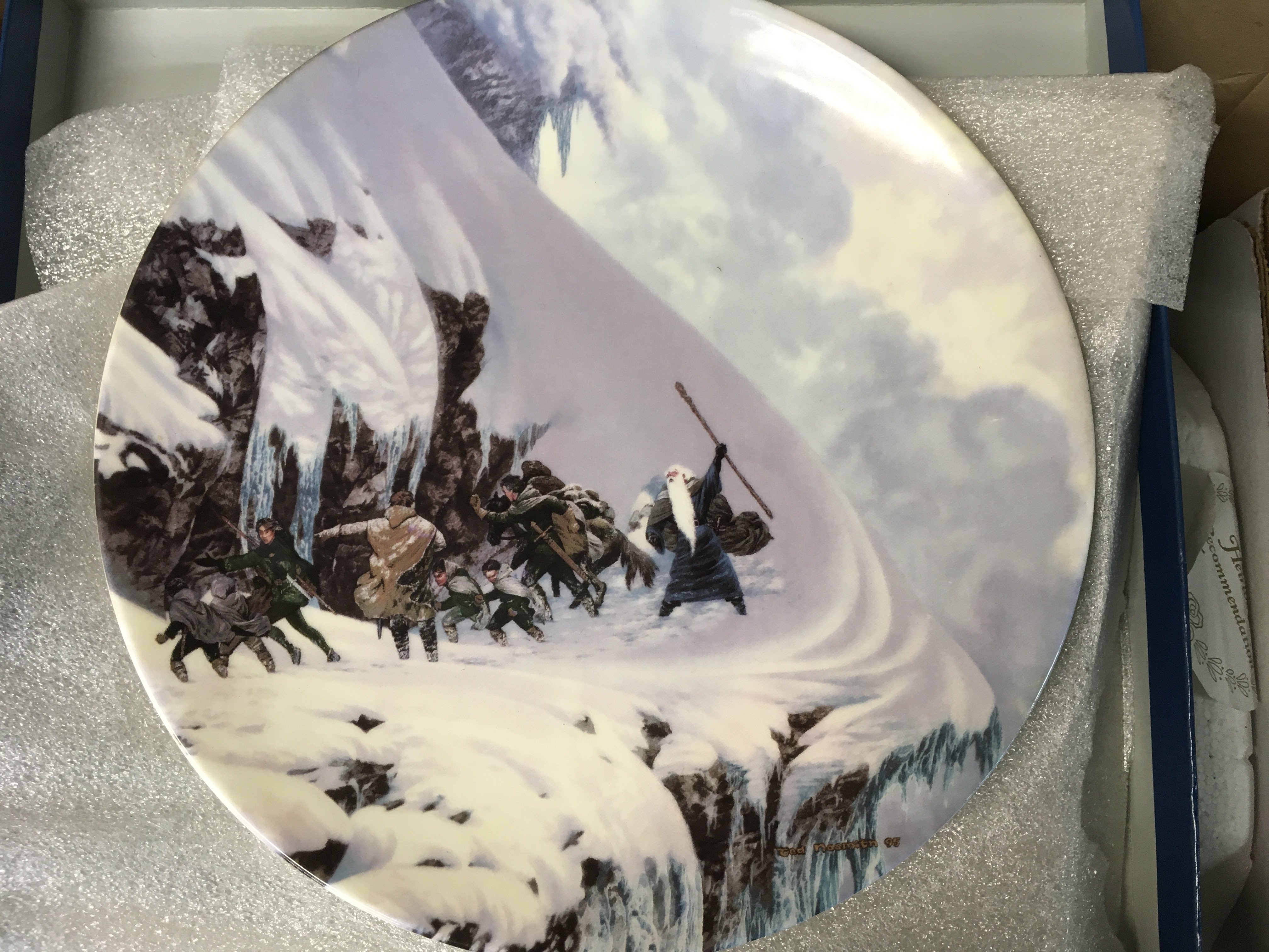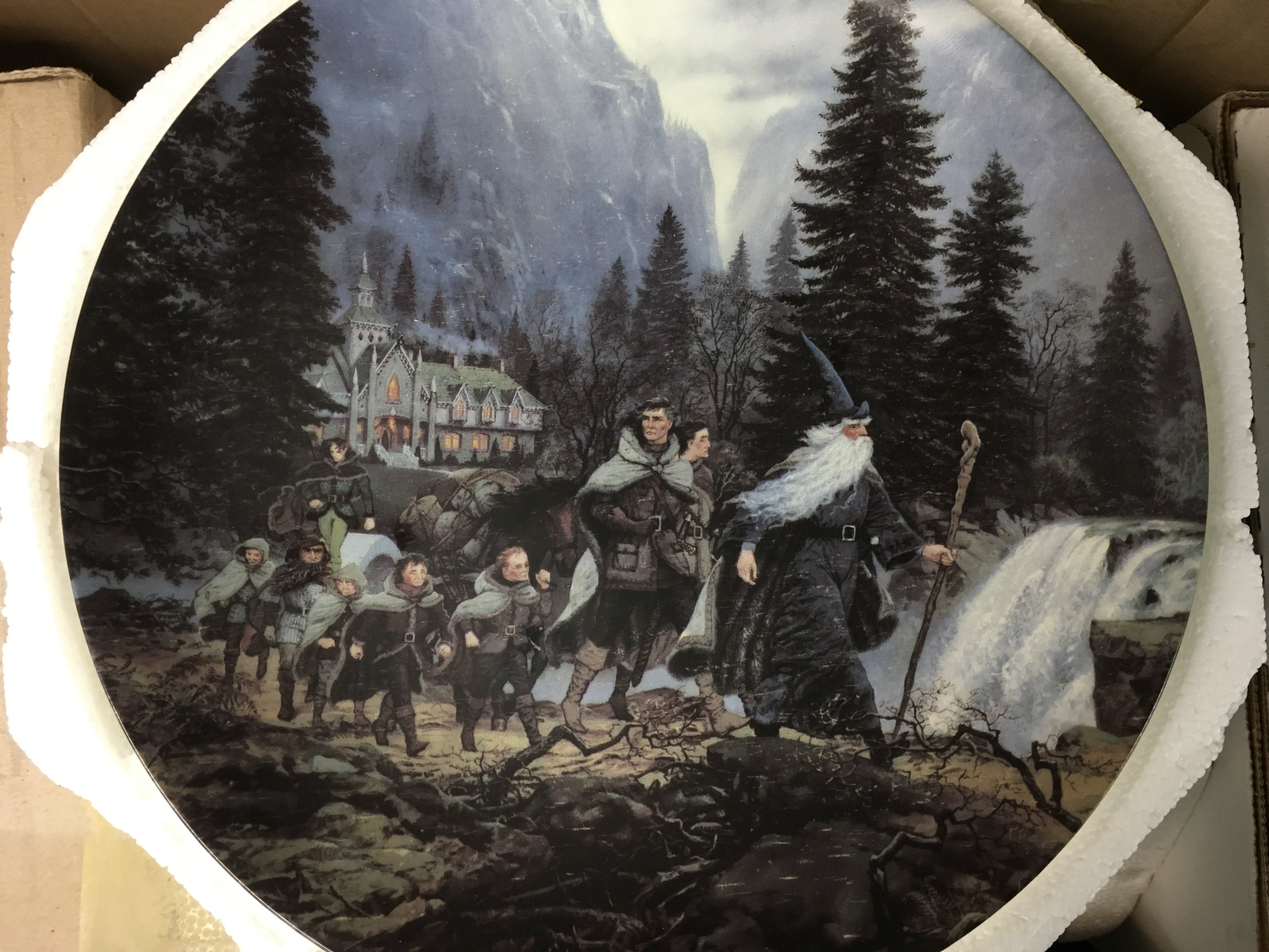 A collection of antique Wedgwood plates, including some plates from Lord of the Rings,