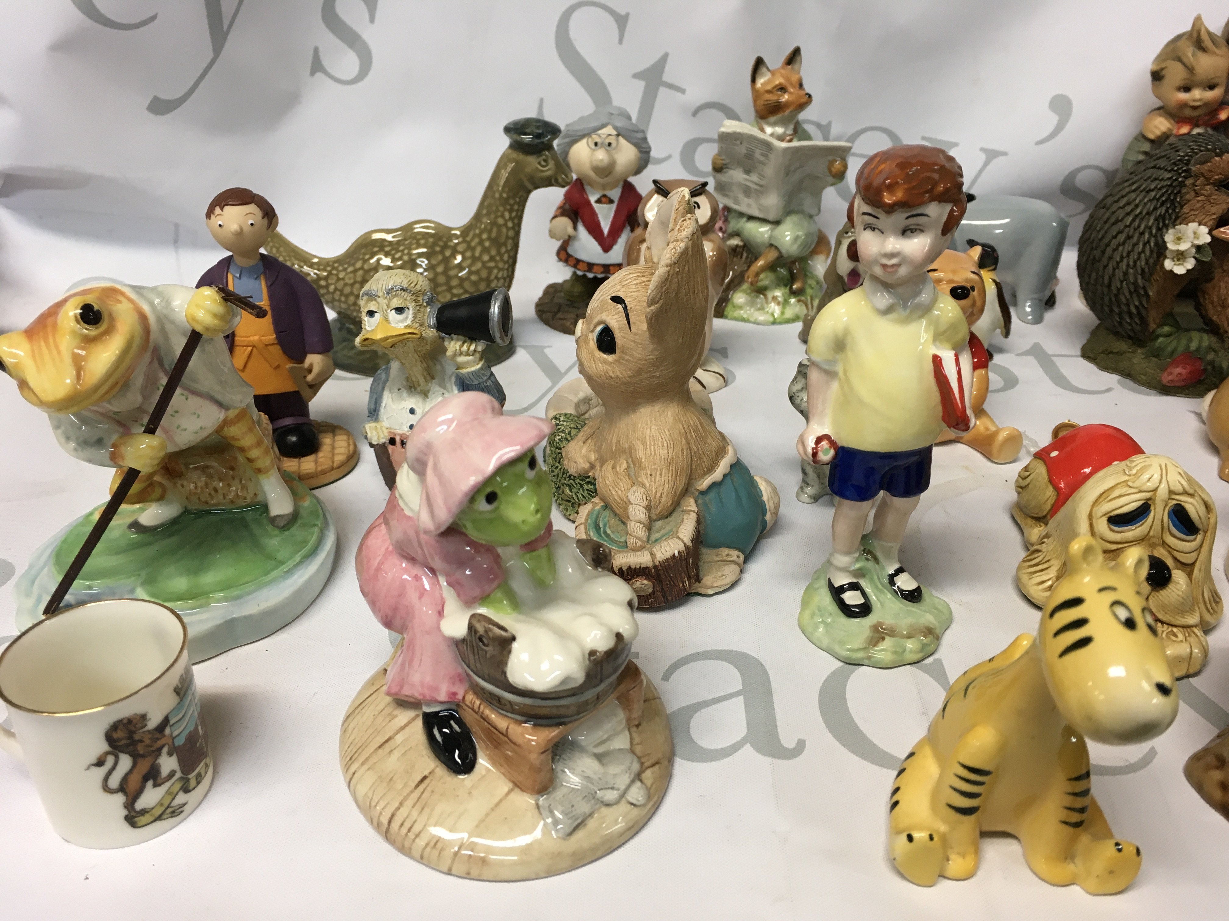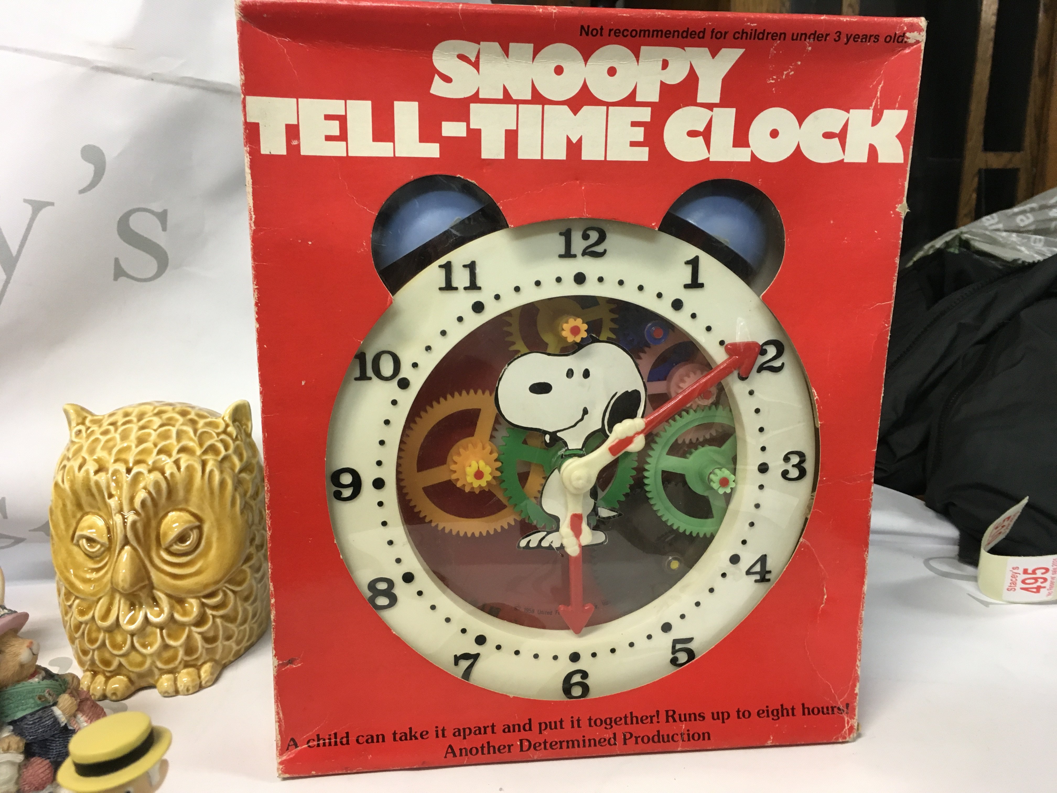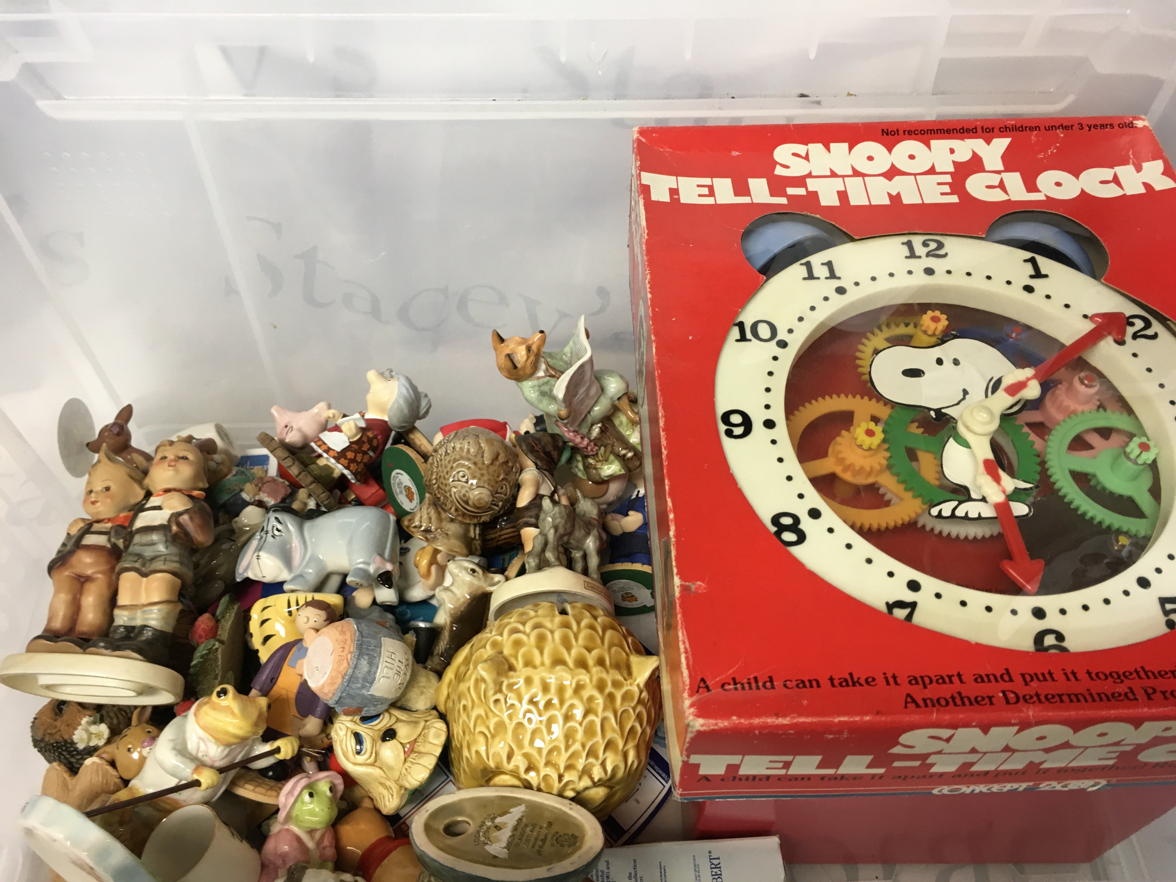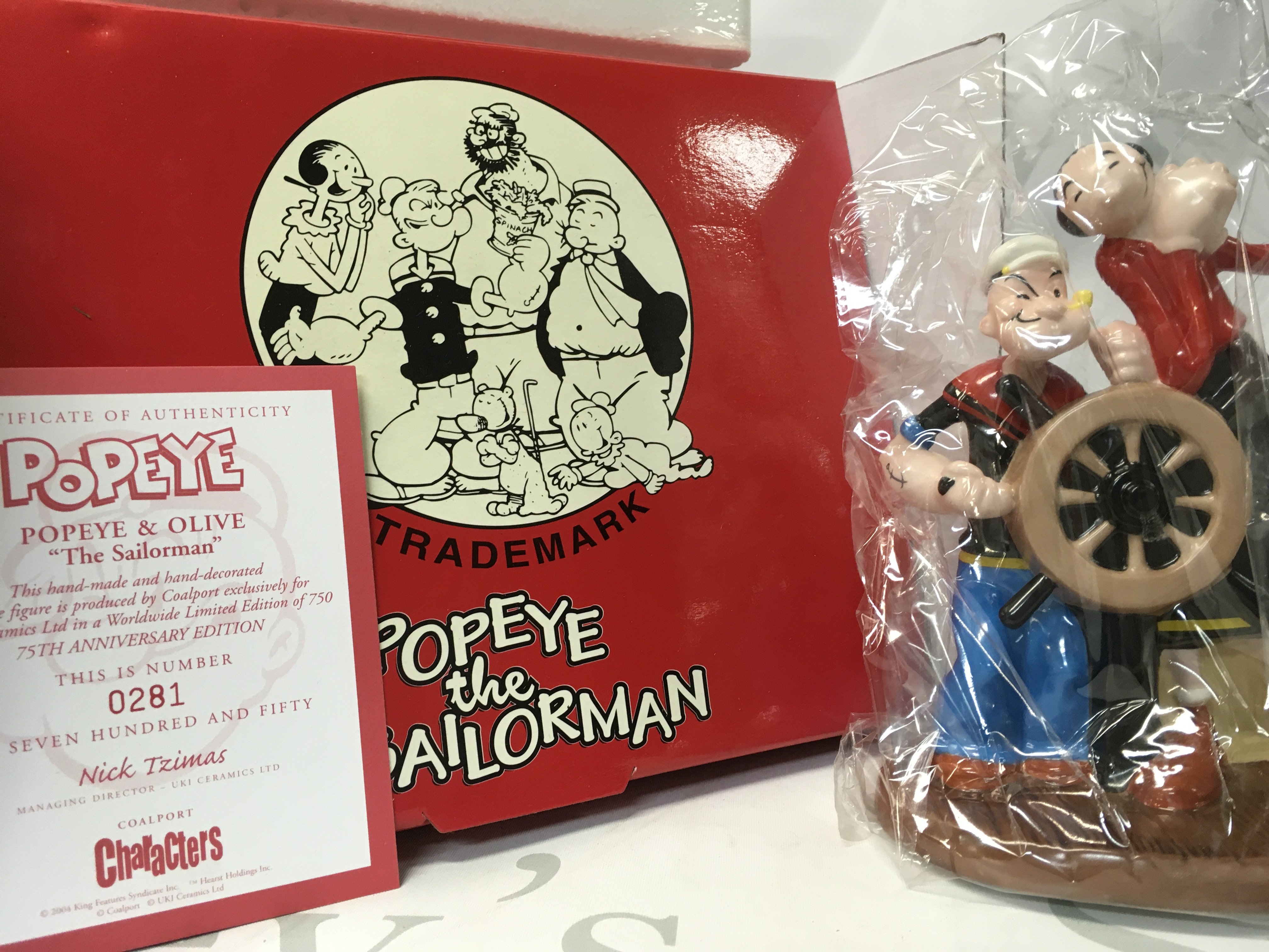 A large collection of antique plates and the Popeye and Olive The Sailorman limited edition of 750 75th anniversary edition (number 0281). Made of ceramic. Also, a collection of porcelain figurines including a washerman toad, Christopher Robin, Foxy Reading, Mr Jeremy Fisher, Loch Ness and more. There is also a Snoopy Tell-time clock.