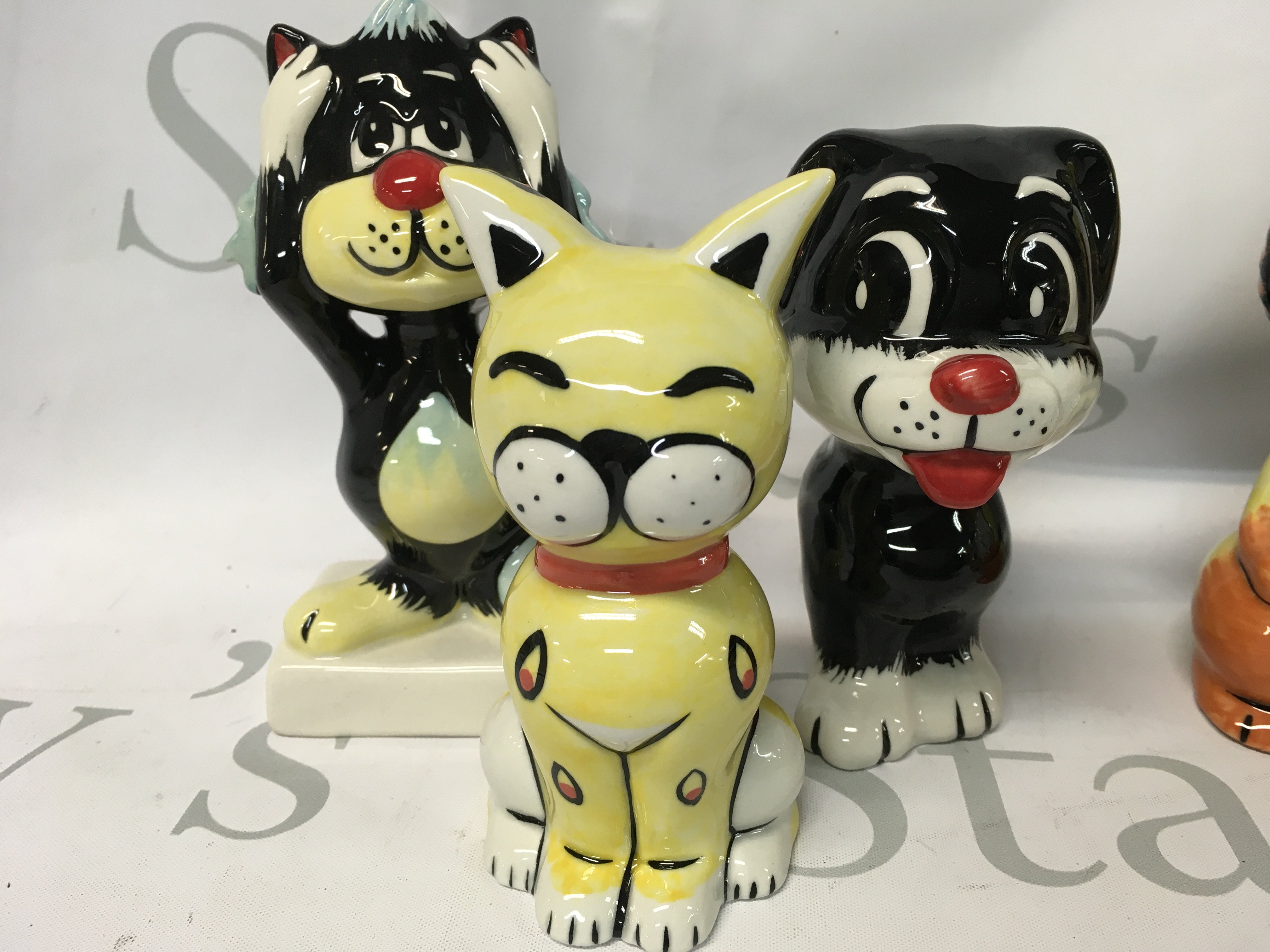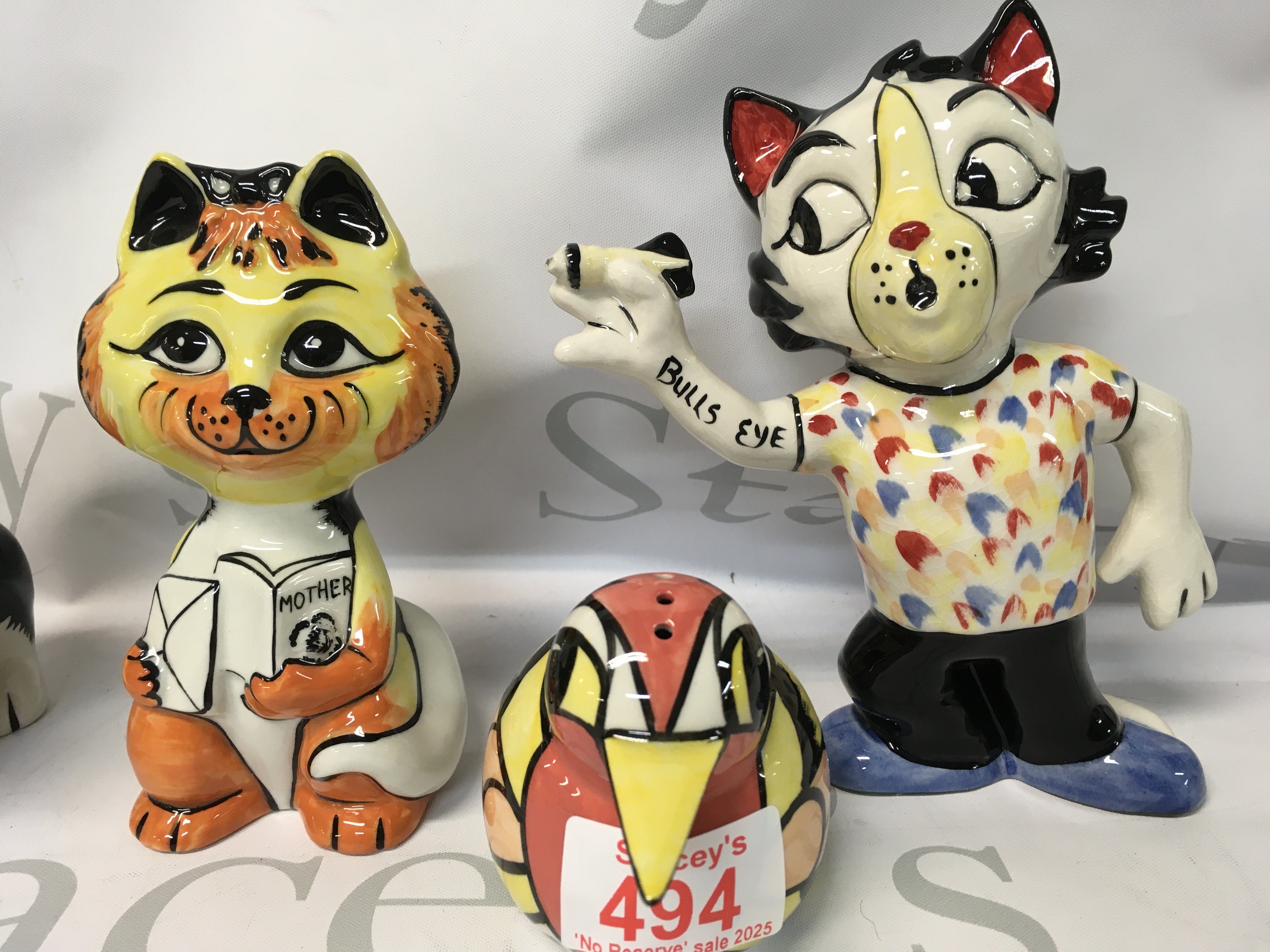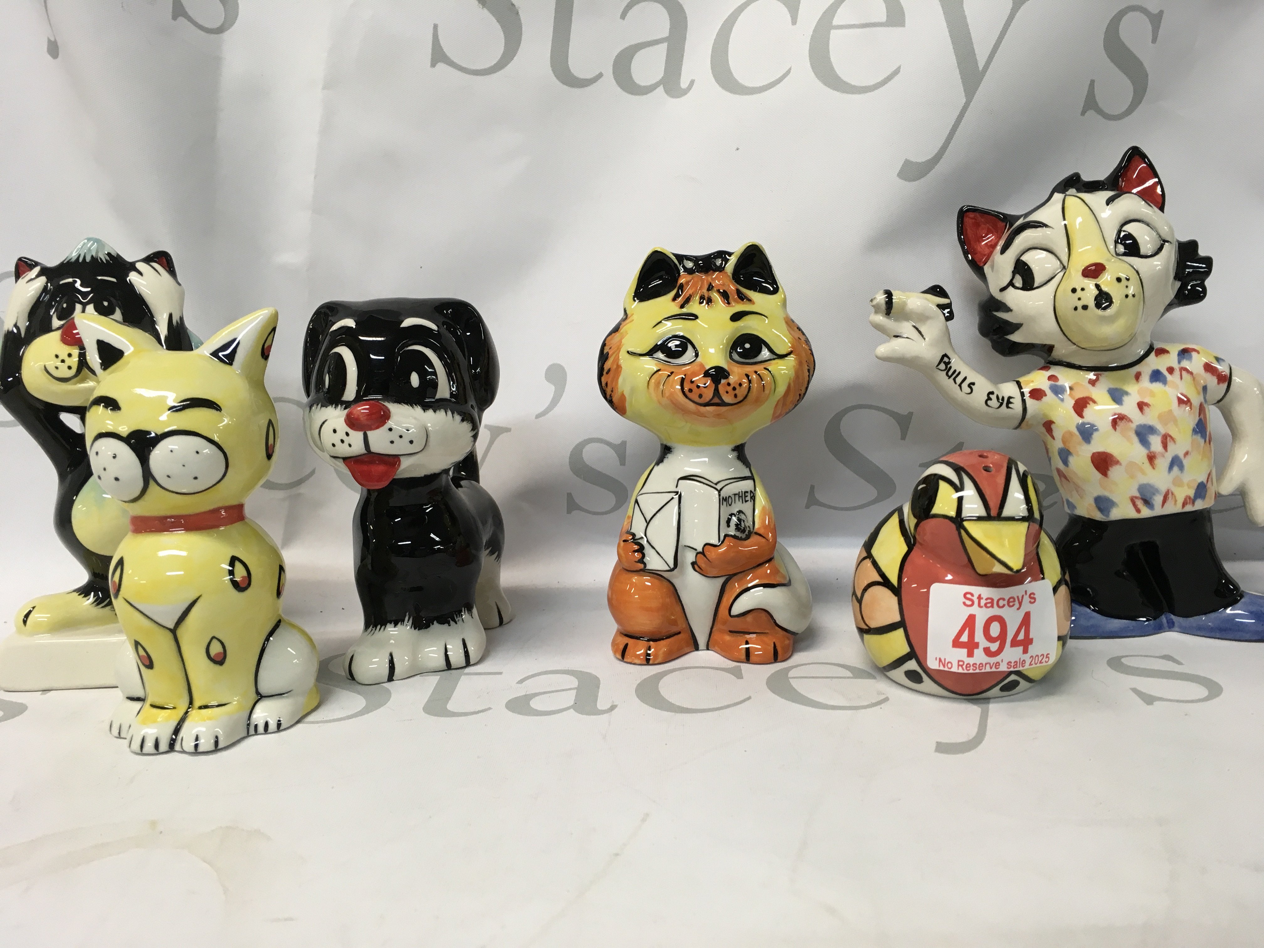 A collection of 6 rare Lorna Bailey figurines, including Bullseye the Darts cat, a wise monkey cat, Leo the Cat, Bengo Dog, Happy Mother’s Day cat and a Robin Cruet.
